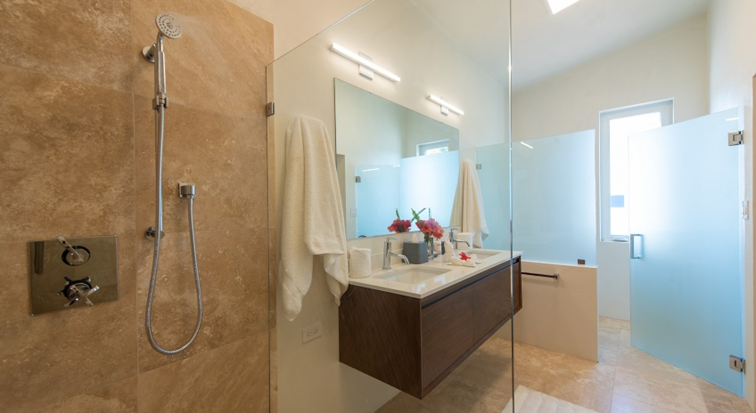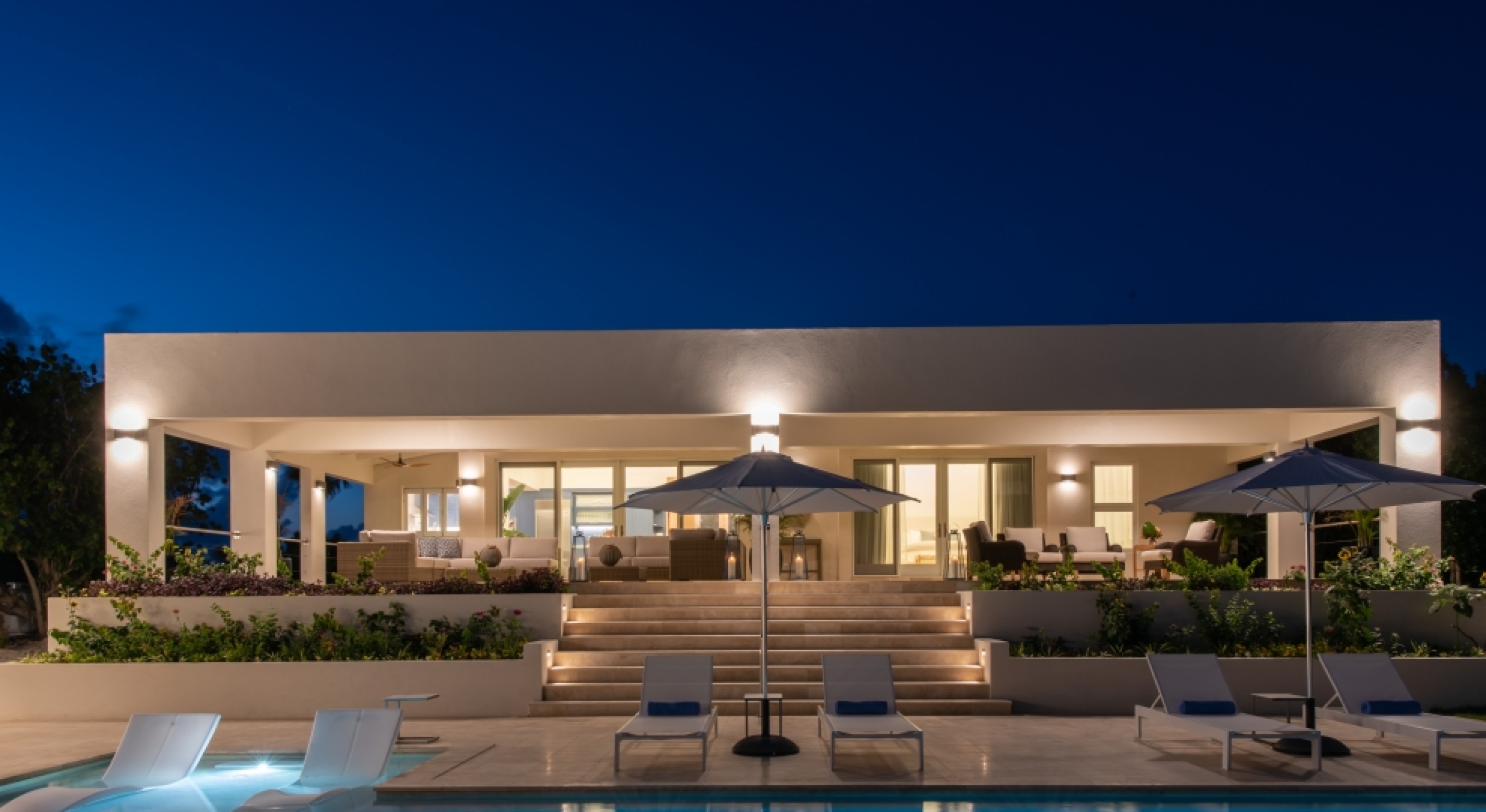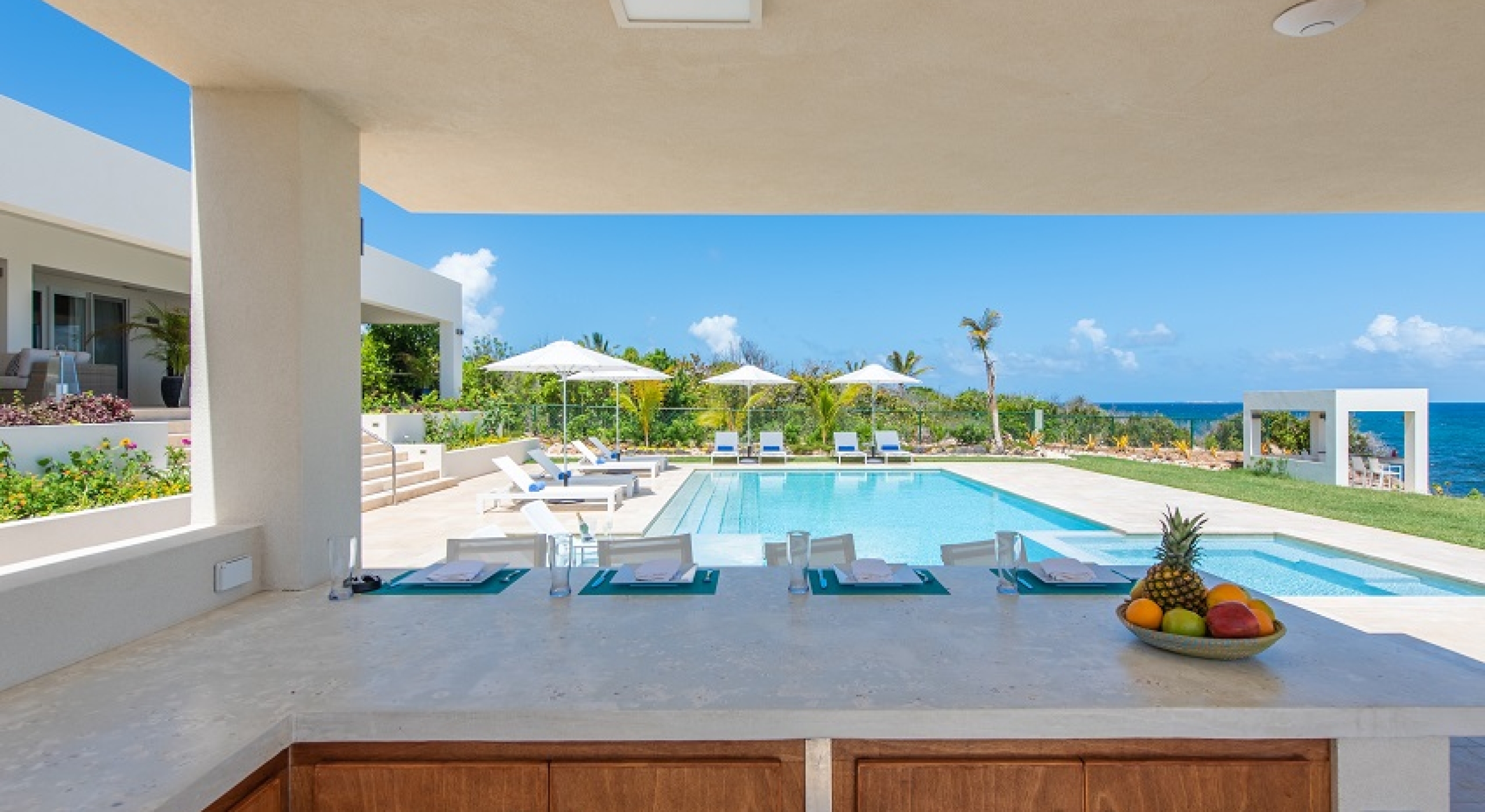 Pelican Bay is minutes away, and the villa provides towels, tote bags, and coolers for blissful beach days. Round Rock’s heated swimming pool, hot tub, and travertine terrace allows guests to relax in privacy without sacrificing ocean views. The villa’s submerged chaises, shaded loungers, and covered wet bar furnish the pool and terrace. The elevated veranda is outfitted with cushioned furnishings, ceiling fans, and mood lighting for any time of day. A changing room and restroom are available off the pool deck.