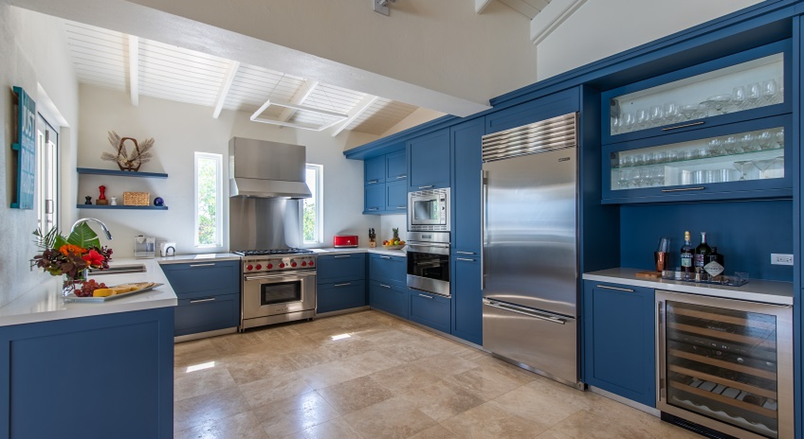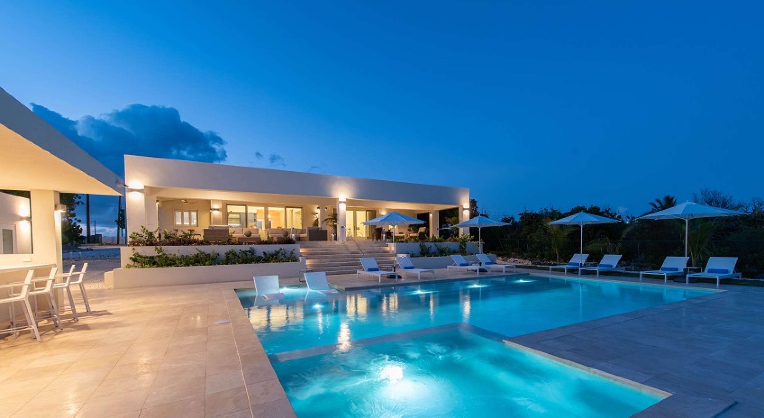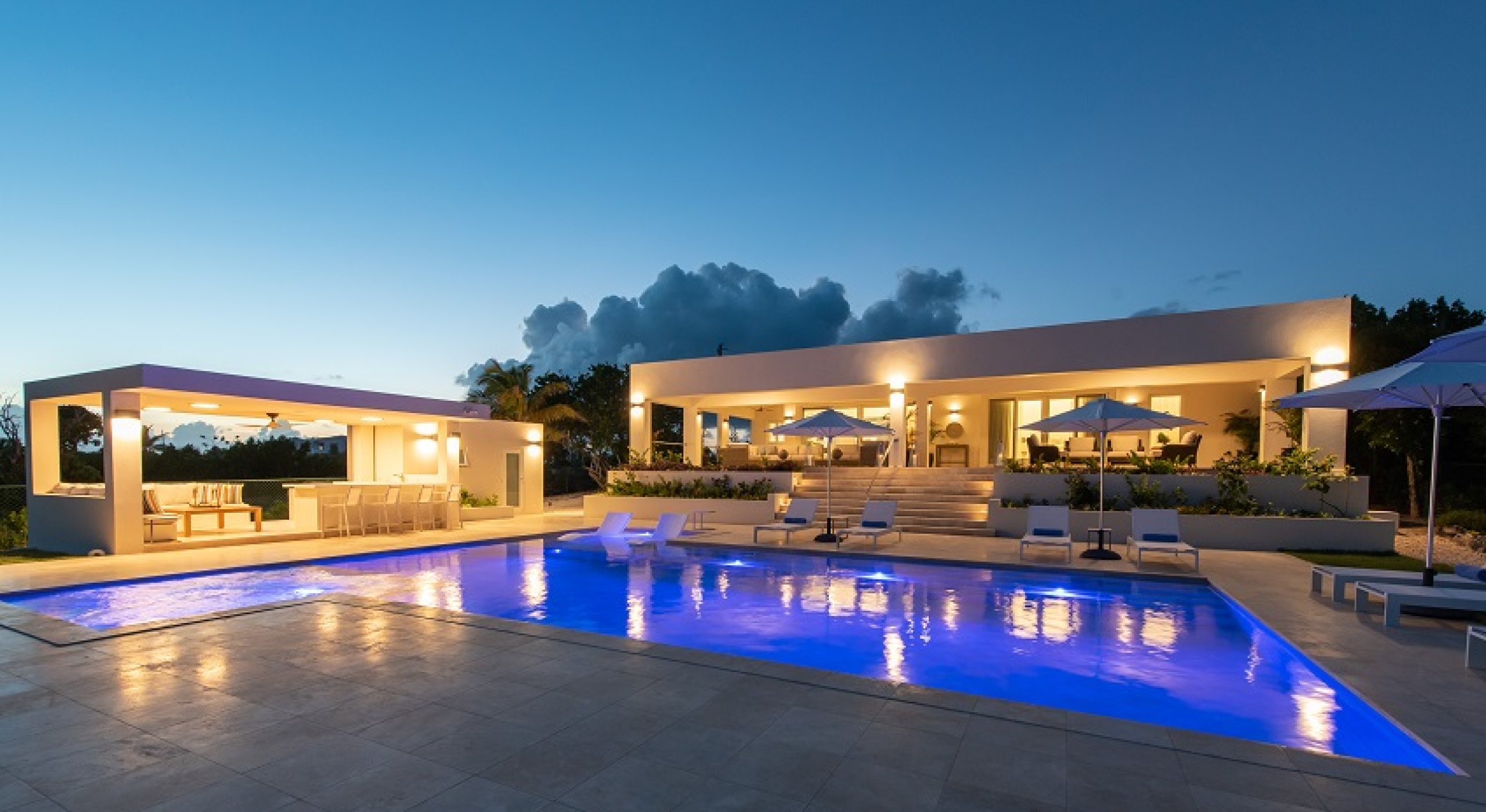 Pelican Bay is minutes away, and the villa provides towels, tote bags, and coolers for blissful beach days. Round Rock’s heated swimming pool, hot tub, and travertine terrace allows guests to relax in privacy without sacrificing ocean views. The villa’s submerged chaises, shaded loungers, and covered wet bar furnish the pool and terrace. The elevated veranda is outfitted with cushioned furnishings, ceiling fans, and mood lighting for any time of day. A changing room and restroom are available off the pool deck.