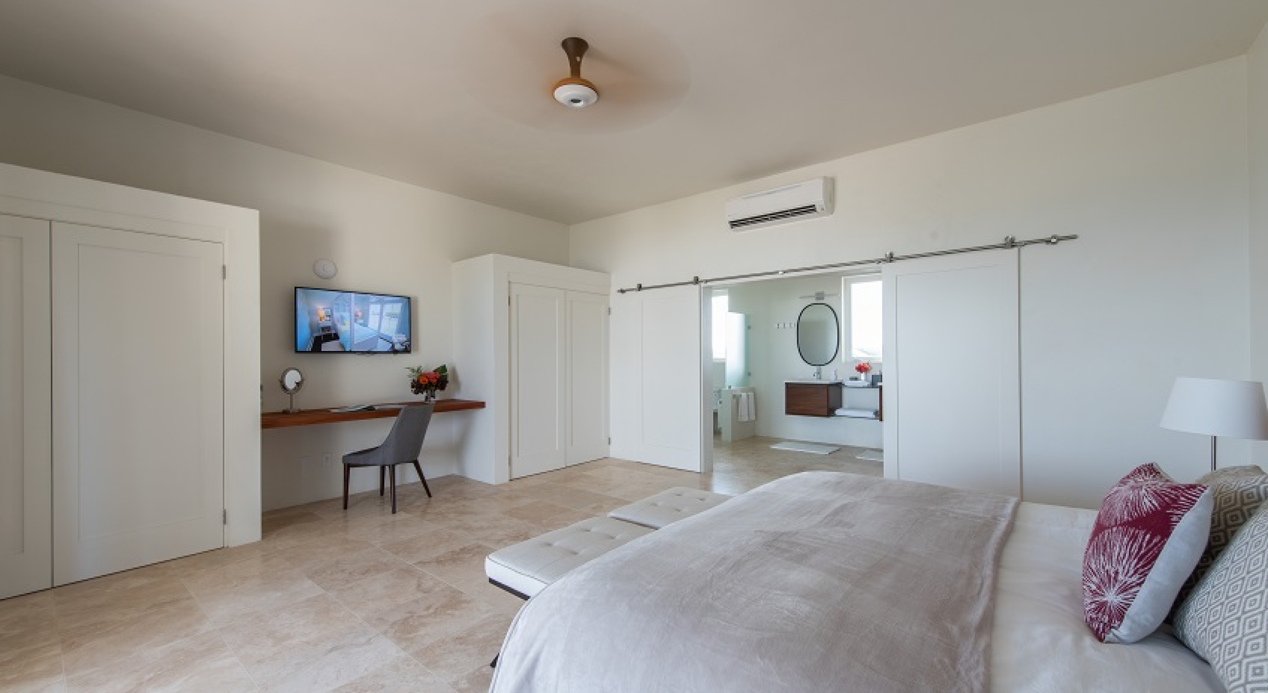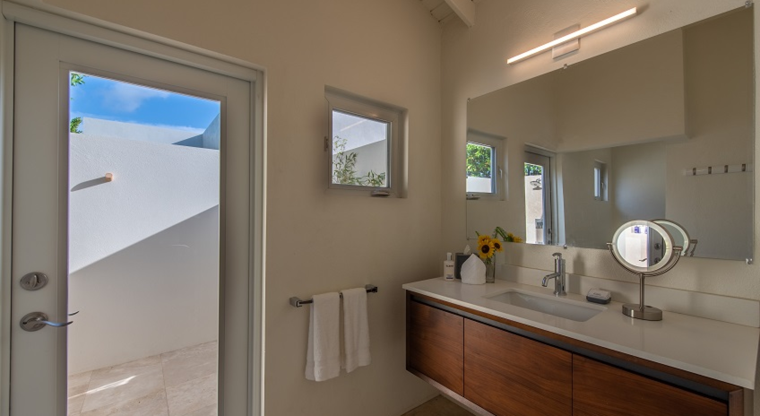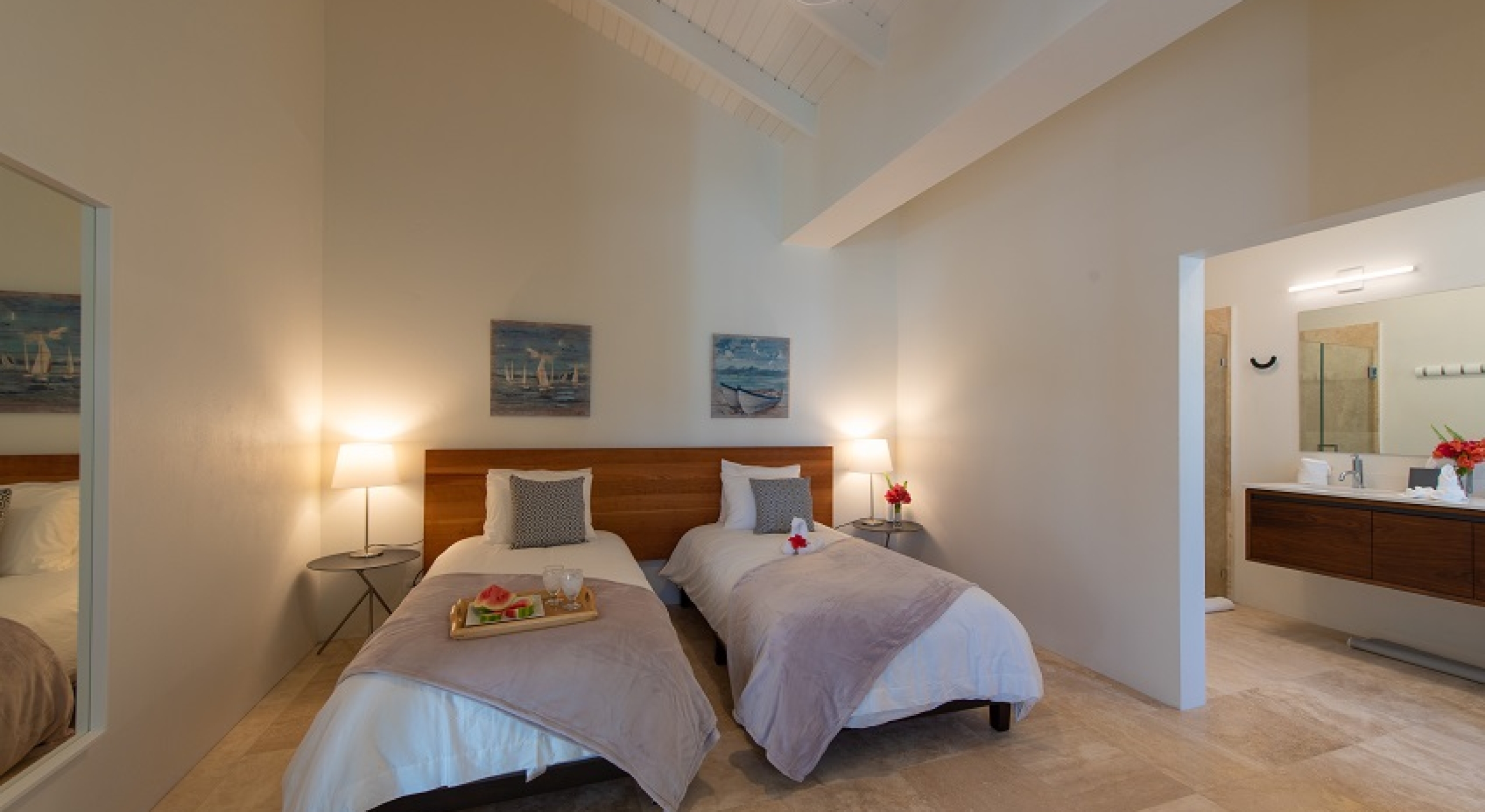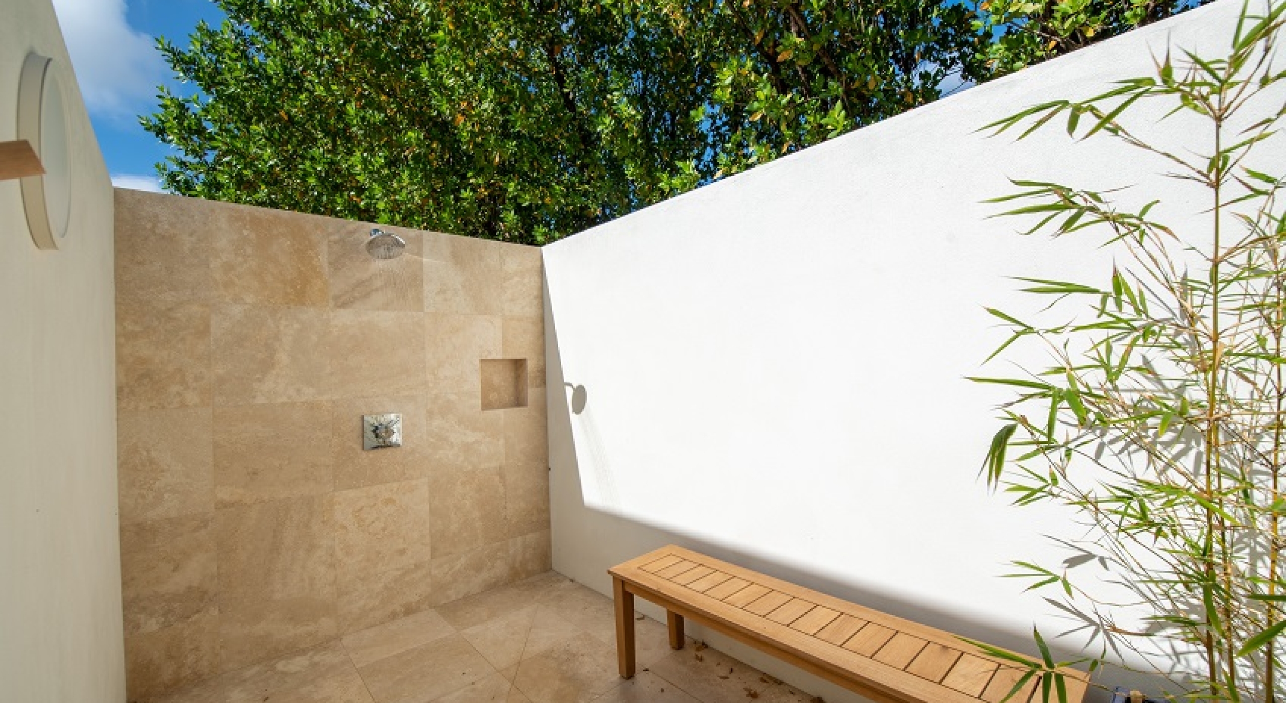 Round Rock offers full WiFi, a Sonos system, surveillance cameras, and a generator. The comfortably furnished interior includes a living room with cable TV, a fully equipped gym, and a gourmet kitchen. The kitchen’s Nespresso machine, dishwasher, blender, microwave, toaster, and iron/ironing board are tucked amongst chic slate cabinetry. Each of the six bedrooms has an ensuite bathroom, screens, a safe, and air-conditioning. The main house’s master suite has interior and exterior access. Each of the remaining suites has two twin beds that can be made up as a king. Two twin suites are in the main house, one is in the guest cottage, and two are in the rear building.