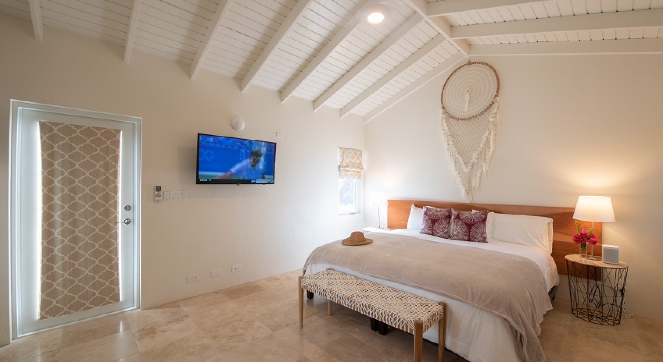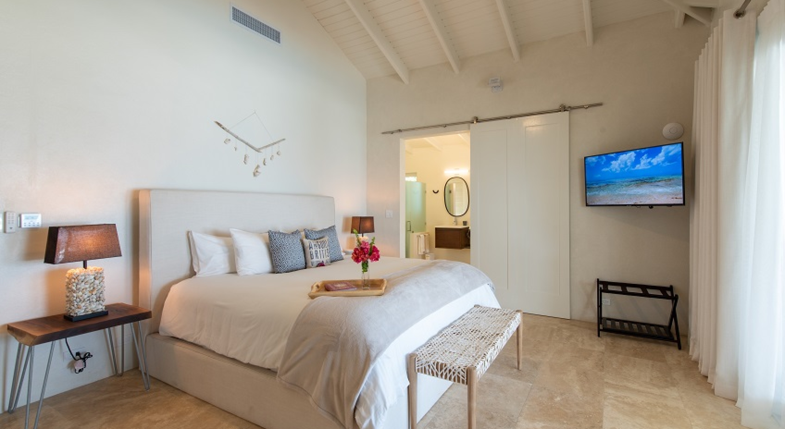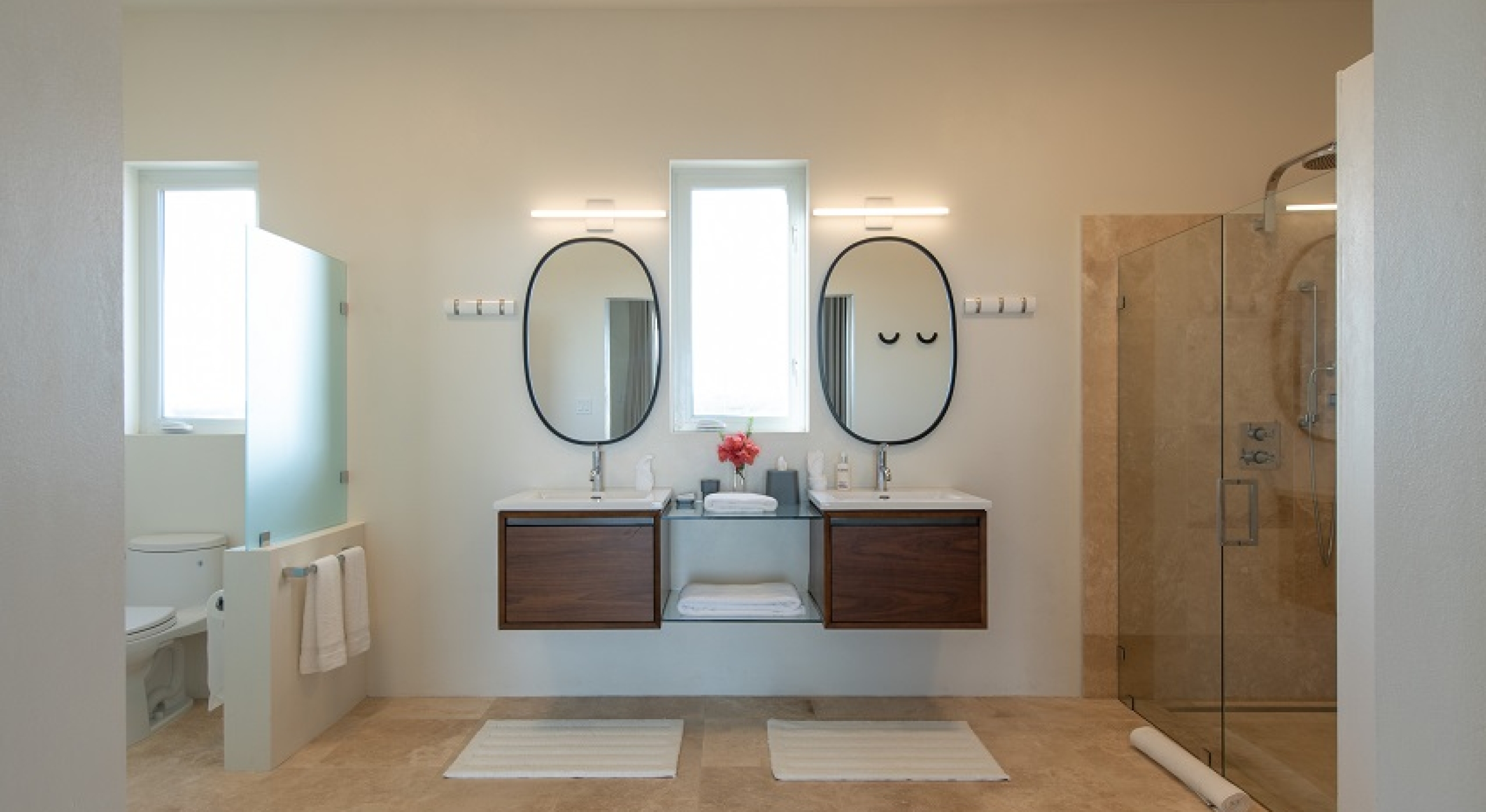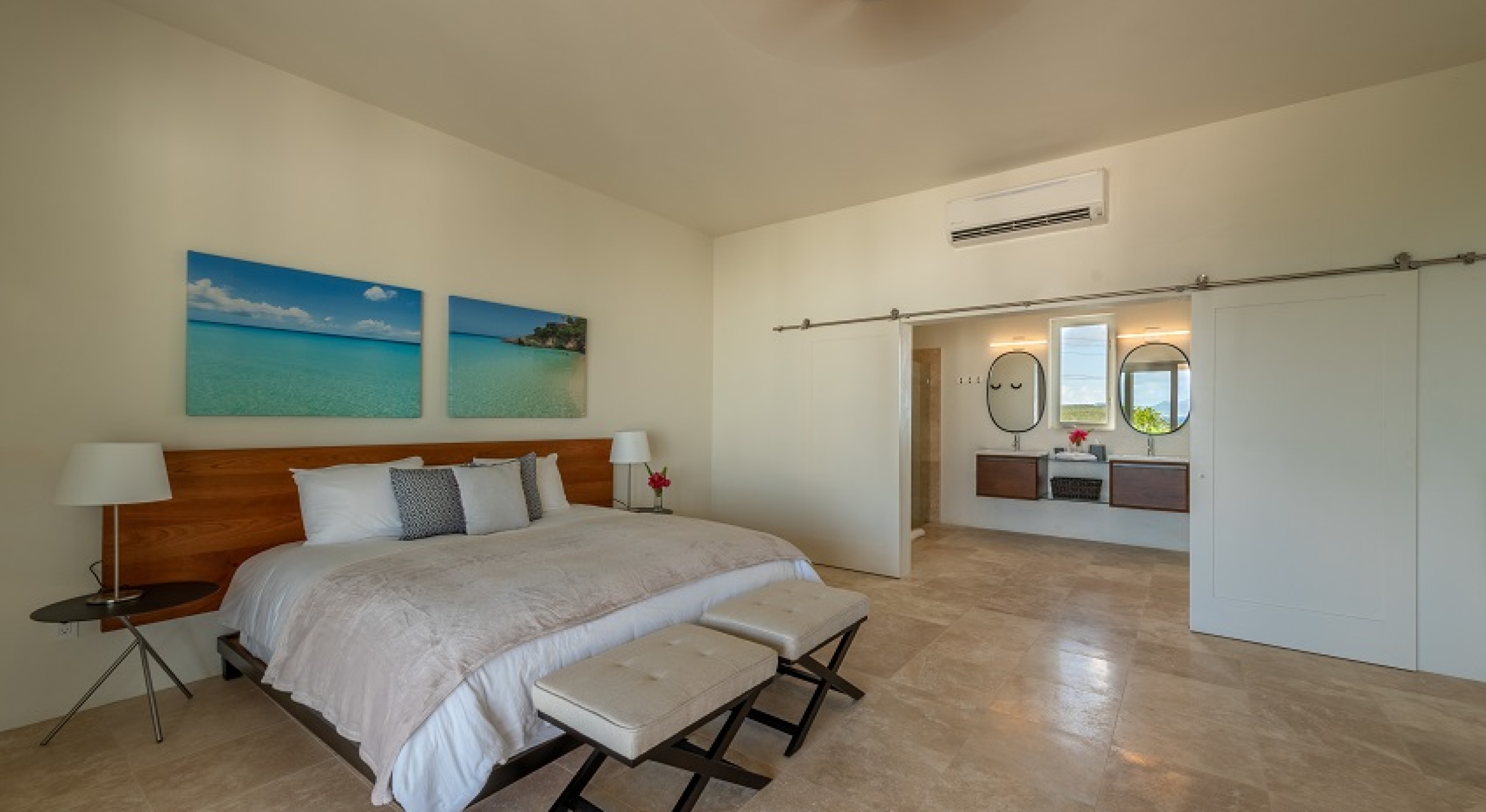 Round Rock offers full WiFi, a Sonos system, surveillance cameras, and a generator. The comfortably furnished interior includes a living room with cable TV, a fully equipped gym, and a gourmet kitchen. The kitchen’s Nespresso machine, dishwasher, blender, microwave, toaster, and iron/ironing board are tucked amongst chic slate cabinetry. Each of the six bedrooms has an ensuite bathroom, screens, a safe, and air-conditioning. The main house’s master suite has interior and exterior access. Each of the remaining suites has two twin beds that can be made up as a king. Two twin suites are in the main house, one is in the guest cottage, and two are in the rear building.