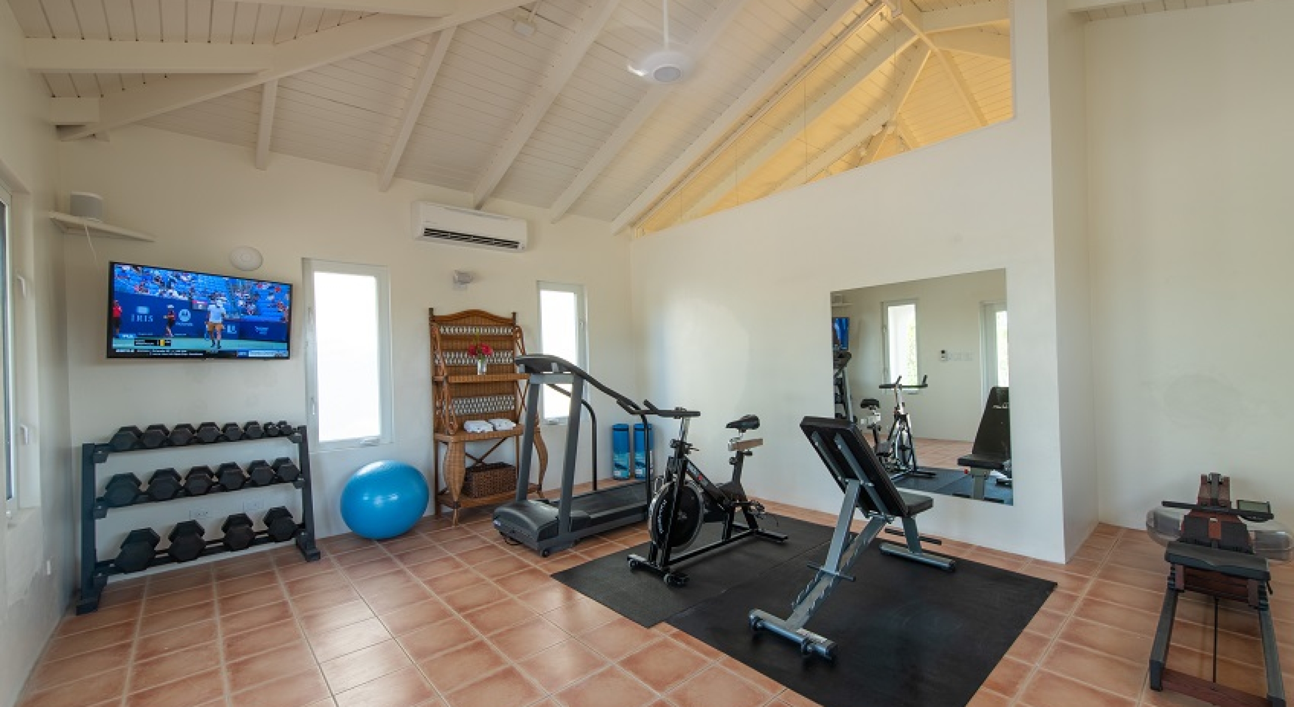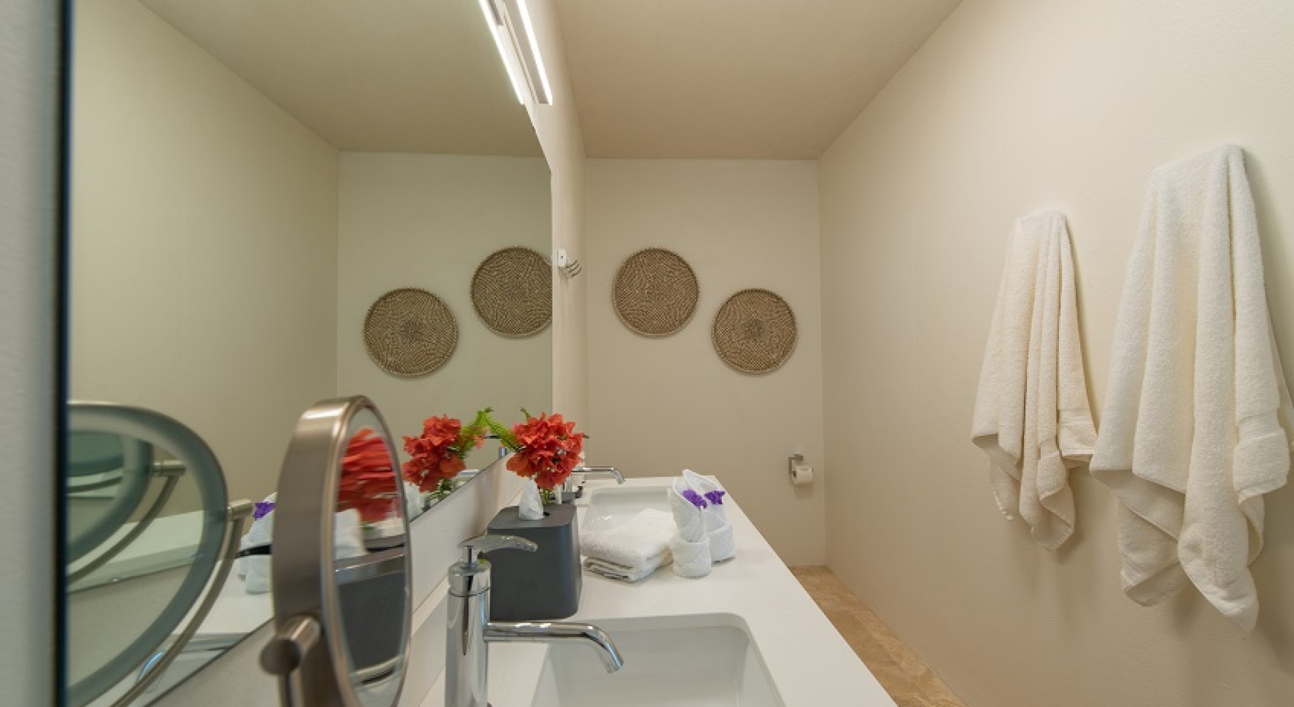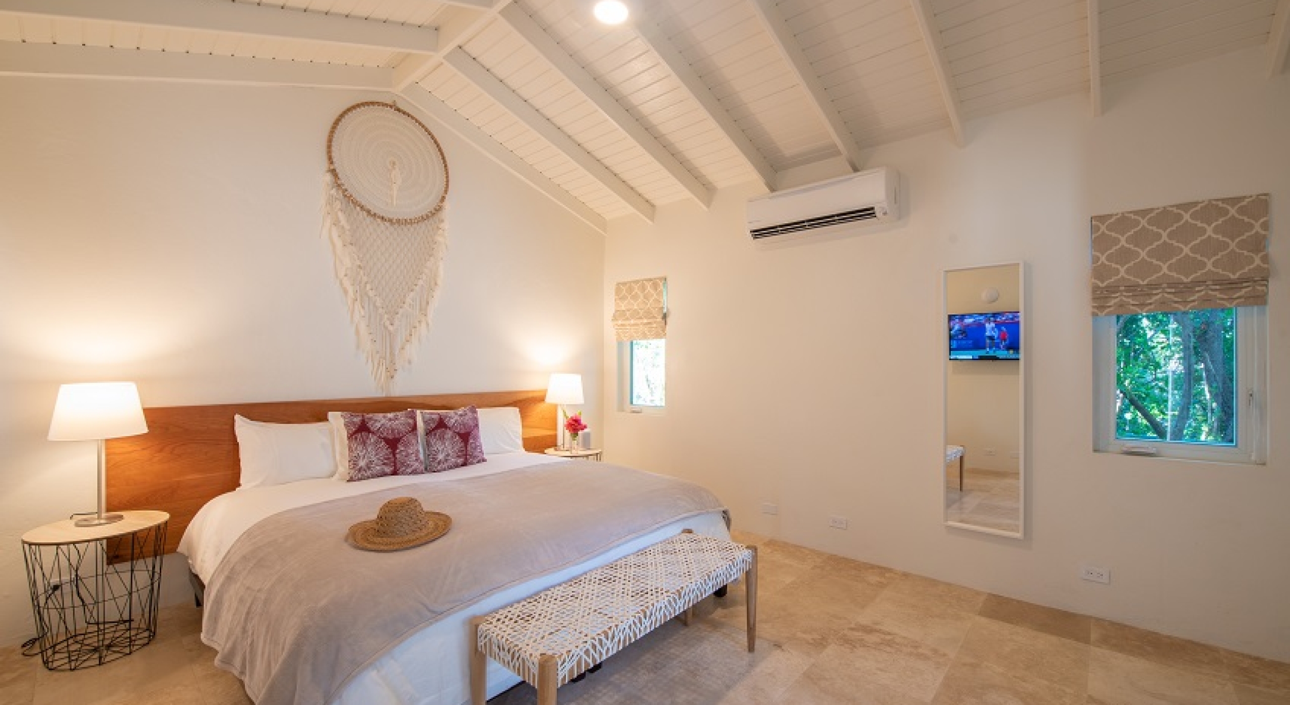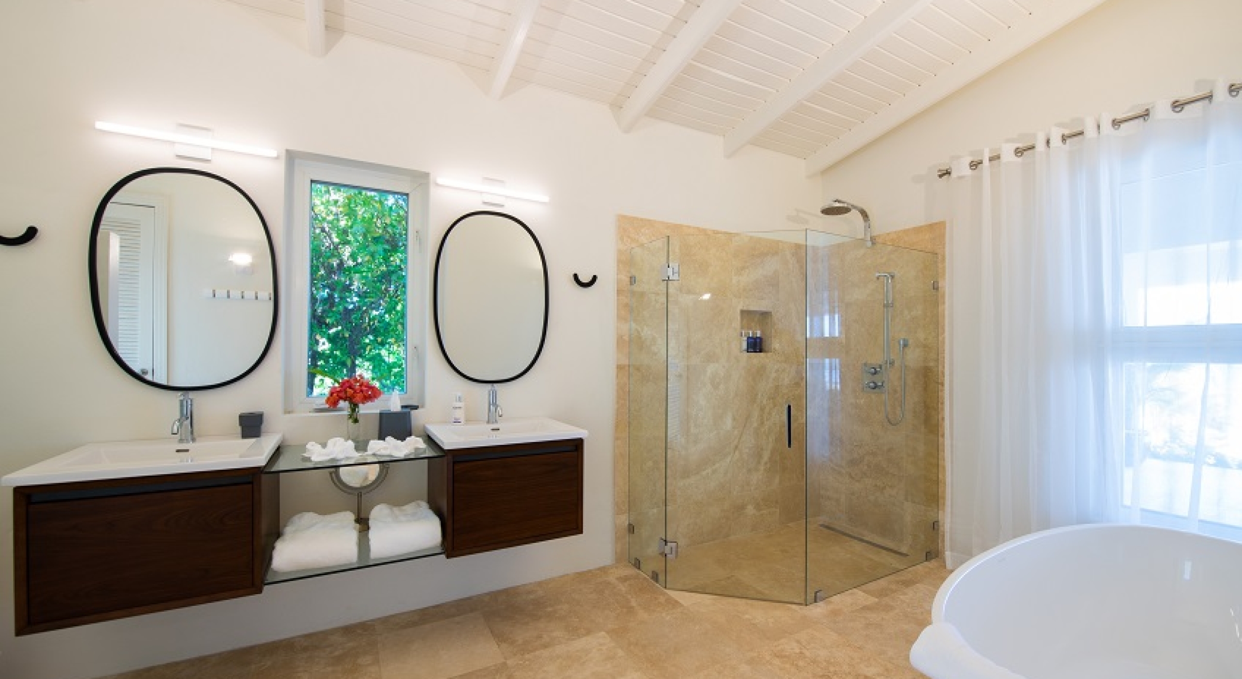 Round Rock offers full WiFi, a Sonos system, surveillance cameras, and a generator. The comfortably furnished interior includes a living room with cable TV, a fully equipped gym, and a gourmet kitchen. The kitchen’s Nespresso machine, dishwasher, blender, microwave, toaster, and iron/ironing board are tucked amongst chic slate cabinetry. Each of the six bedrooms has an ensuite bathroom, screens, a safe, and air-conditioning. The main house’s master suite has interior and exterior access. Each of the remaining suites has two twin beds that can be made up as a king. Two twin suites are in the main house, one is in the guest cottage, and two are in the rear building.