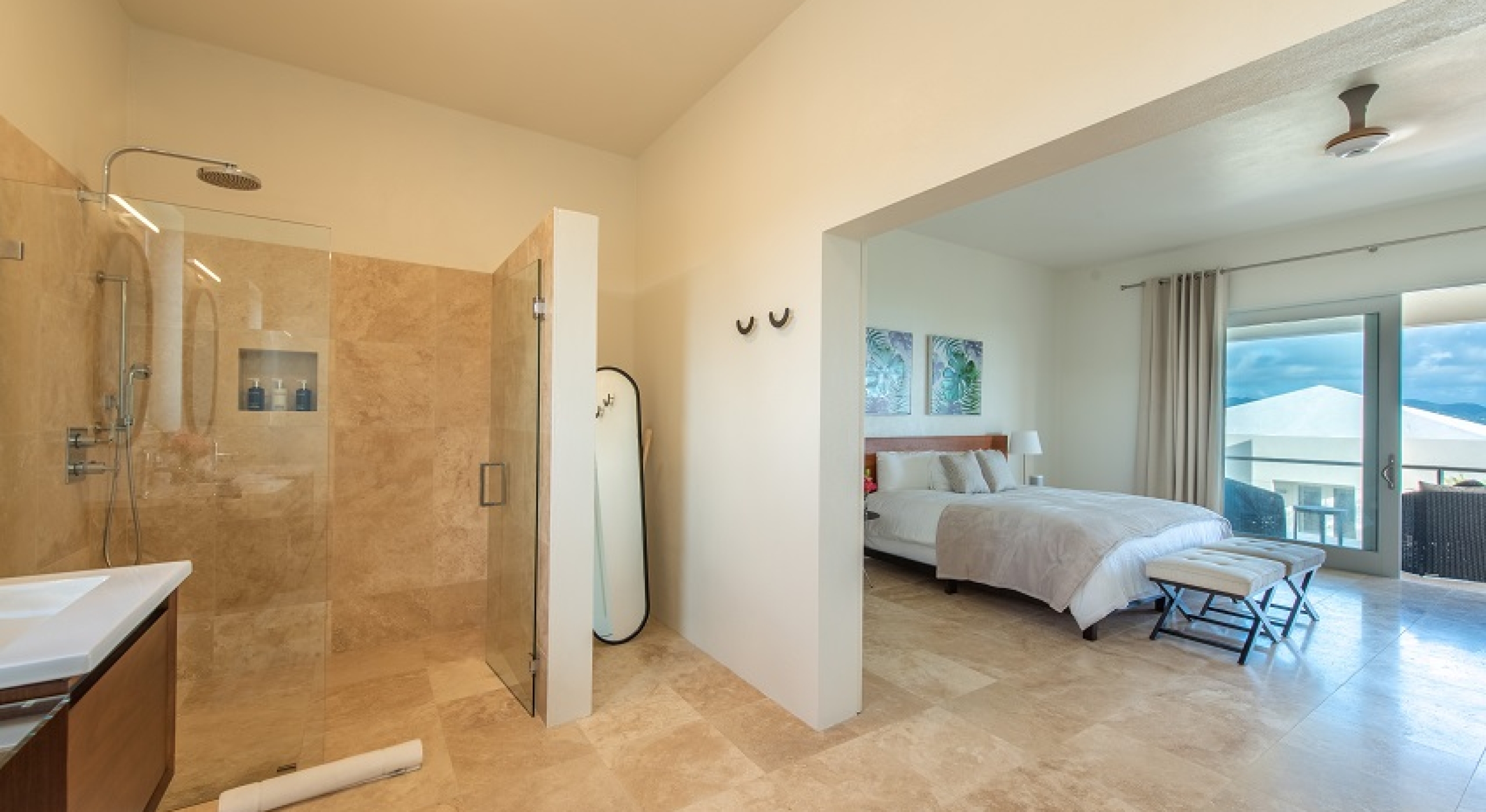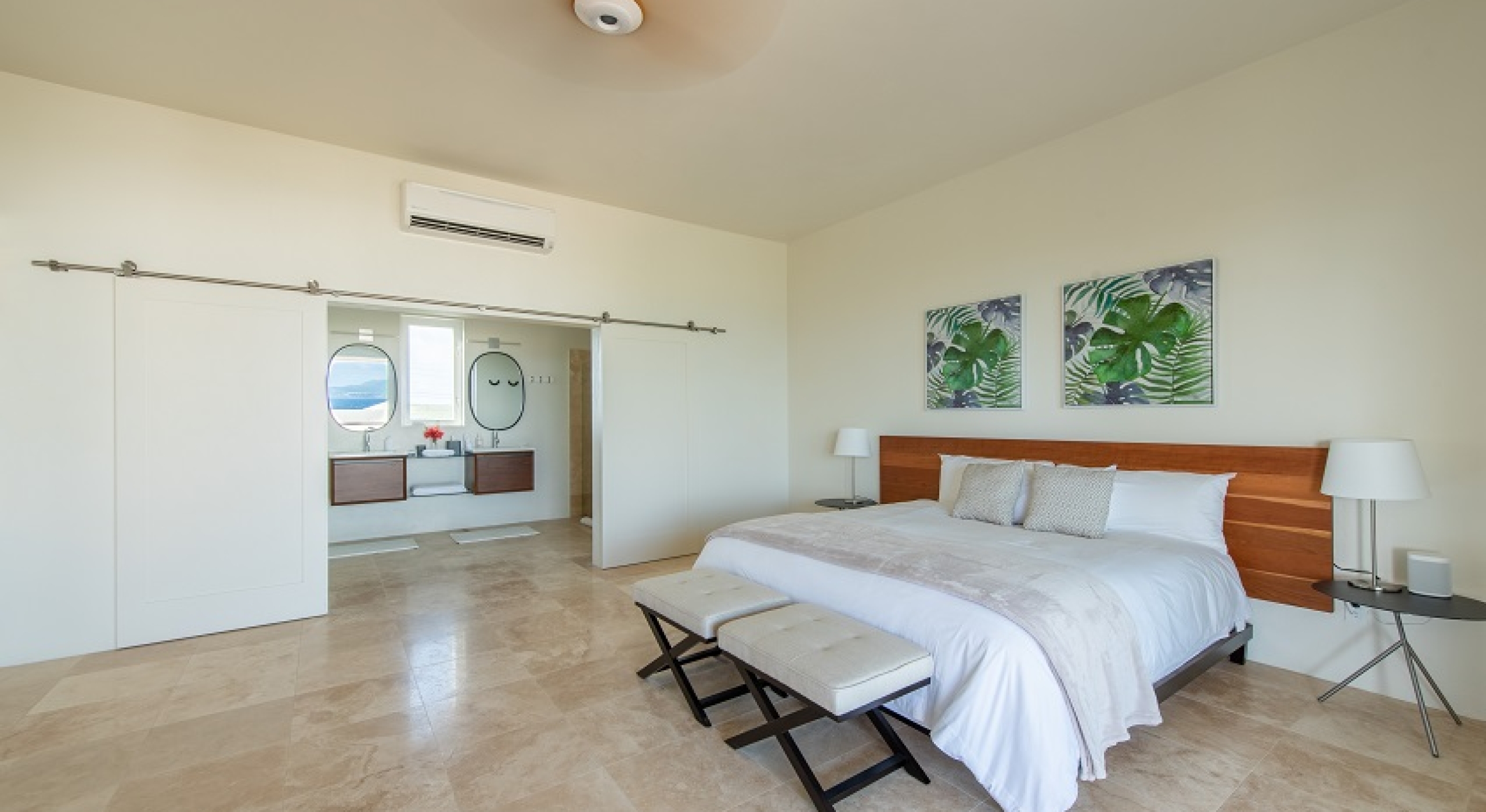 Bedroom 1 - Master: King size bed, Ensuite bathroom with stand-alone rain shower and bathtub, Alfresco shower, Dual vanity, Television, Safe, Air conditioning, Ceiling fan, Outdoor lounge area, Direct access to pool, Ocean view