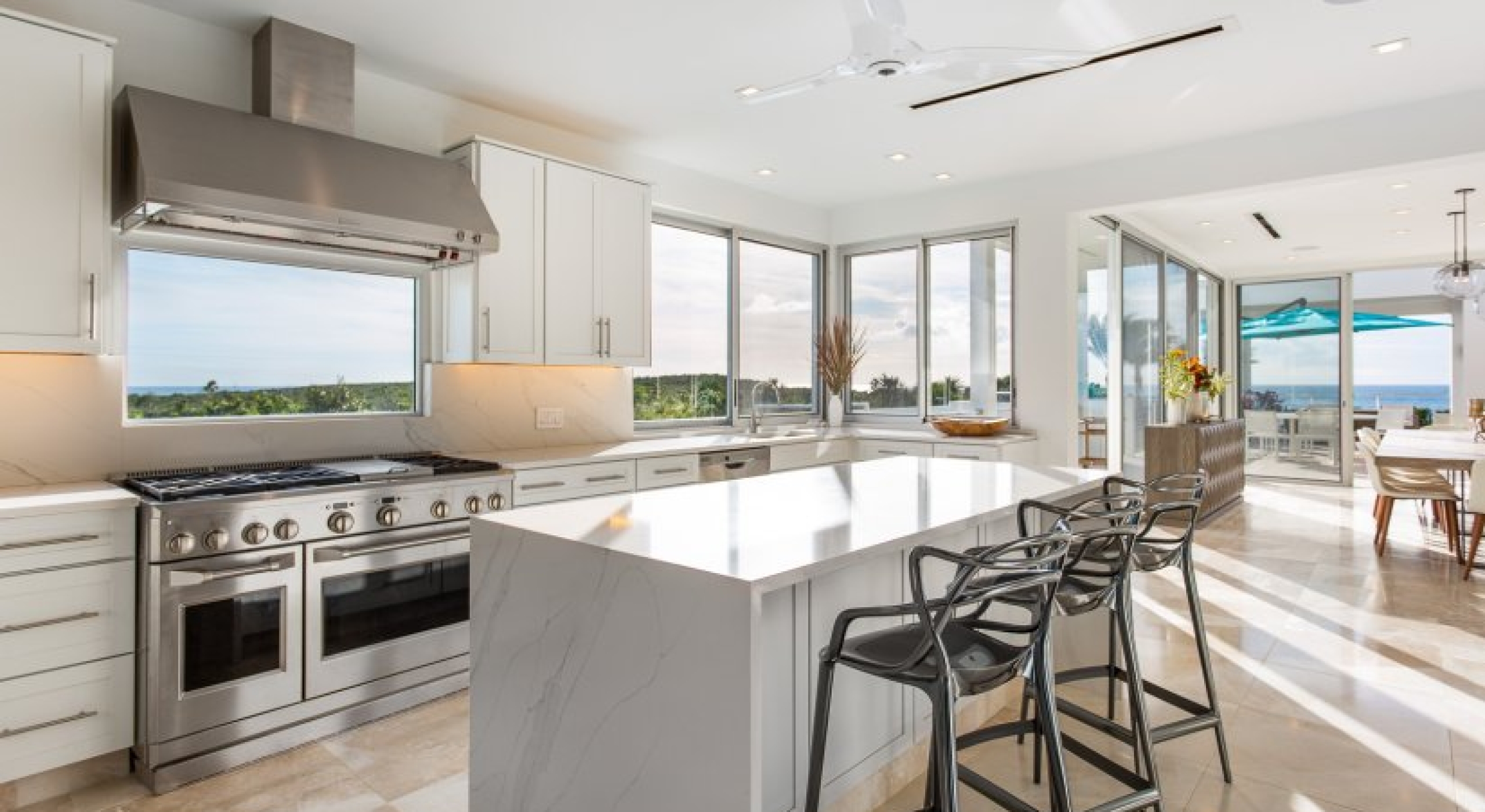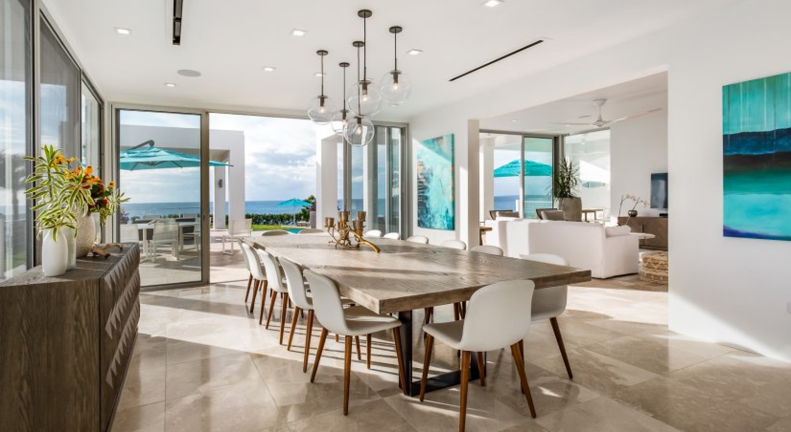 Villa Kandara has 8,000 square feet of space, an acre of land and its own private beach cove. Although its only a short drive from activity, it seems like you have the whole West End to yourself. The ocean views are panoramic, and glass walls throughout the home ensure that you get to soak up as much of the sun and sea as possible.
