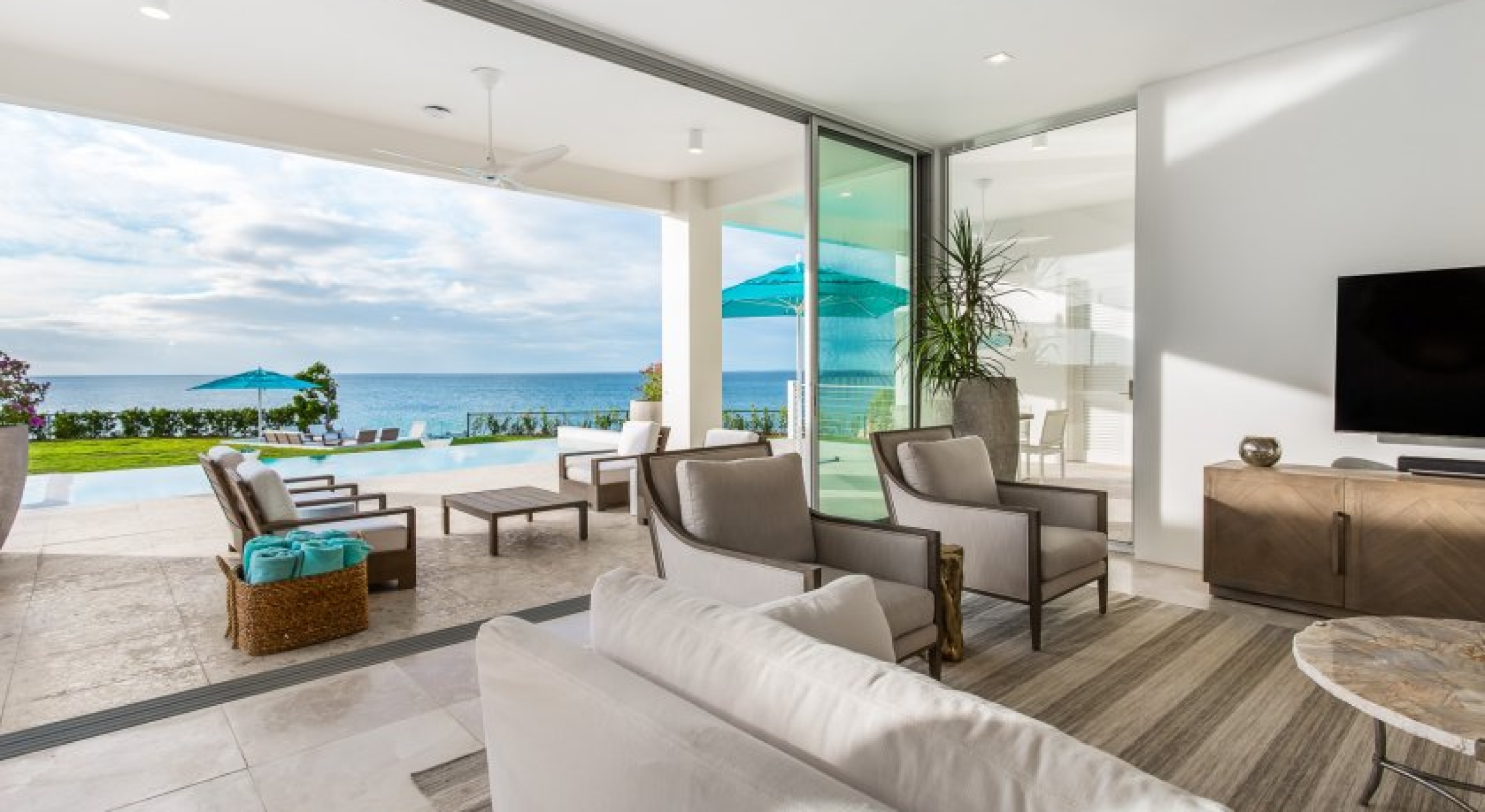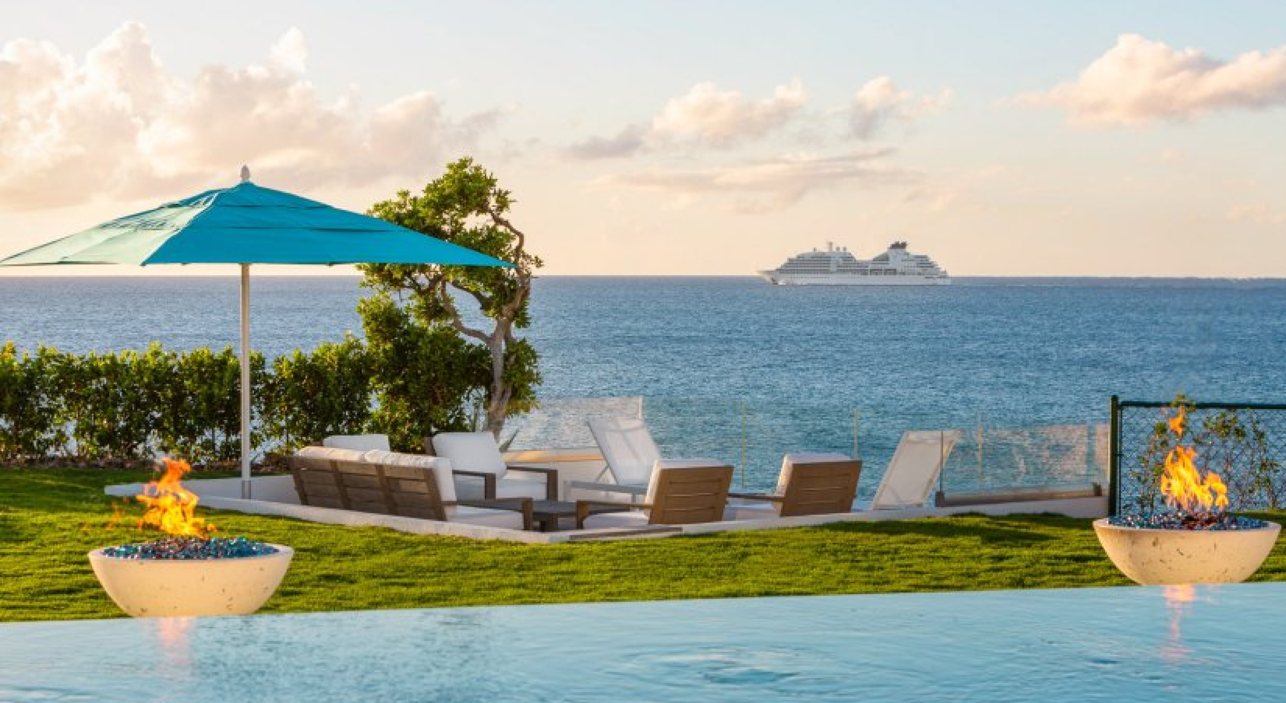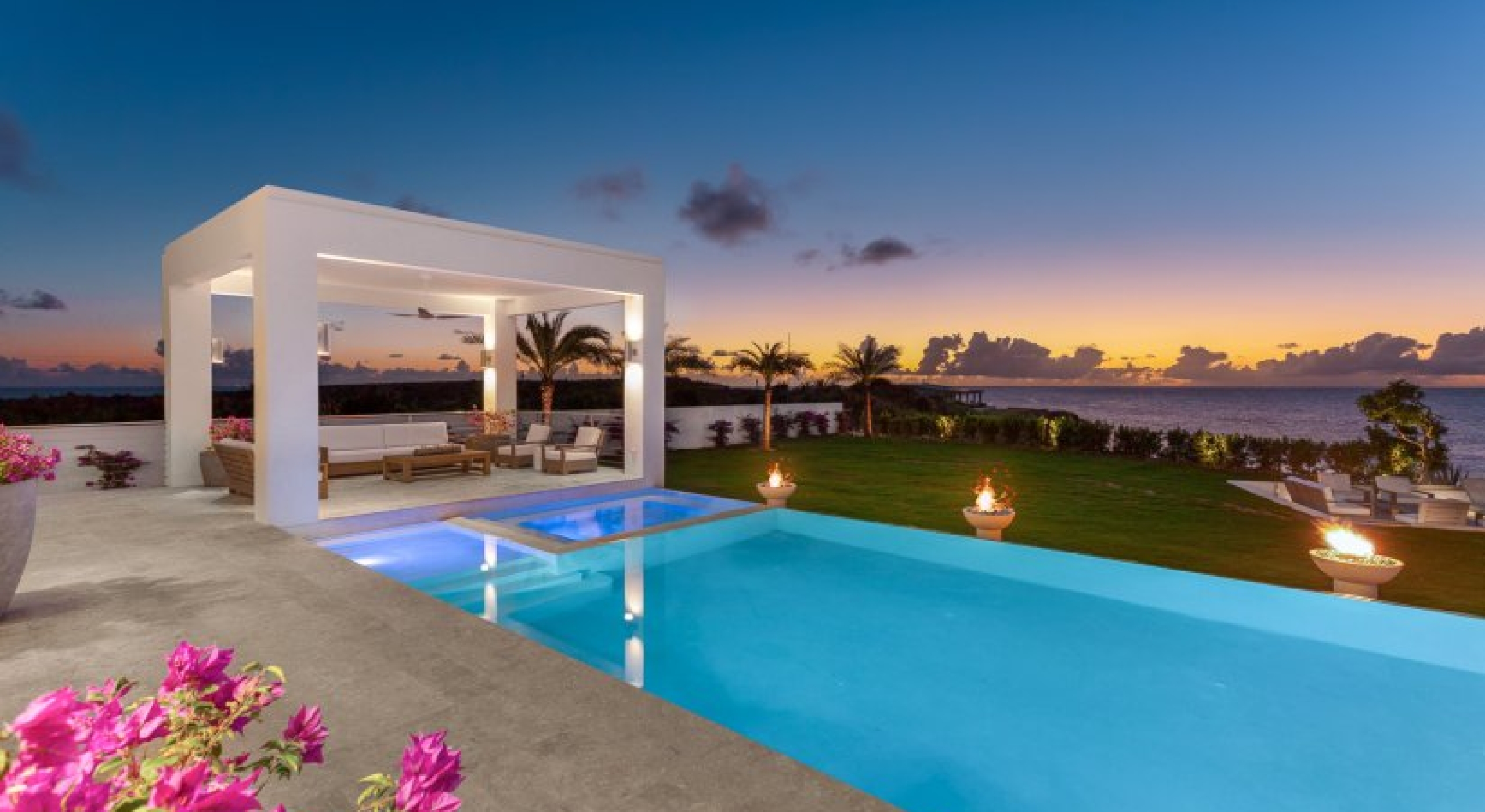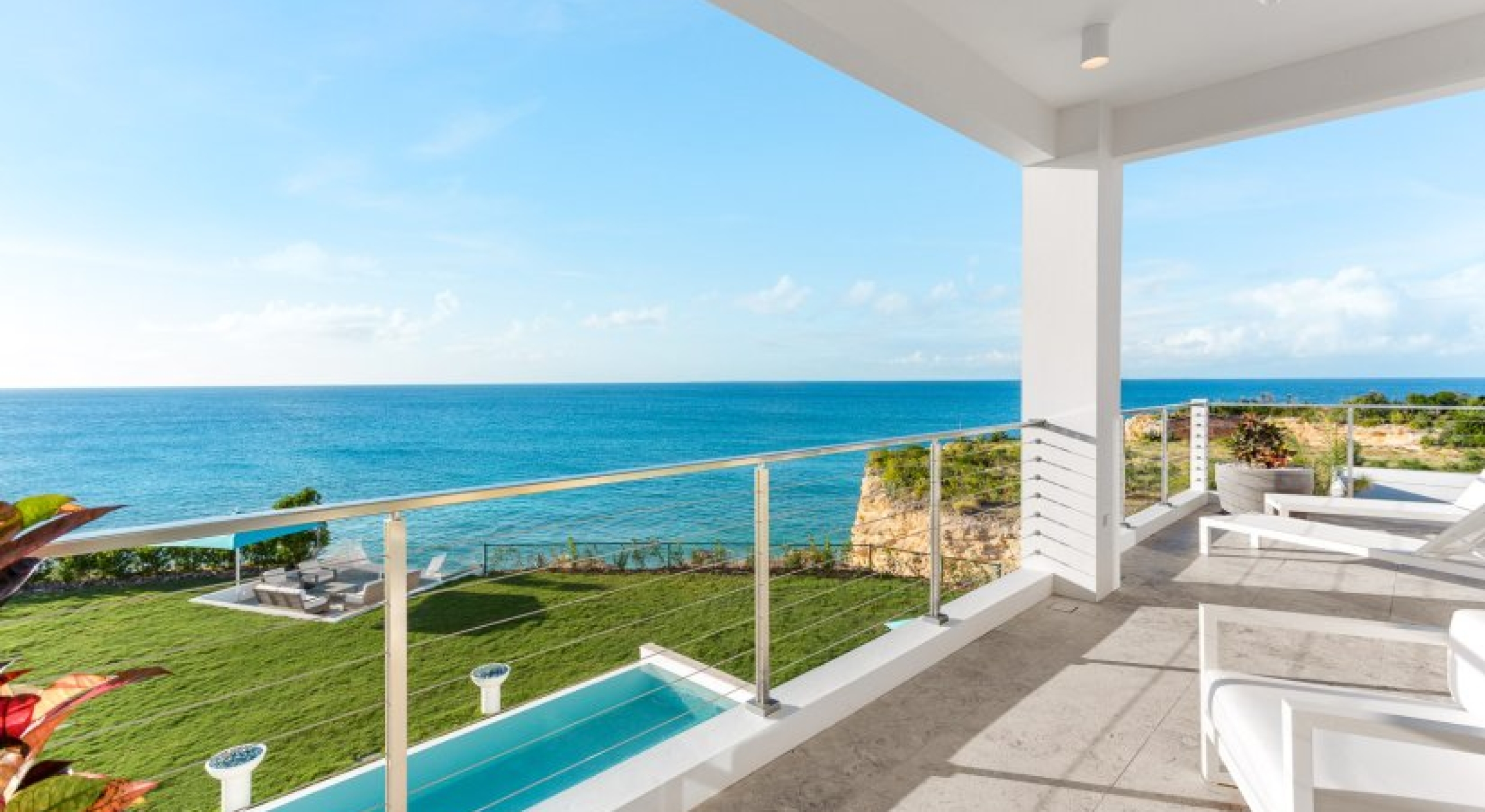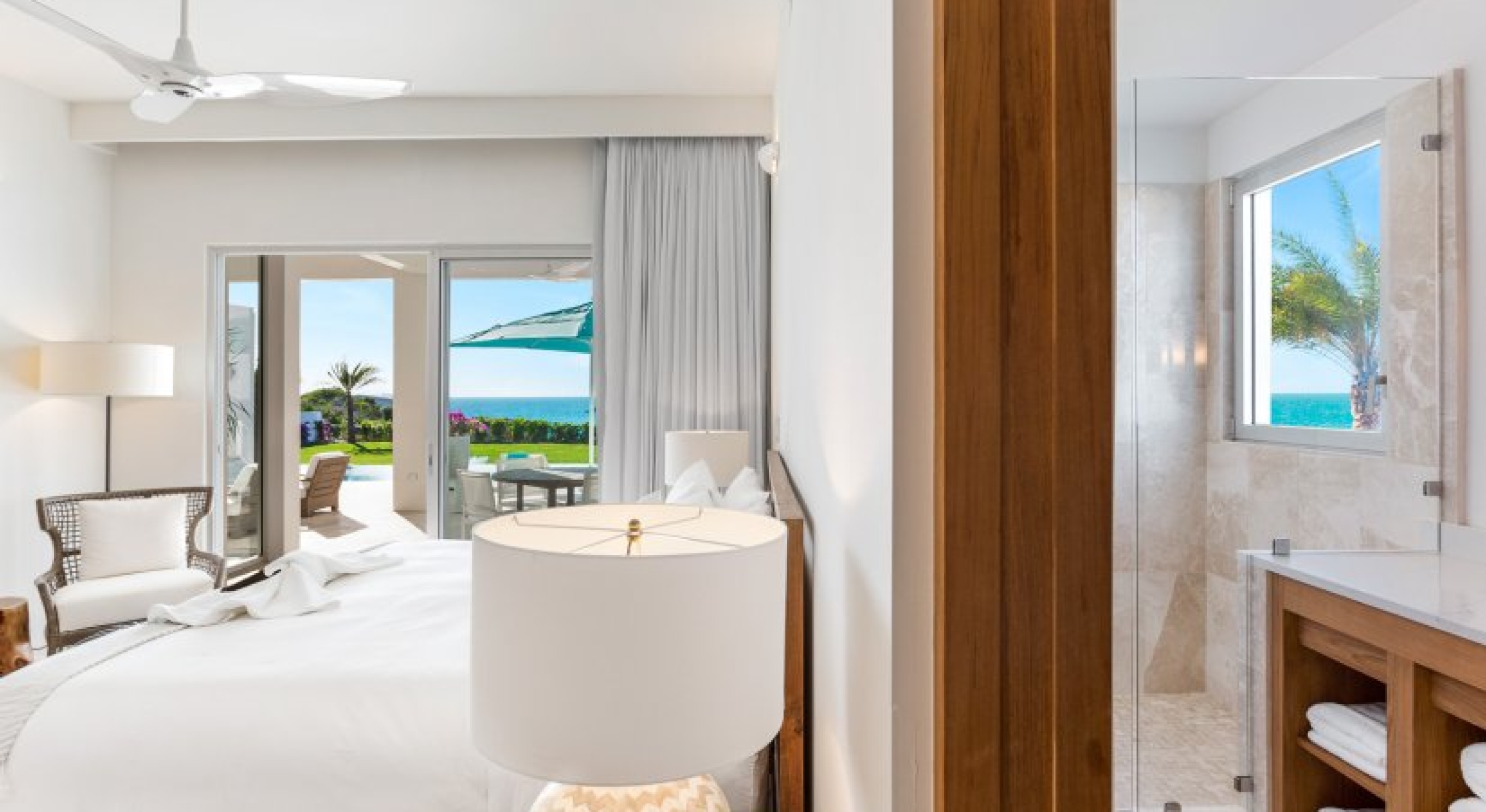 Perfectly manicured palm trees, flowers, and hedges are planted around the villa’s lawn. There’s a sundeck on the far end of the lawn and wide-open ocean views. A set of stairs leads down to the villa’s private cove and slice of the sea. A glass-encased infinity pool bridges the lawn and the terrace, and there’s lounging space under the poolside gazebo.