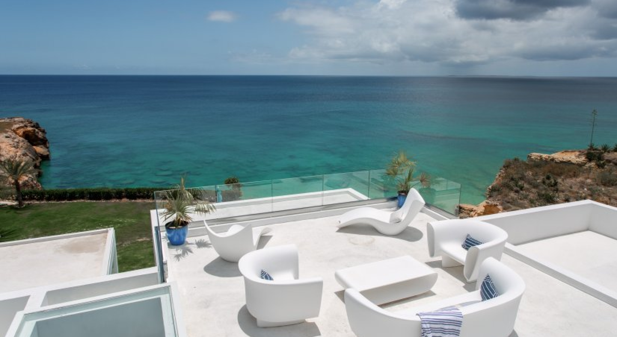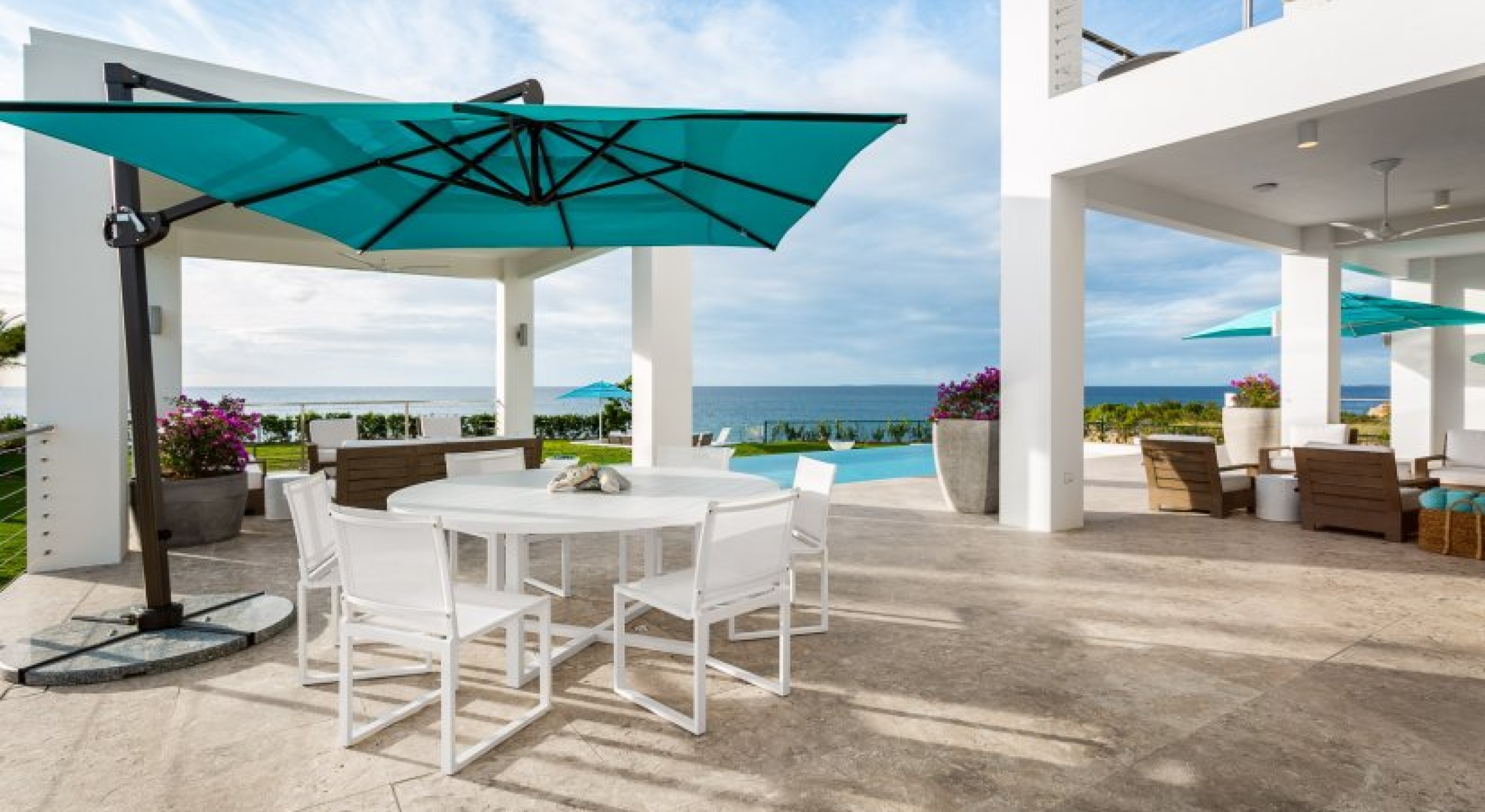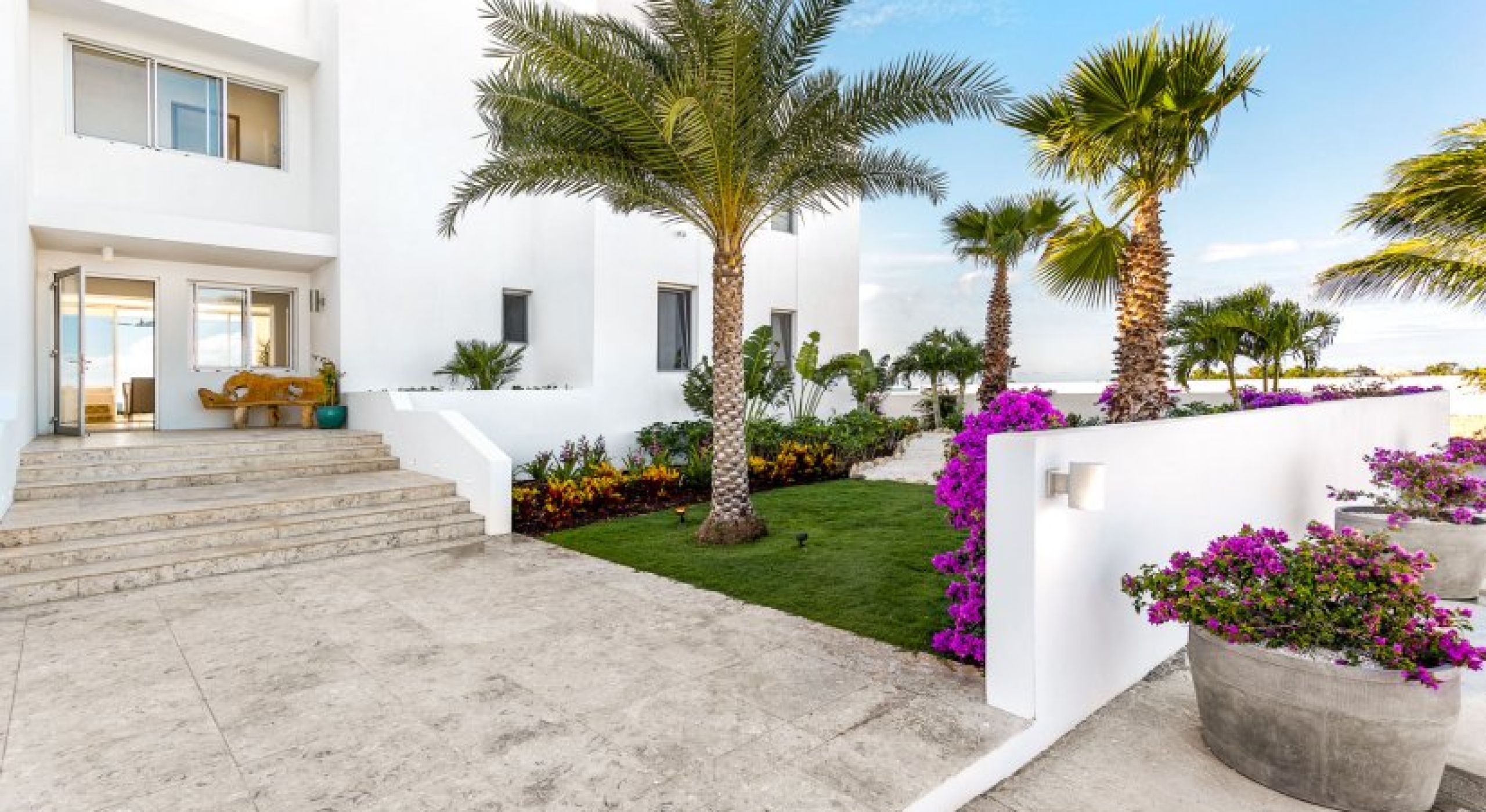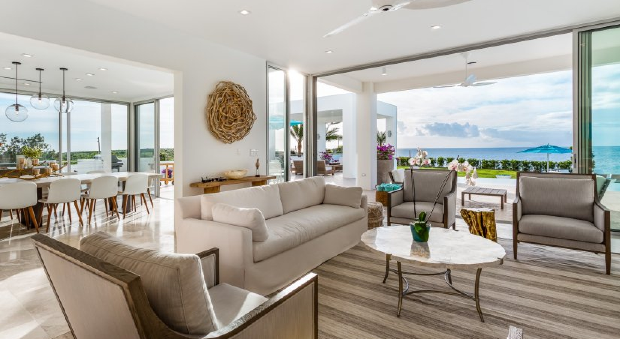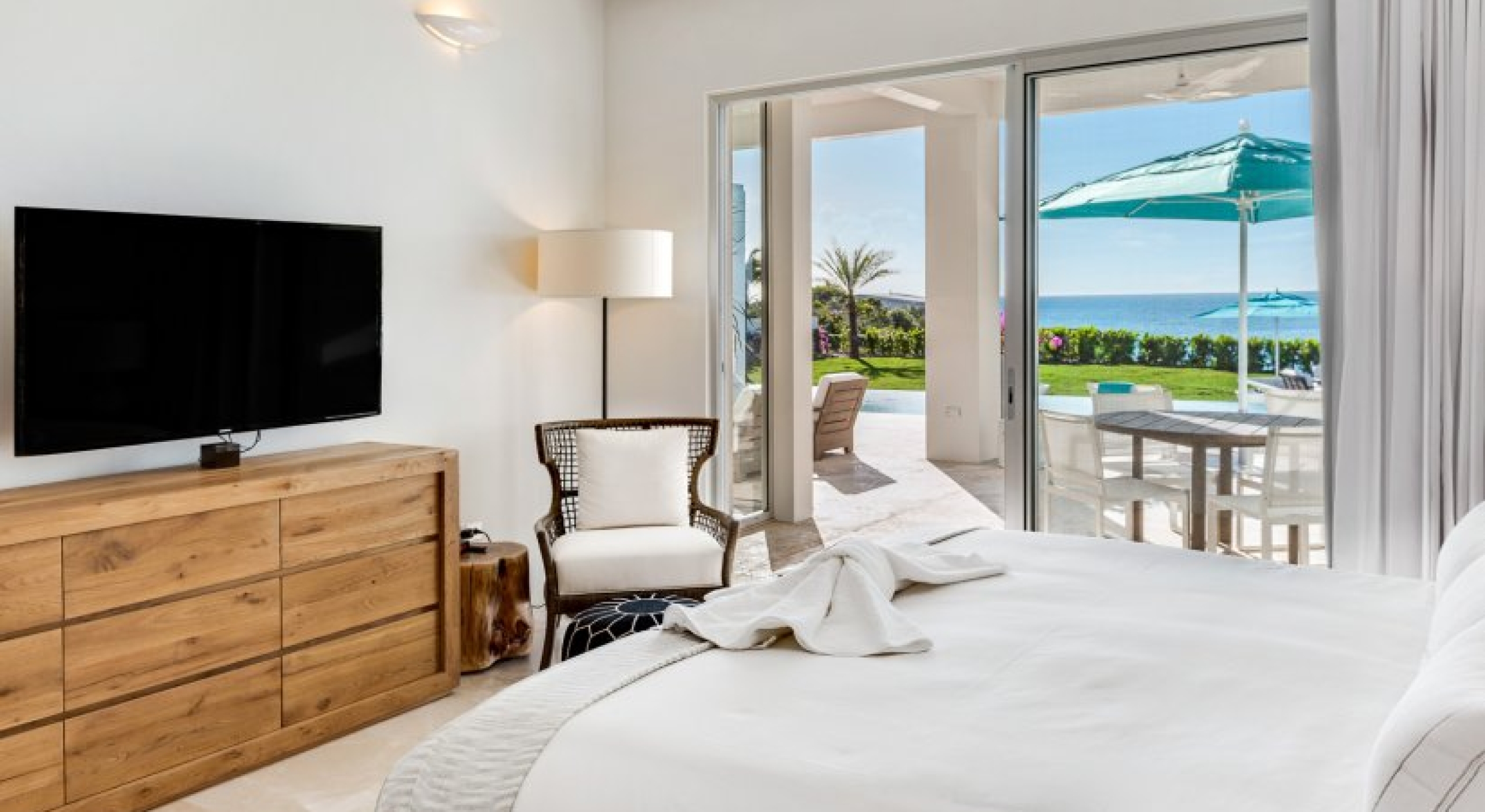 Perfectly manicured palm trees, flowers, and hedges are planted around the villa’s lawn. There’s a sundeck on the far end of the lawn and wide-open ocean views. A set of stairs leads down to the villa’s private cove and slice of the sea. A glass-encased infinity pool bridges the lawn and the terrace, and there’s lounging space under the poolside gazebo.