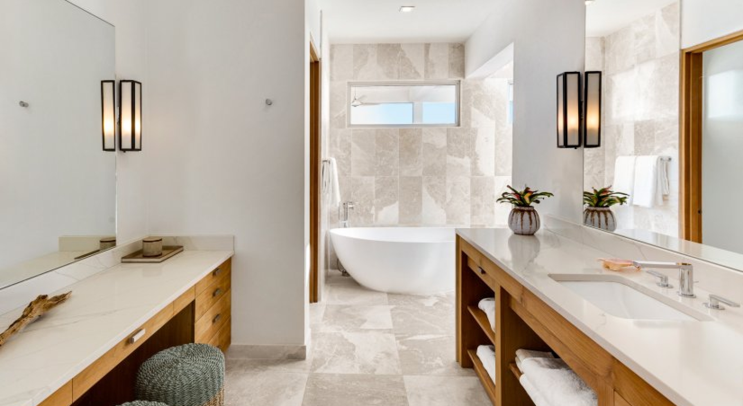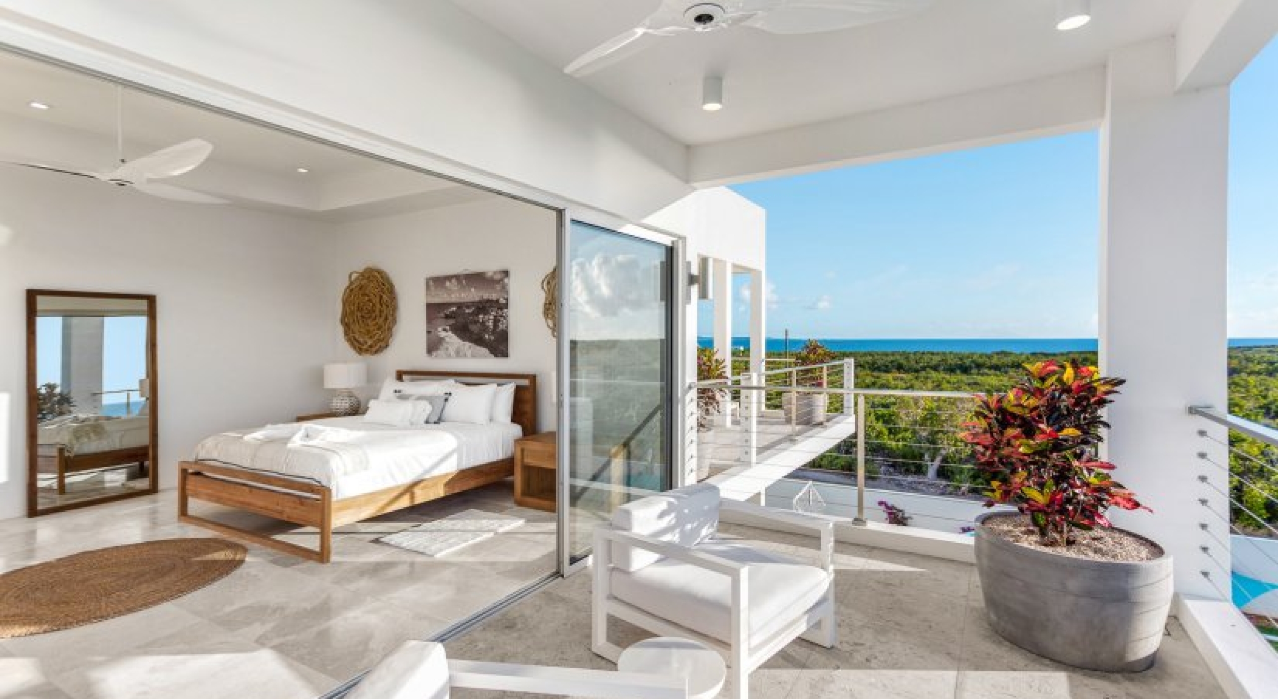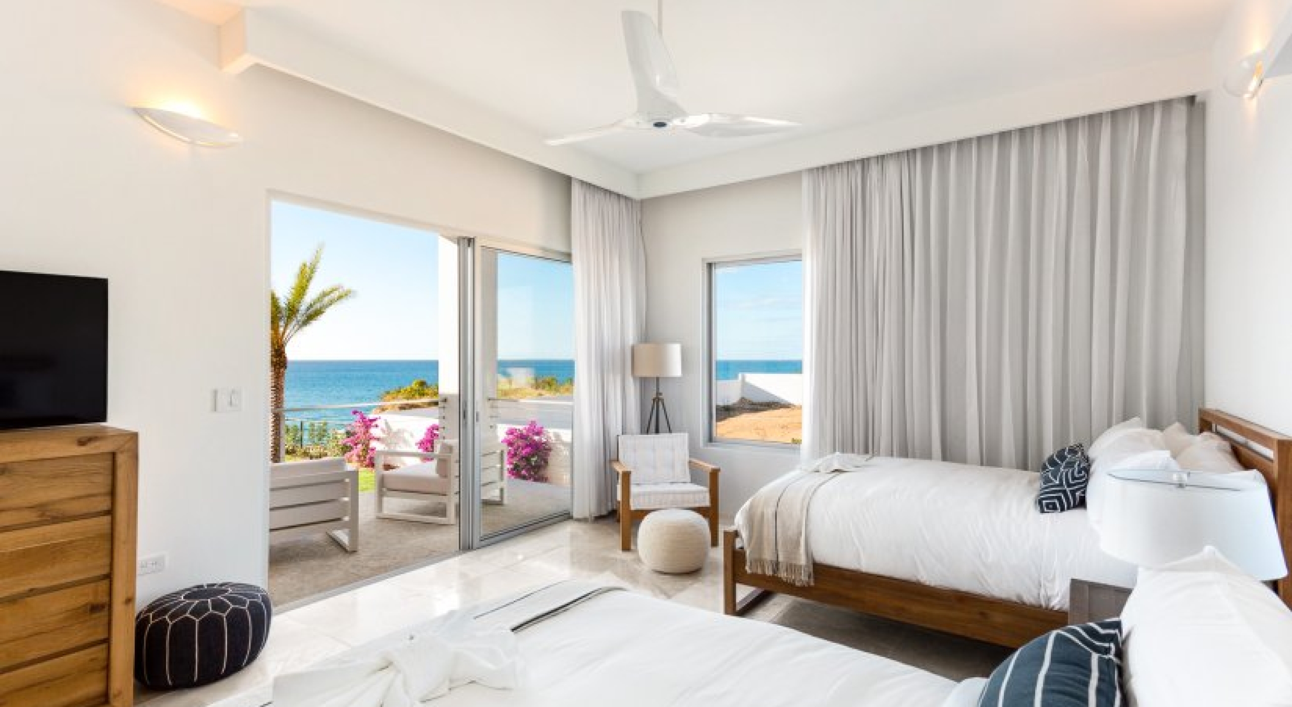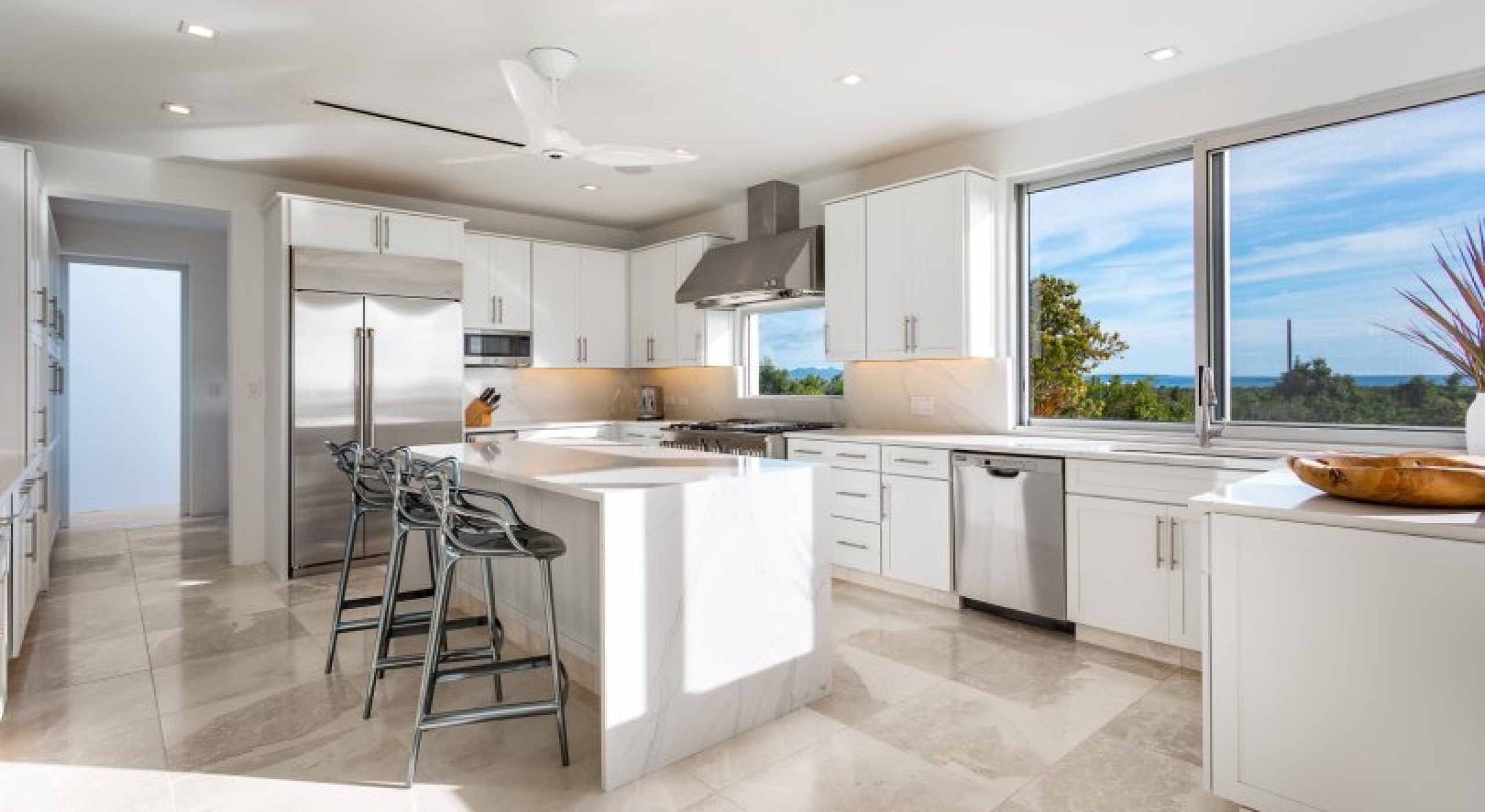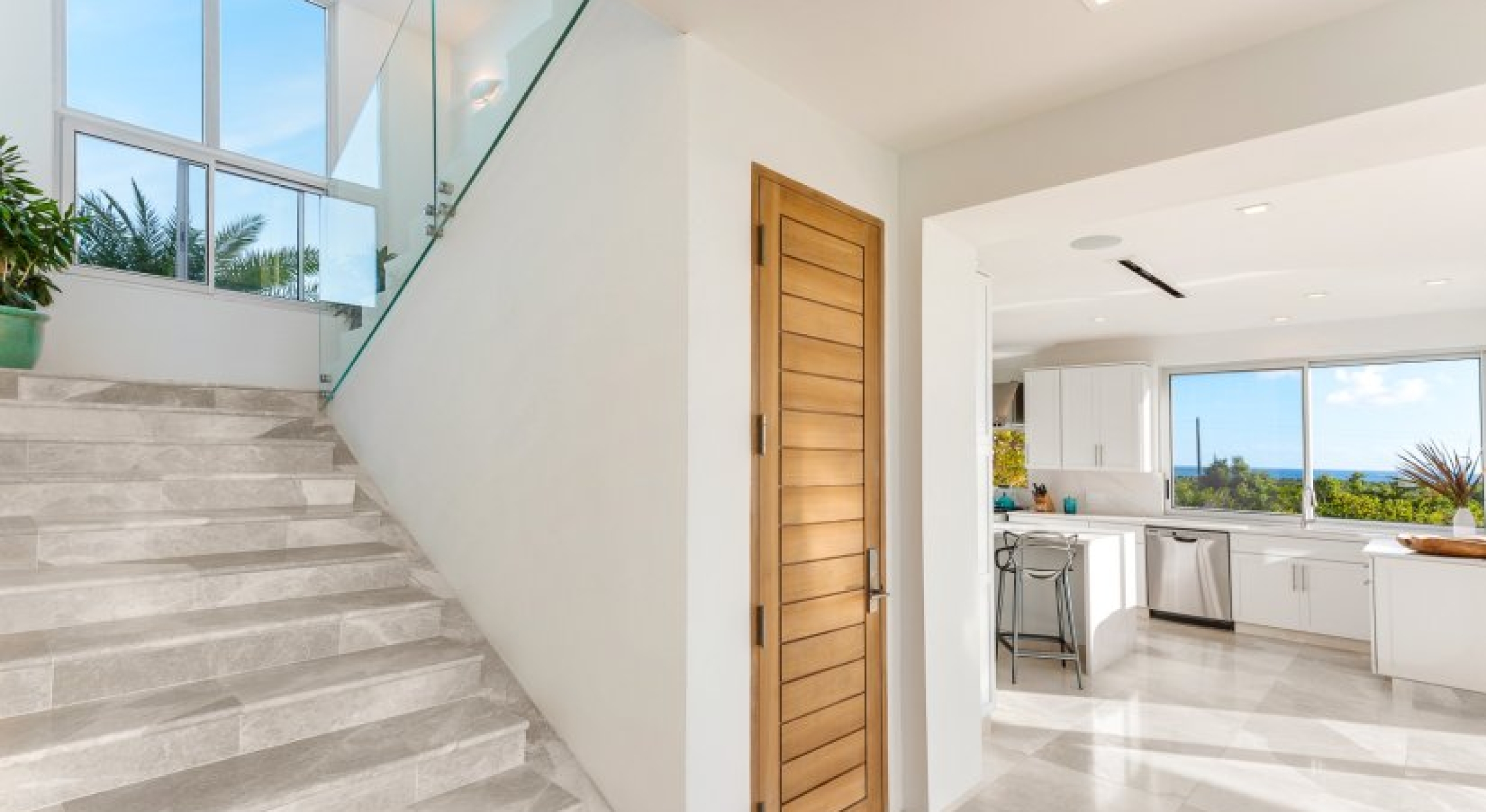 Glass walls and sliding doors lead into the fully air-conditioned interior, which has a security system, SONOS, and WiFi throughout. The common area has two powder rooms, a large kitchen, dining, and a living room. The kitchen has ultra-modern appliances, luxe marbled countertops, and an open design. The dining room opens to the terrace, and seats 8 around a wood and marble table. Lastly, the living room has comfortable lounging furniture, a Smart TV with satellite, ocean views, and access to the pool deck.