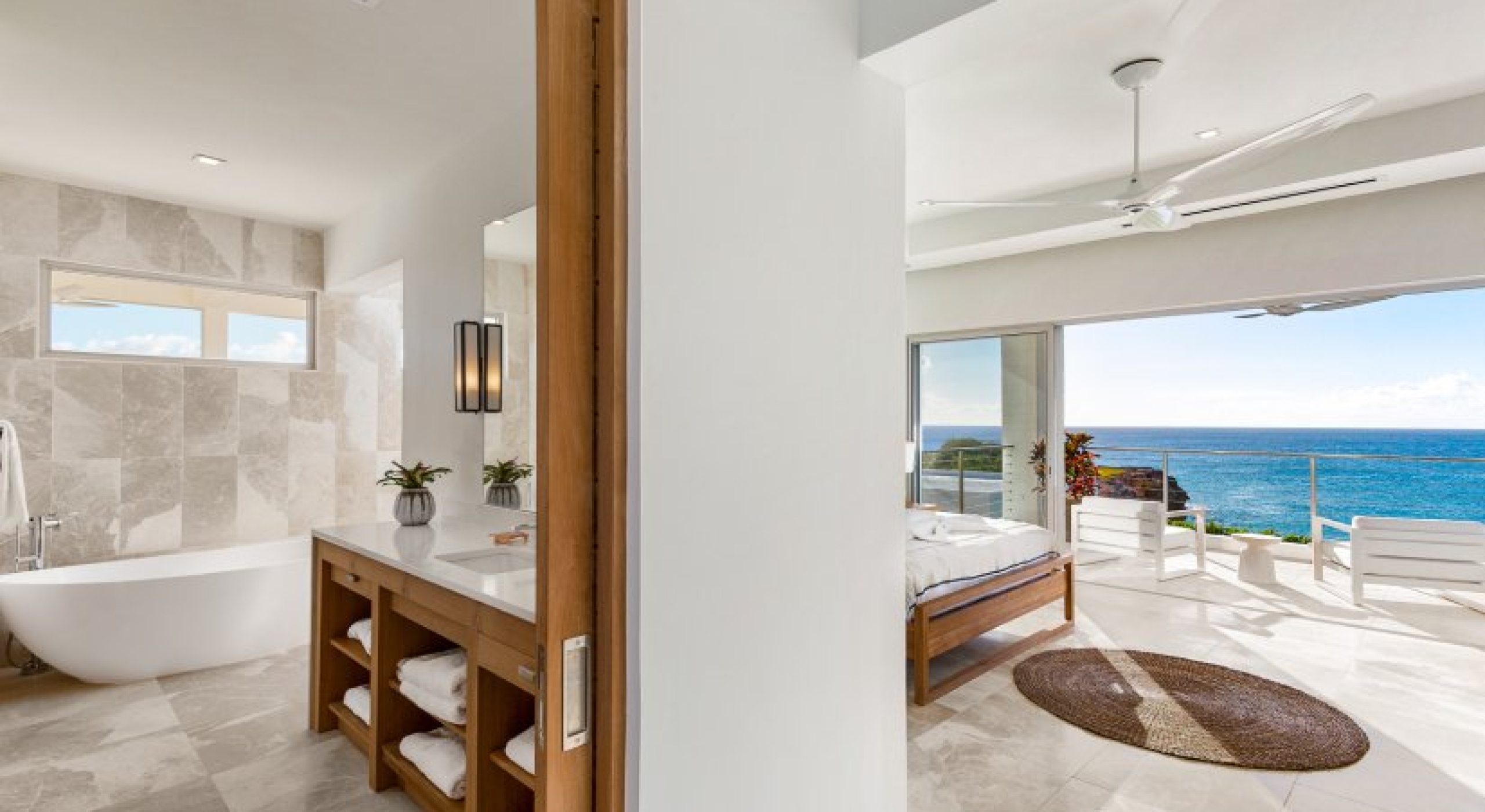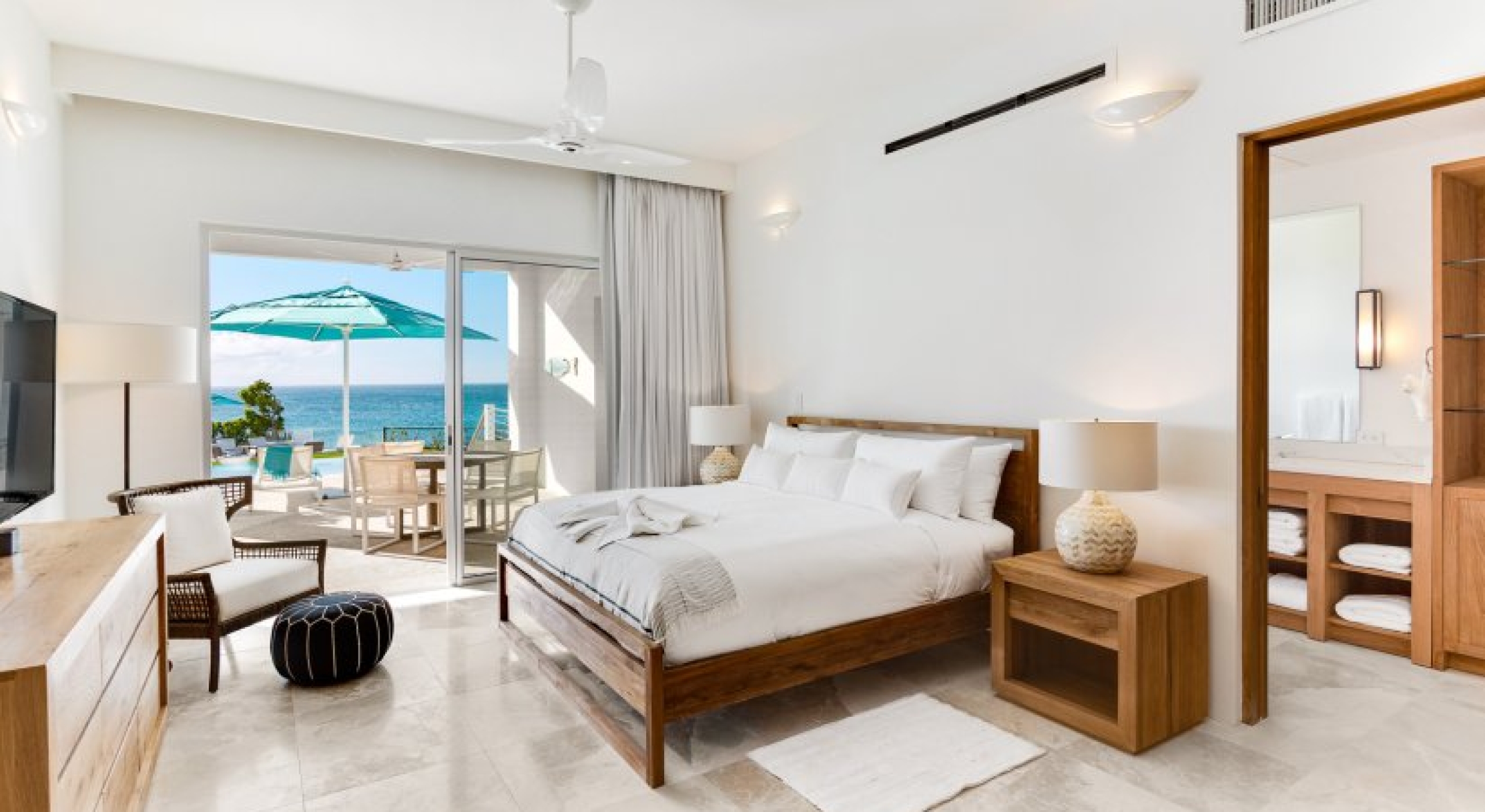 Bedroom 1 - Master: King size bed, Ensuite bathroom with stand-alone shower and bathtub, Dual Vanity, Walk-in closet, Television, Safe, Ceiling fan, Private balcony with lounge area