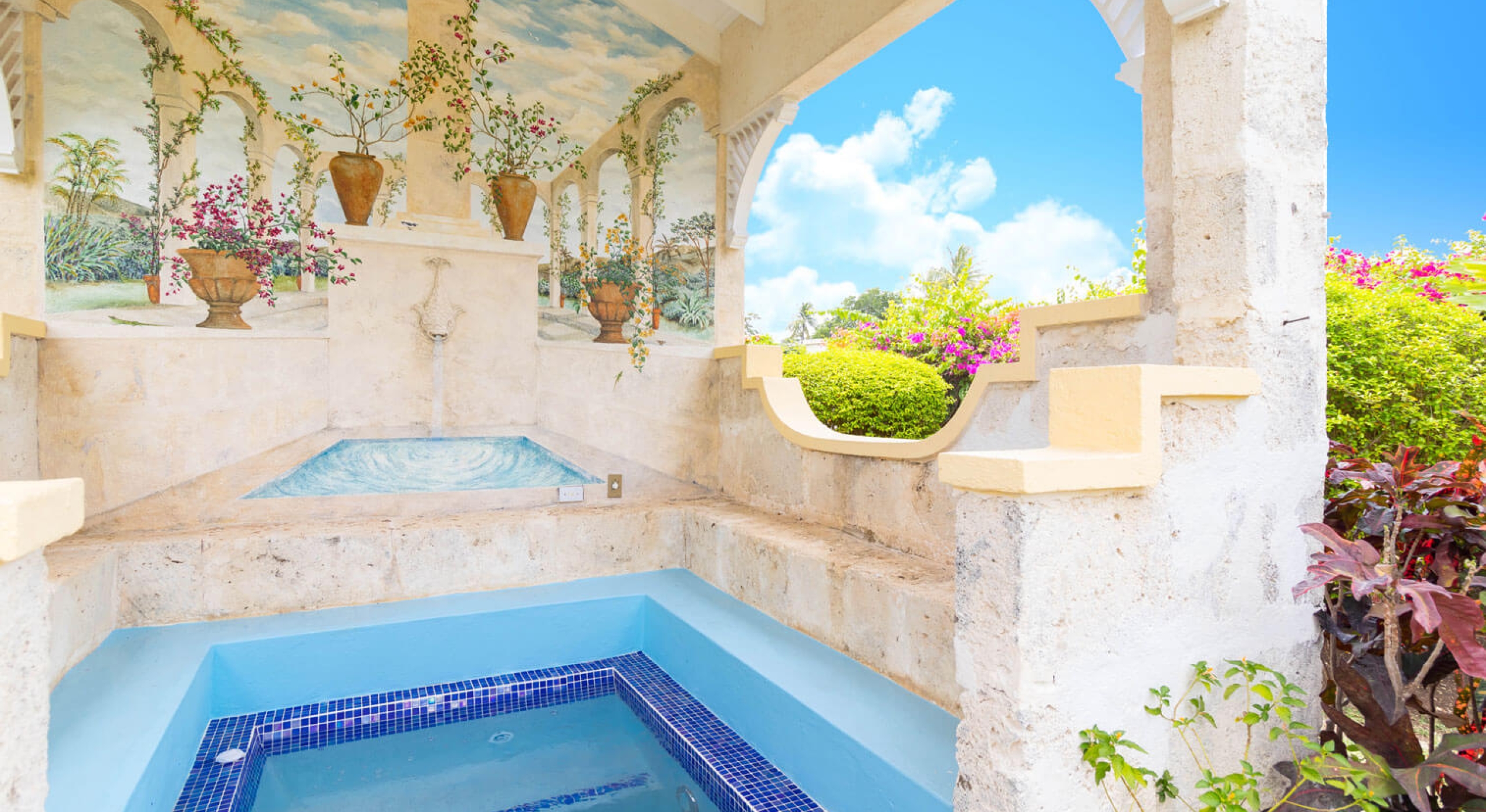Inside the villa, you’ll find four bedrooms, each in their own wing, all with en-suite bathrooms. Master suite has a private verandah for a perfect spot to relax together after a day of exploring the island. The living area is spacious and beautifully appointed with comfortable furniture and luxurious touches. A crystal chandelier hangs over the covered dining terrace, for example, but the real draw is right outside. In addition to the free-form pool surrounded by comfortable lounges, you’ll also find a covered Jacuzzi pool with a beautiful mural and coral stone accents. The poolside patio also has a private bar.