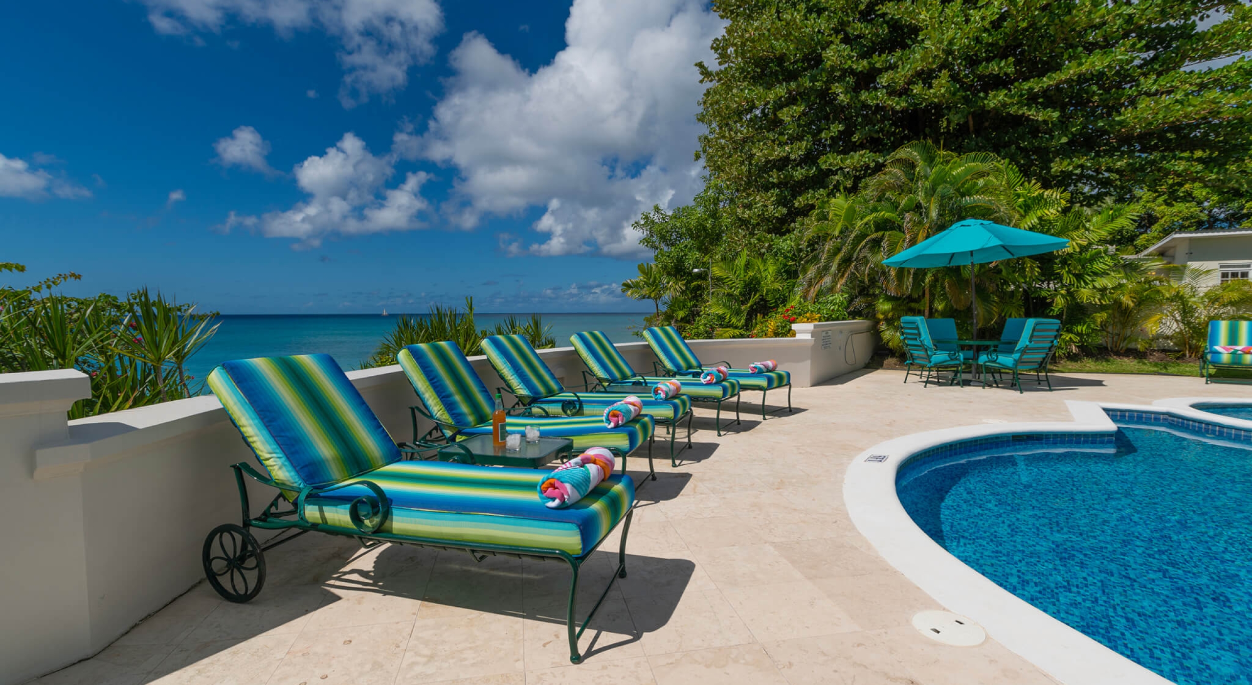 The pool deck offers a panoramic view, providing privacy and uninterrupted sight of the beautiful coral sand beach and turquoise ocean from its elevated position.