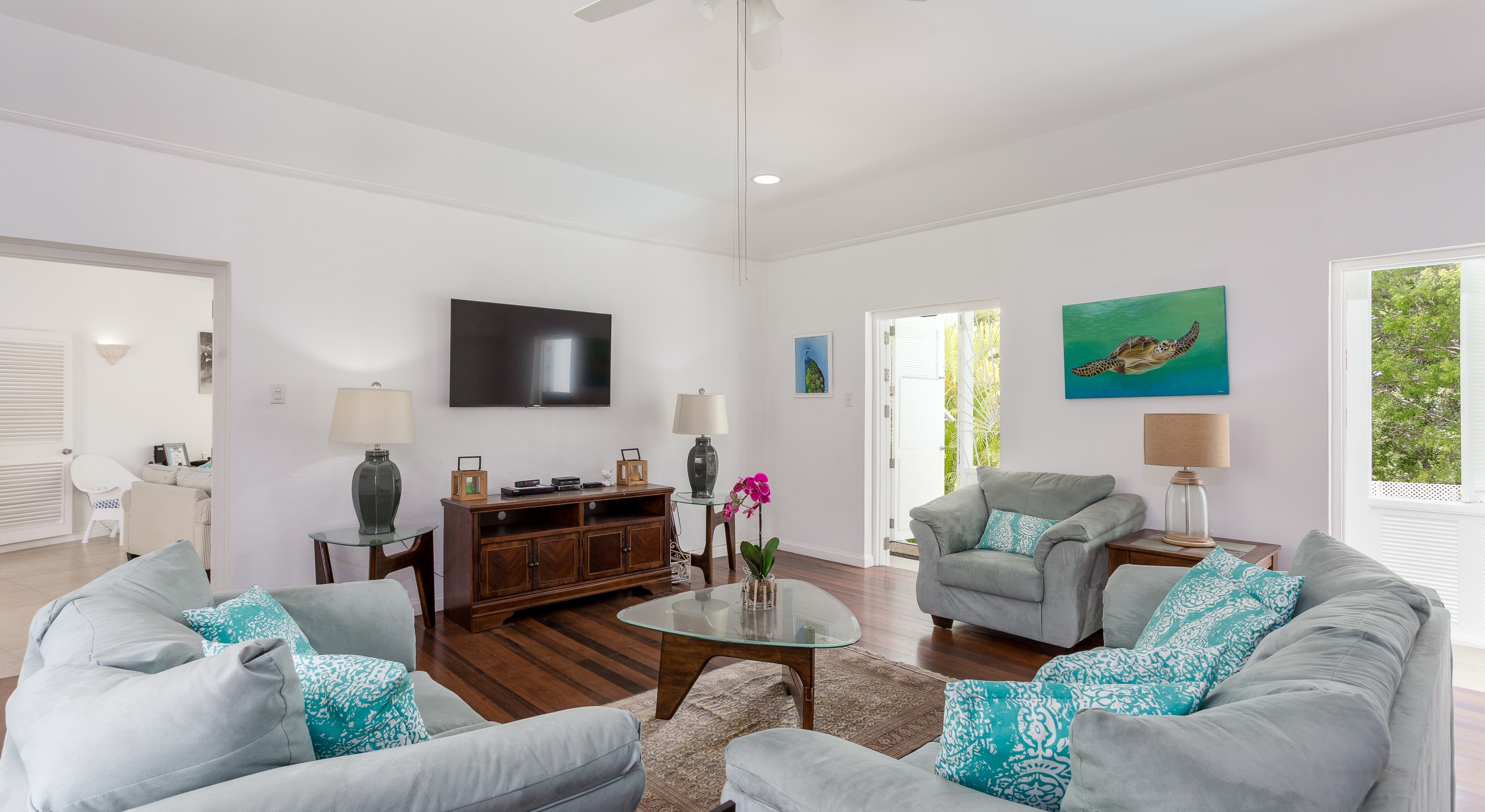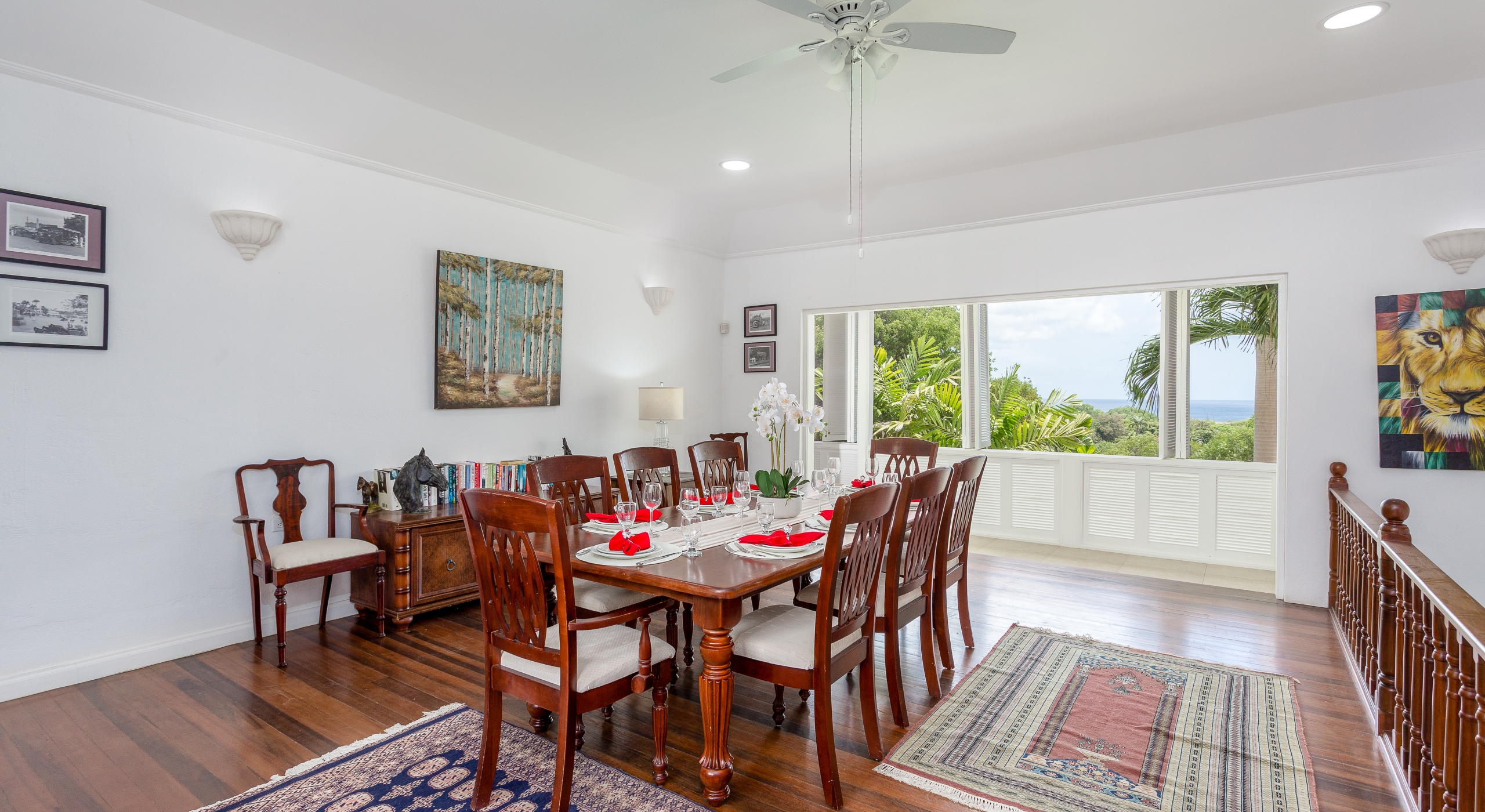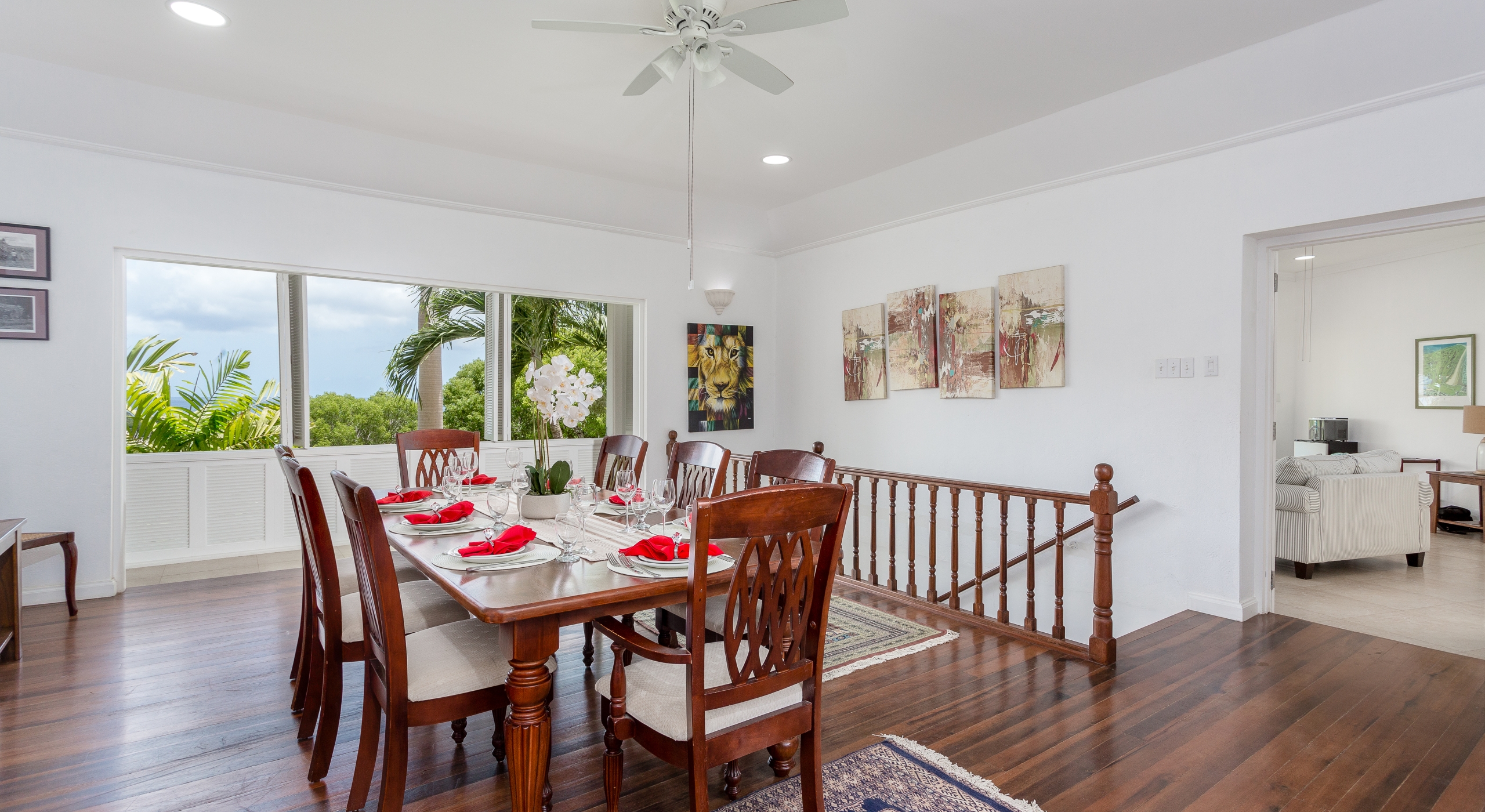 The north hallway overlooks and takes you down to the coral stone deck and pool with sun loungers and umbrellas and also leads you to two large guest bedrooms. The south hallway takes you to another guest bedroom and the large master bedroom and all bedrooms are air-conditioned and include en-suite bathrooms. To the right of the reception area is a TV and family room and to the left is a formal dining room with stairs that take you down to the kitchen and lower level.