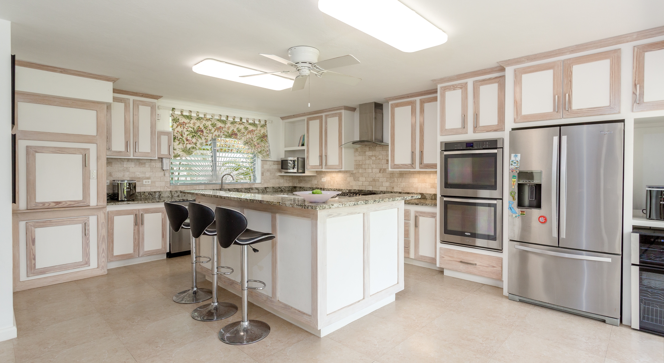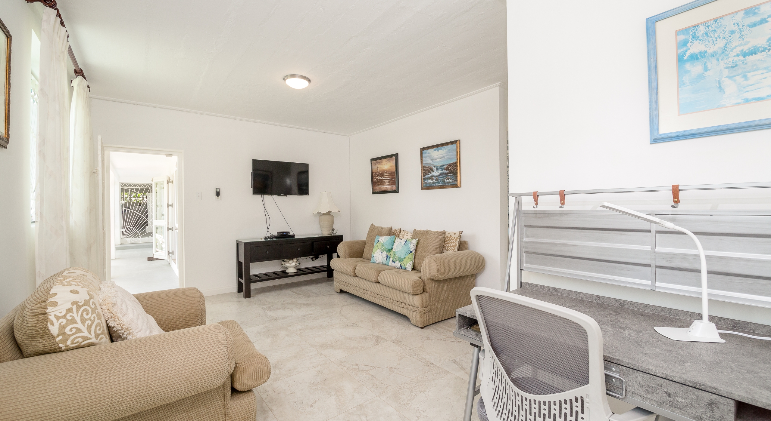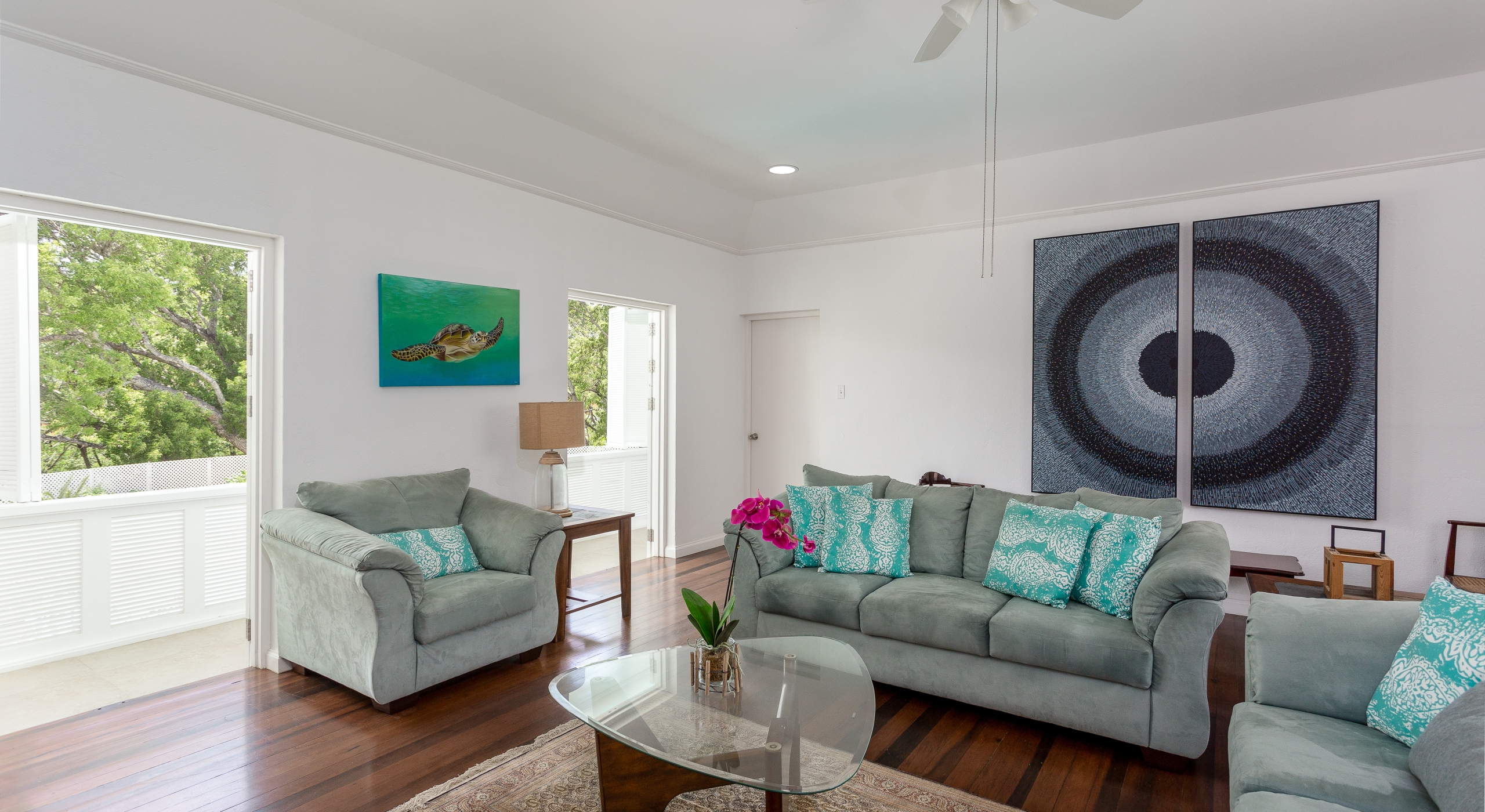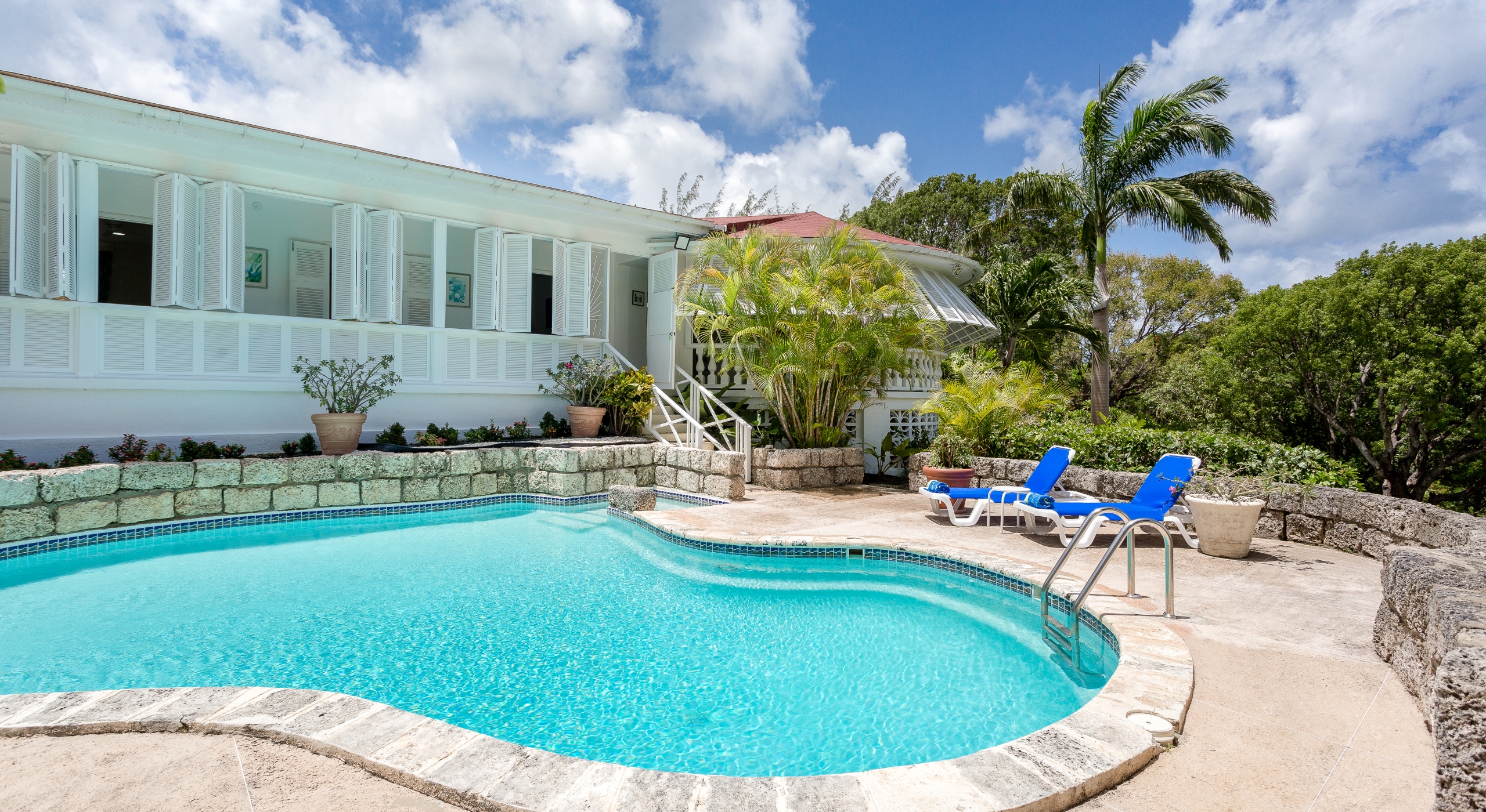The north hallway overlooks and takes you down to the coral stone deck and pool with sun loungers and umbrellas and also leads you to two large guest bedrooms. The south hallway takes you to another guest bedroom and the large master bedroom and all bedrooms are air-conditioned and include en-suite bathrooms. To the right of the reception area is a TV and family room and to the left is a formal dining room with stairs that take you down to the kitchen and lower level.