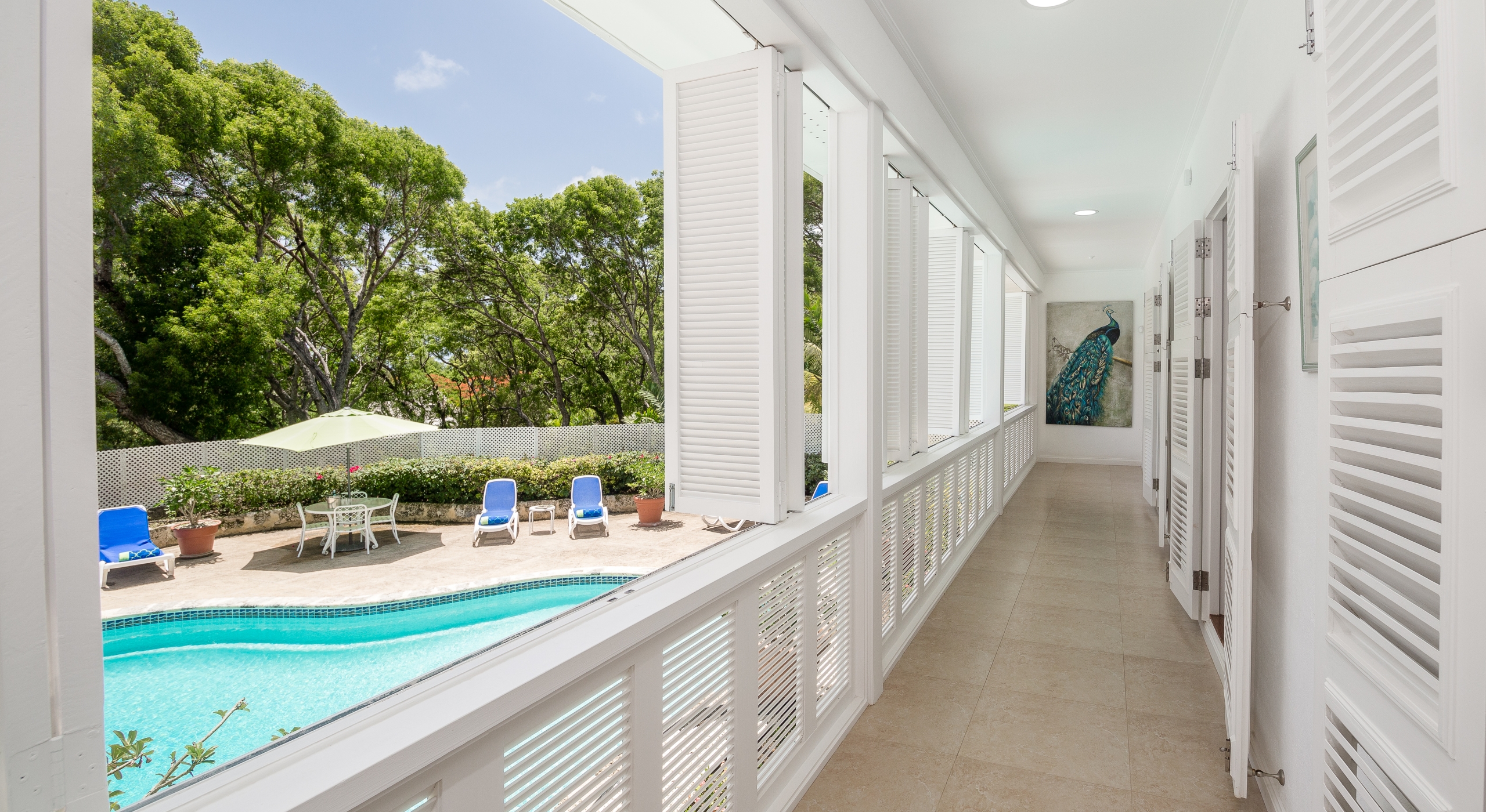 This holiday home is a blend of colonial charm and modern finishes and features. The entrance level welcomes you with an inviting reception room which is classically furnished which then flows onto a terrace dining area which overlooks the pool and expansive lawn and gardens. An open corridor with views to the west takes you both north and south from the dining terrace and onto the bedroom wings.
