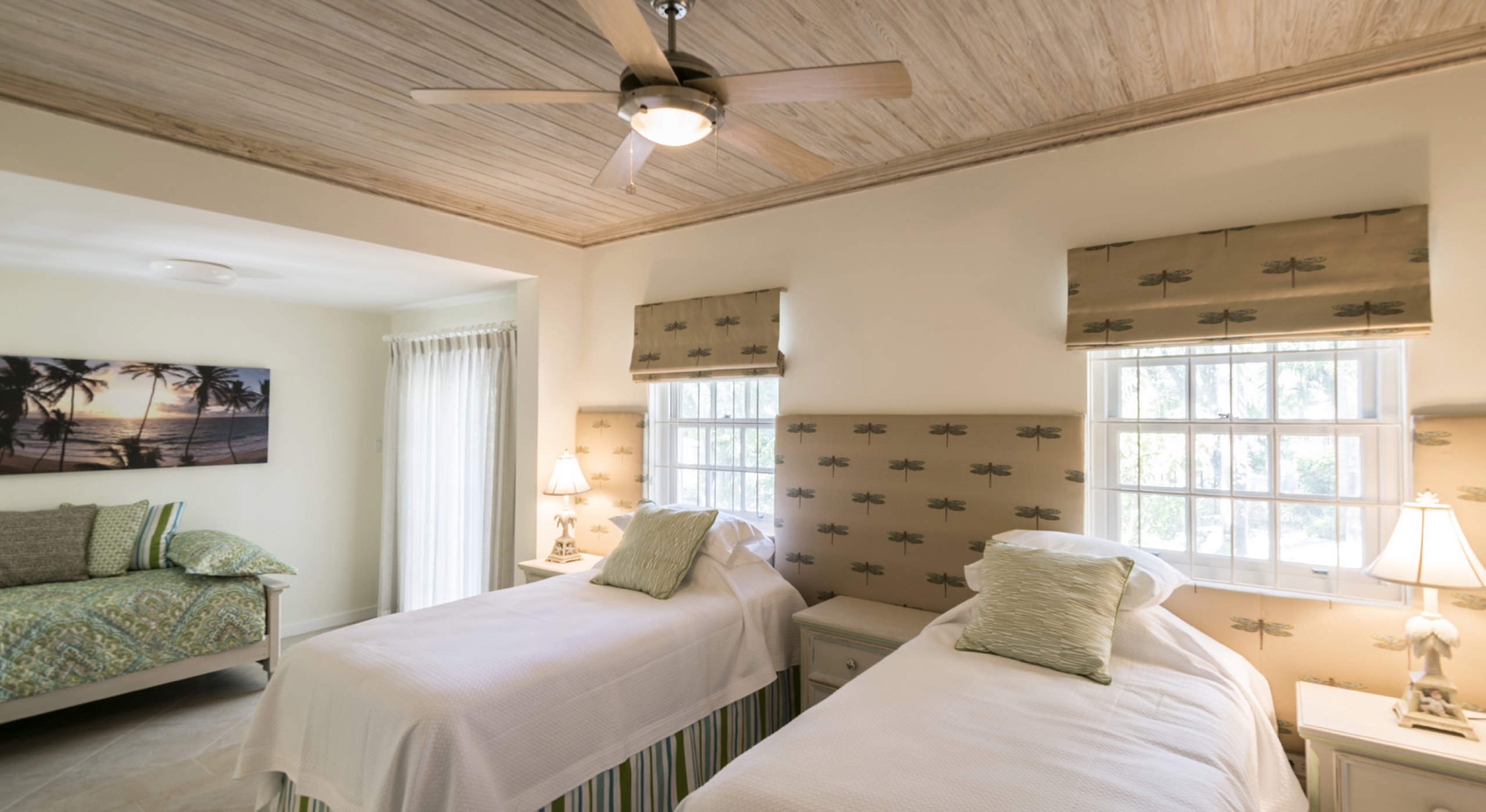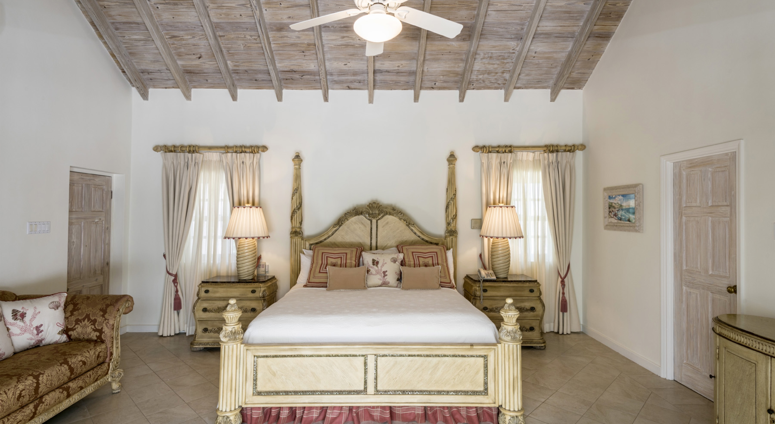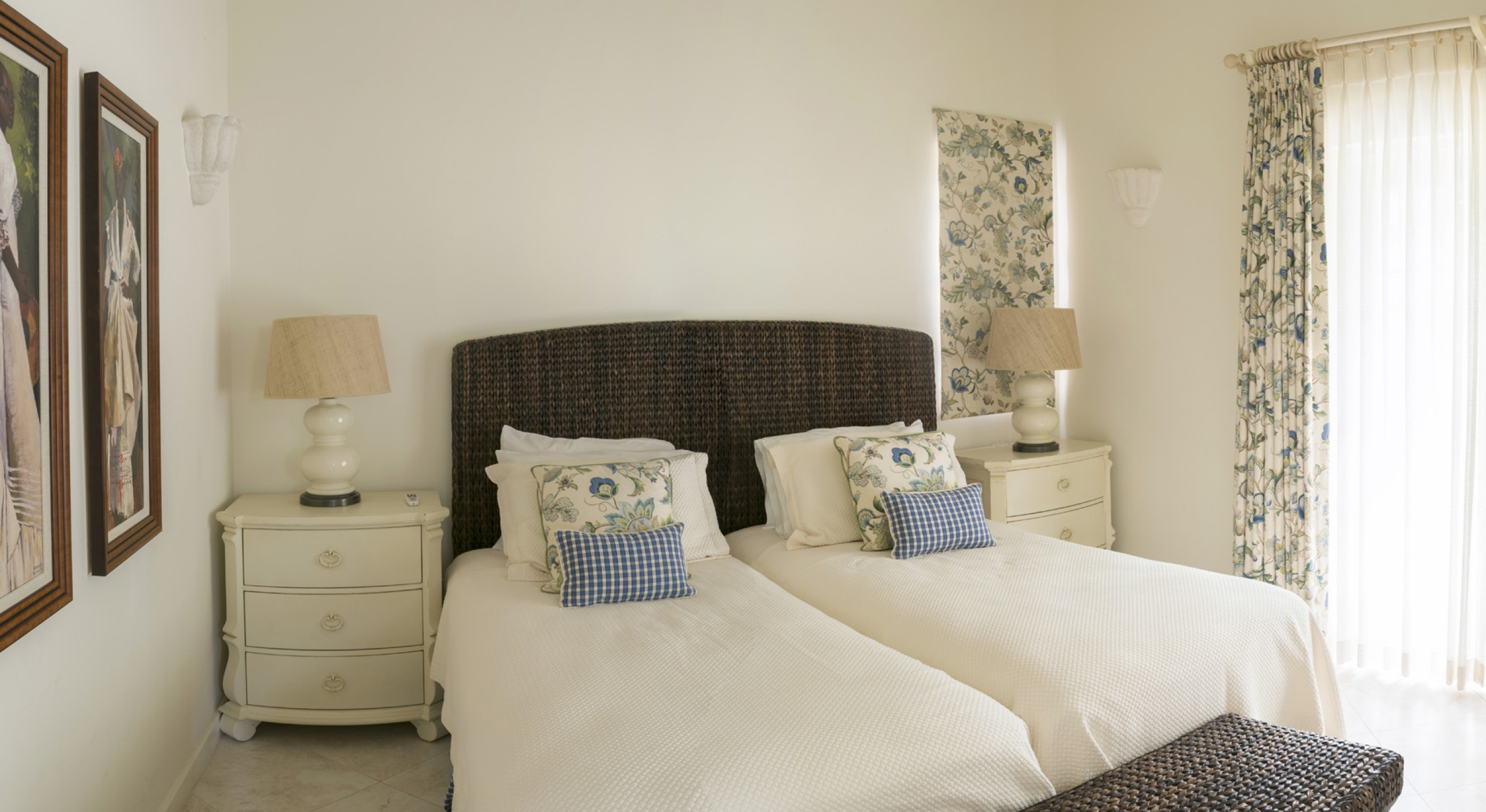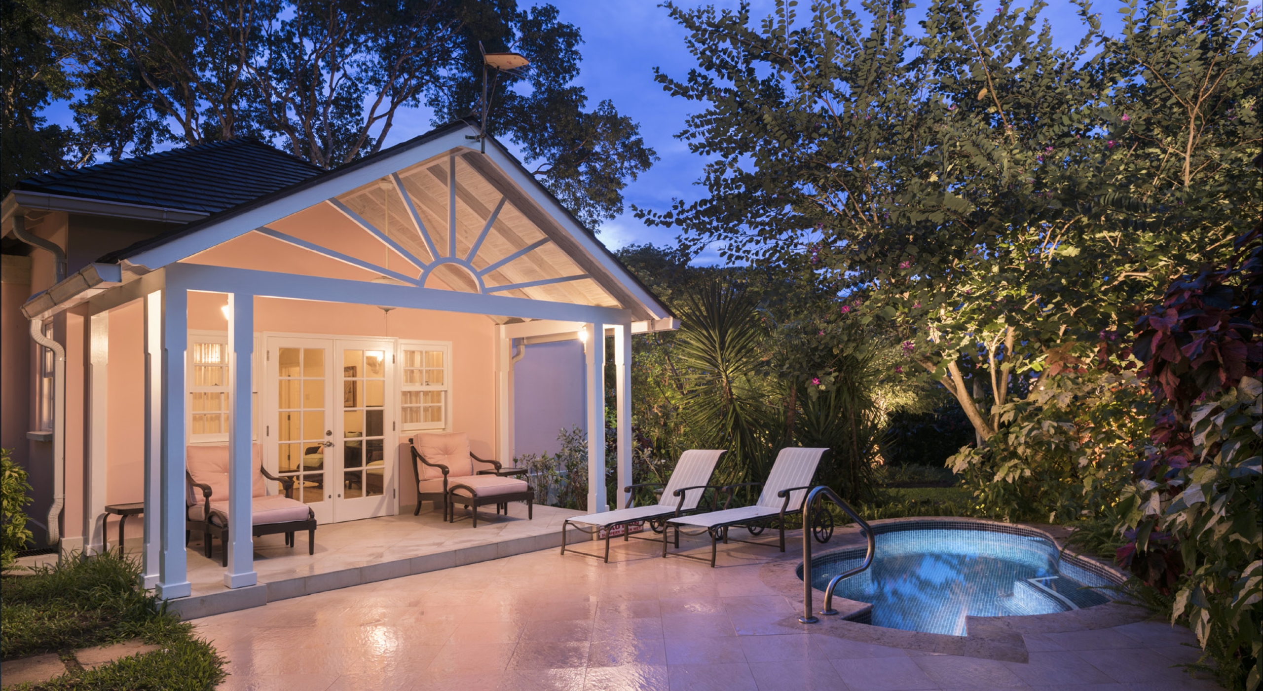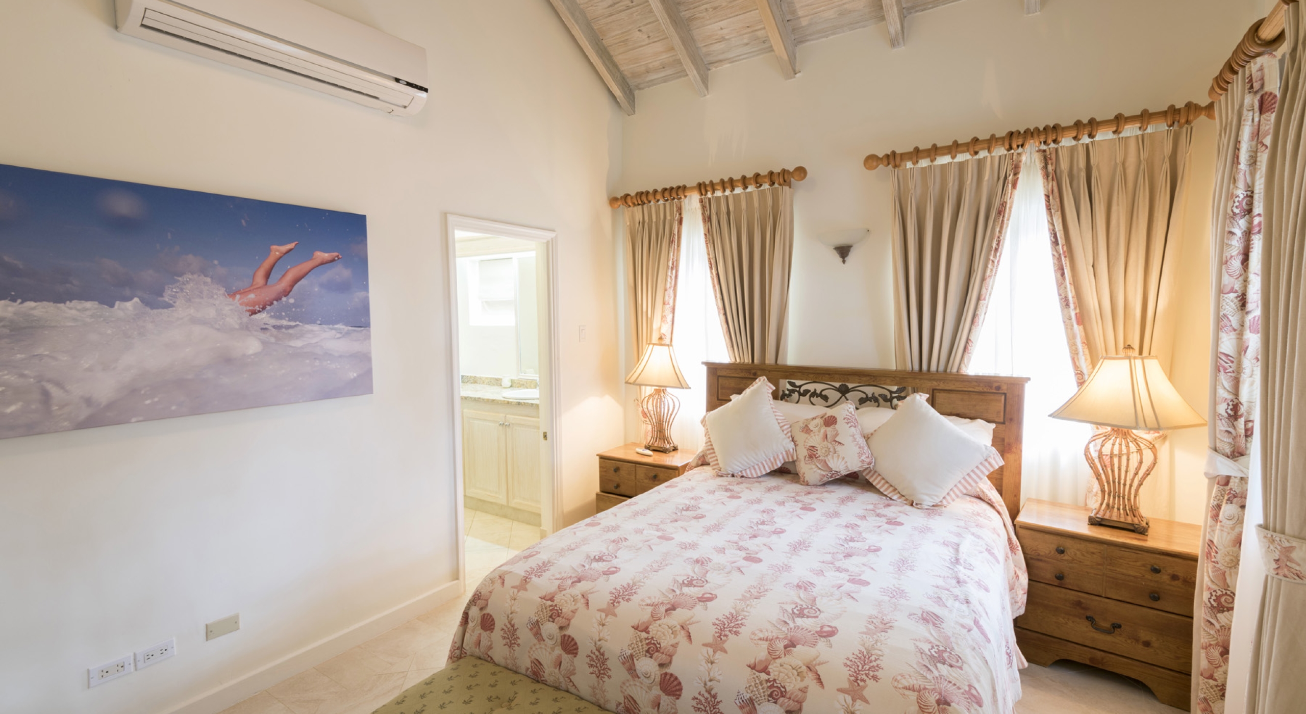 The main house at Sandalwood offers 4 beautifully appointed air-conditioned bedrooms, each with ensuite bathroom. 3 bedrooms are located on the upper level and 1 bedroom on the ground floor. There is a 5th full bathroom with tub on the ground floor, conveniently positioned to serve as powder room or changing room/bathroom when using the pool.