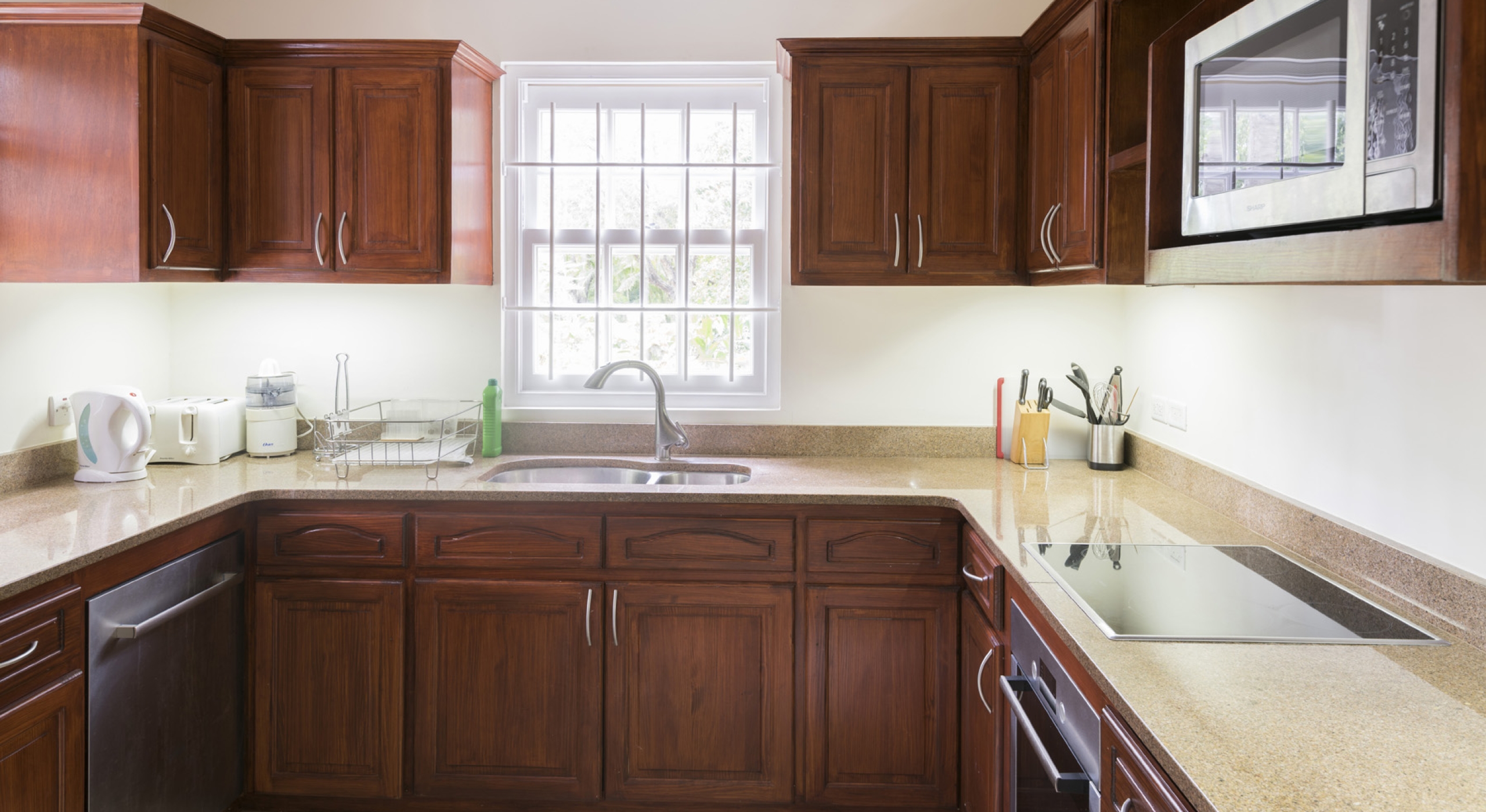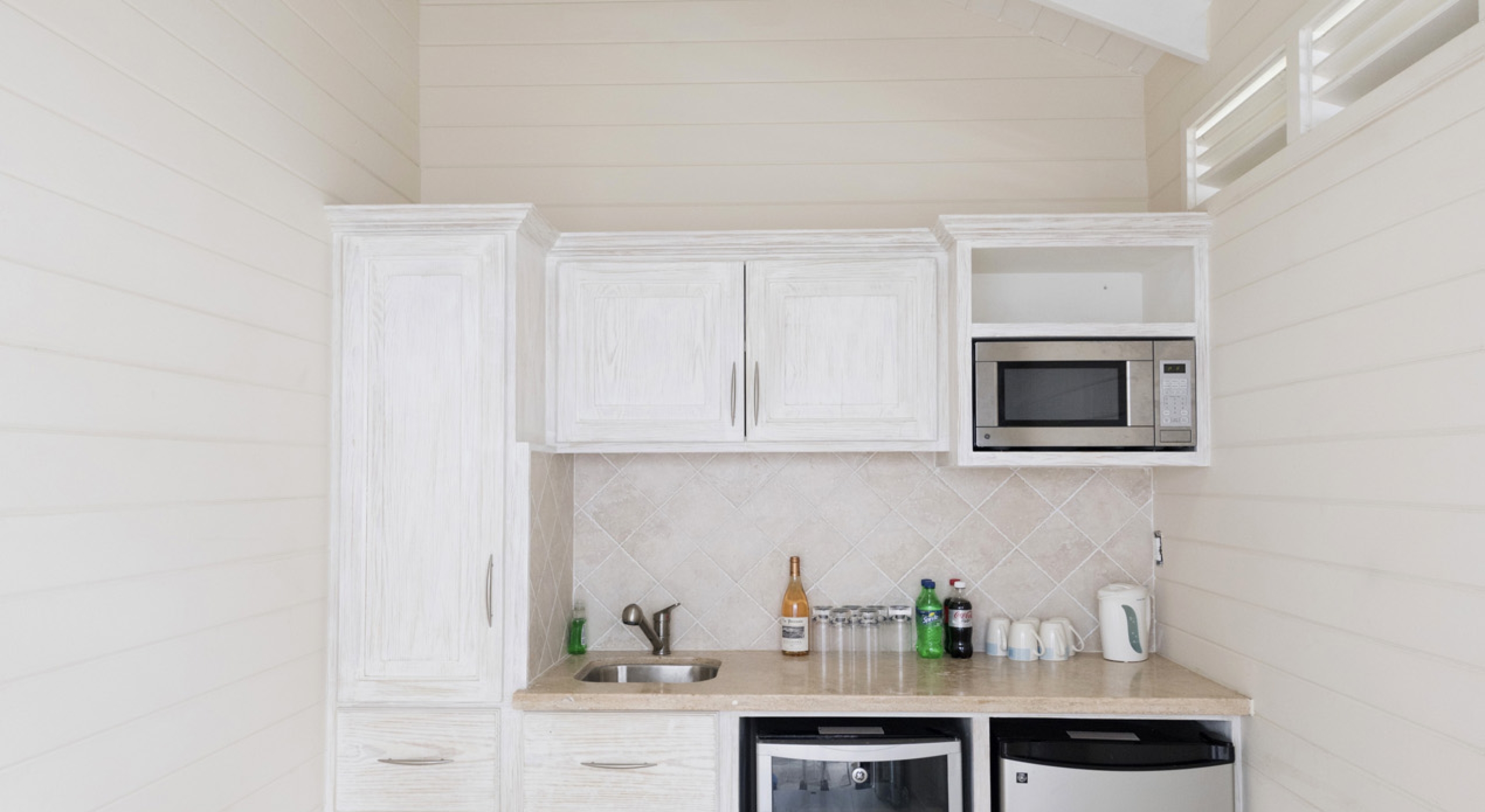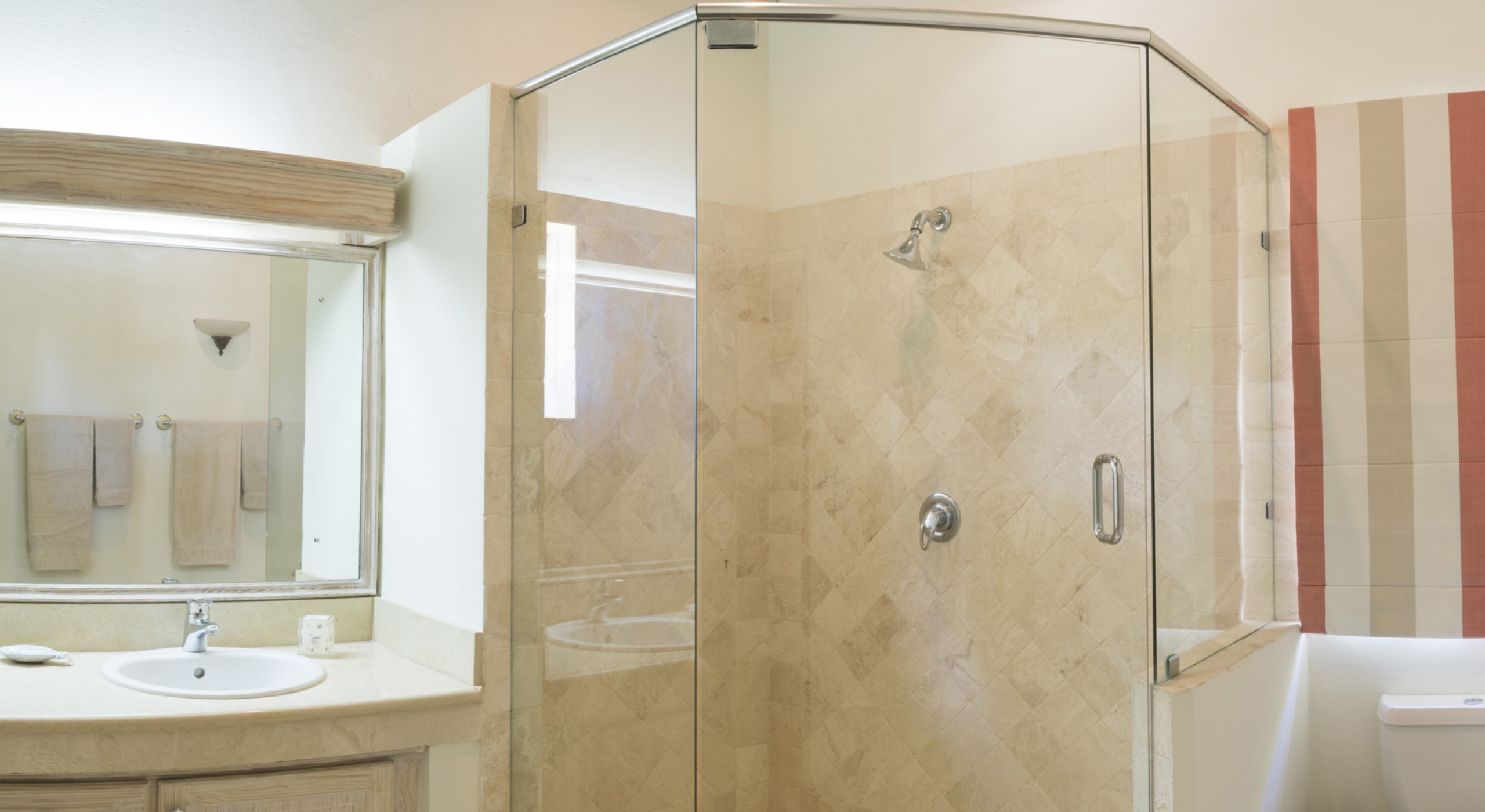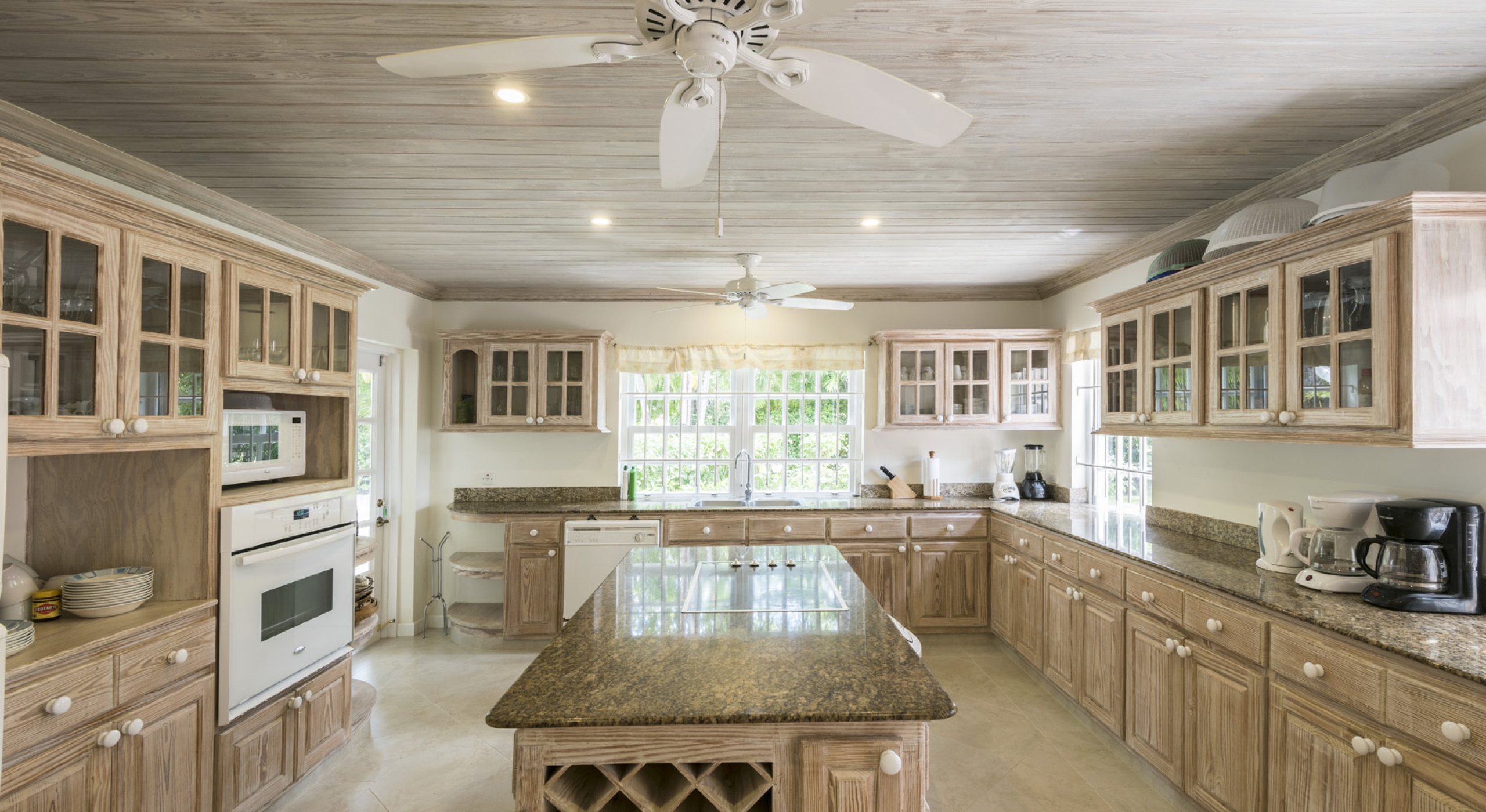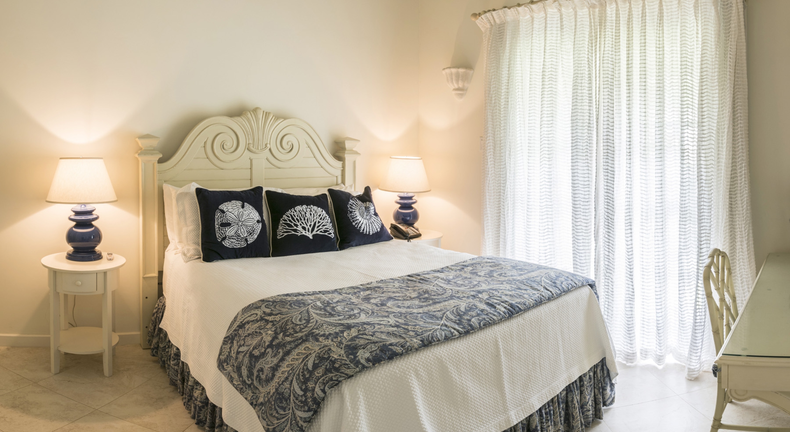 The main house at Sandalwood offers 4 beautifully appointed air-conditioned bedrooms, each with ensuite bathroom. 3 bedrooms are located on the upper level and 1 bedroom on the ground floor. There is a 5th full bathroom with tub on the ground floor, conveniently positioned to serve as powder room or changing room/bathroom when using the pool.
