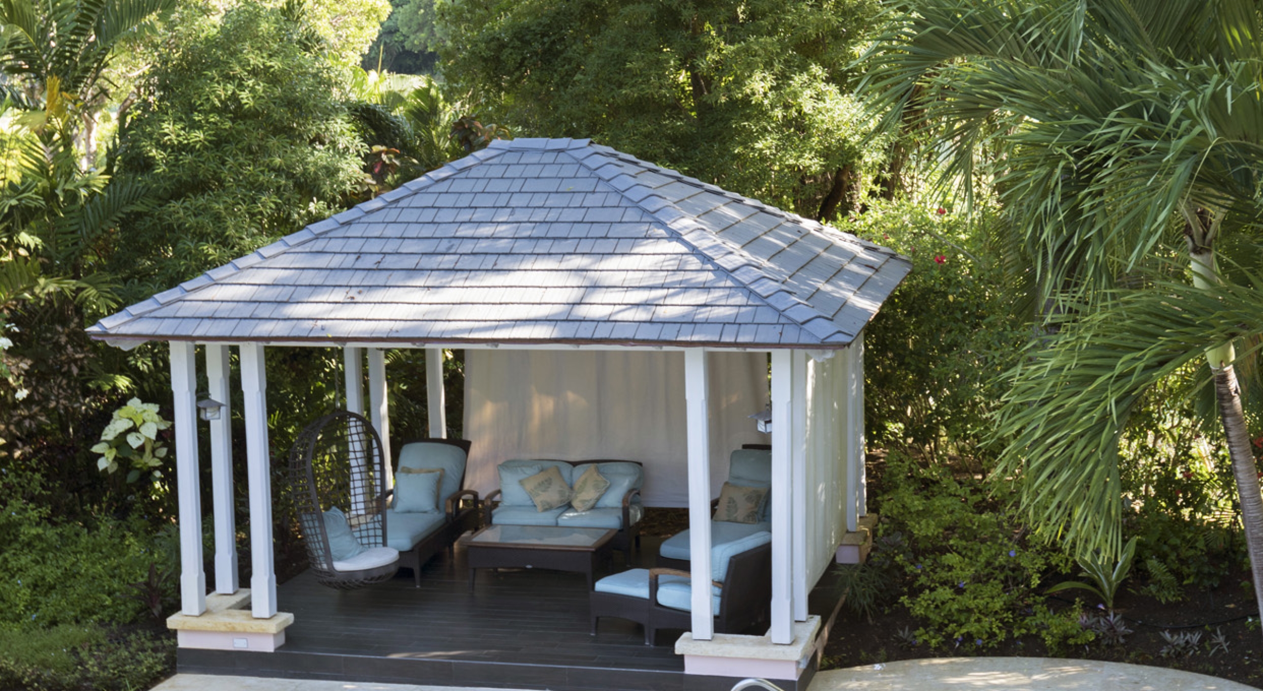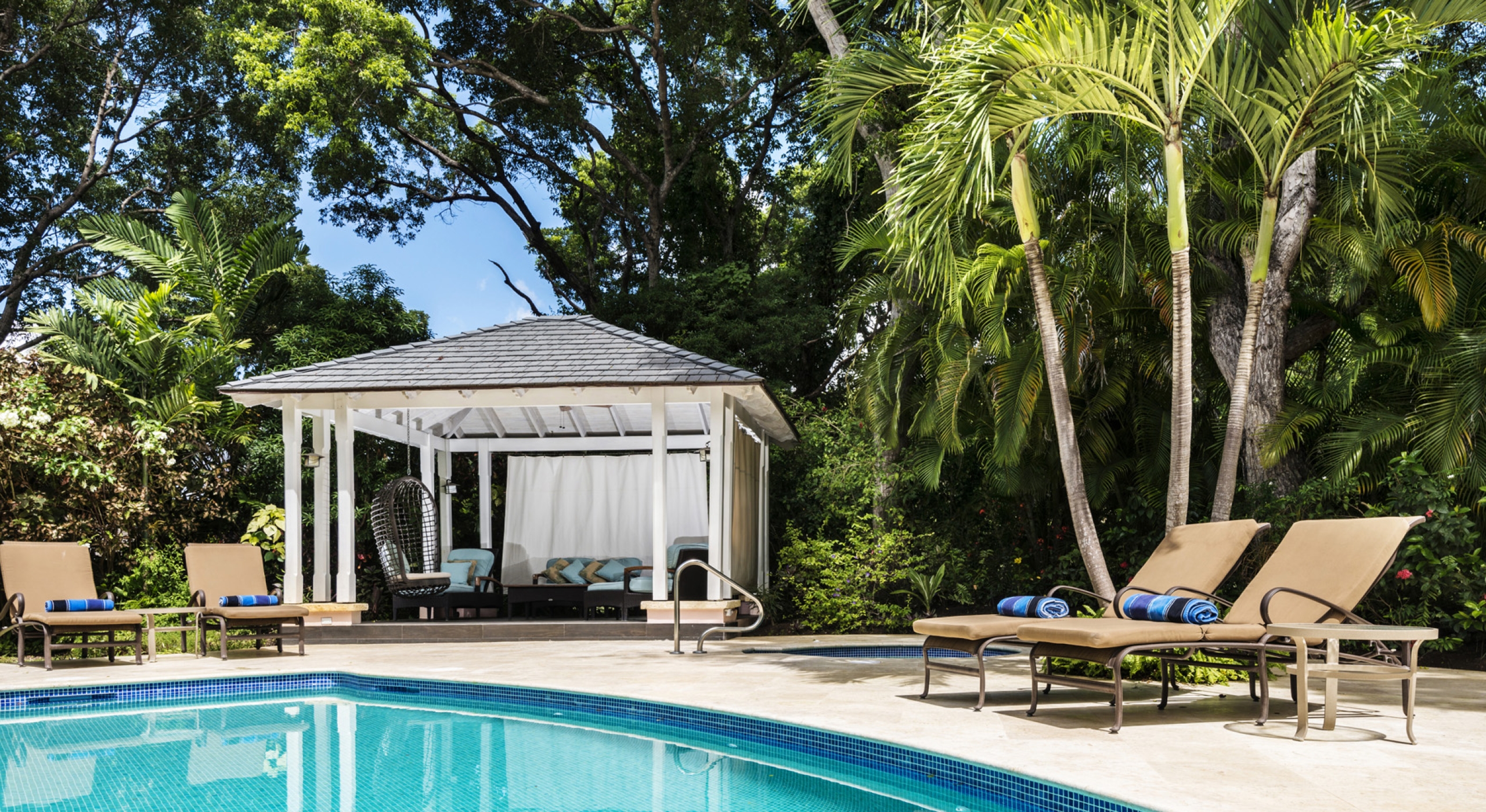An open-air terrace and dining patio with a built-in alcove for extra seating leads to the pool & Jacuzzi, with views across the 3rd tee on the Old Nine golf course. There is a garden gate to the golf course providing easy access for a morning walk or jog. Lounge chairs on the pool deck invite you to relax and work on the tan you have always longed for or, lounge in the Spanish style covered Gazebo having afternoon tea or spending a lazy tropical afternoon with family and friends.