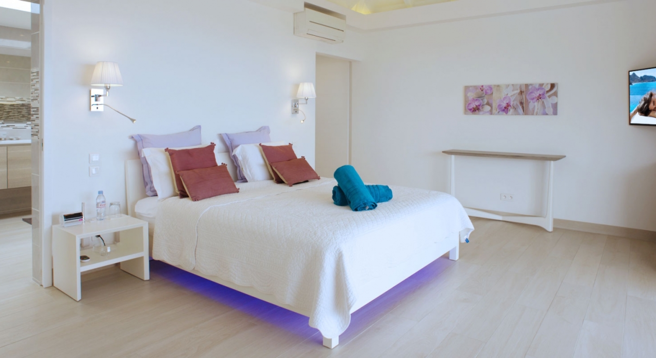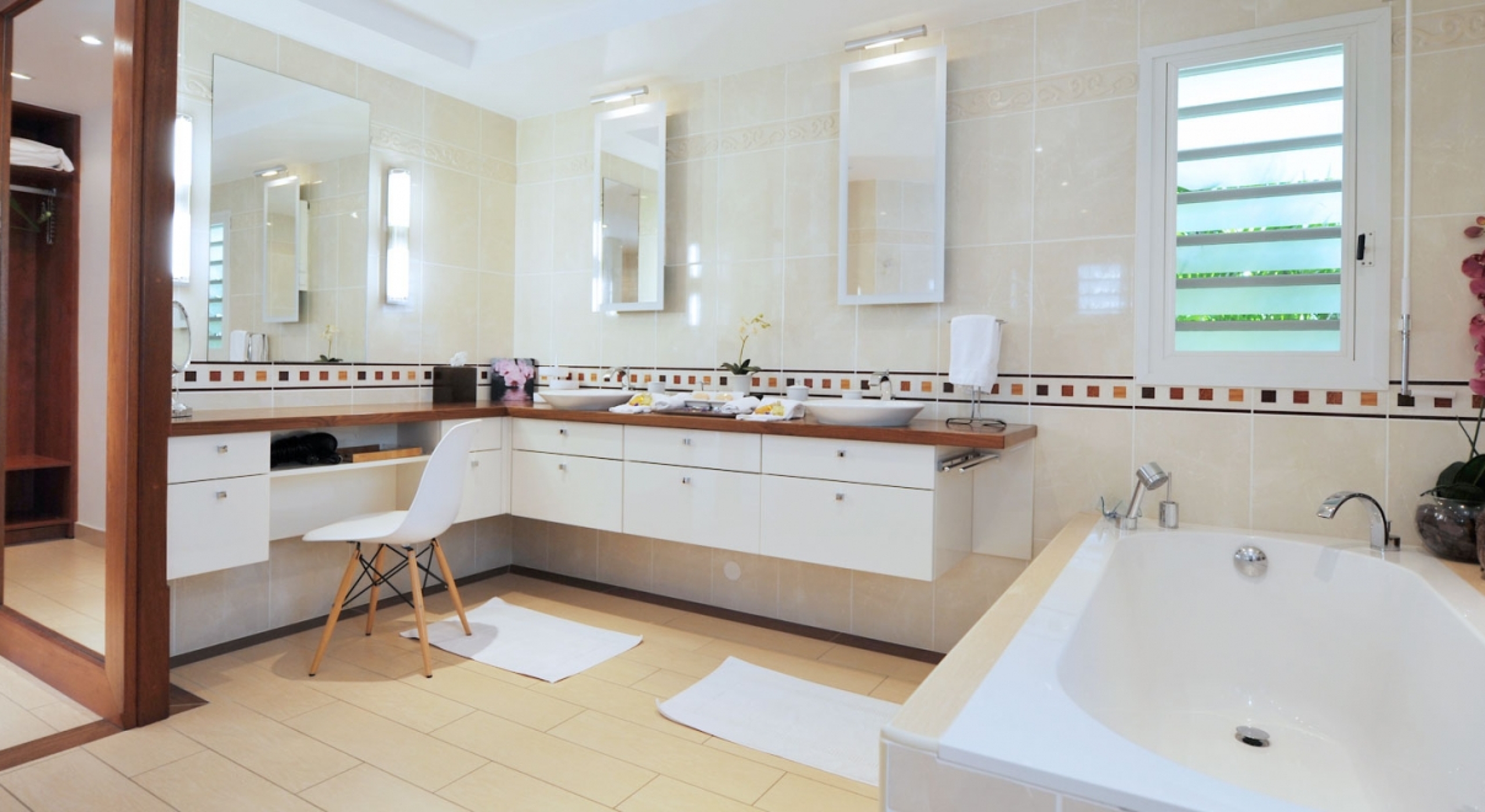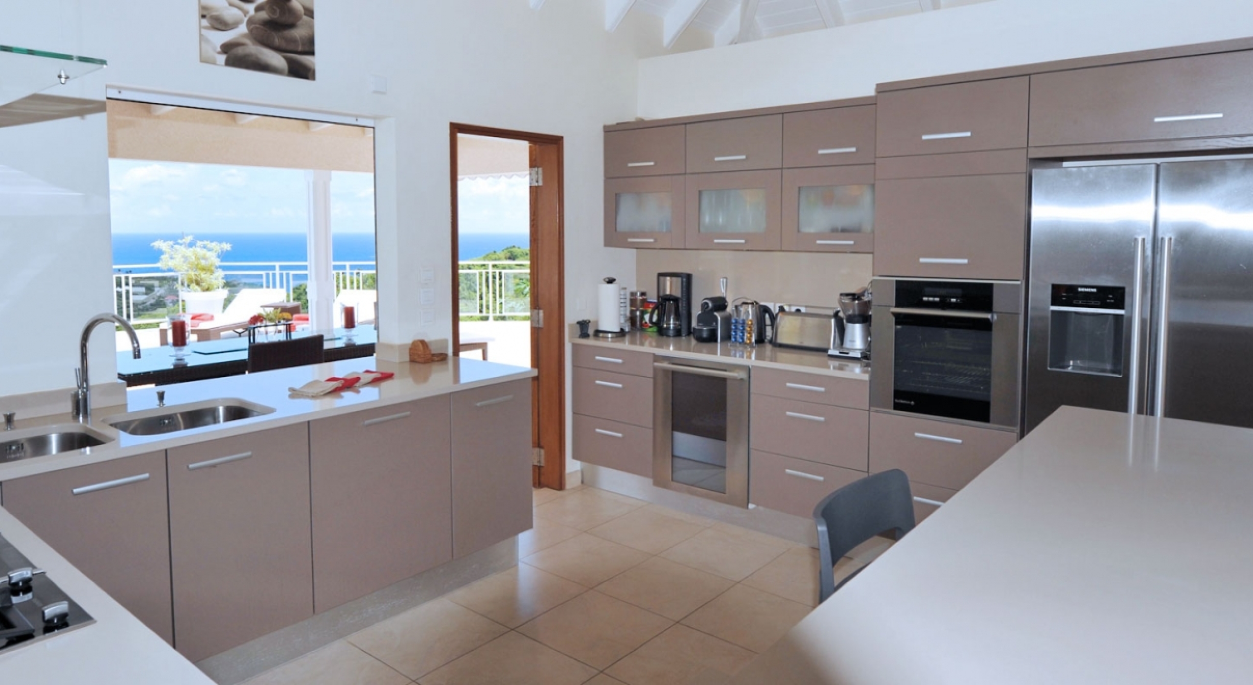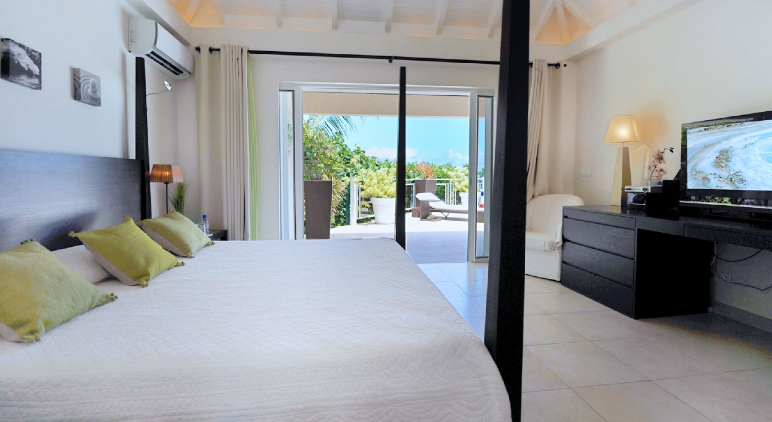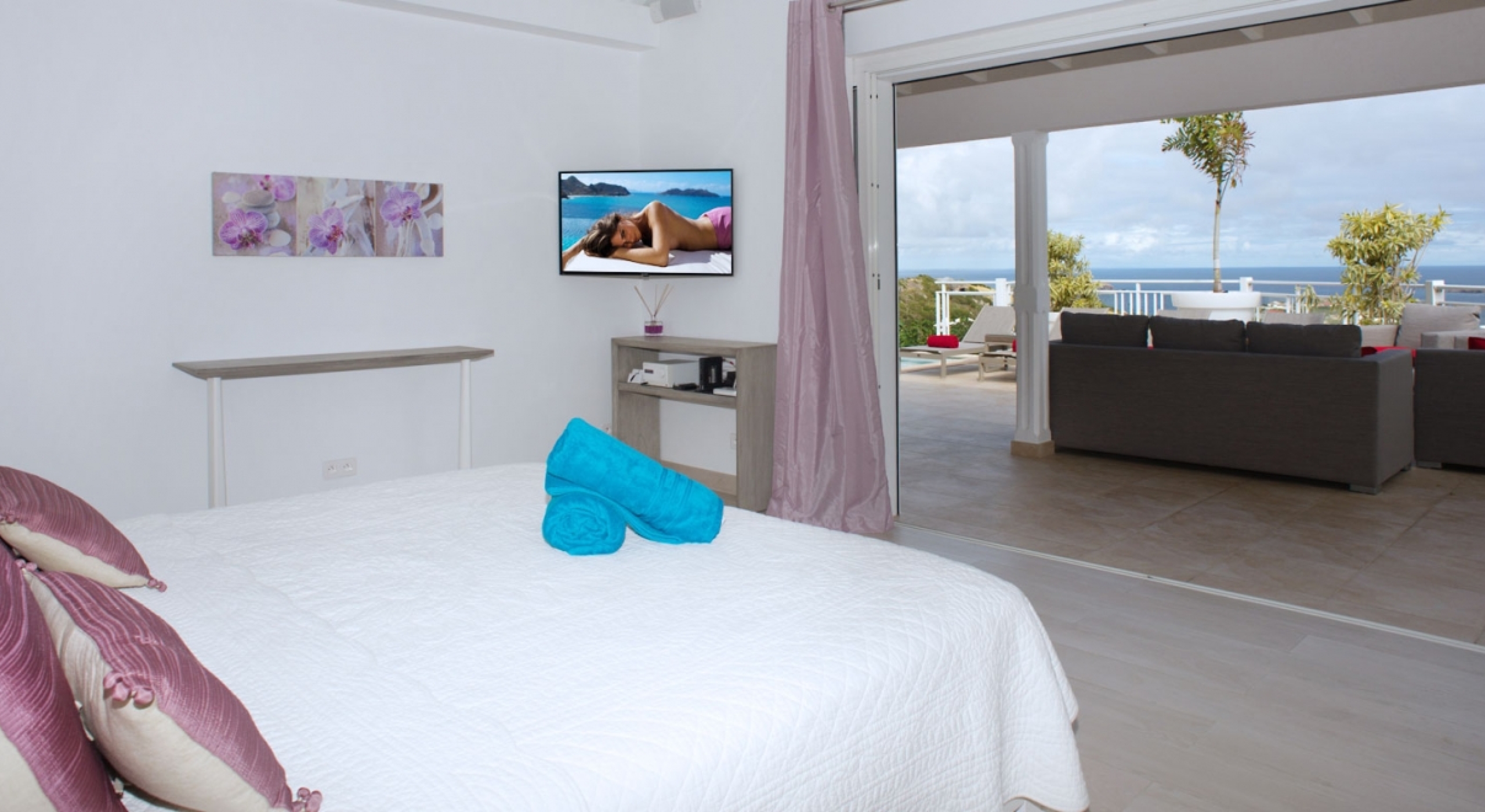Villa Au Coeur du Rocher is home to three separate bedrooms, each beautifully decorated for maximum comfort and intimacy. Two bedrooms are stocked with King sized beds, air conditioning, fan, private save, television, satellite, DVD player, bathroom with bathtub and shower, large dresser for clothes, Apple TV and iPod dock. Each boasts a view of the Caribbean Sea and islands while one – located on the lower terrace – even has it’s own private terrace; perfect for a romantic moment alone!
