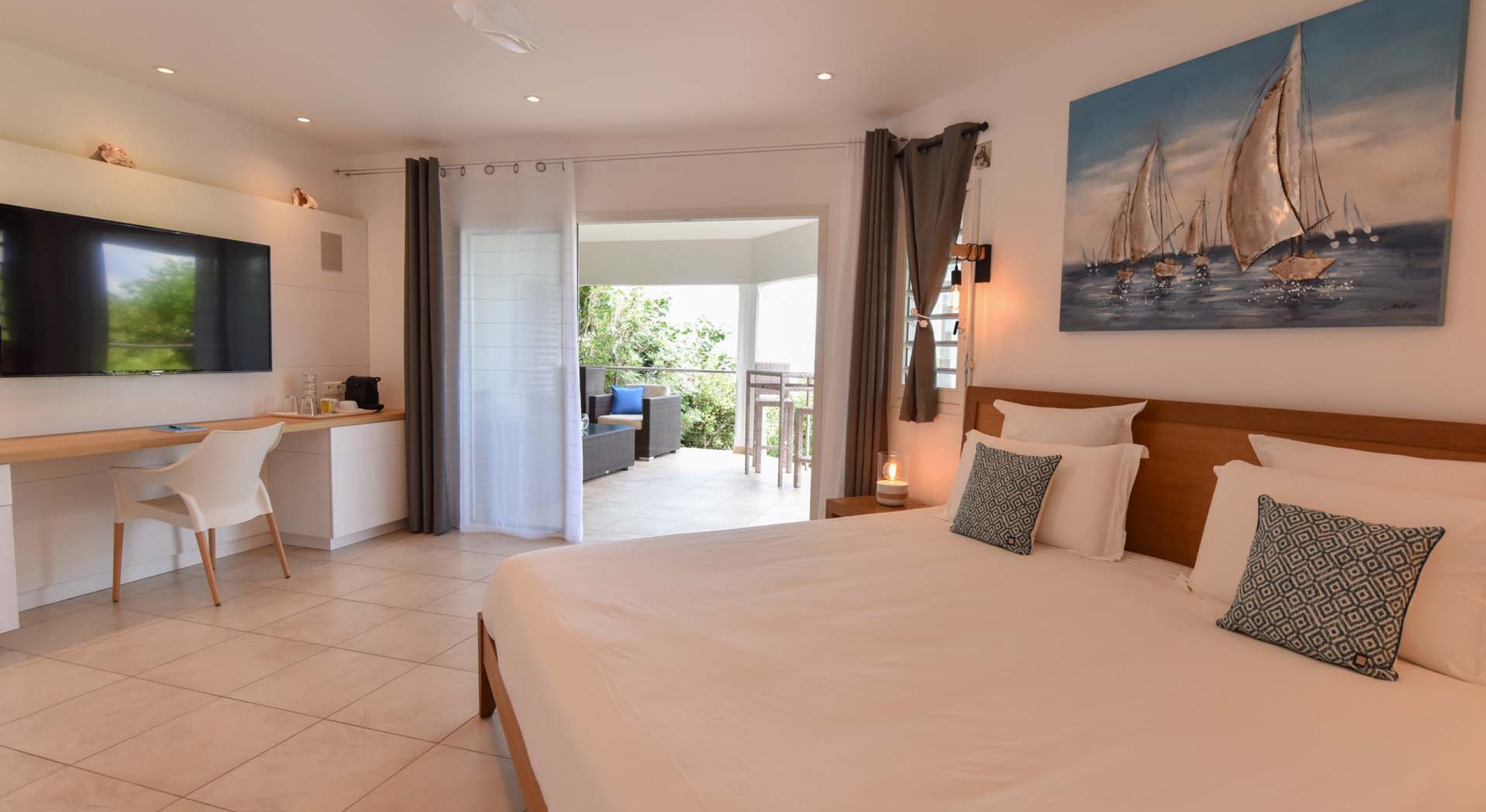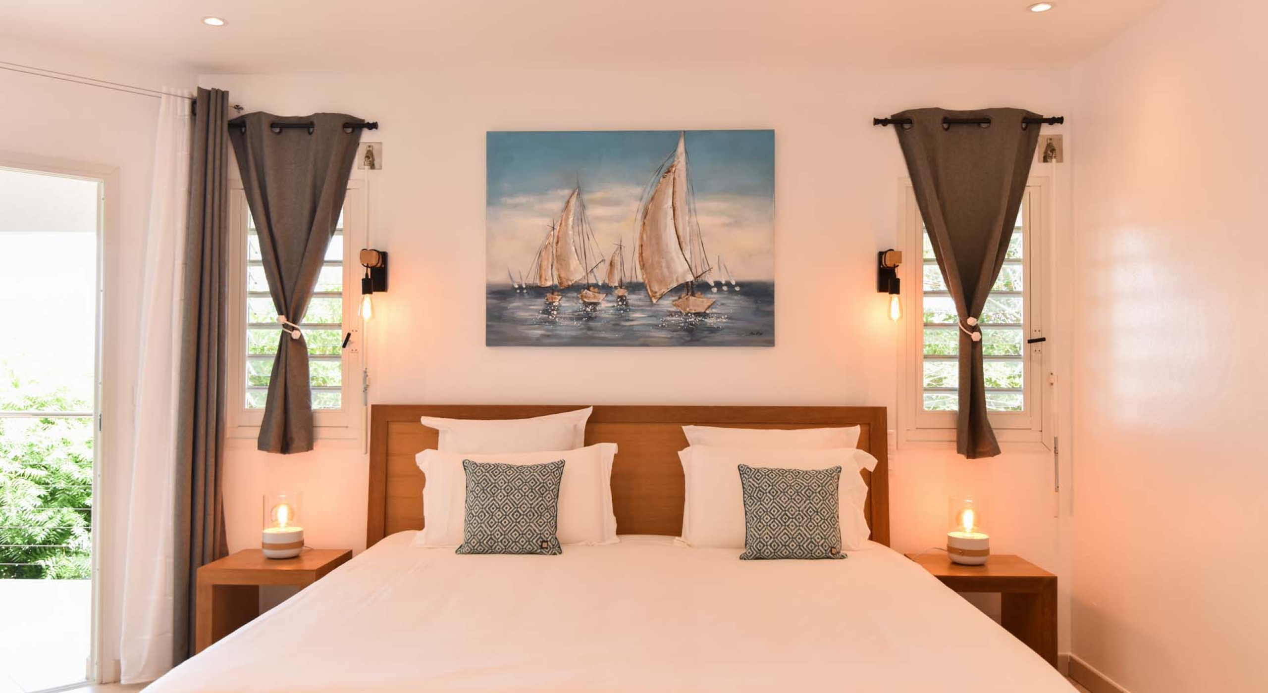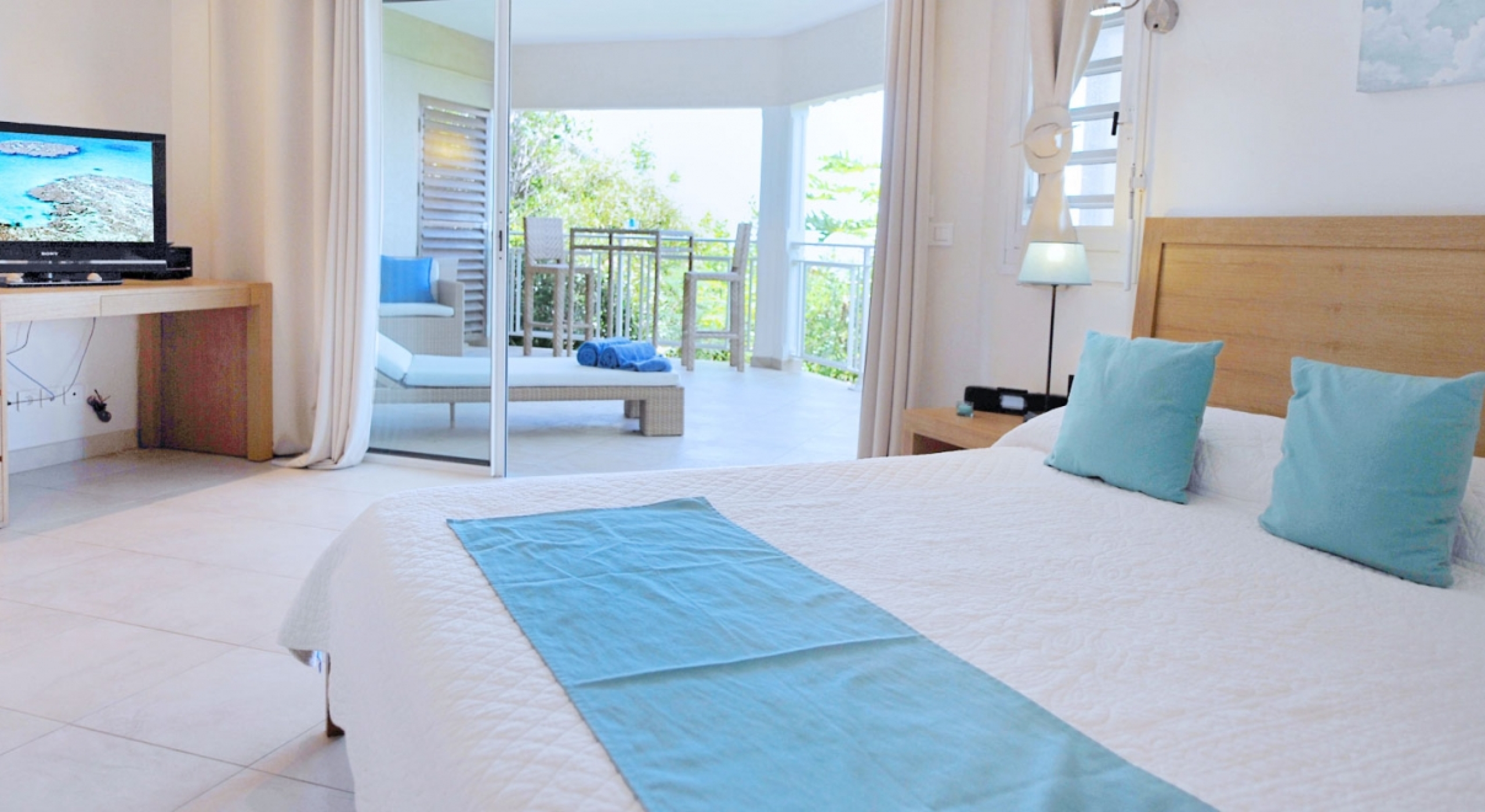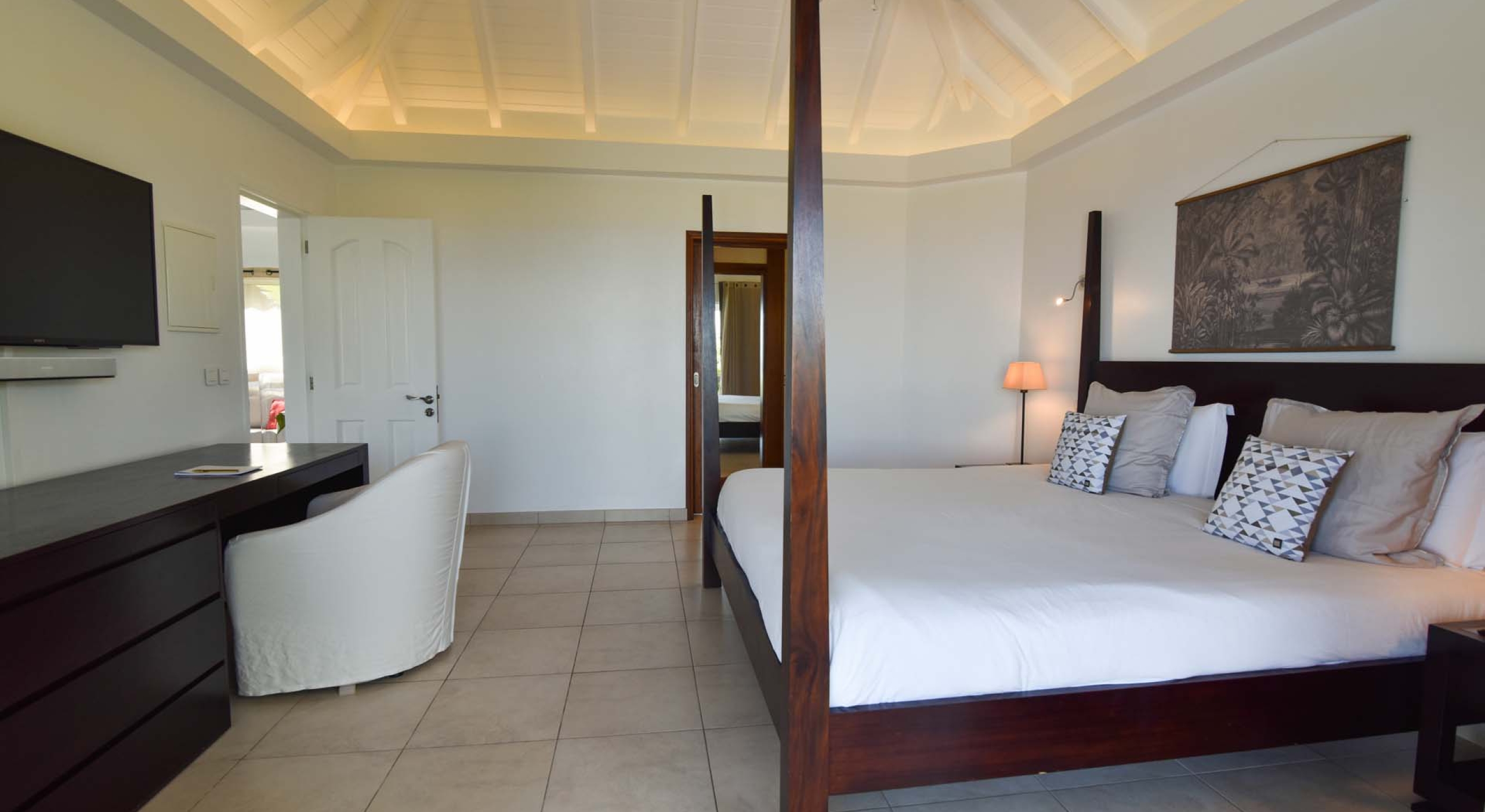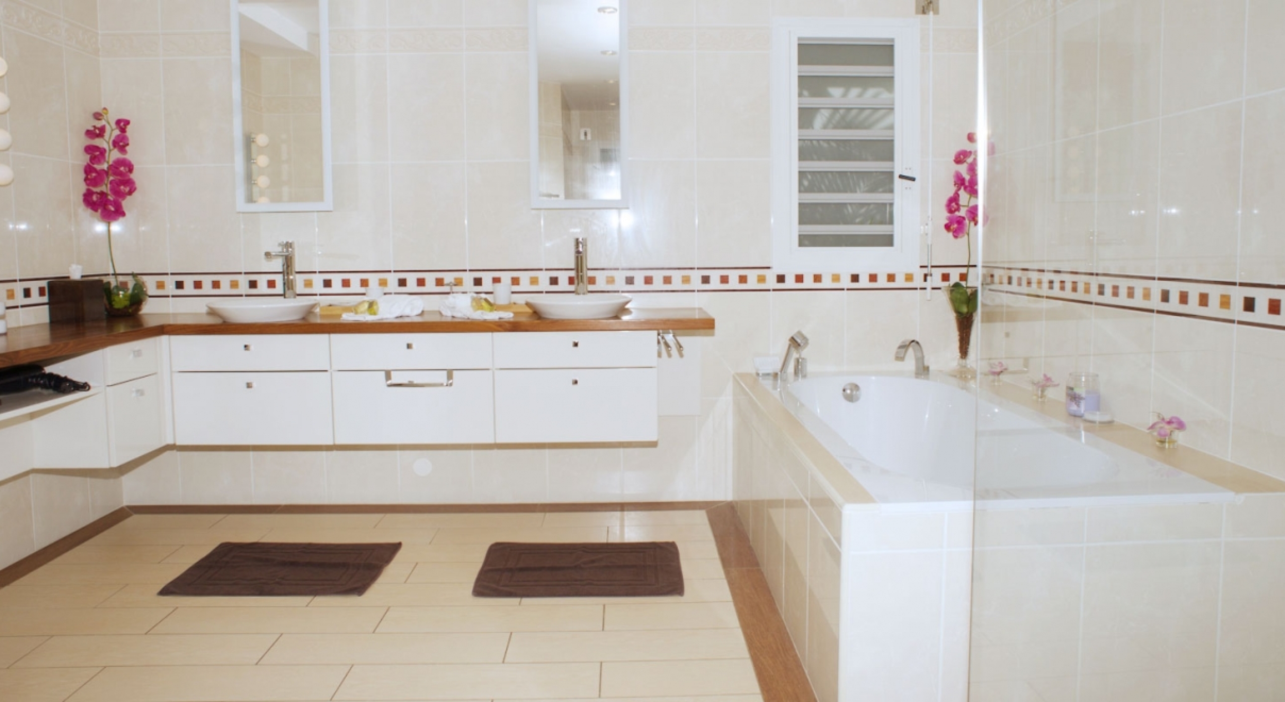Villa Au Coeur du Rocher is home to three separate bedrooms, each beautifully decorated for maximum comfort and intimacy. Two bedrooms are stocked with King sized beds, air conditioning, fan, private save, television, satellite, DVD player, bathroom with bathtub and shower, large dresser for clothes, Apple TV and iPod dock. Each boasts a view of the Caribbean Sea and islands while one – located on the lower terrace – even has it’s own private terrace; perfect for a romantic moment alone!