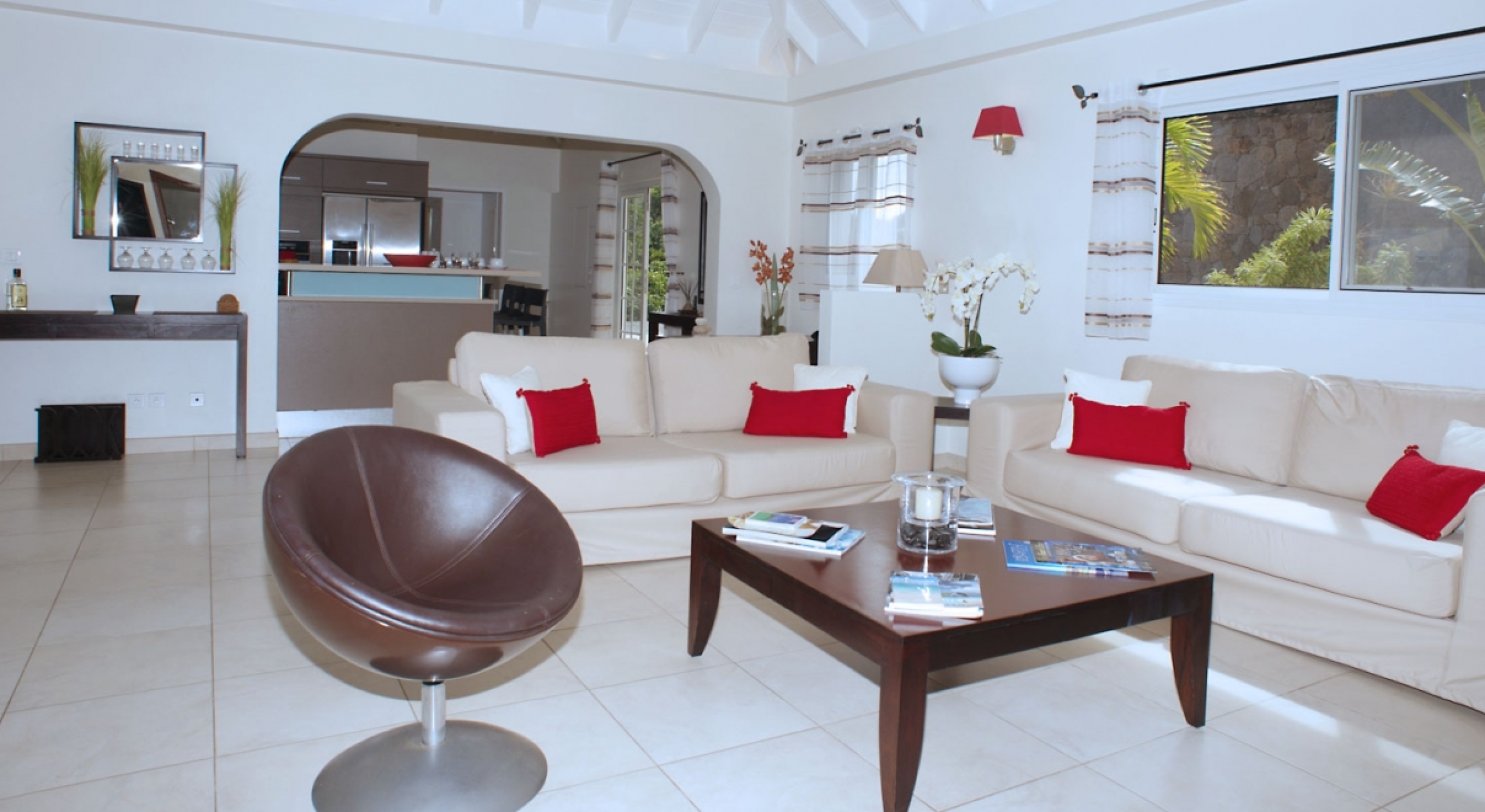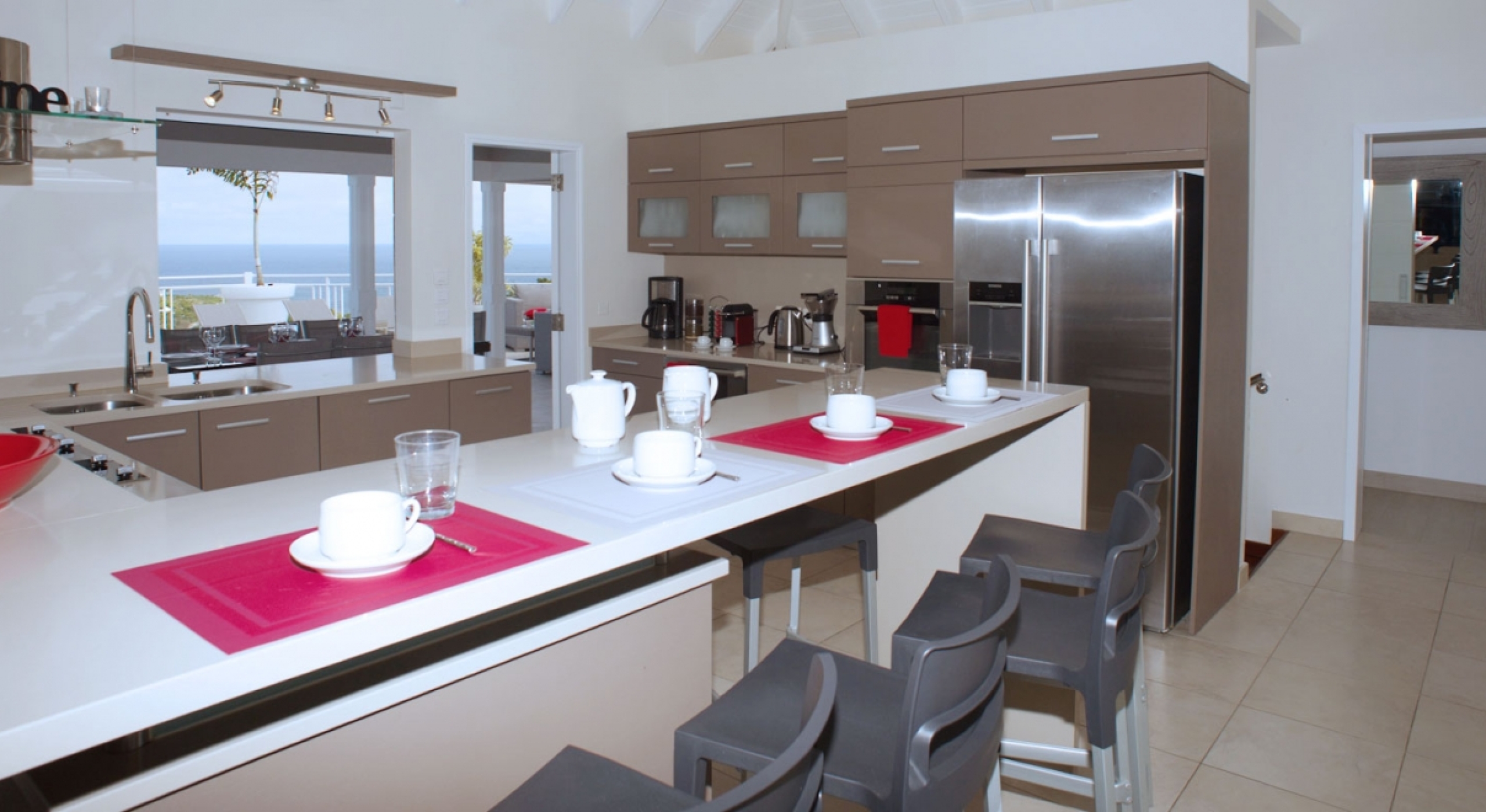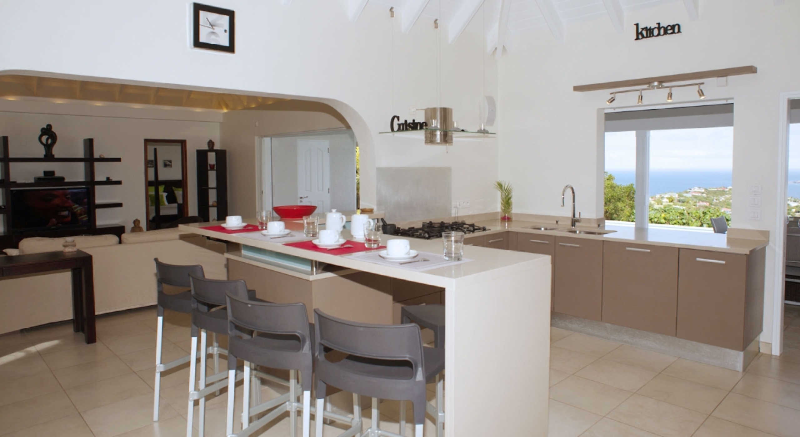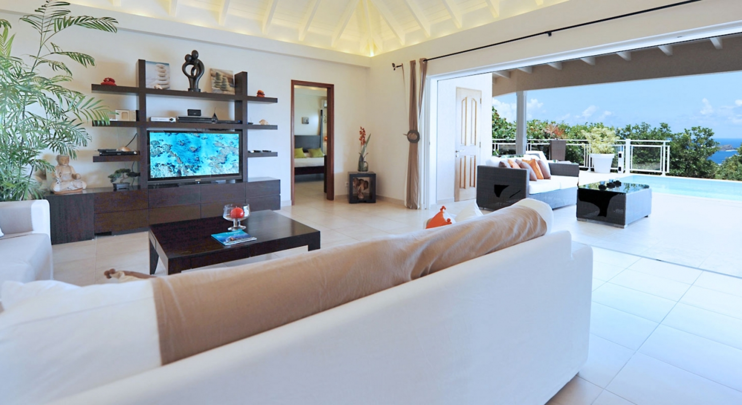 The living are of Villa Au Coeur du Rocher is beautifully decorated in modern, hip minimalist style, with strong colors and enough room for all to lounge in comfort, unwind by the television and enjoy each others company, basking in the glorious view of the Caribbean islands beyond. Complete with fan, television, Apple TV, Canalsat, satellite and iPod plug, this fully functional entertainment system offers a plethora of options to keep things fresh.
