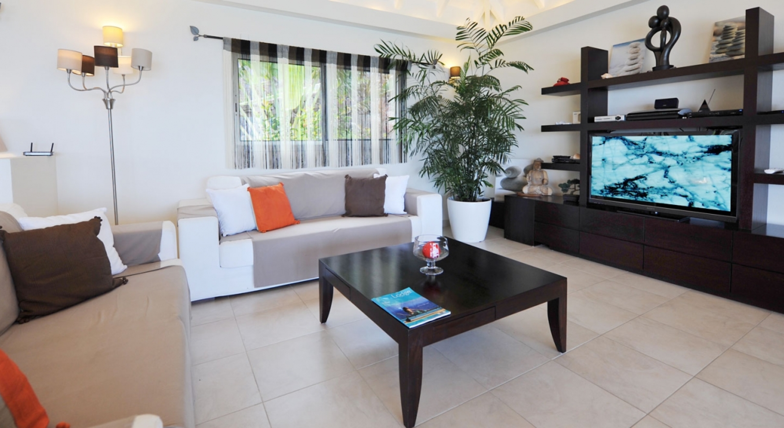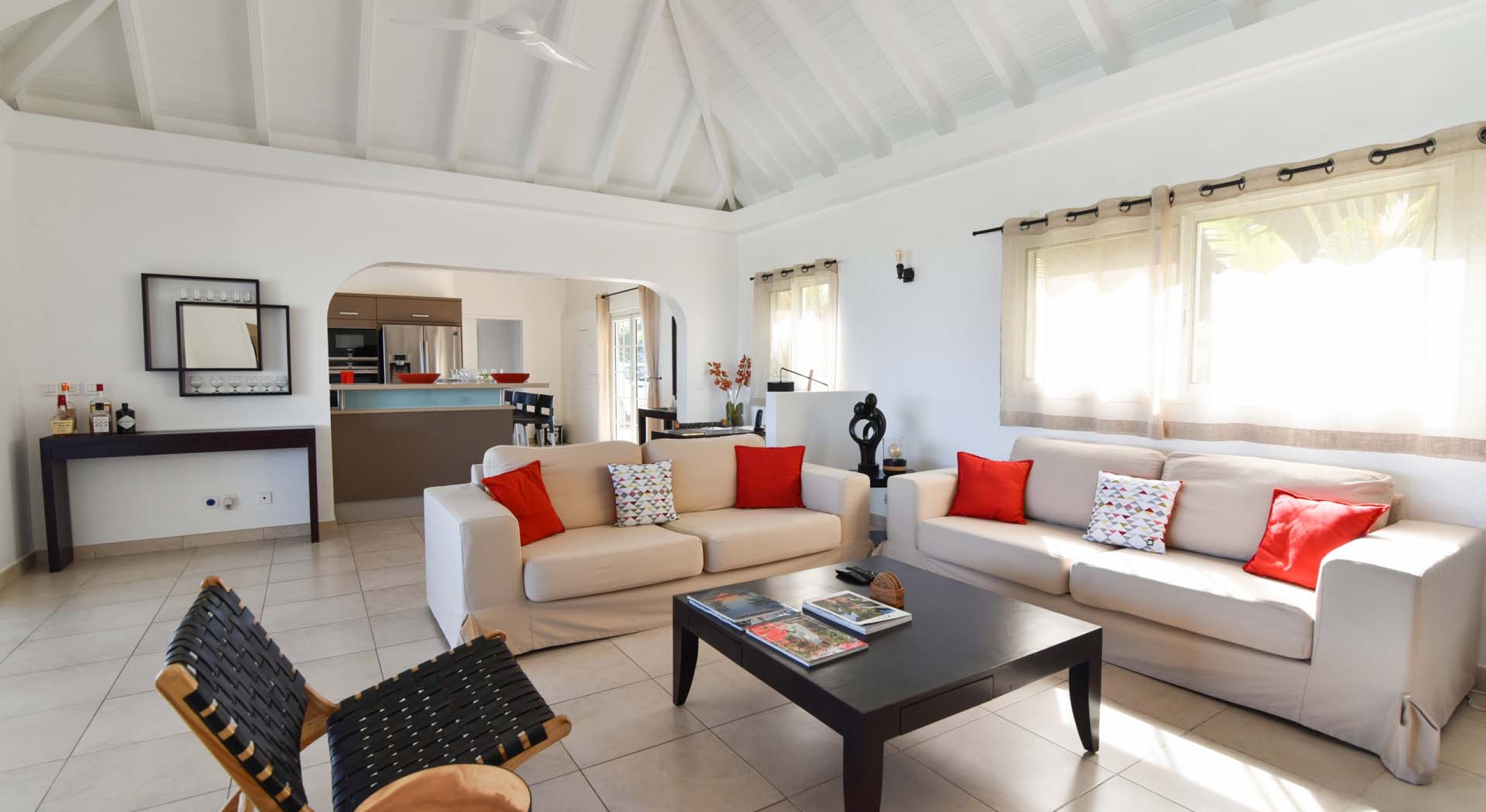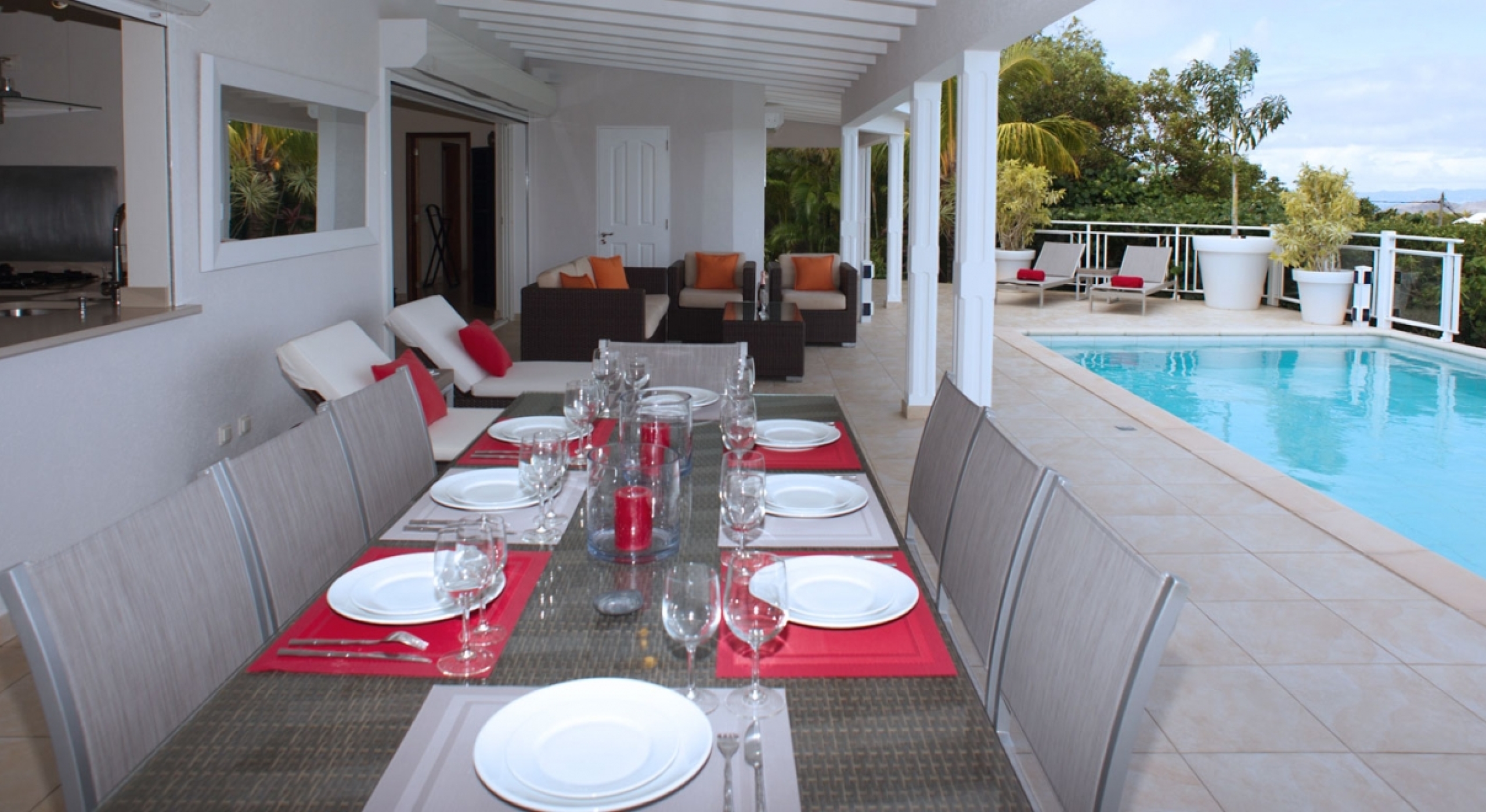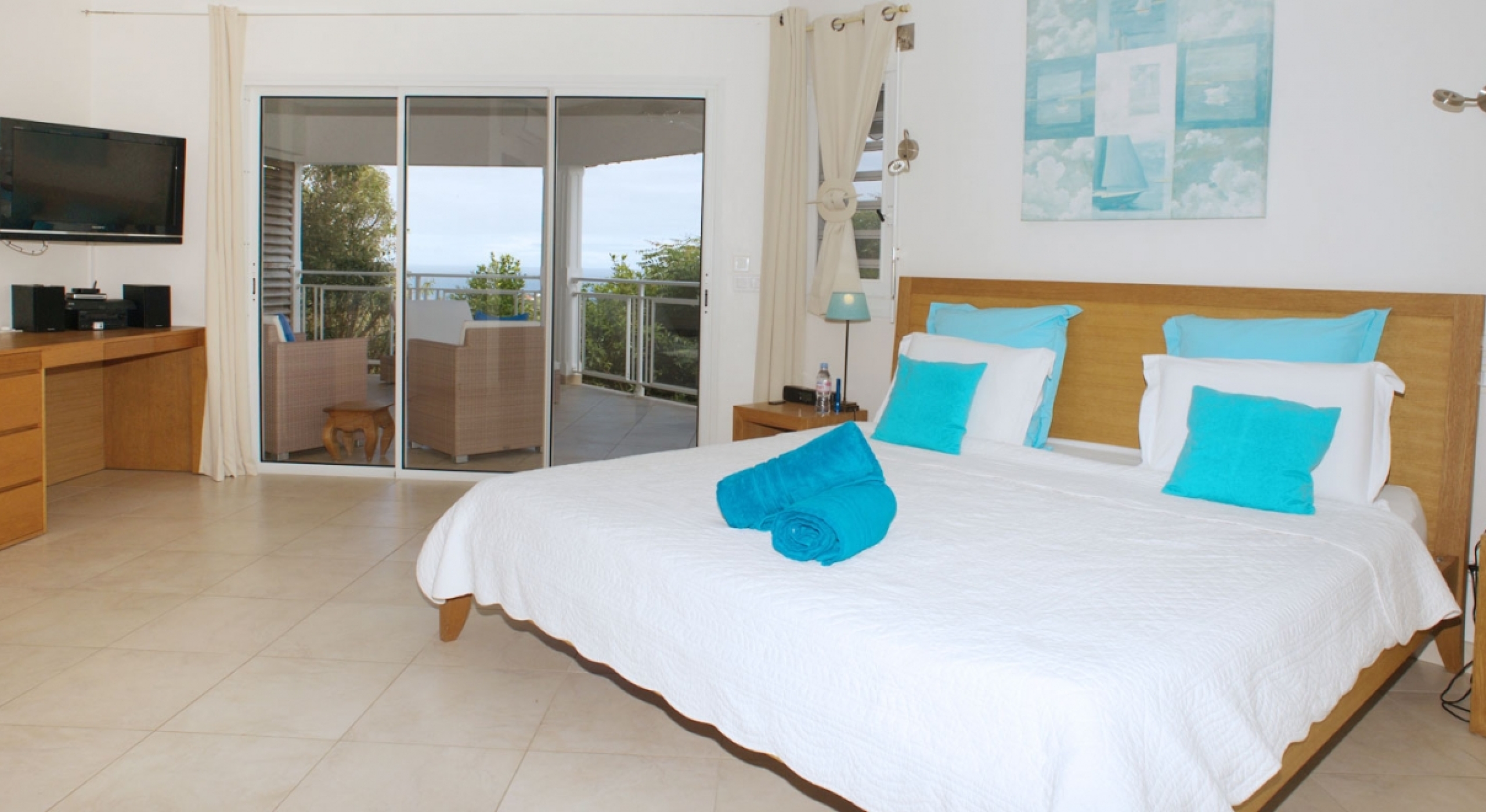 The living are of Villa Au Coeur du Rocher is beautifully decorated in modern, hip minimalist style, with strong colors and enough room for all to lounge in comfort, unwind by the television and enjoy each others company, basking in the glorious view of the Caribbean islands beyond. Complete with fan, television, Apple TV, Canalsat, satellite and iPod plug, this fully functional entertainment system offers a plethora of options to keep things fresh.