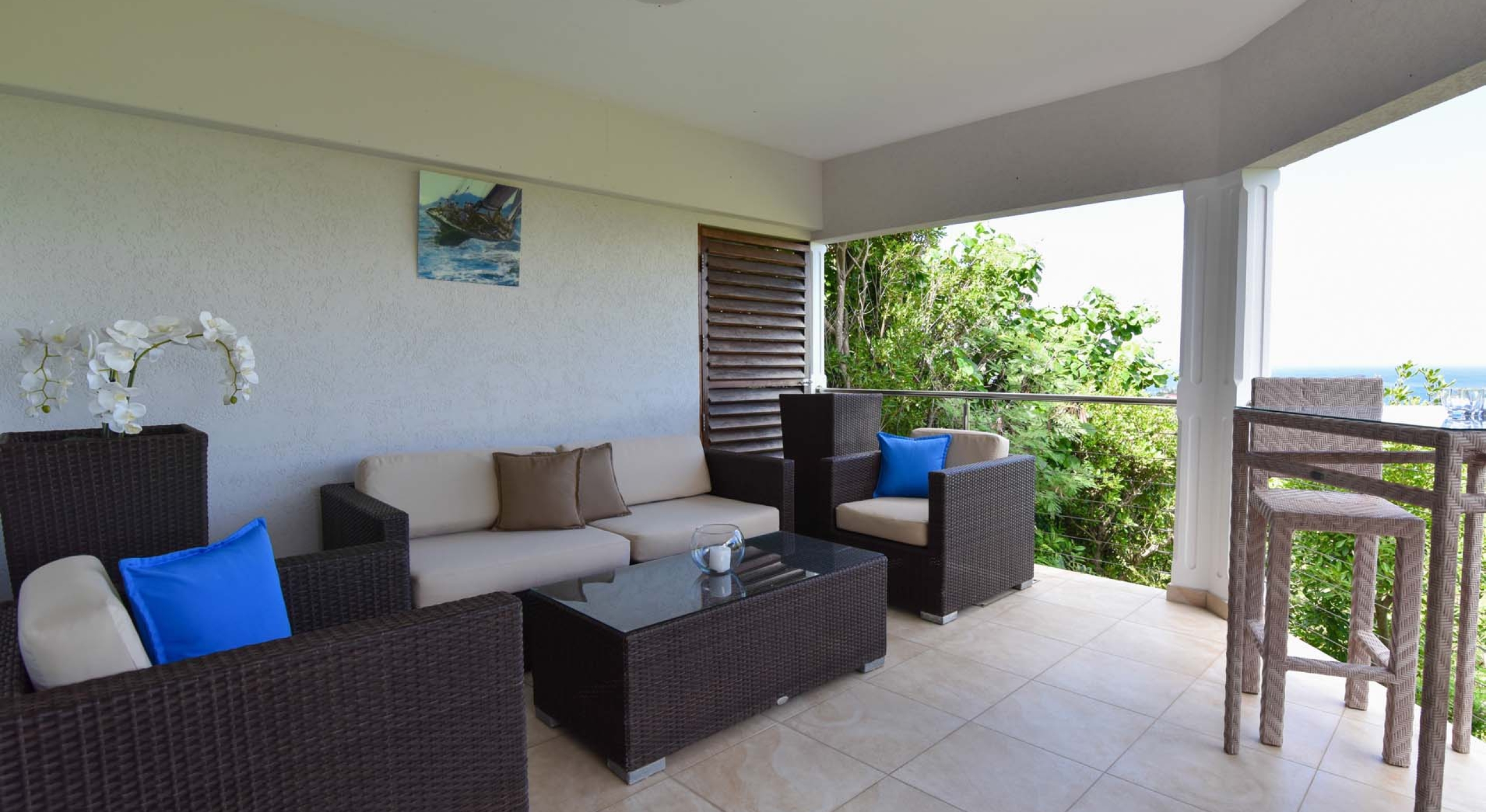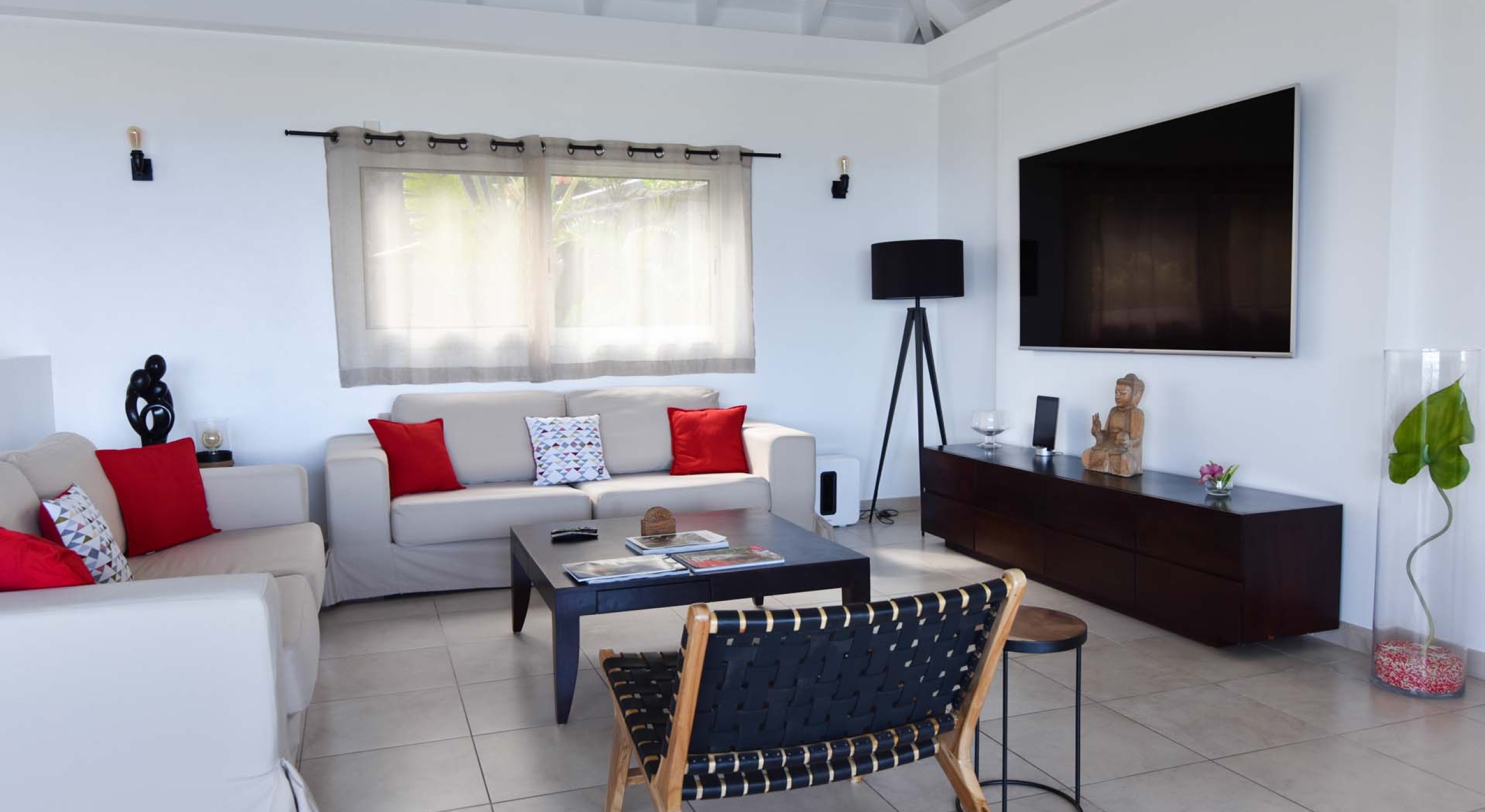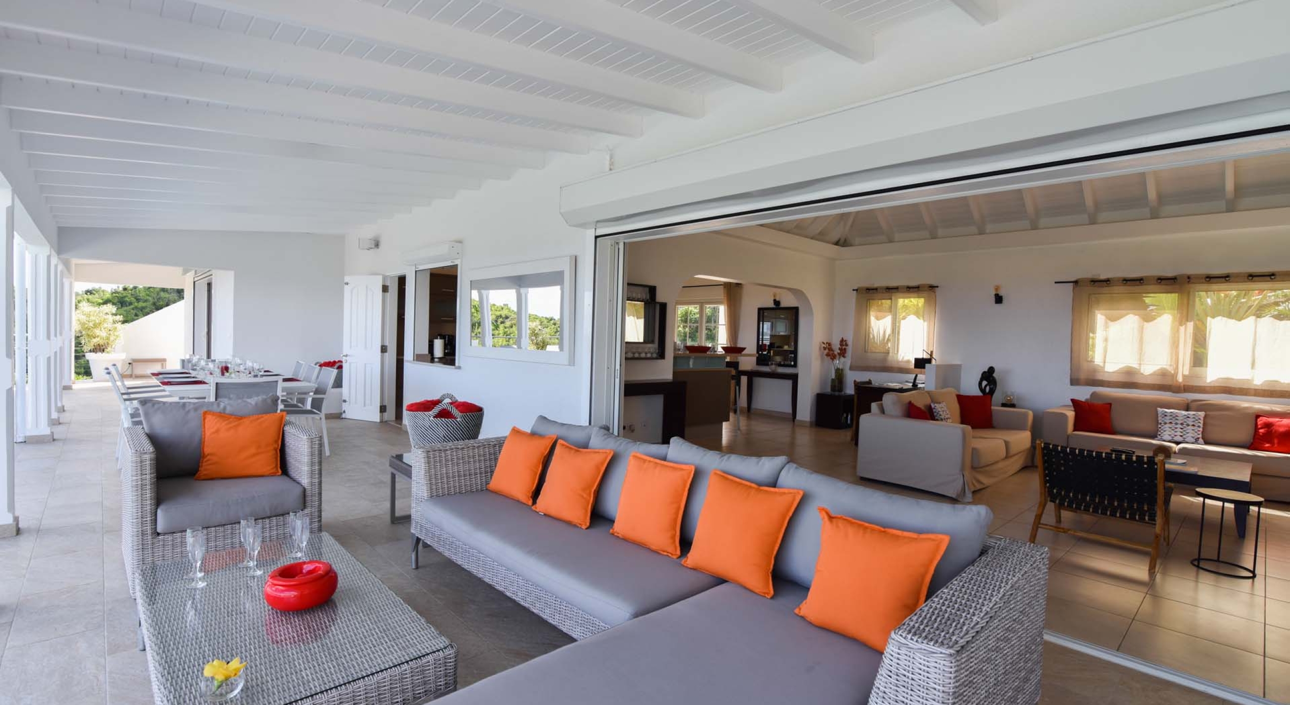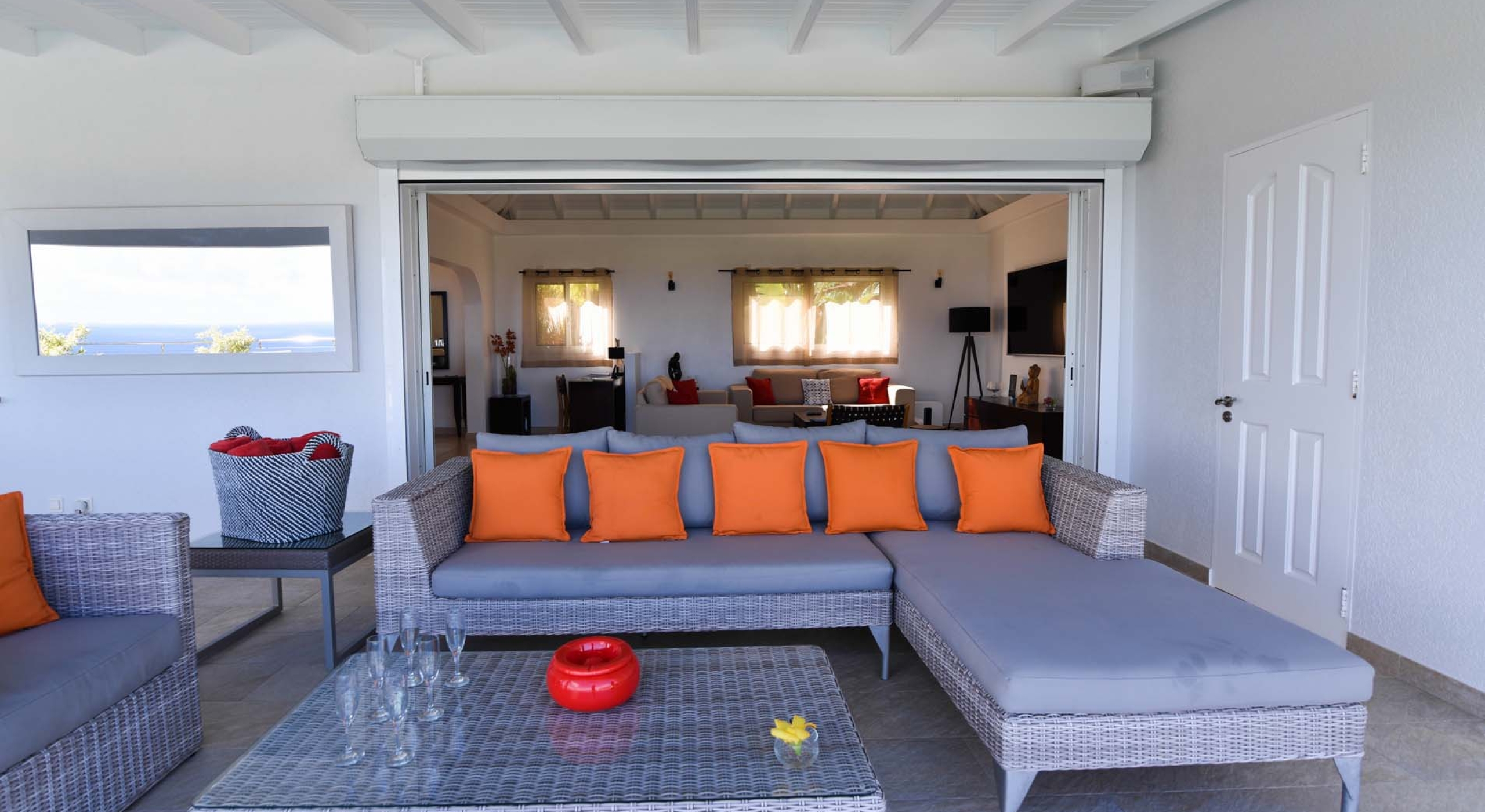 The living are of Villa Au Coeur du Rocher is beautifully decorated in modern, hip minimalist style, with strong colors and enough room for all to lounge in comfort, unwind by the television and enjoy each others company, basking in the glorious view of the Caribbean islands beyond. Complete with fan, television, Apple TV, Canalsat, satellite and iPod plug, this fully functional entertainment system offers a plethora of options to keep things fresh.