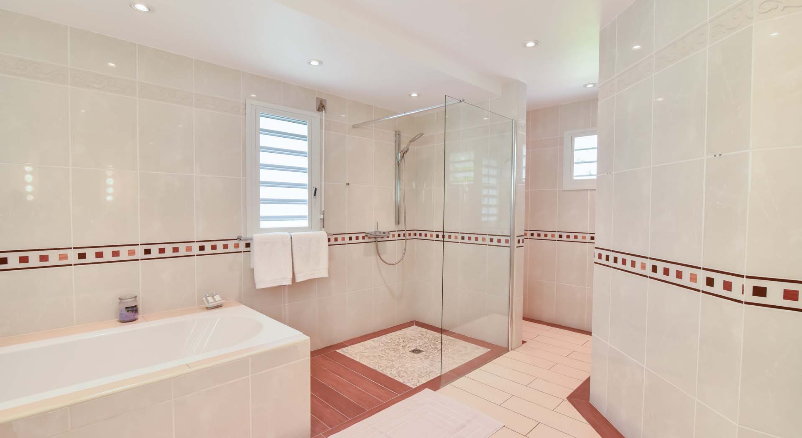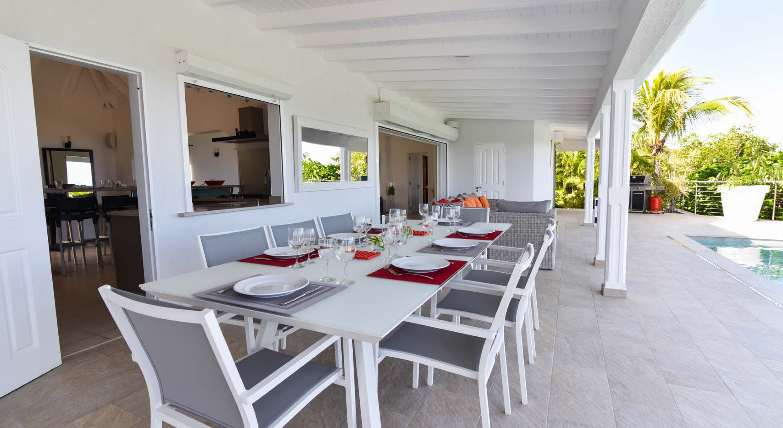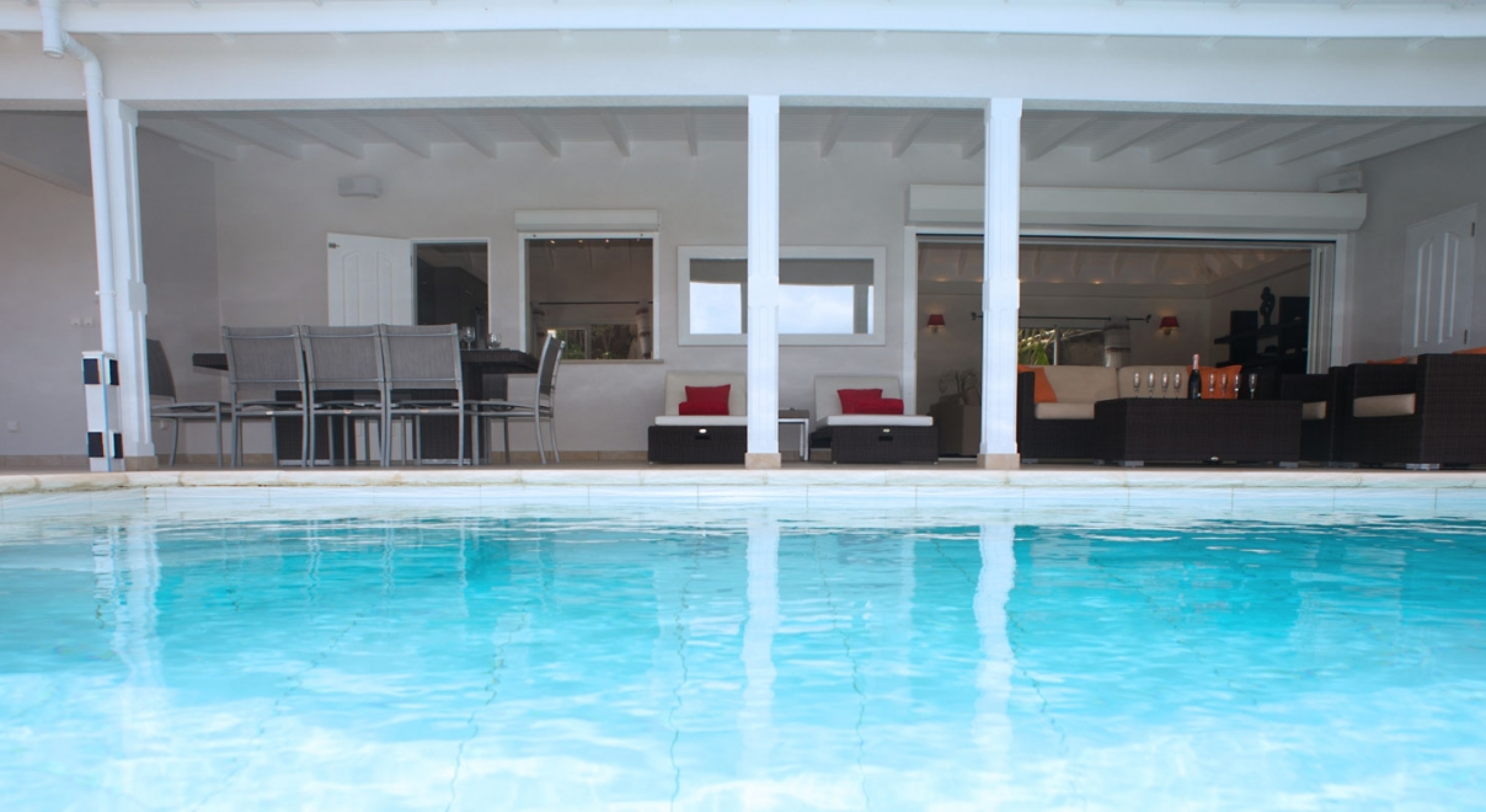 The exterior pool deck of Villa Au Coeur du Rocher is the perfect combination of open and shaded, boasting a long pool overlooking the view, lounge area for sunbathing and shaded seating area for those looking to escape the sun but not the fun in its entirety. This ‘best-of-both-worlds’ situation makes it so that entire days can melt away before you on the pool deck in blissful laughter and merrymaking.