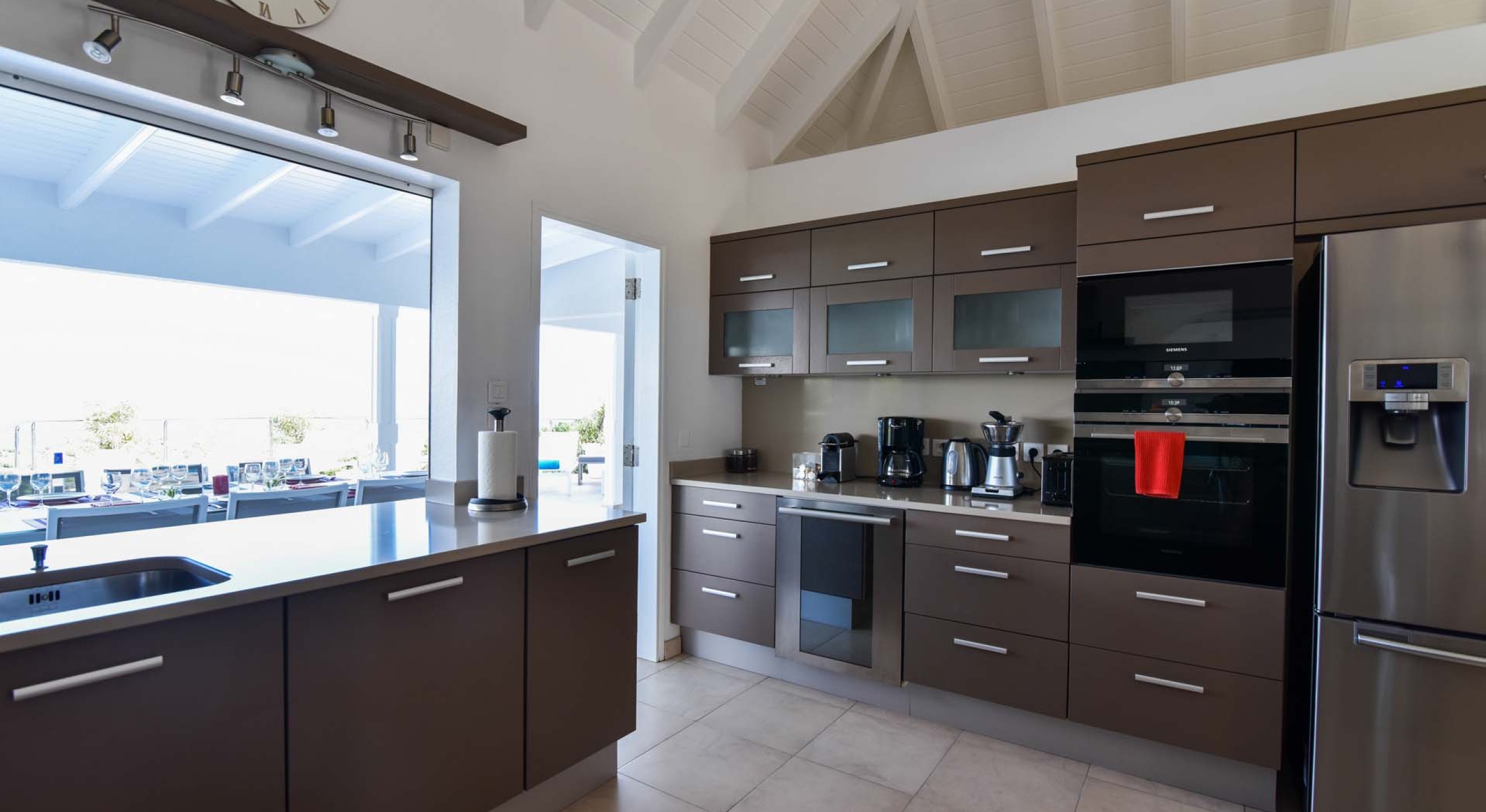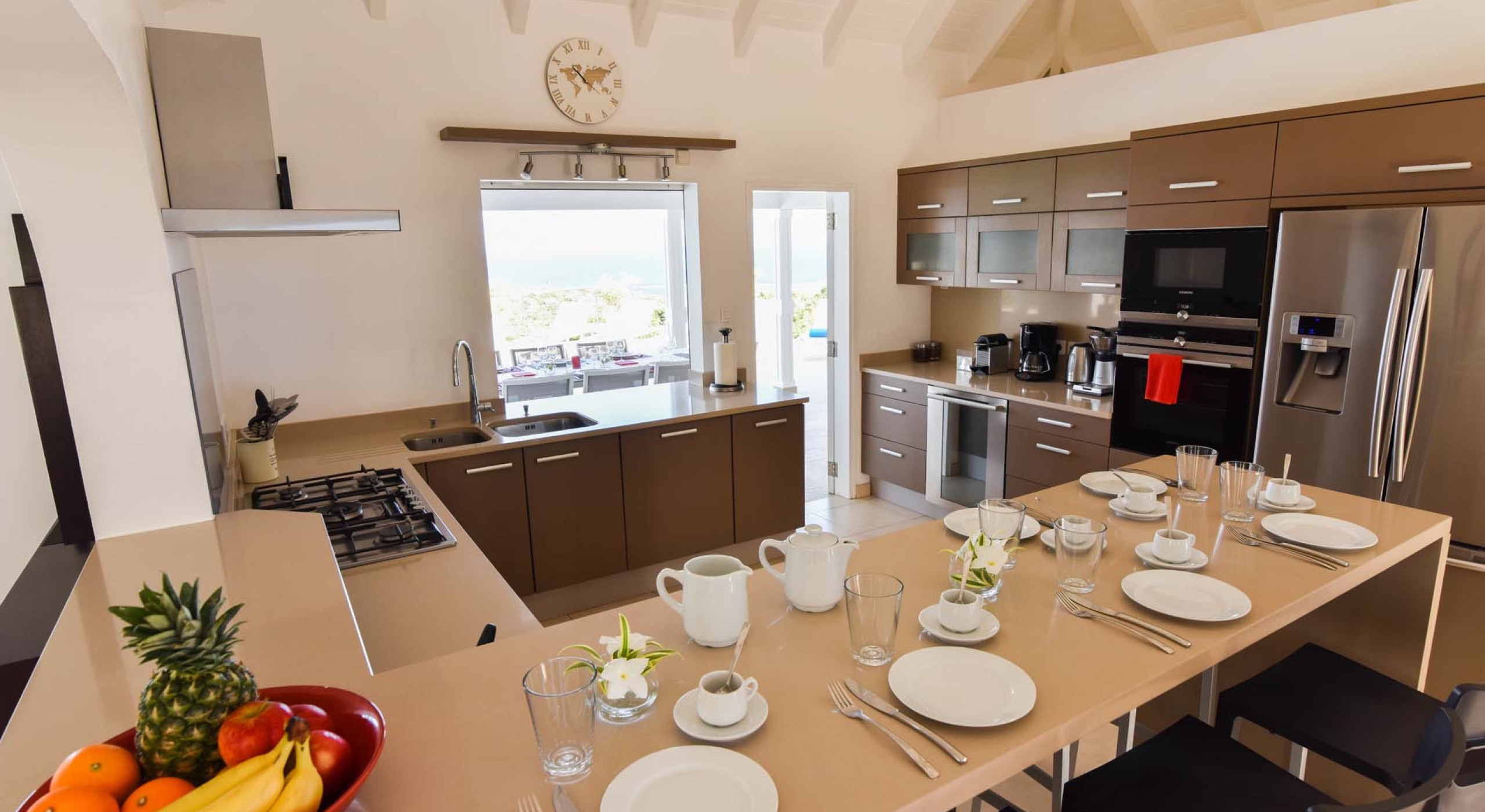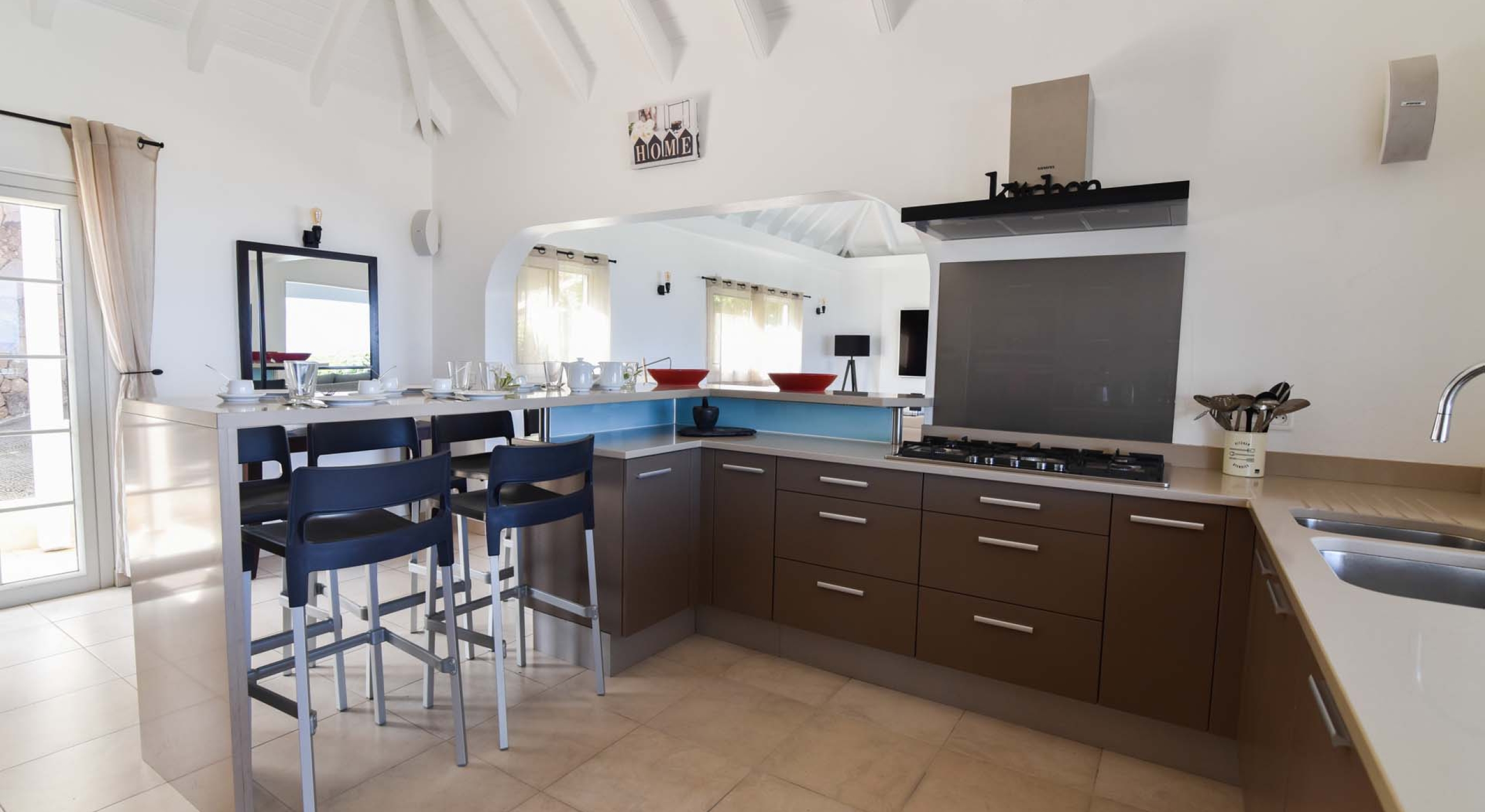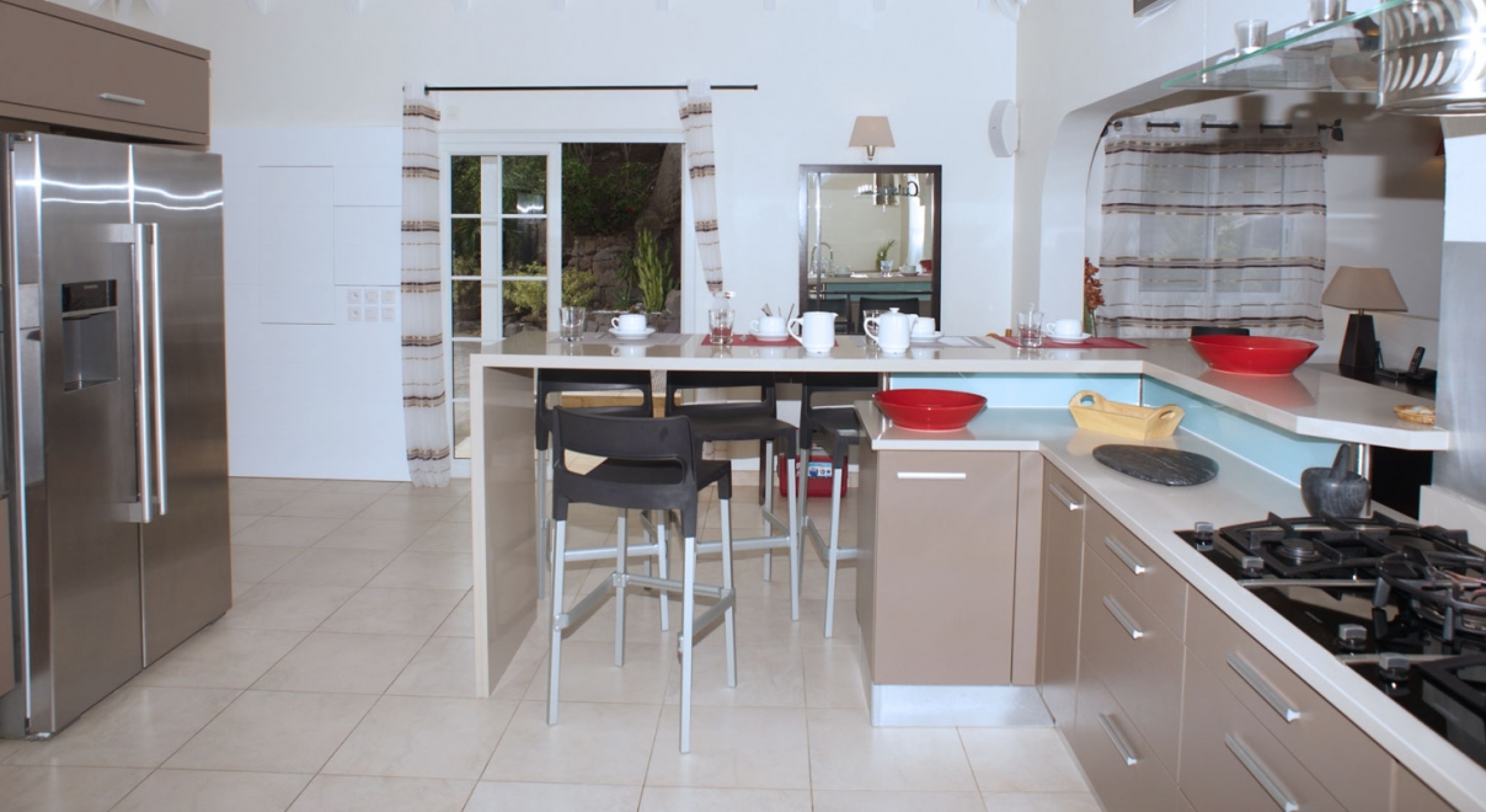 The kitchen of Villa Au Coeur du Rocher is beautifully done, and one of this luxury villa rental’s premier features. Comfortably equipped for eight, the kitchen features a microwave, coffee and espresso machines, toaster, blender, dishwasher, icemaker, squeezer AND wine cellar, ensuring that the only end to the party is when you say so! Pair your creations with the dining island and enjoy every meal in the serenity of your own thoughts.