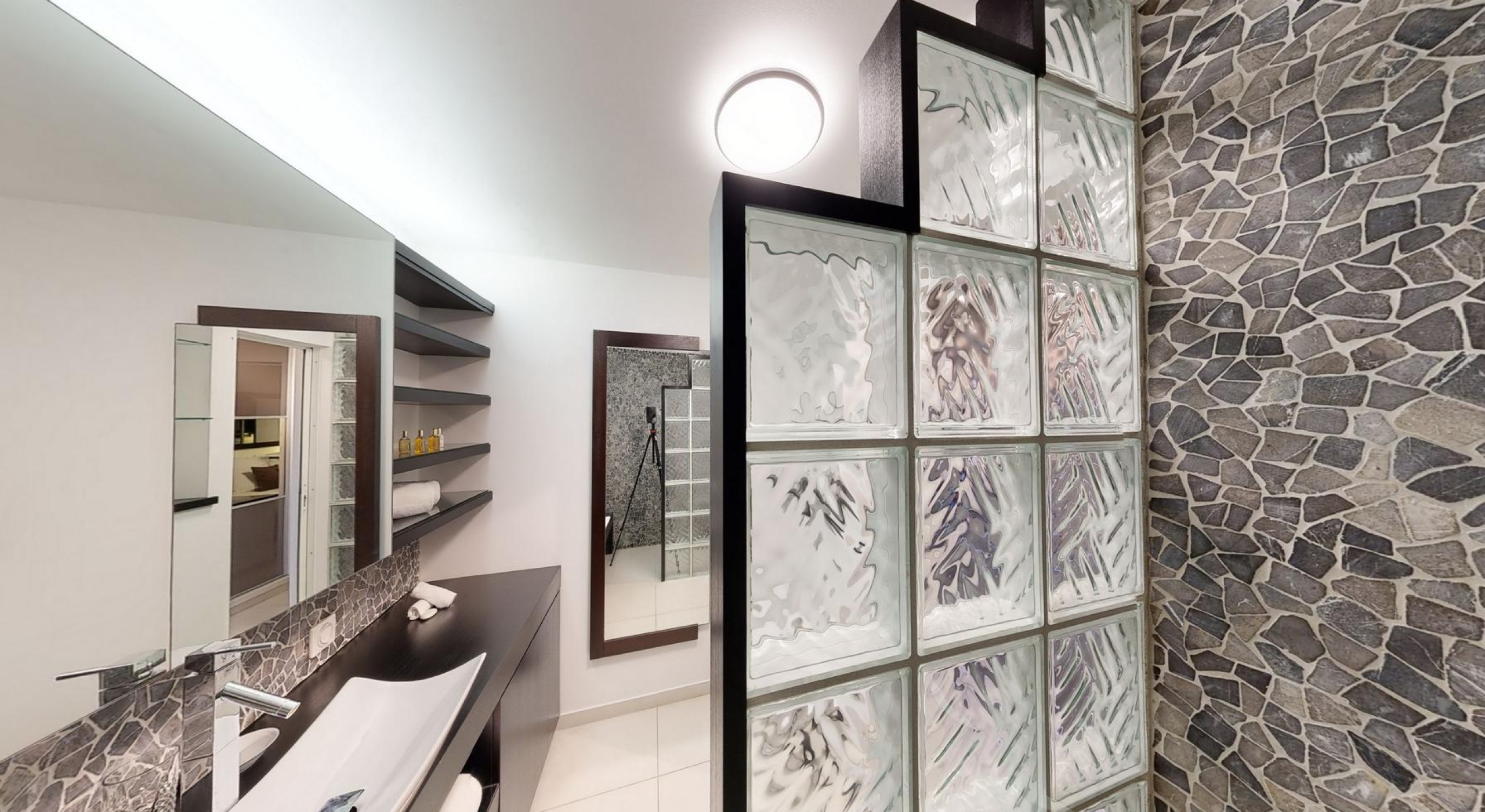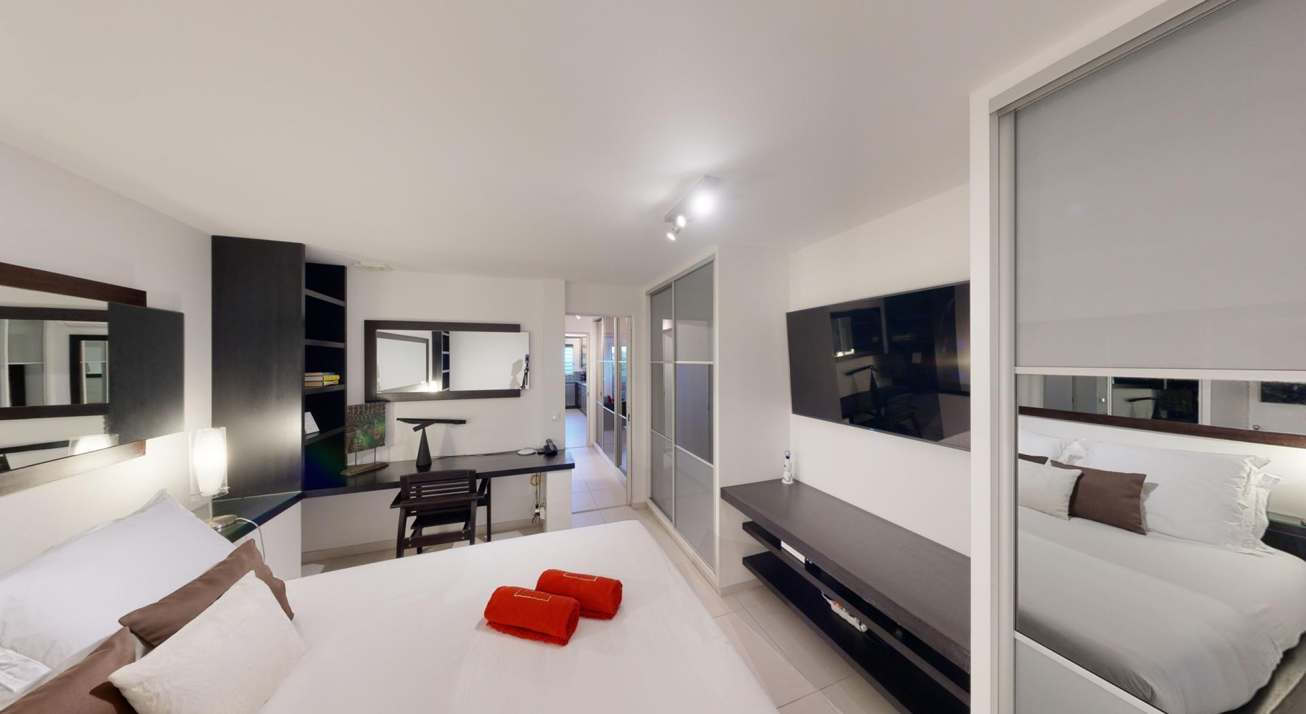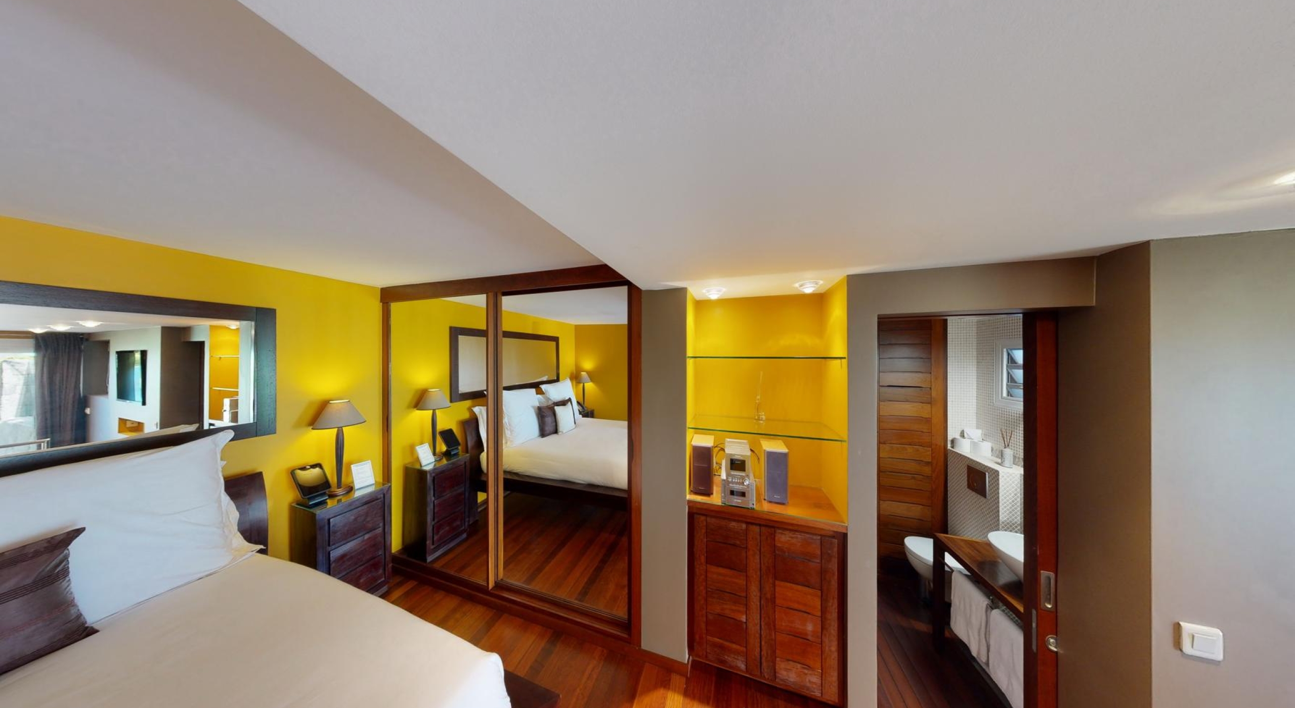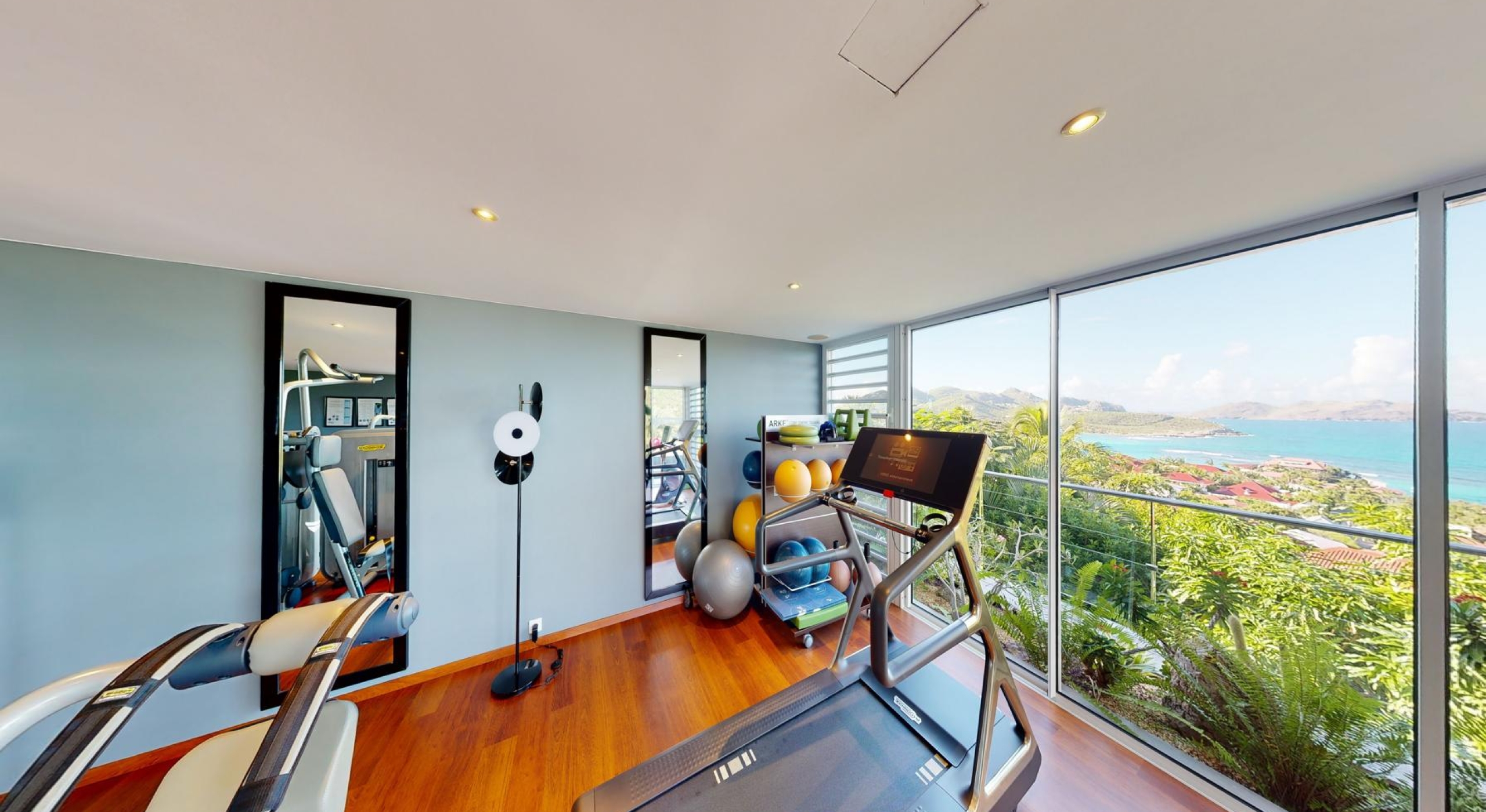 On the lower level you will find the heated pool, an air-conditioned bar, the fitness room and two bedrooms (one of which offers a small living room and kitchenette) with access from the terrace.