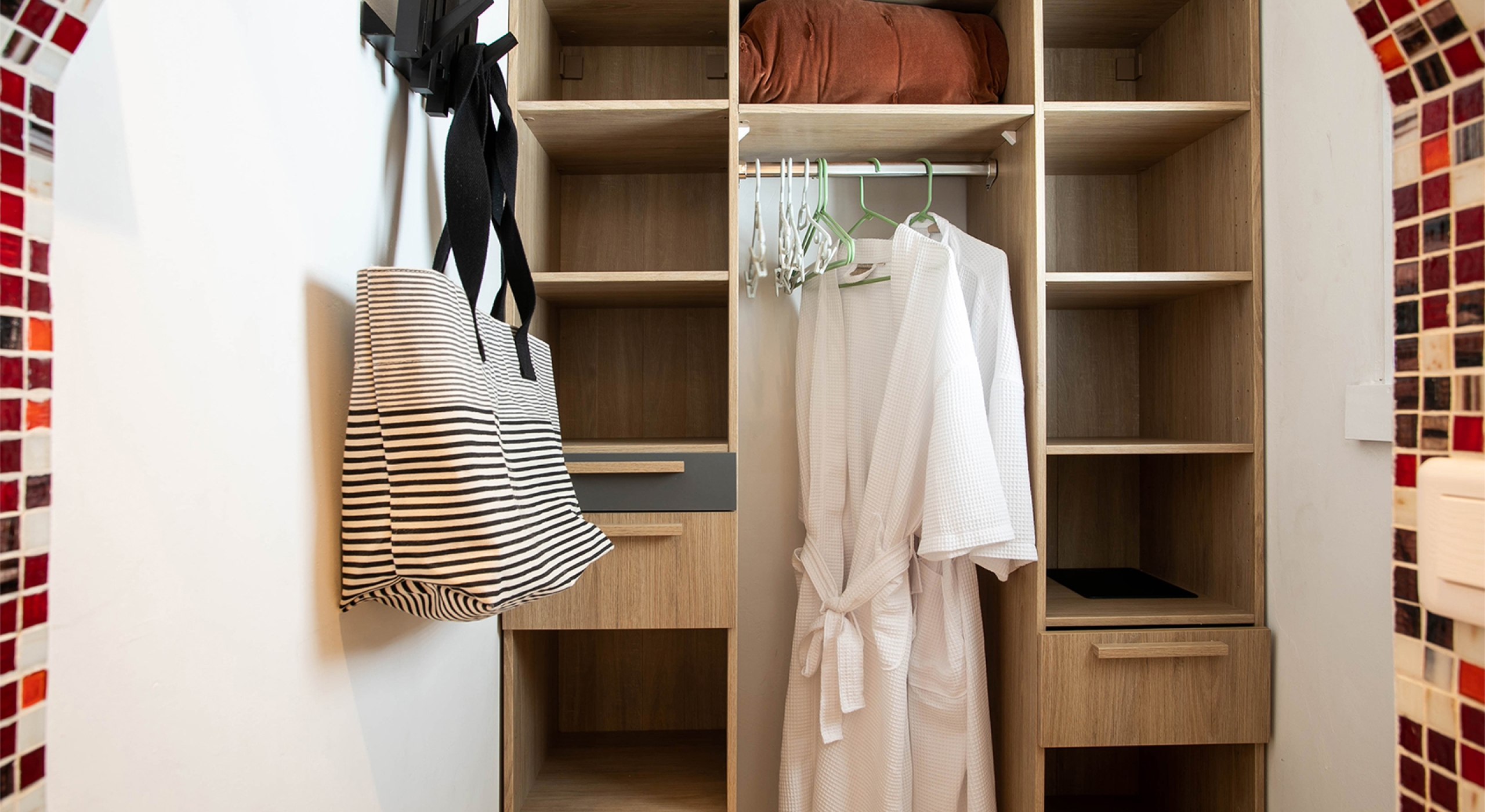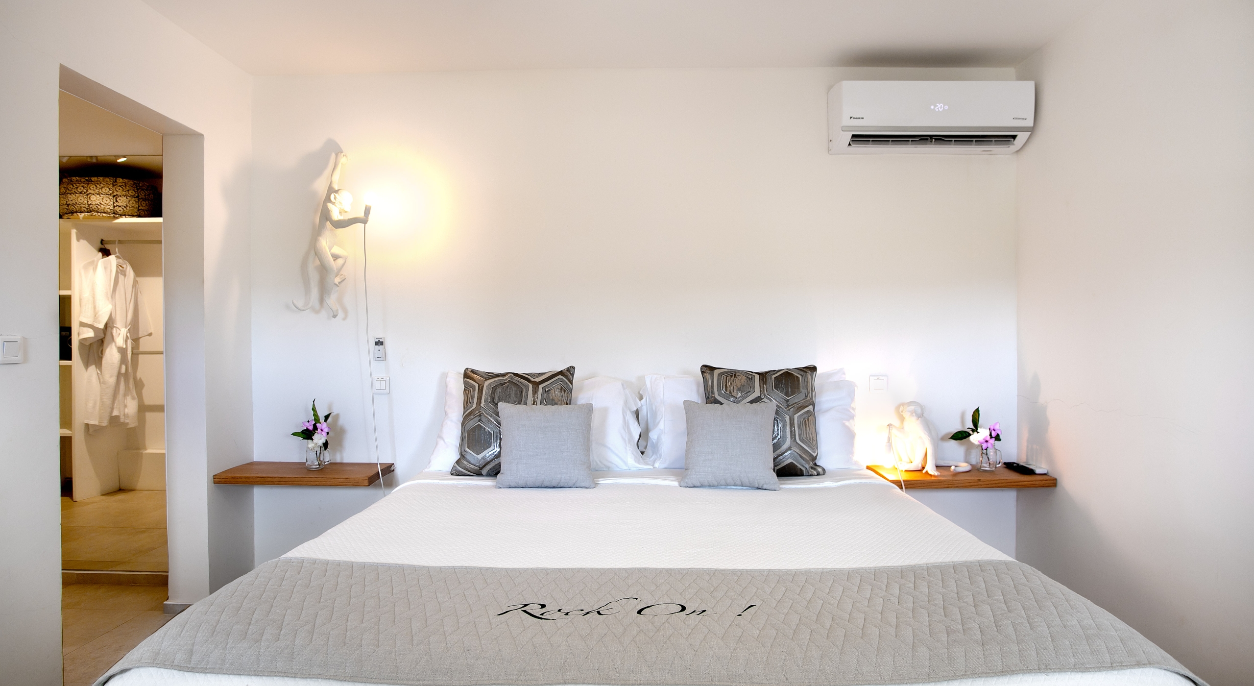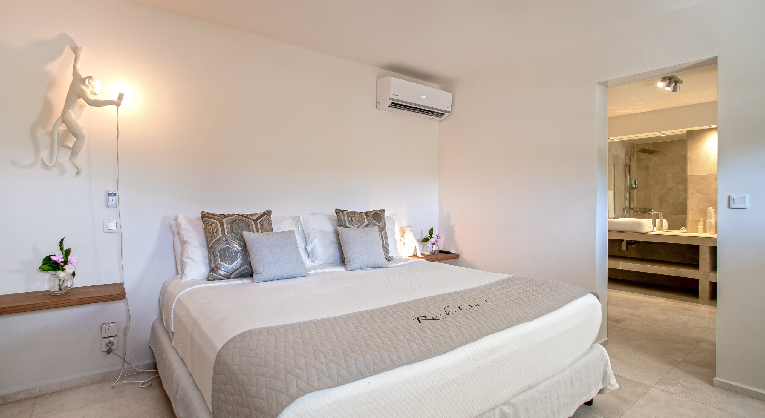 The villa’s five bedrooms are situated in a building independent from the communal living spaces and built on three levels into the hillside. Each bedroom possesses a unique design. On the ground floor are the bedrooms “Selenite” and “Citrine” and stone steps lead up to an ocean view balcony and the bedrooms “Howlite” and “Carnelian”. A 5th bedroom “Rose Quartz” is located in the main building below the living area with its own private deck area that can be accessed from the pool terrace and the entrance driveway. All five bedrooms offer king-size beds, beautiful en suite bathrooms and closets with his & her bathrobes, and a beach bag that comes in very handy for a walk down to the nearby beach. The “Howlite” bedroom also features a seating area with a large sea view window and its own private balcony and large daybed overlooking the ocean and the pool terrace below. “Citrine” on the ground floor also has its own private terrace with an ocean view.