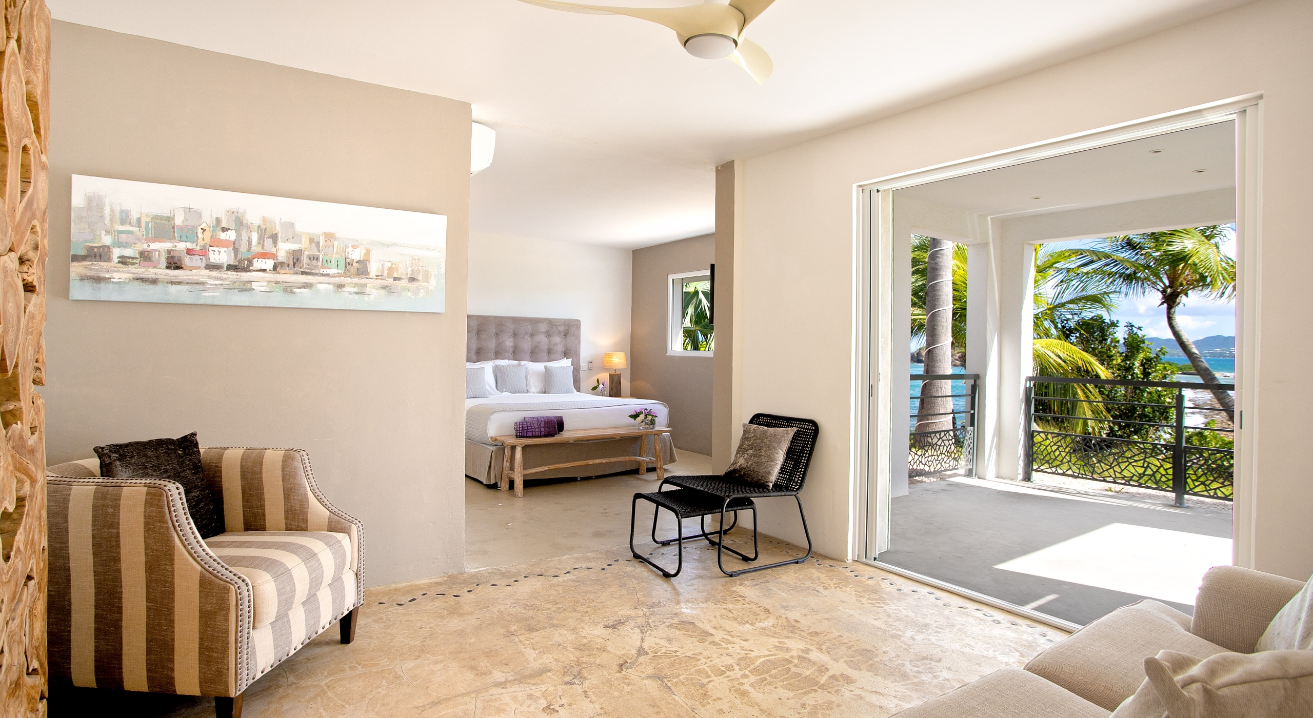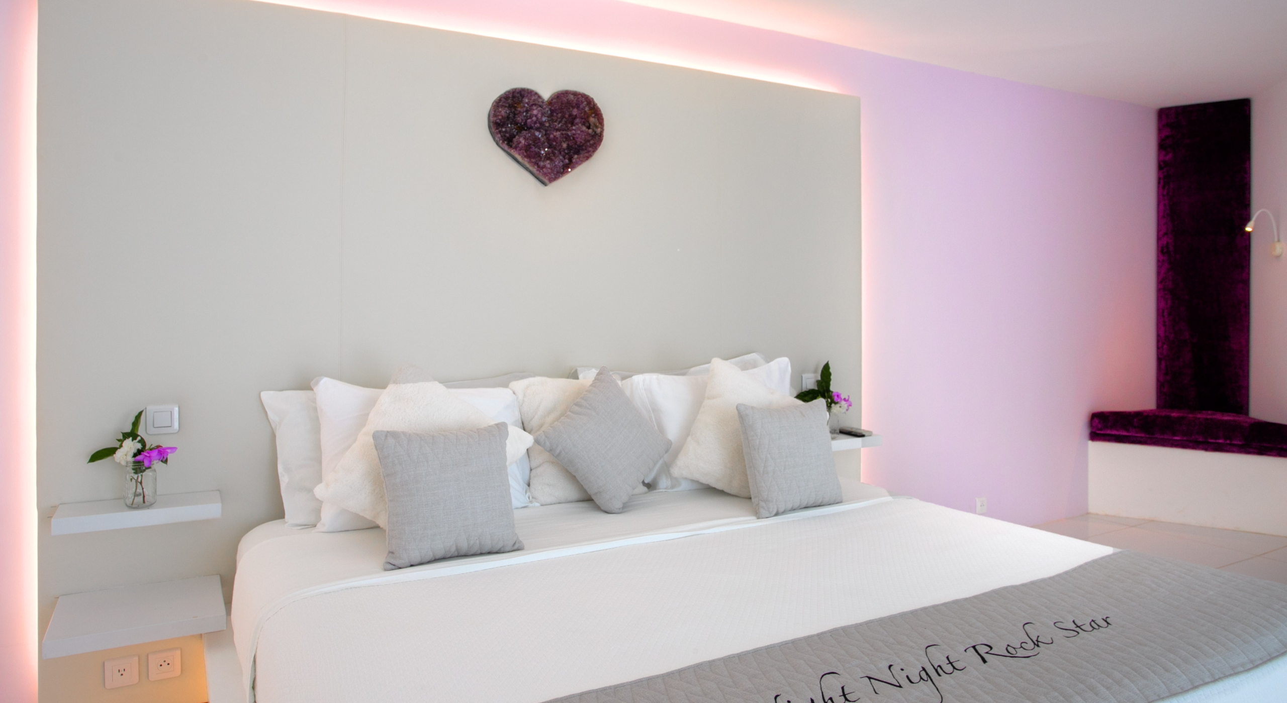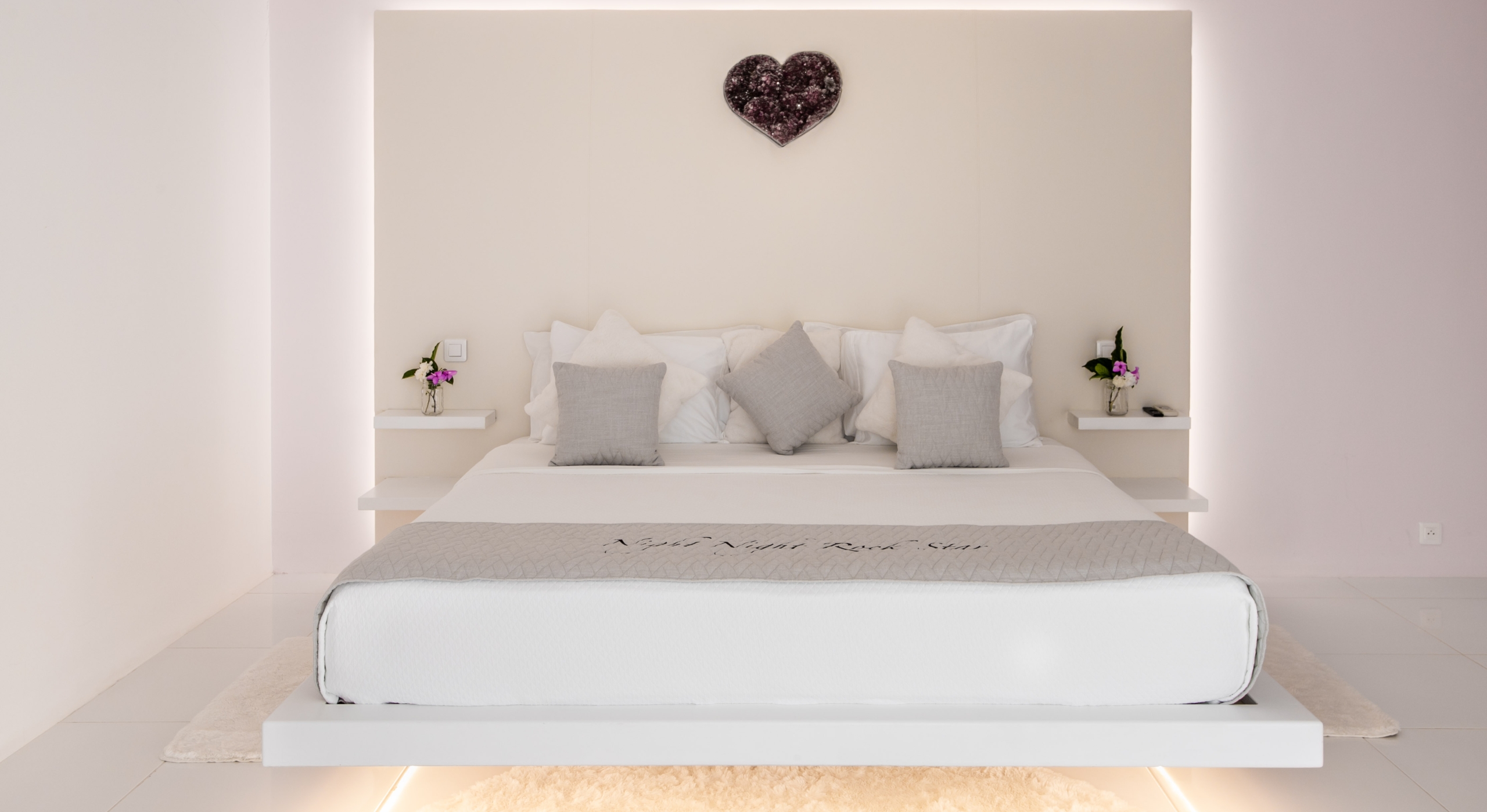 From the villa’s gated entrance a winding driveway leads up through tropical gardens to the main front door and stepping over the threshold a stunning view greets you as you enter from the arched entry courtyard into the villa’s inviting interior. This beautiful gem of a villa derives its name from a stunning pair of amethyst wings, situated in the living room/reception area. At just over 6ft tall this beautiful crystal radiates a soft lilac glow to the surrounding white walls and the decor has been kept intentionally understated so as not to detract from its natural beauty. Each bedroom is named for a healing crystal to further emphasize the natural bliss this villa imparts upon the villa’s fortunate occupants.