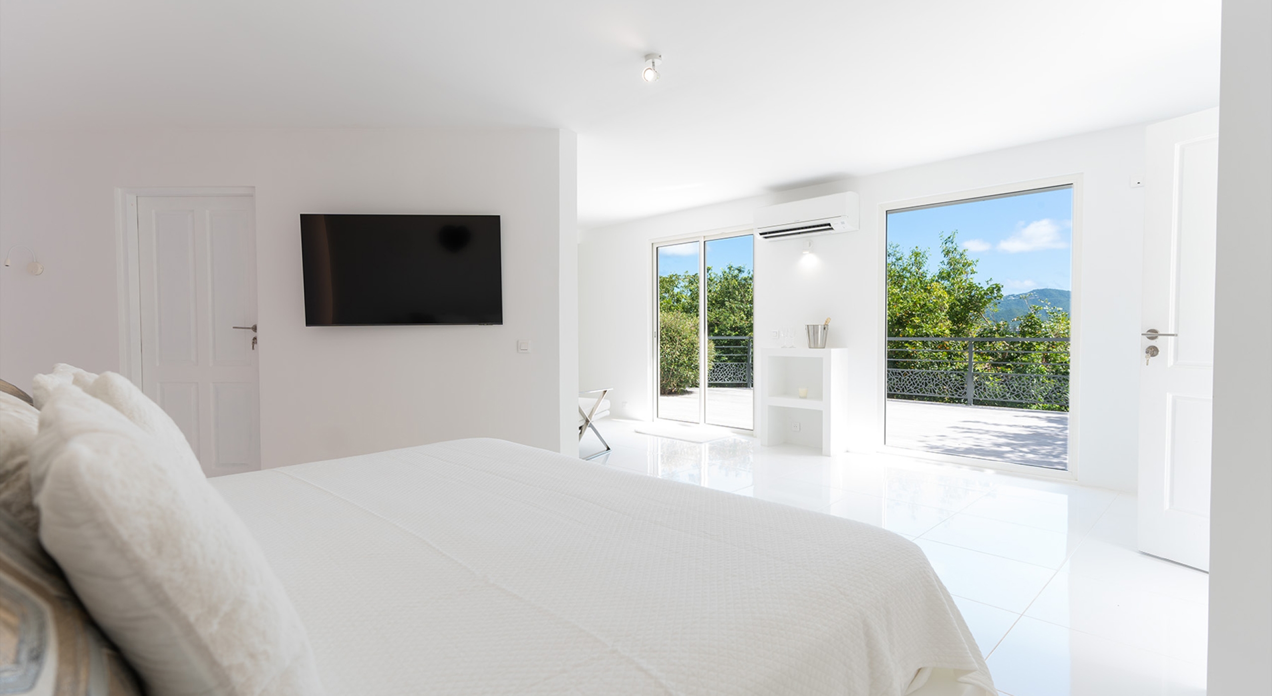 The light-filled living room has on one side a comfortable TV viewing area and along the front, doorways framed by wooden shutters open out to the terrace and the unobstructed and breathtaking ocean view. The brand new galley kitchen, situated to the left of the living room features sleek white cabinetry and Neff appliances. There is a windowed breakfast nook at one end and at the opposite end, opening onto the terrace, a convivial bar area fitted with a wine cooler and ice machine.