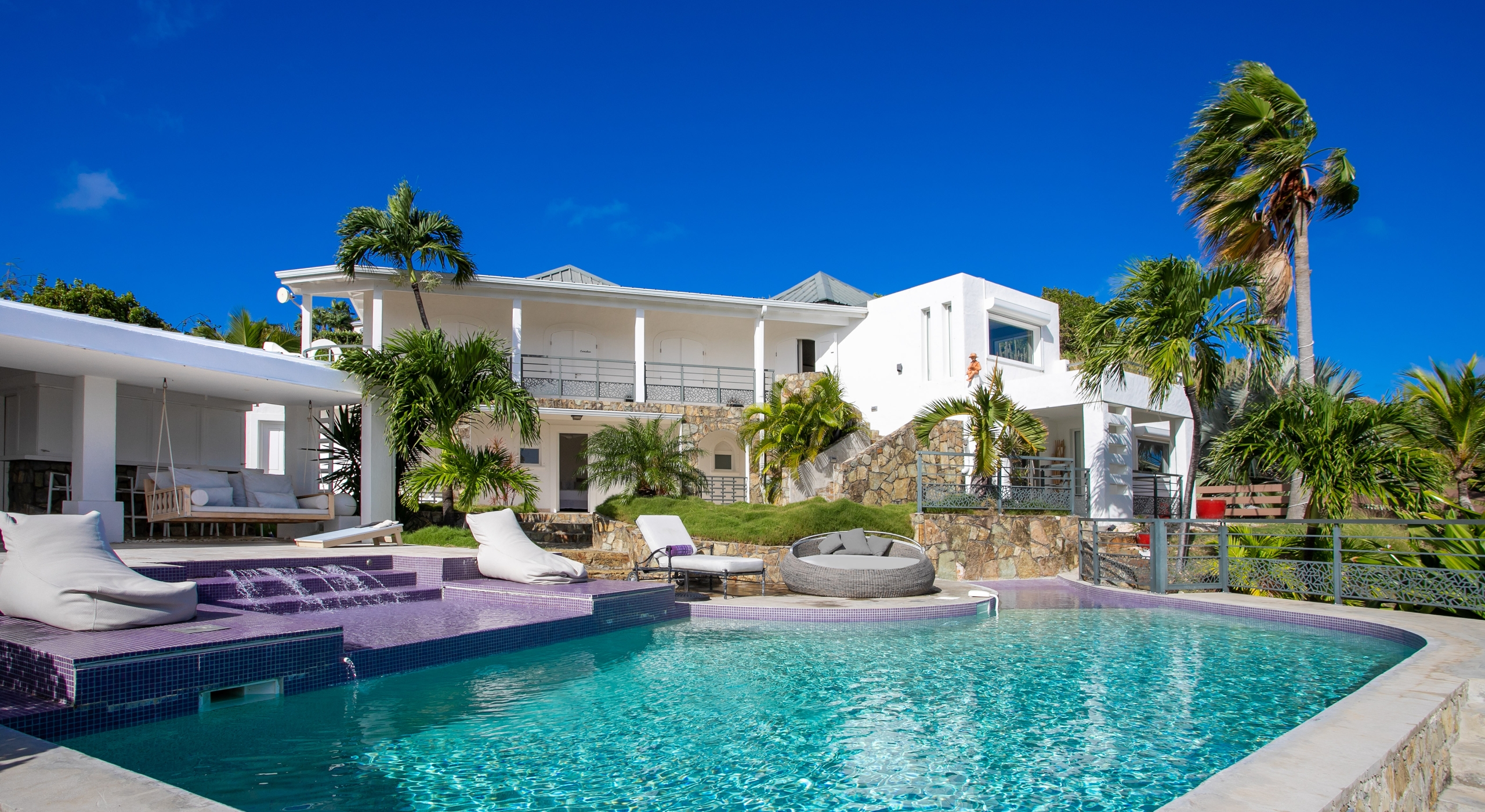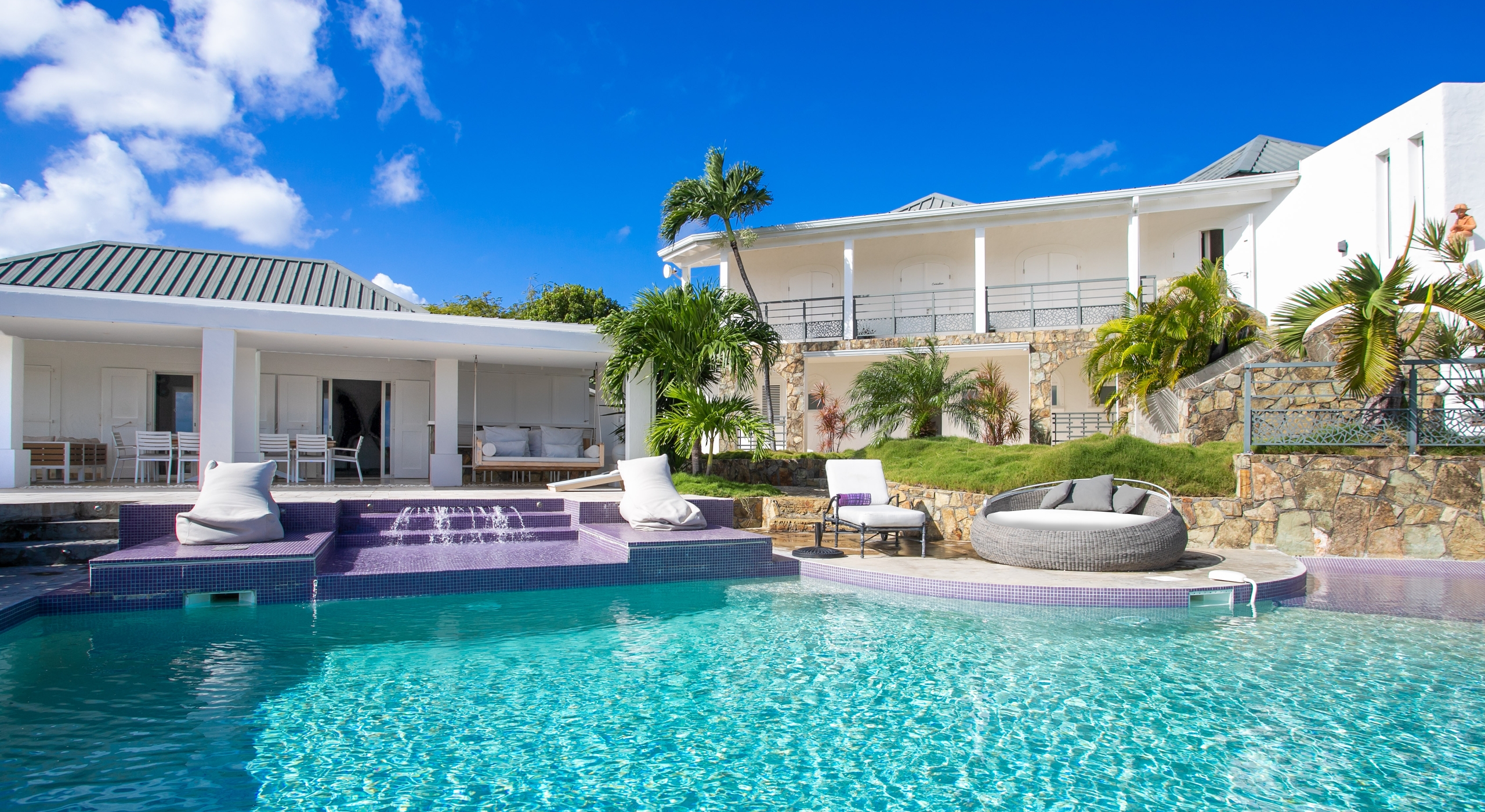 From its privileged cliffside position overlooking the Pointe du Bluff in Terres Basses, on French St. Martin’s northern coastline, Villa Amethyst is nestled between the Baie aux Cayes and the spectacular natural rock archway known as the “Trou de David''. The view is spectacular and encompasses a 180-degree vista across the ocean with the natural beauty of the bay in the foreground and the picturesque St. Martin coastline and the neighboring island of Anguilla on the distant horizon. The evening view is just as pretty with the twinkling lights of Marigot Bay and Anguilla and the cruise ships passing by below. This beautiful four-bedroom home formerly known on the vacation rental market as Le Mas des Sables has now been completely rejuvenated into a luminous version of its former self.