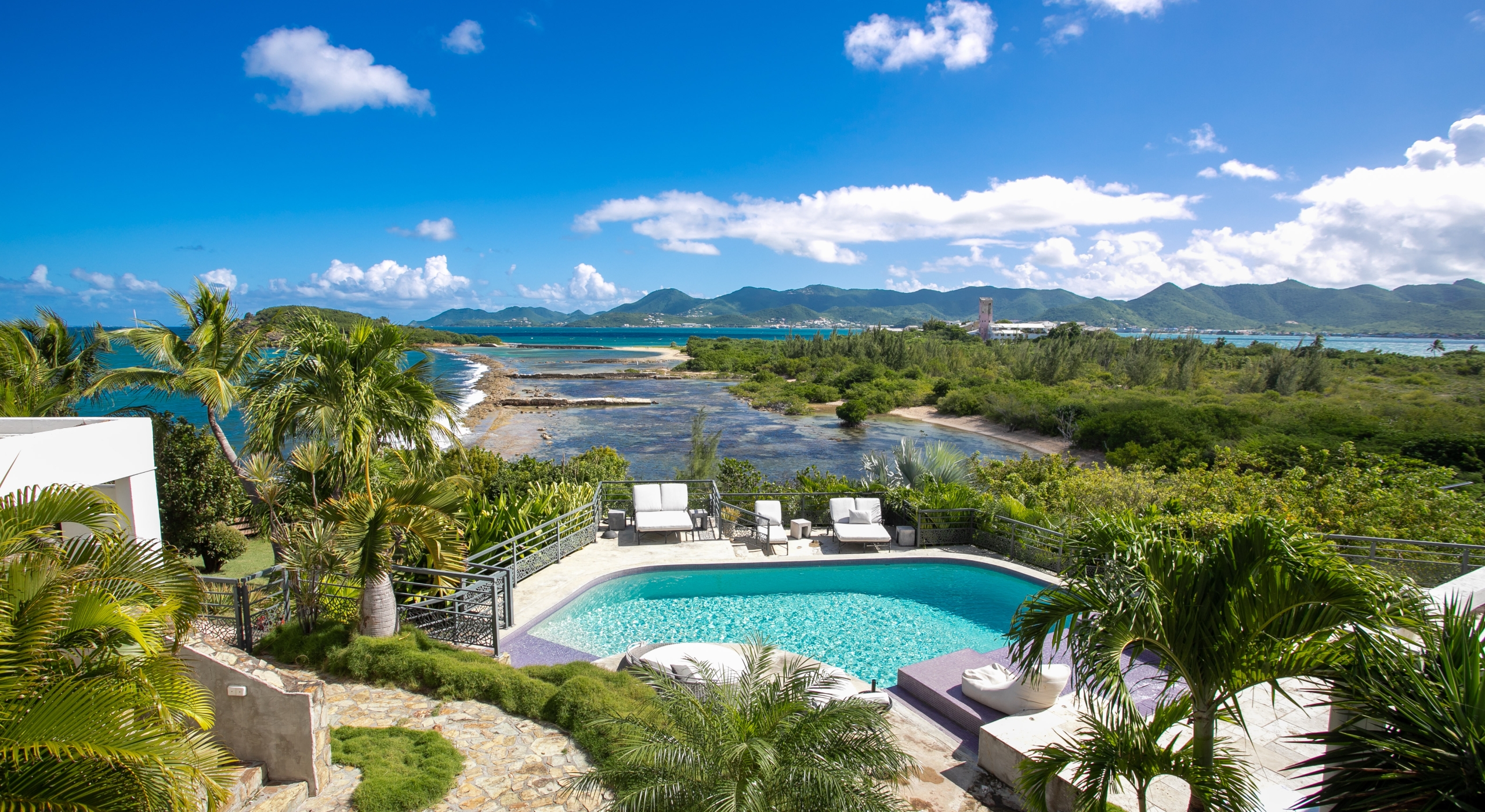 Outside, the covered terrace has a lounge area and a large dining table with seating for ten, and a large gas grill. The terrace follows the incline of the hillside and steps down to a beautiful free-form pool below, surrounded by plush loungers and daybeds and a lower-level sunning terrace. The terrace also extends around to the side of the house to enjoy the beautiful east-facing view overlooking the scenic Simpson Bay lagoon. For a more active option, a Cornhole game set is also available on the terrace.