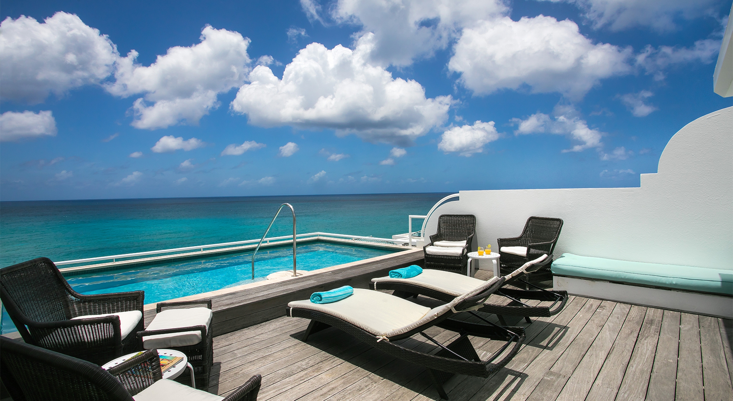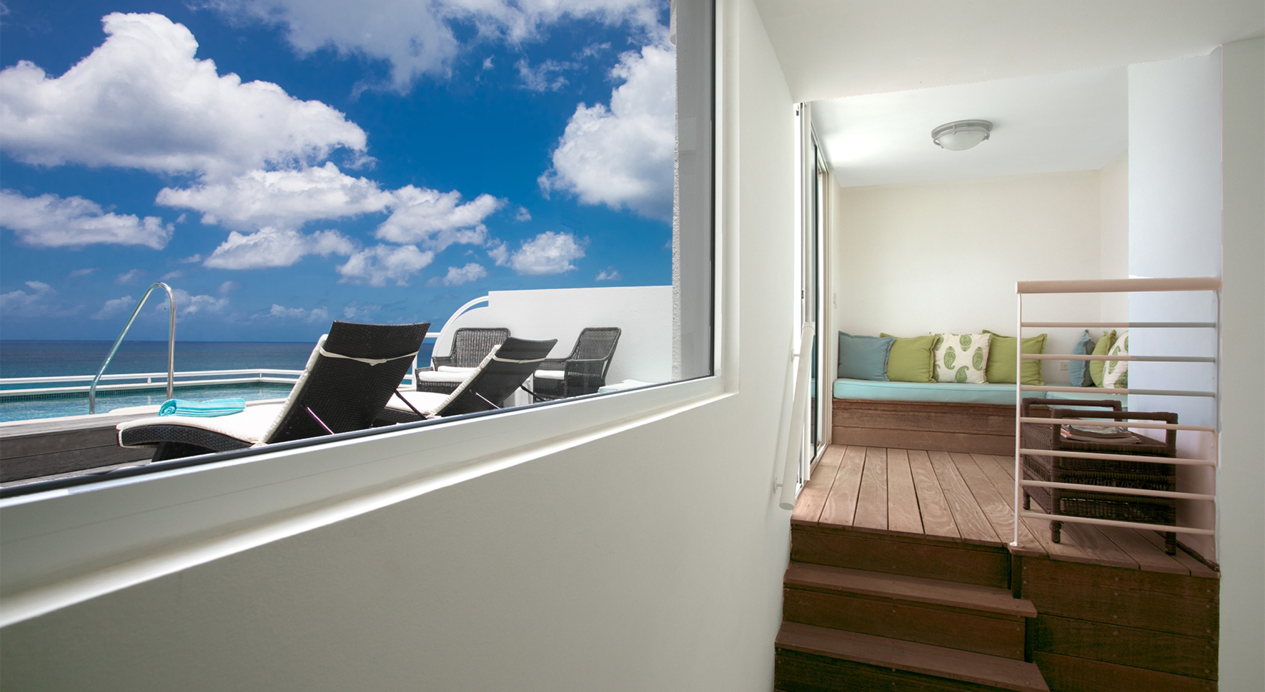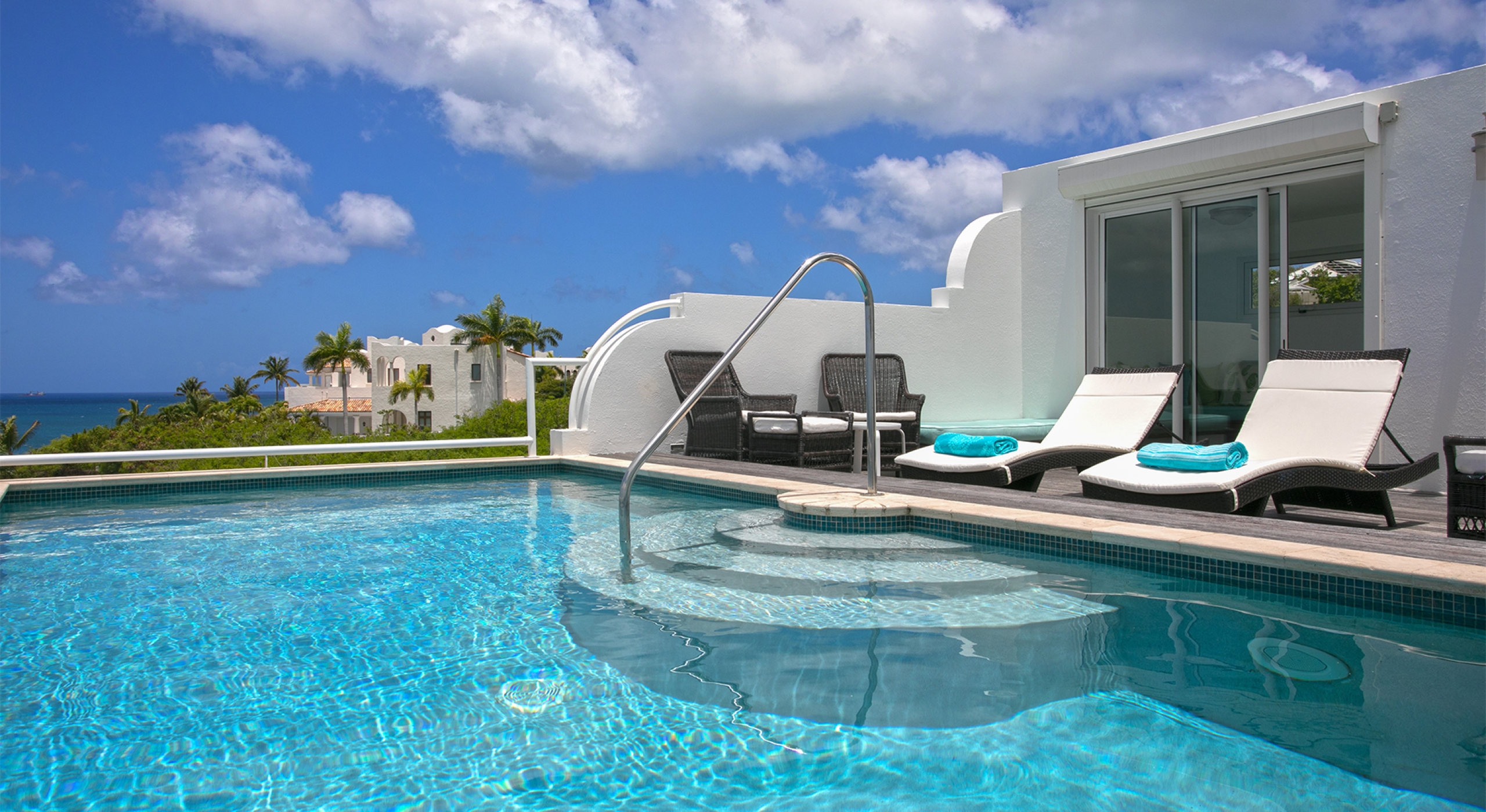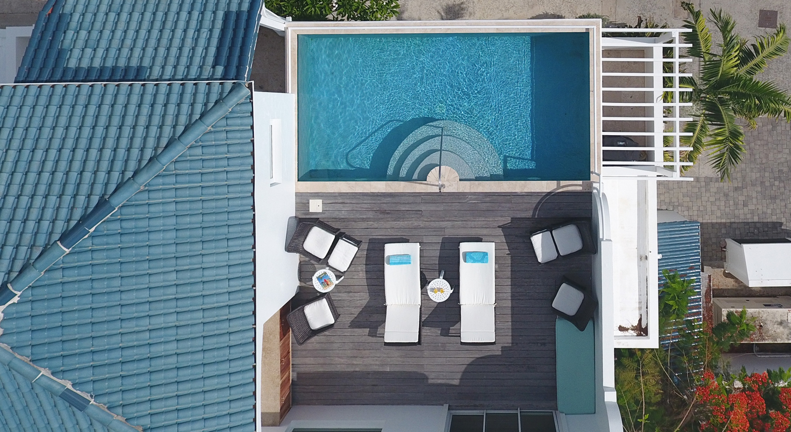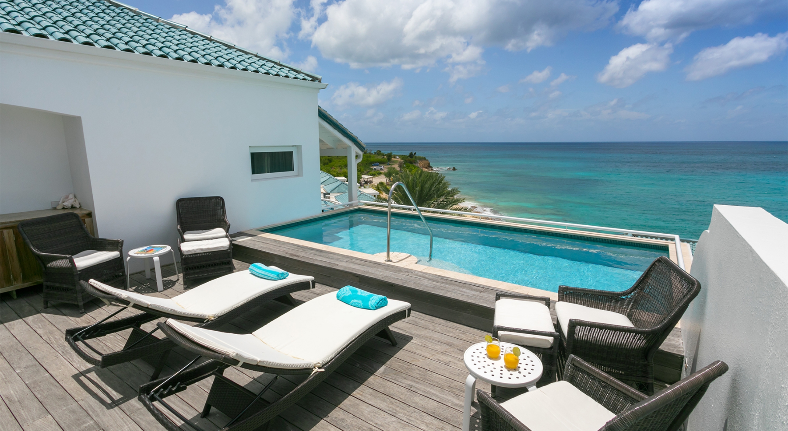 On the top floor is the rooftop plunge pool and sunny deck area framed by the sapphire blue of the Caribbean and the picturesque island of Saba in the distance. Adjacent is the king-size master bedroom with its sea-view balcony and ensuite bathroom with large open shower and double vanities.