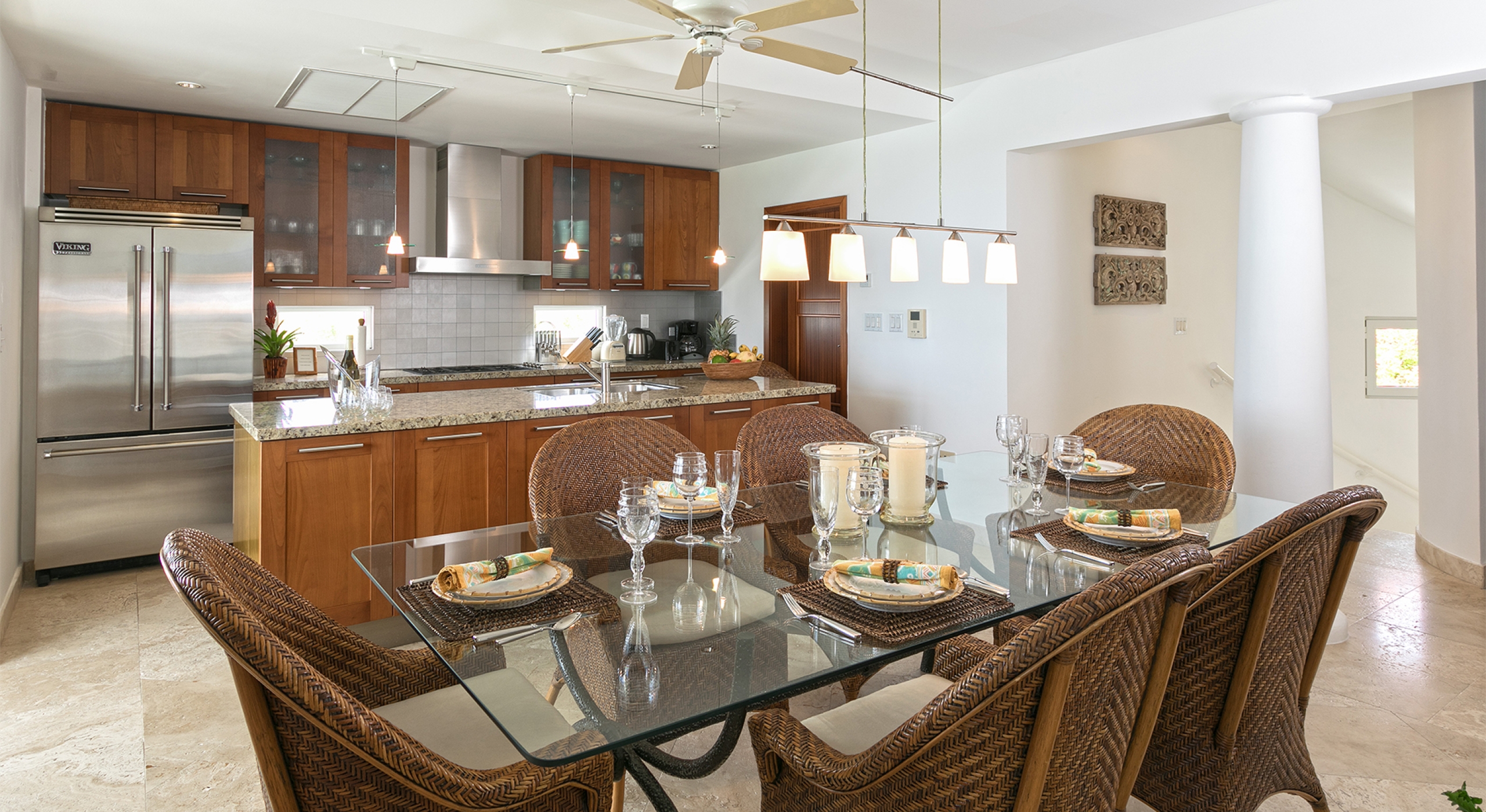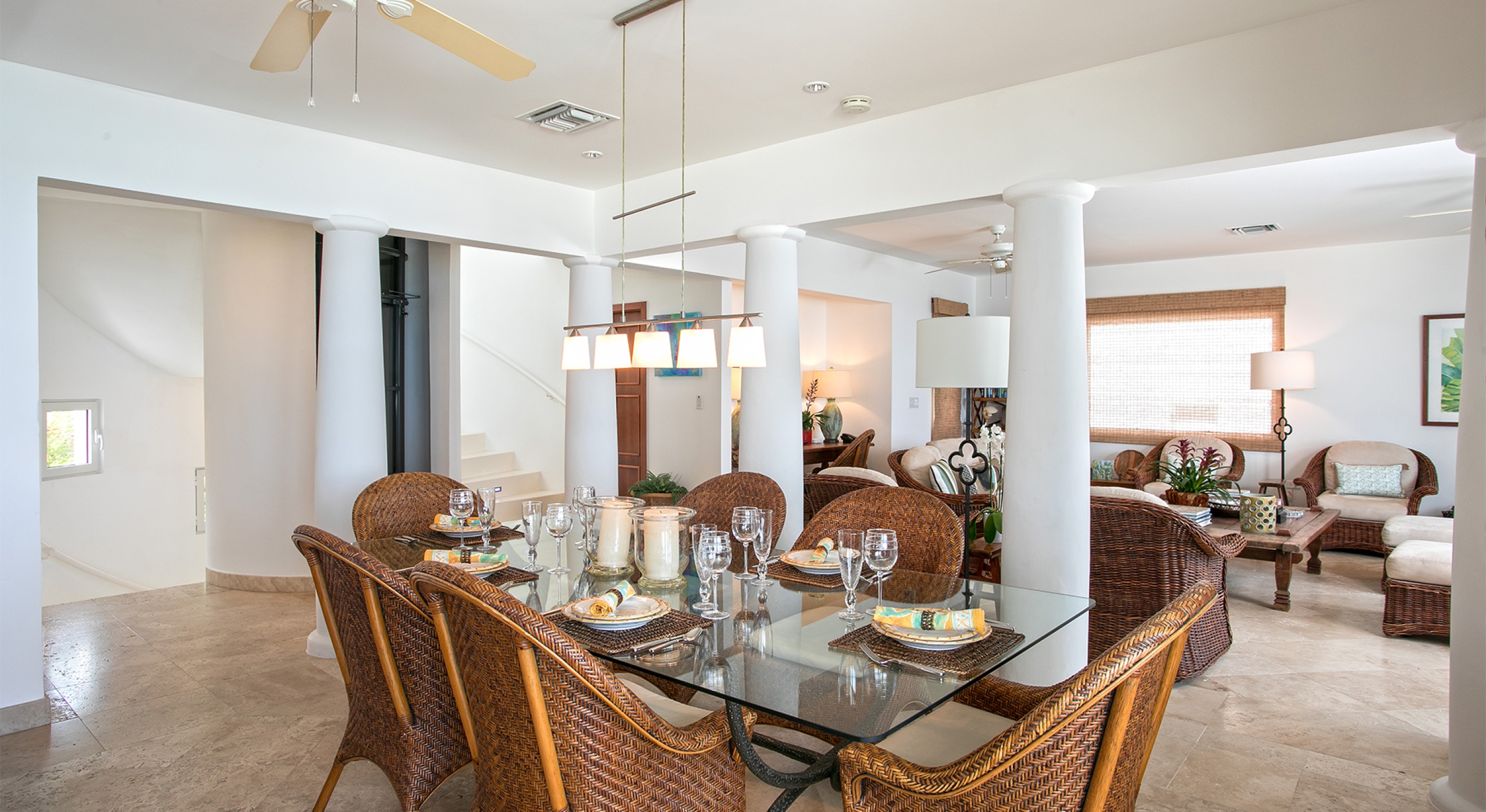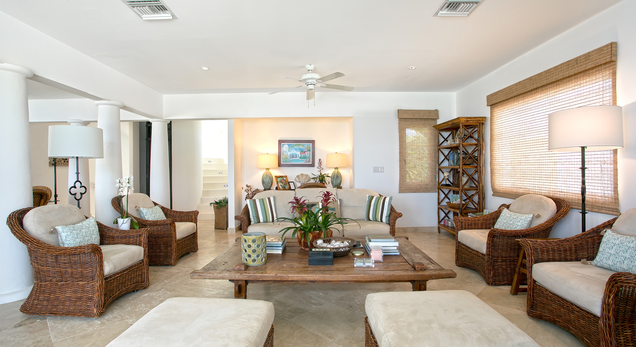 A large living space on the second floor features a comfortable lounge/dining area and open-plan kitchen with large glass-paneled wooden doors that open out to a furnished balcony and beautiful view of the ocean and the beach below. The pleasing decor of the living area features rattan and tropical wood furniture with travertine flooring and central white columns that partition the space to an adjacent dining area with seating for eight. The living room has a widescreenTV and the well equipped kitchen offers plenty of counter space with a central island and high quality stainless steel appliances.