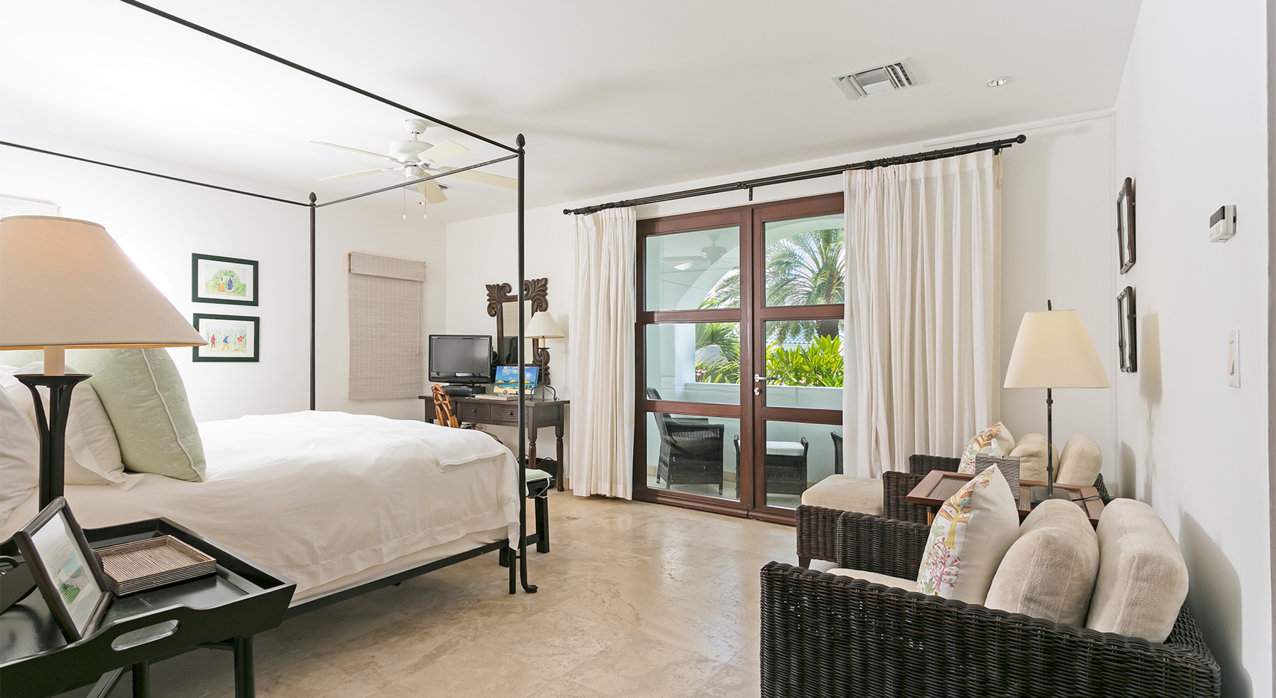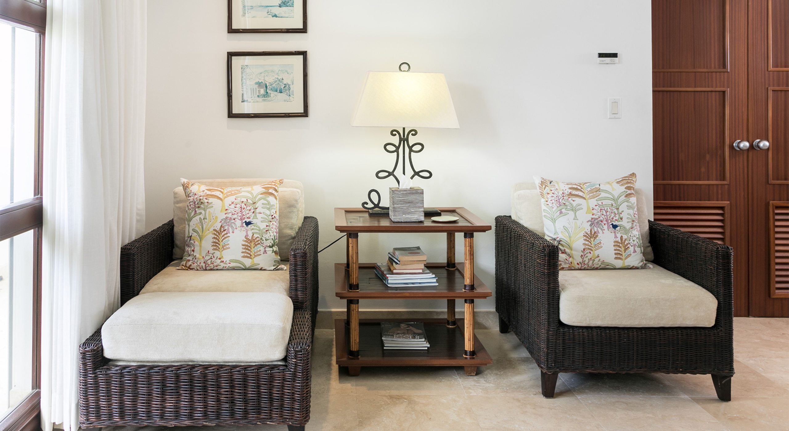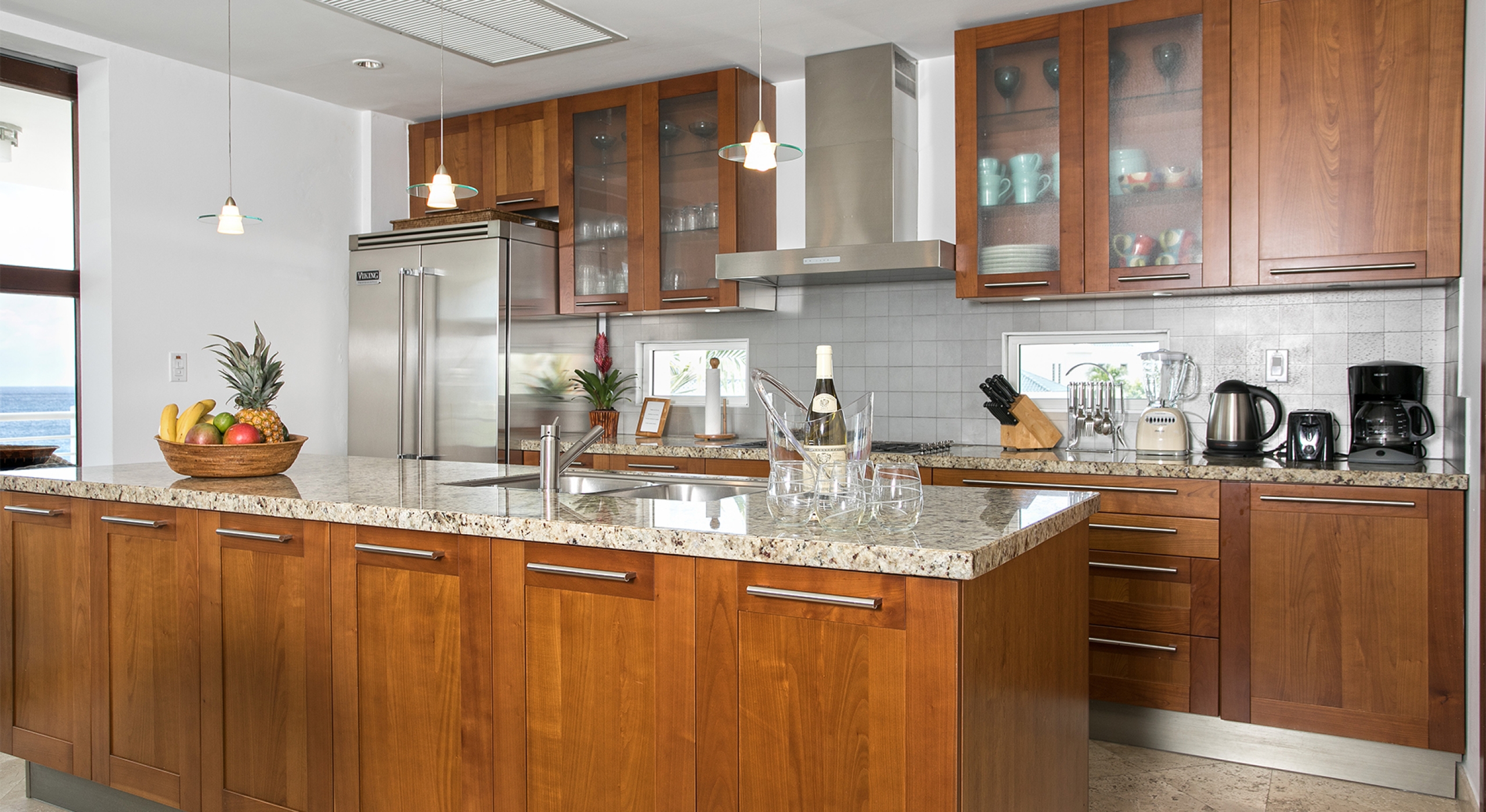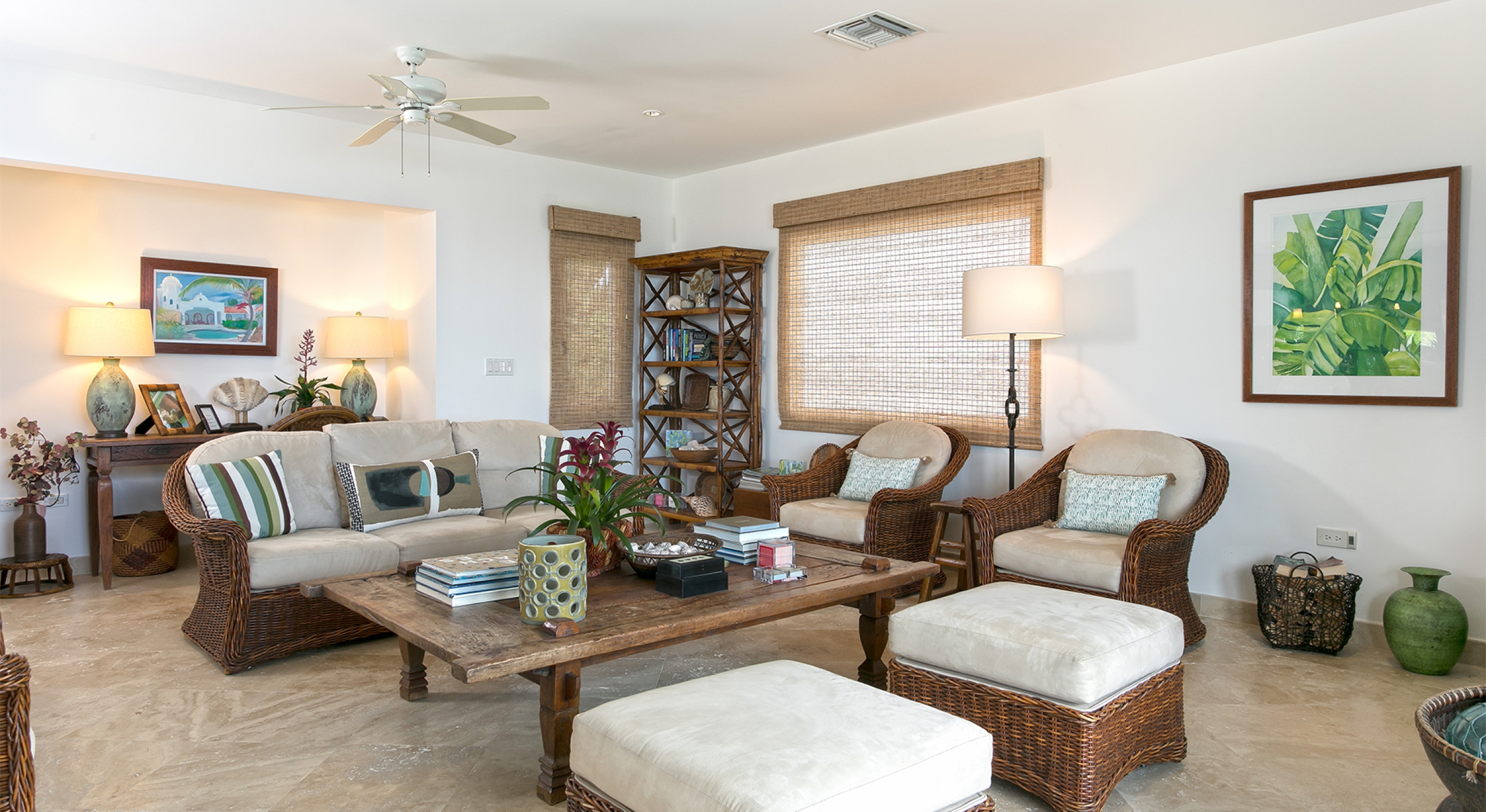 A large living space on the second floor features a comfortable lounge/dining area and open-plan kitchen with large glass-paneled wooden doors that open out to a furnished balcony and beautiful view of the ocean and the beach below. The pleasing decor of the living area features rattan and tropical wood furniture with travertine flooring and central white columns that partition the space to an adjacent dining area with seating for eight. The living room has a widescreenTV and the well equipped kitchen offers plenty of counter space with a central island and high quality stainless steel appliances.