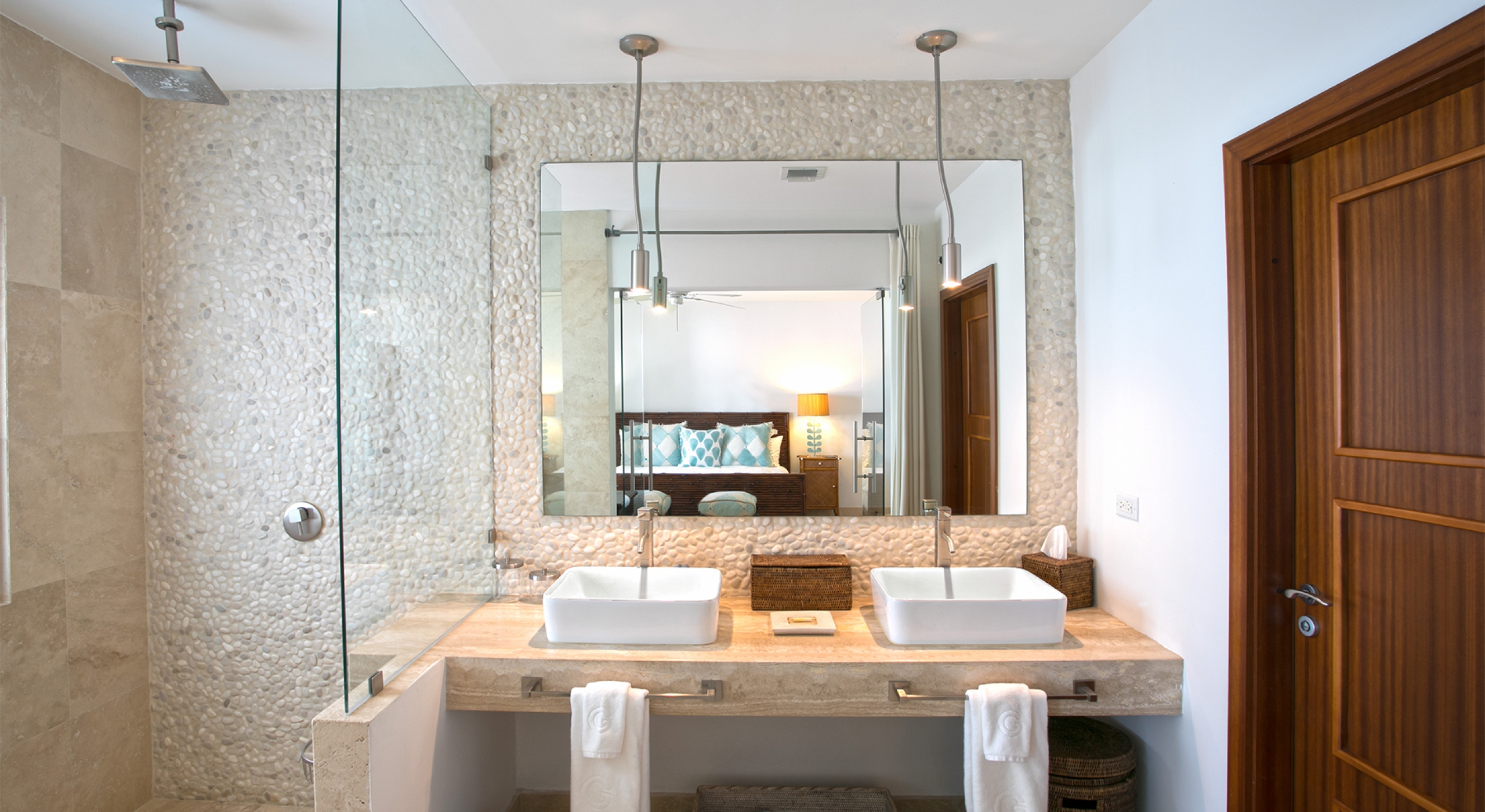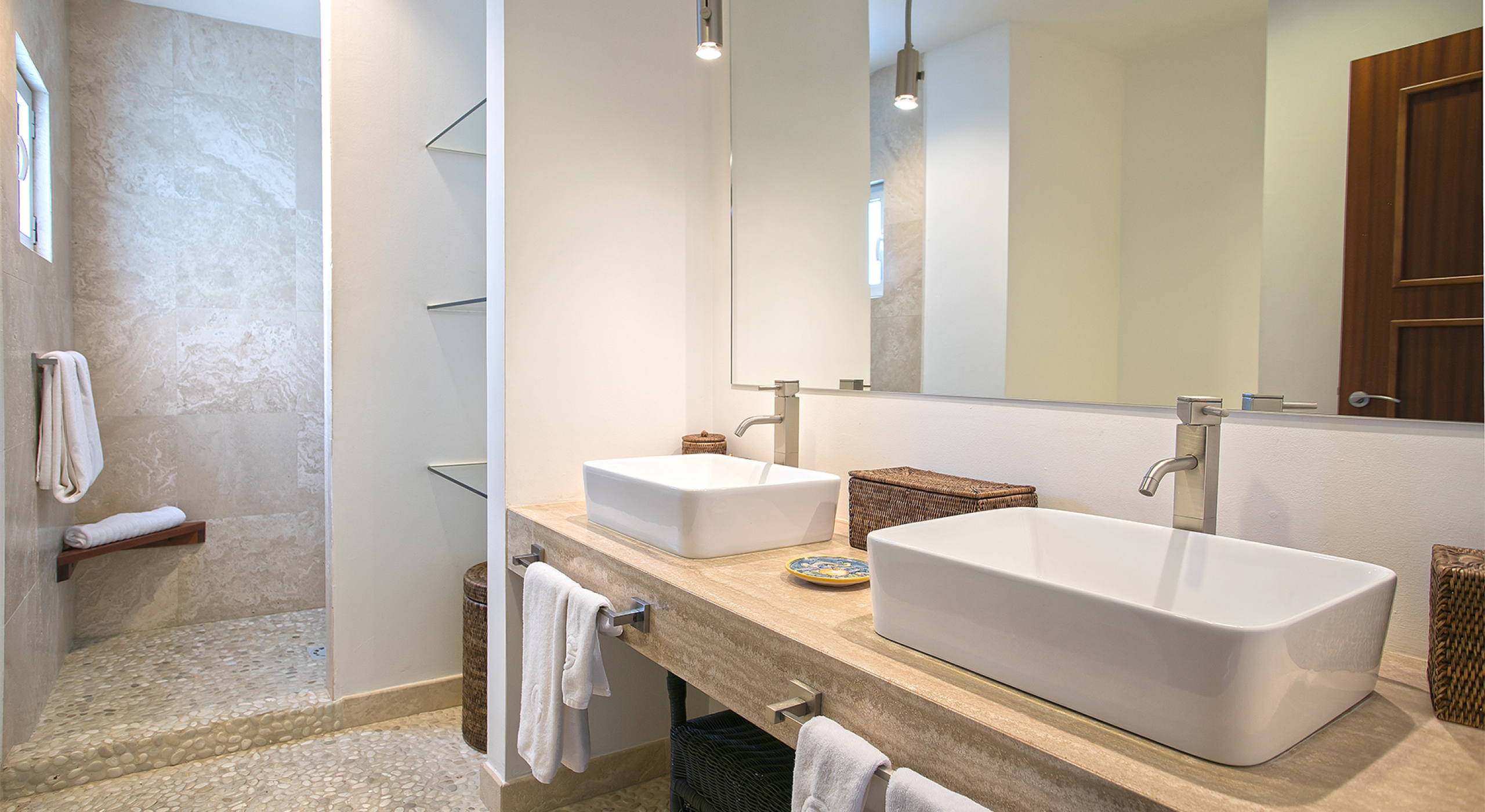 Each level of the fully air-conditioned, spacious interiors are connected by a central elevator and curved stairway. The ground floor entrance level houses the plus one bedroom area, equipped with two single day beds and an ensuite bathroom with soaking tub. The stairway and elevator take you up to the first floor and two further king size bedrooms with balconies overlooking the ocean and private bathrooms with attractive pebble flooring, double vanities and large open showers.