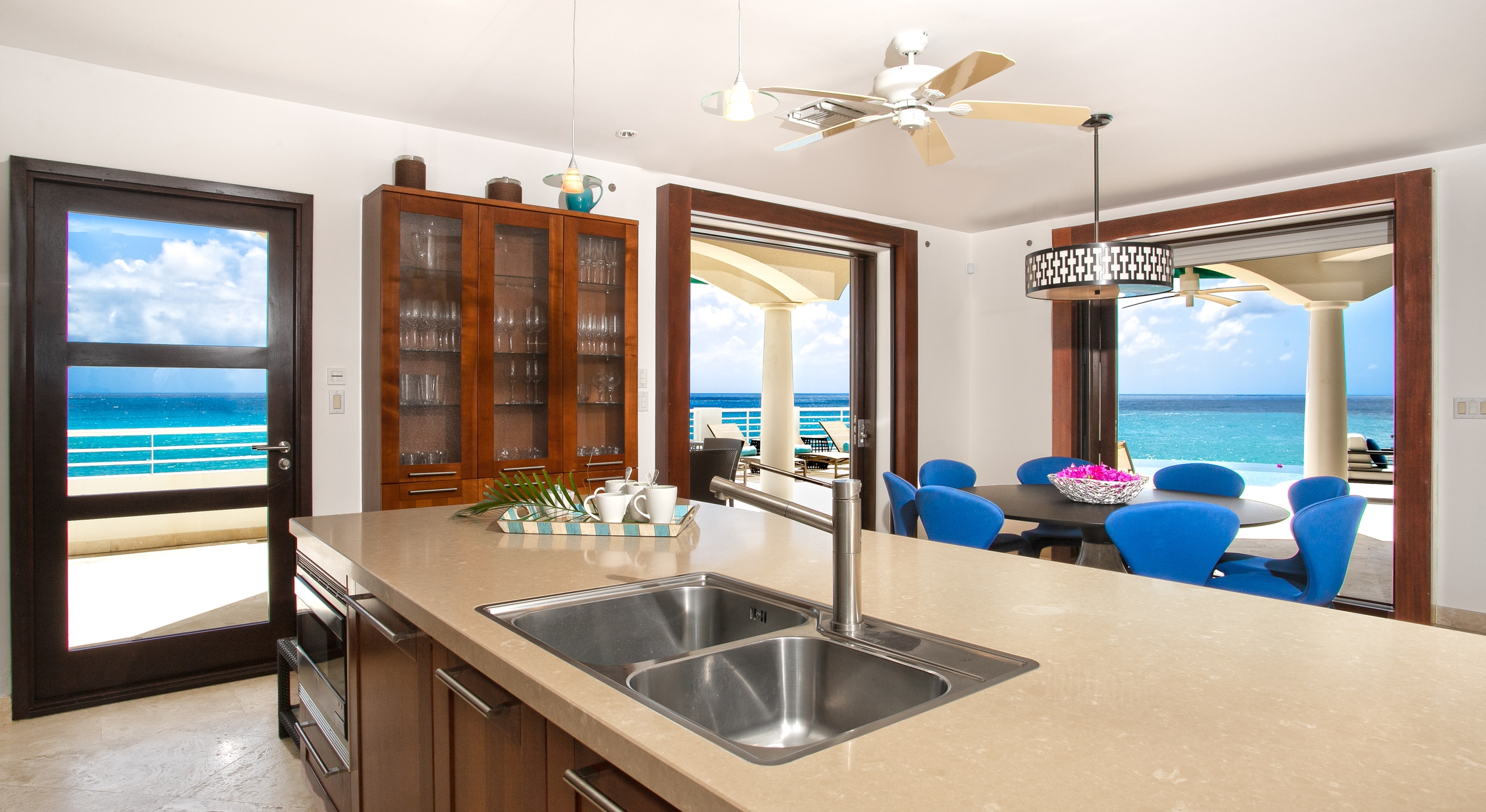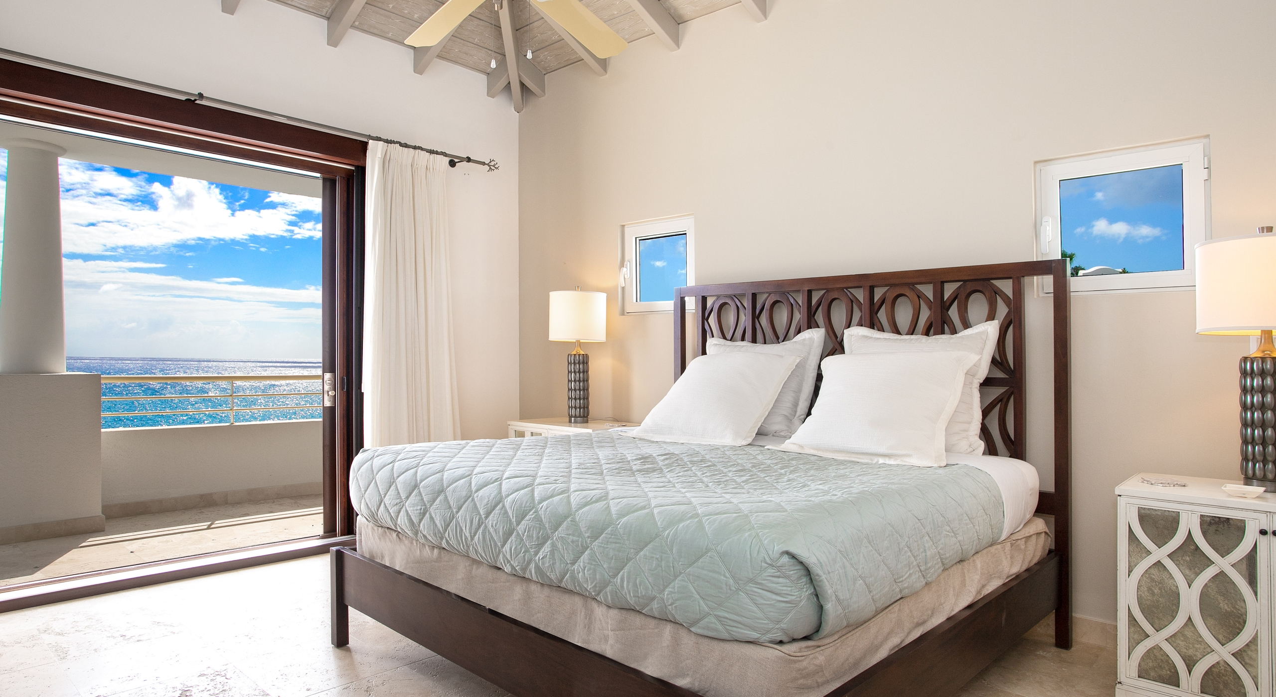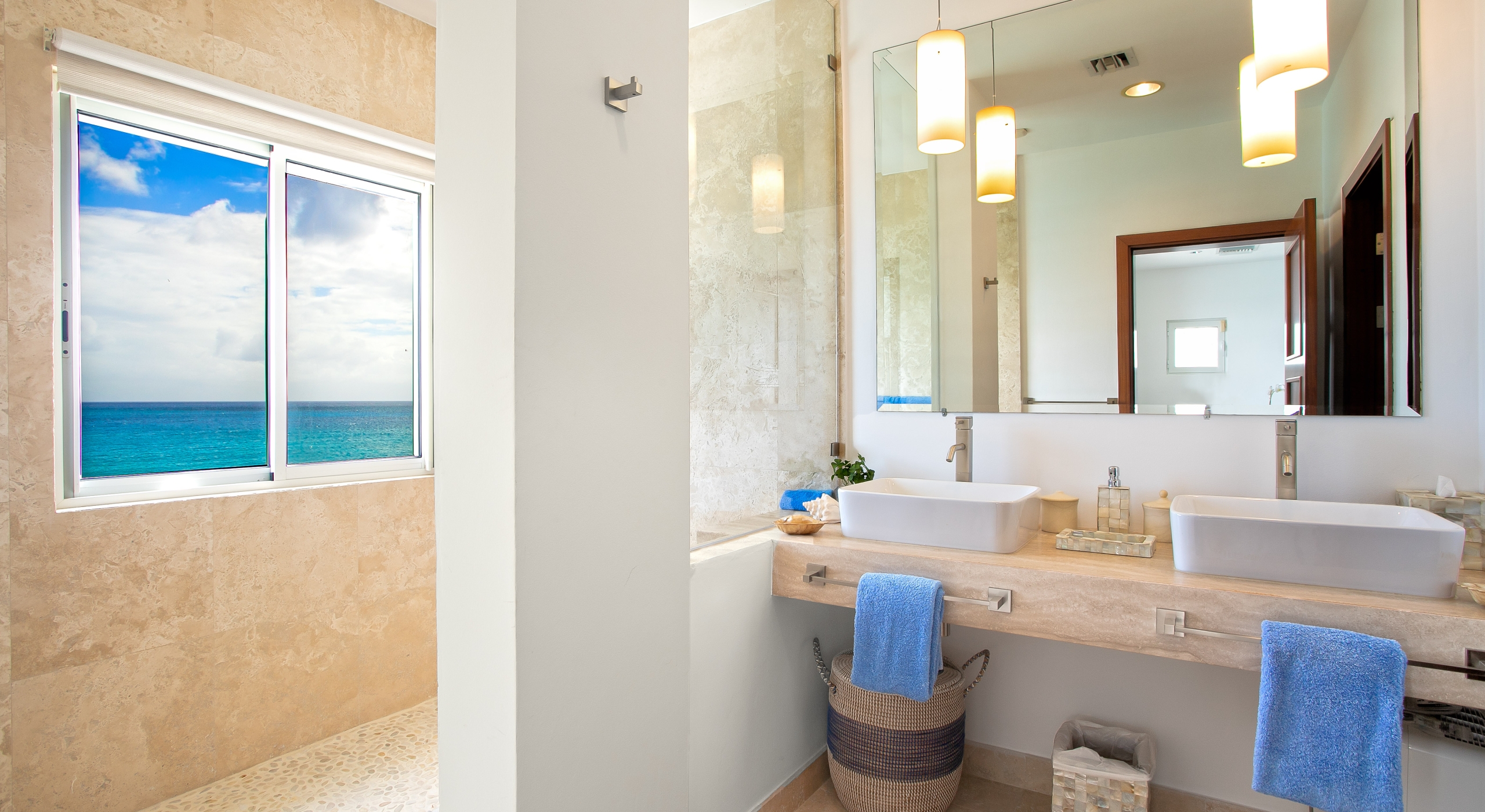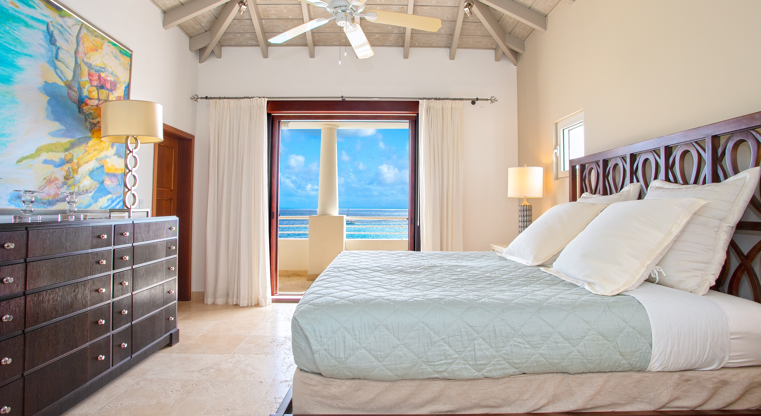 Descending to the lower level, you’ll step into the heart of the villa - a spacious indoor living area that flows effortlessly into the dining space and a sleek, fully equipped kitchen. The stunning ocean panorama immediately draws you outside, where a covered dining area, sun-drenched lounge space, and an infinity-edge pool await. Take a refreshing dip or unwind at the unique in-pool round seating area, all while basking in the endless views of the Caribbean Sea. To stay cool, outdoor fans provide a gentle breeze, though the natural ocean winds keep the villa perfectly comfortable year-round. Also on this level is Bedroom 4, complete with a walk-in closet and ensuite bathroom.