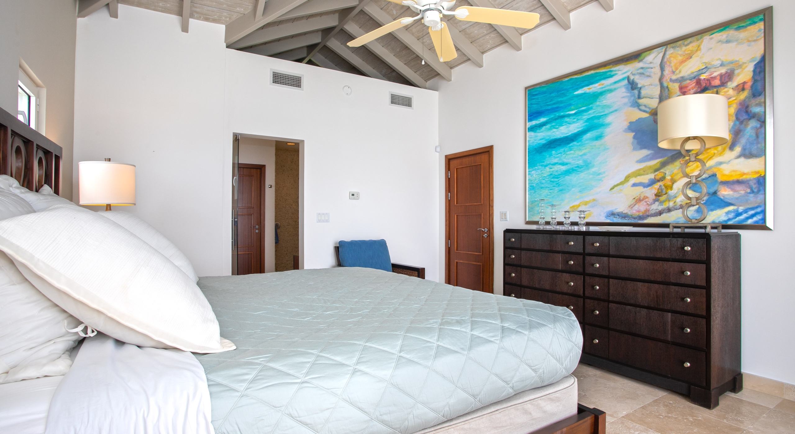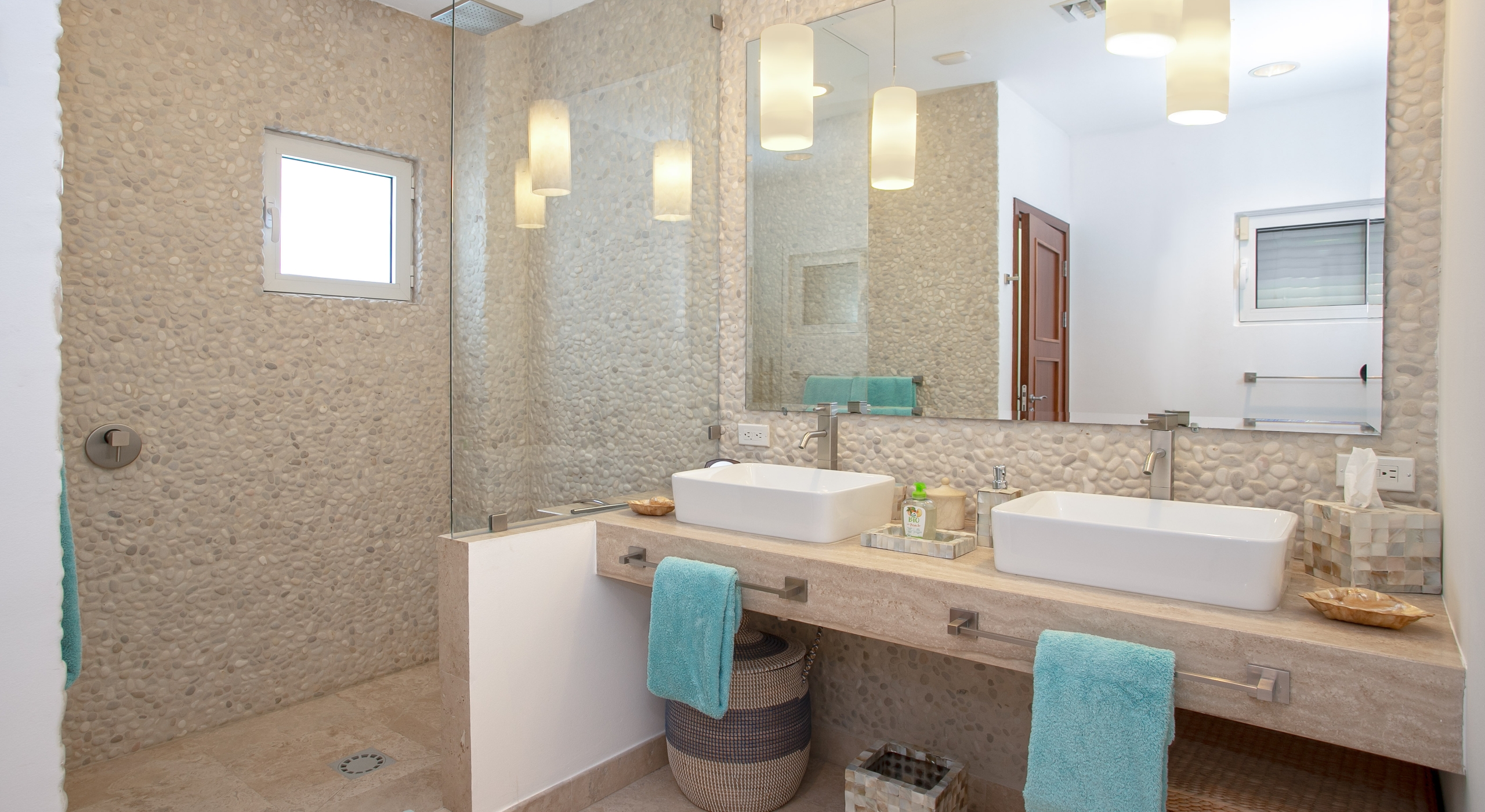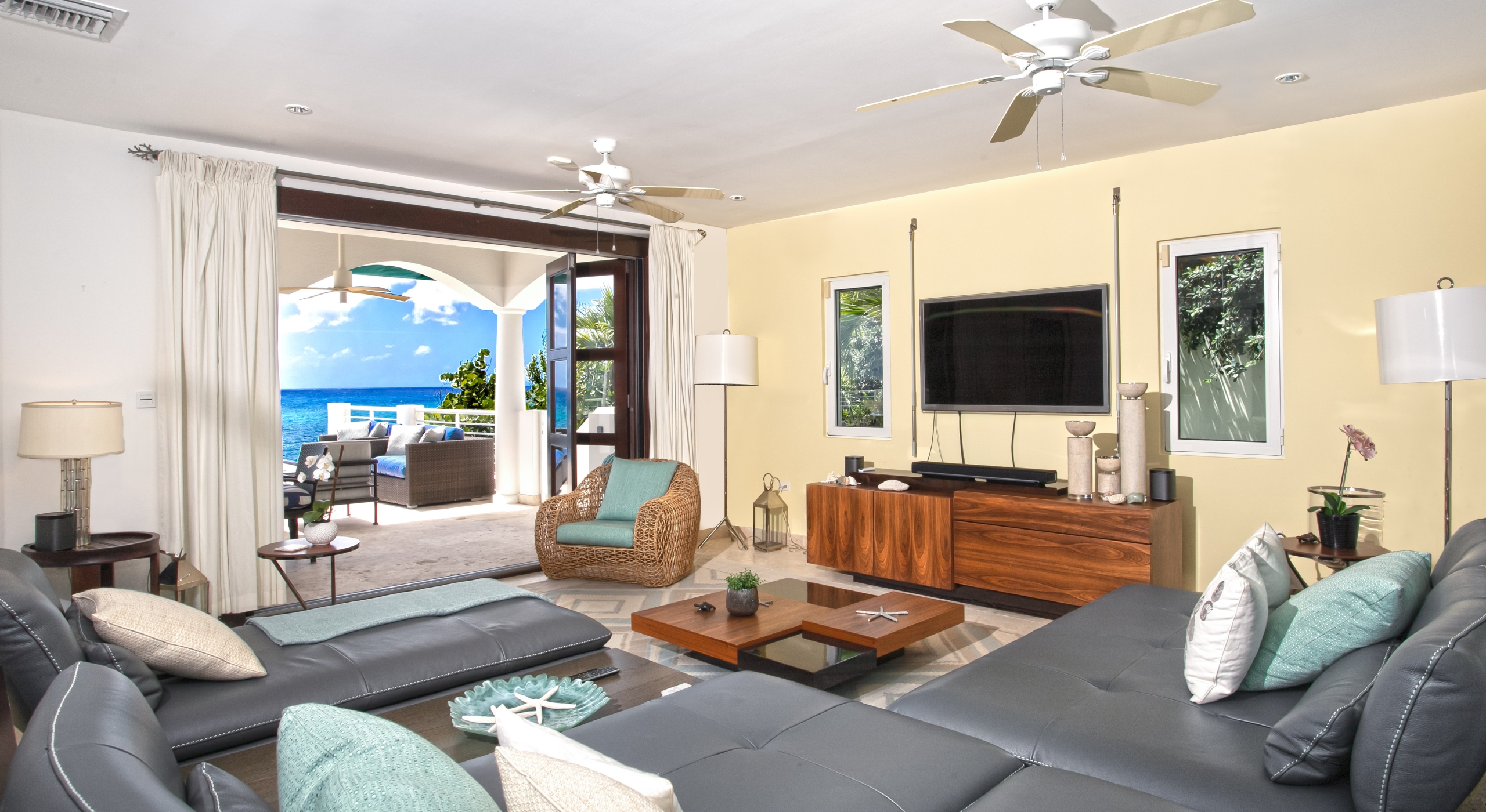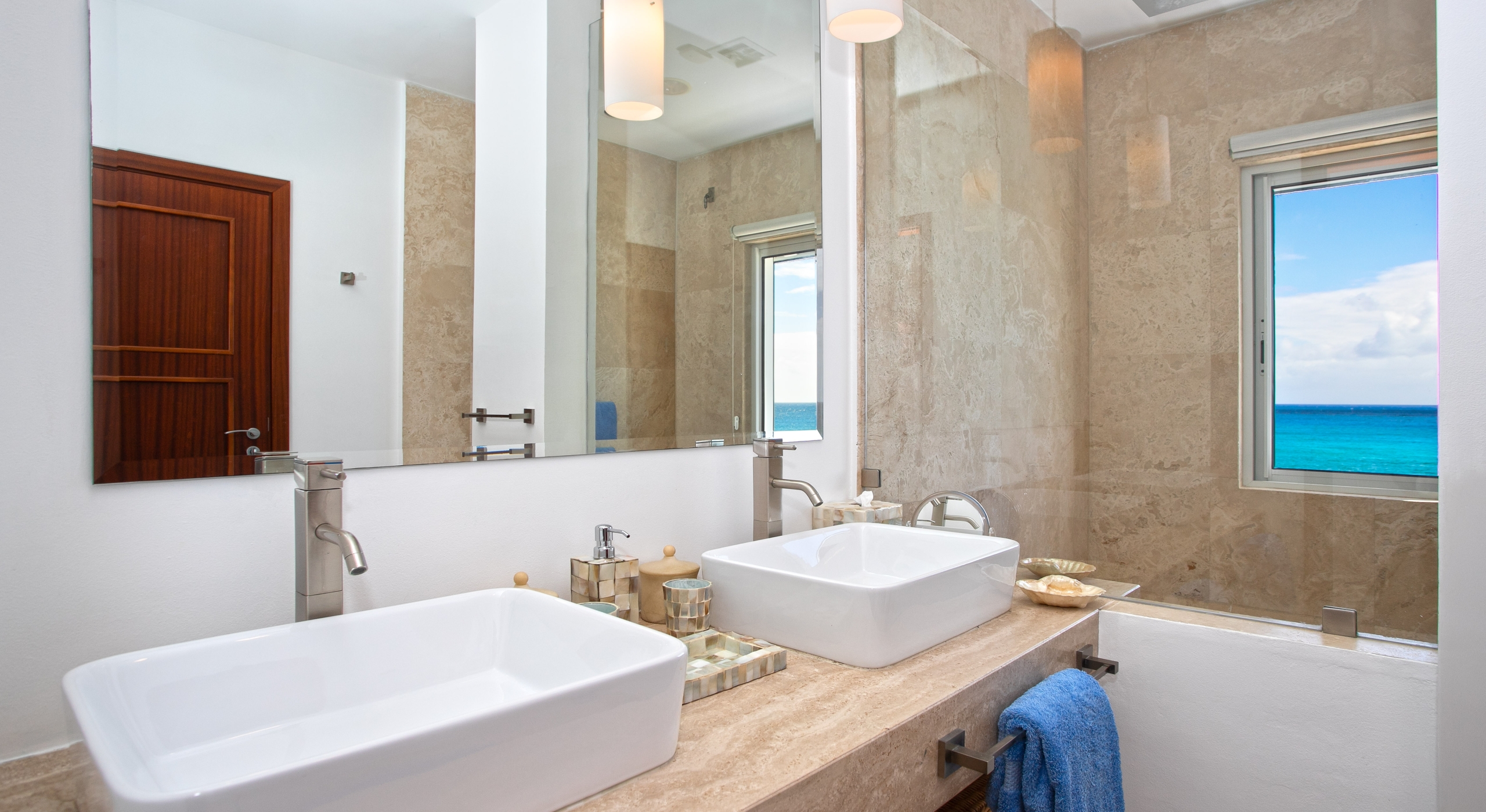 Descending to the lower level, you’ll step into the heart of the villa - a spacious indoor living area that flows effortlessly into the dining space and a sleek, fully equipped kitchen. The stunning ocean panorama immediately draws you outside, where a covered dining area, sun-drenched lounge space, and an infinity-edge pool await. Take a refreshing dip or unwind at the unique in-pool round seating area, all while basking in the endless views of the Caribbean Sea. To stay cool, outdoor fans provide a gentle breeze, though the natural ocean winds keep the villa perfectly comfortable year-round. Also on this level is Bedroom 4, complete with a walk-in closet and ensuite bathroom.