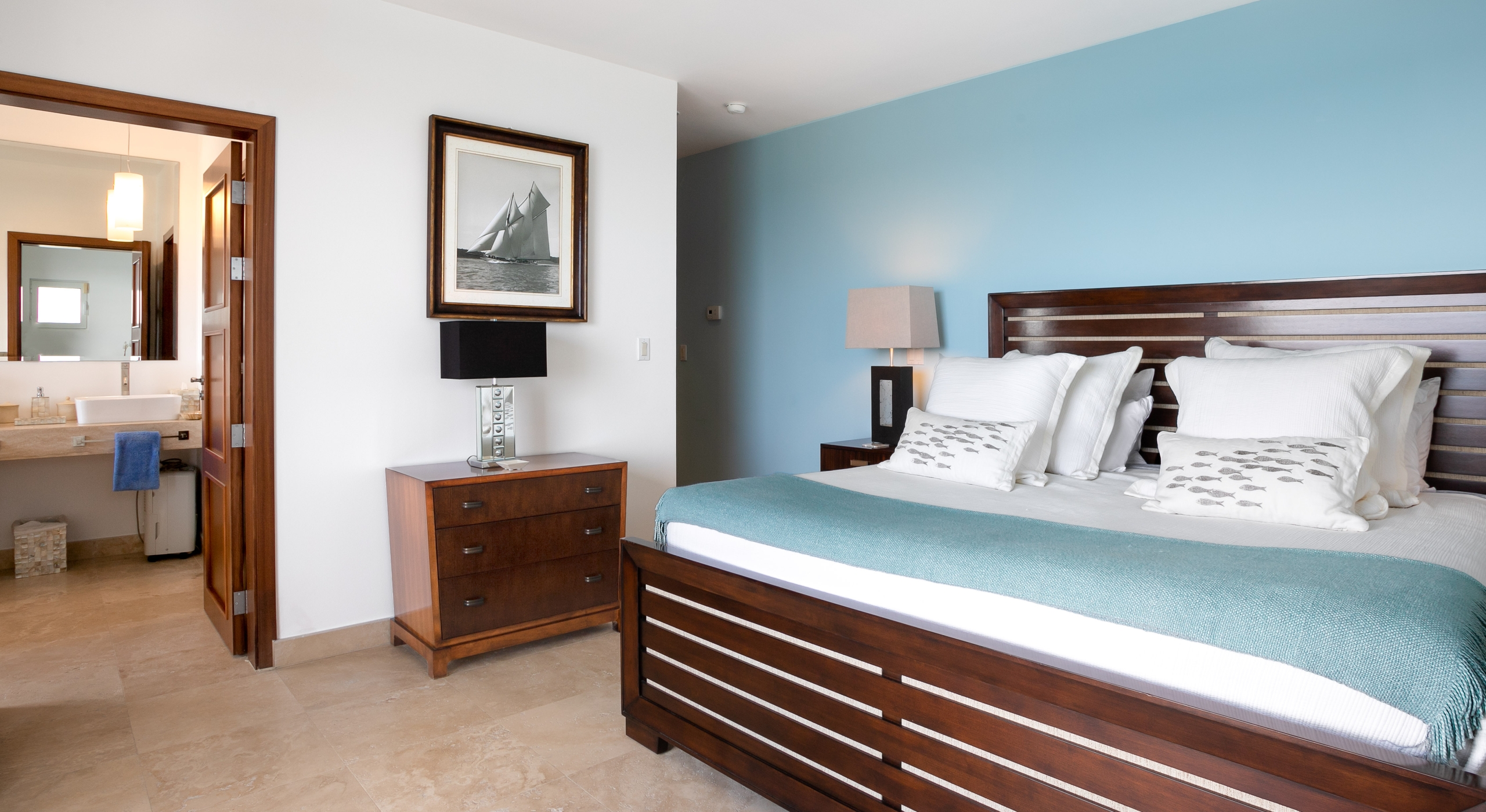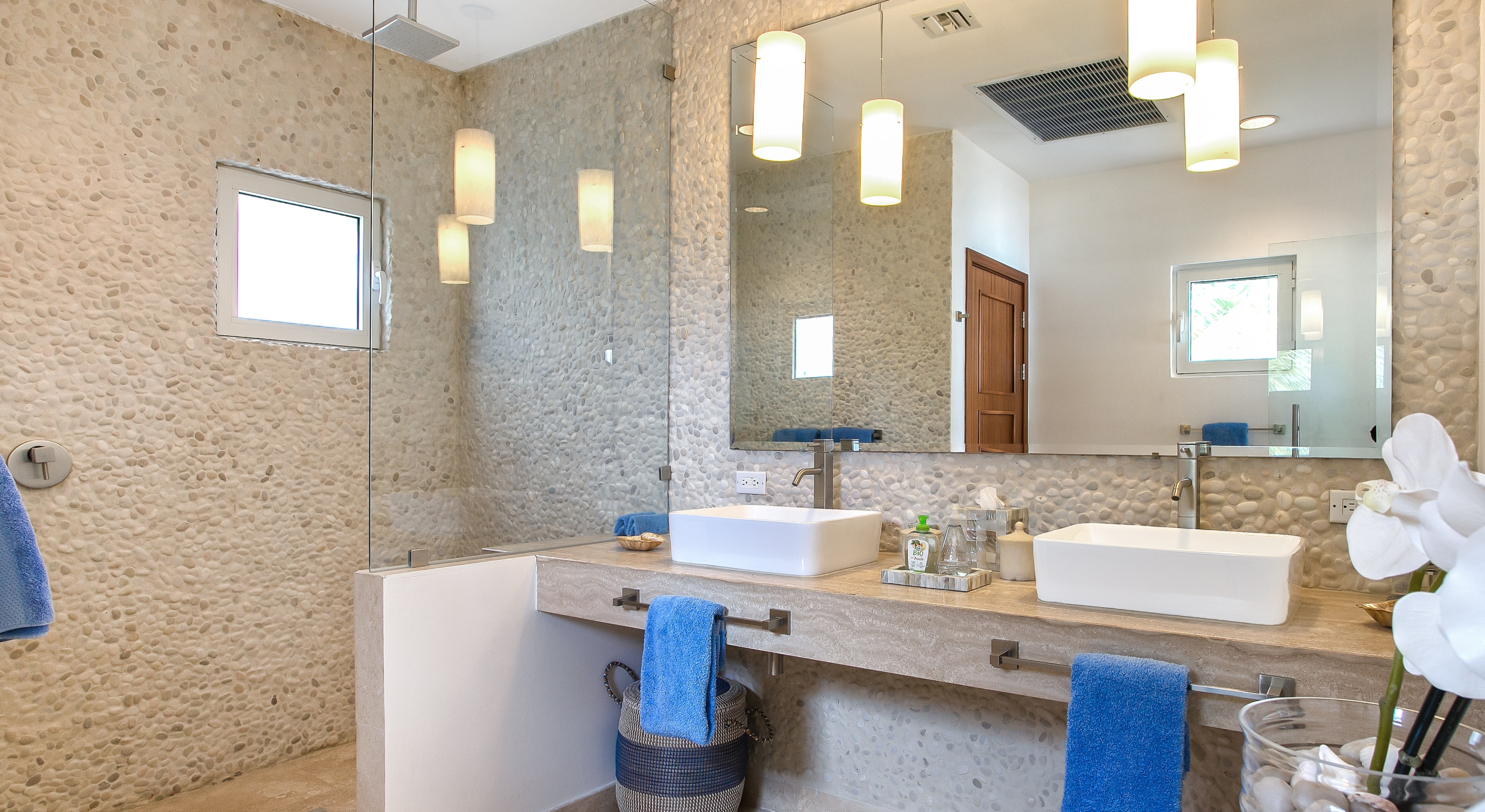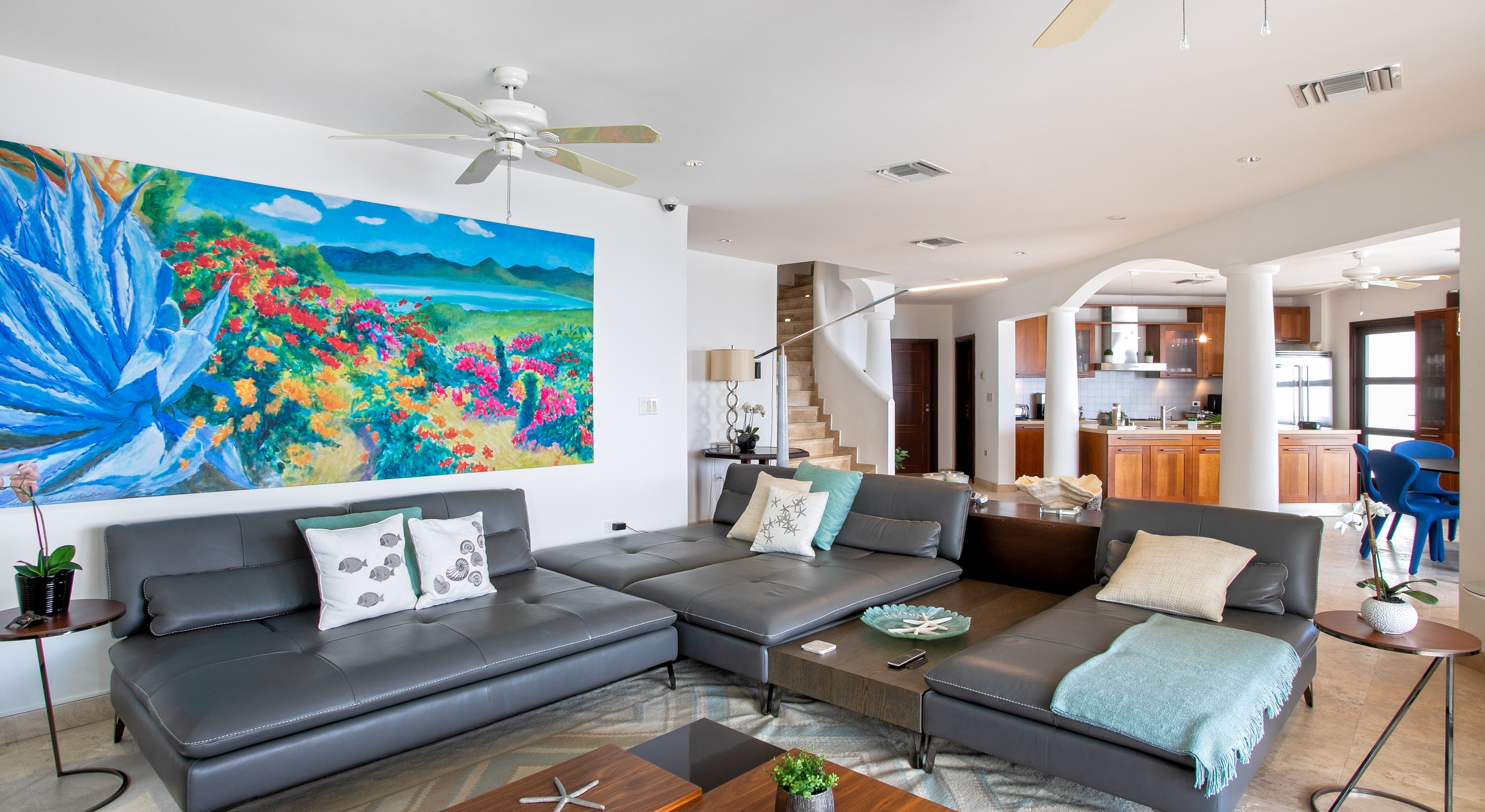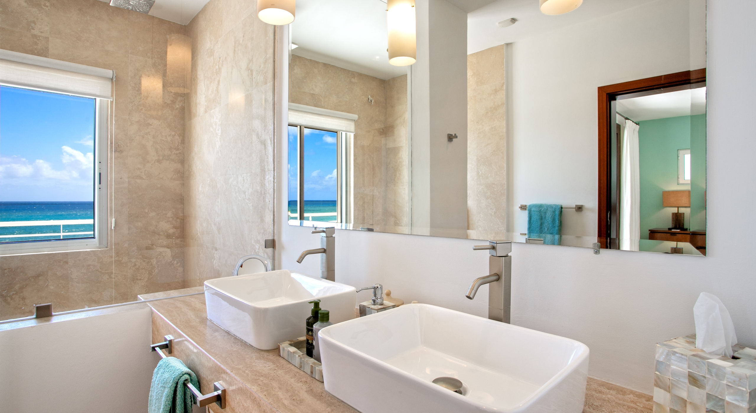 Descending to the lower level, you’ll step into the heart of the villa - a spacious indoor living area that flows effortlessly into the dining space and a sleek, fully equipped kitchen. The stunning ocean panorama immediately draws you outside, where a covered dining area, sun-drenched lounge space, and an infinity-edge pool await. Take a refreshing dip or unwind at the unique in-pool round seating area, all while basking in the endless views of the Caribbean Sea. To stay cool, outdoor fans provide a gentle breeze, though the natural ocean winds keep the villa perfectly comfortable year-round. Also on this level is Bedroom 4, complete with a walk-in closet and ensuite bathroom.