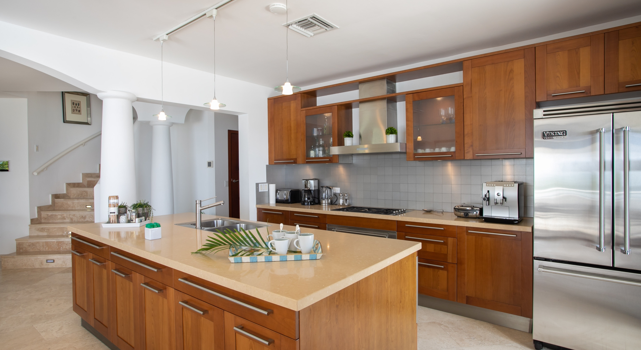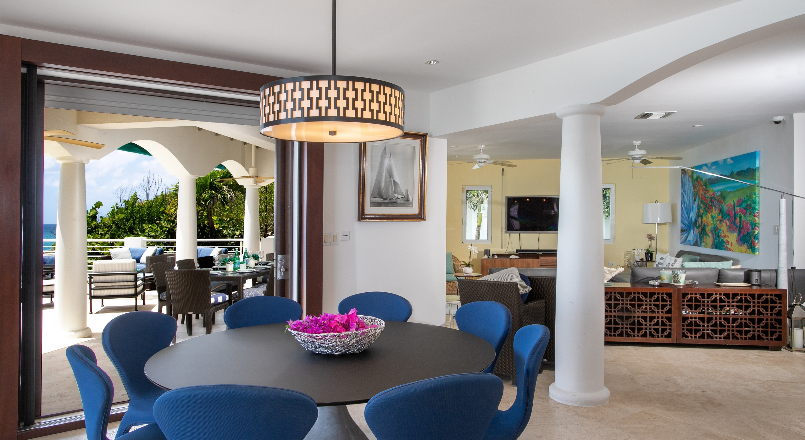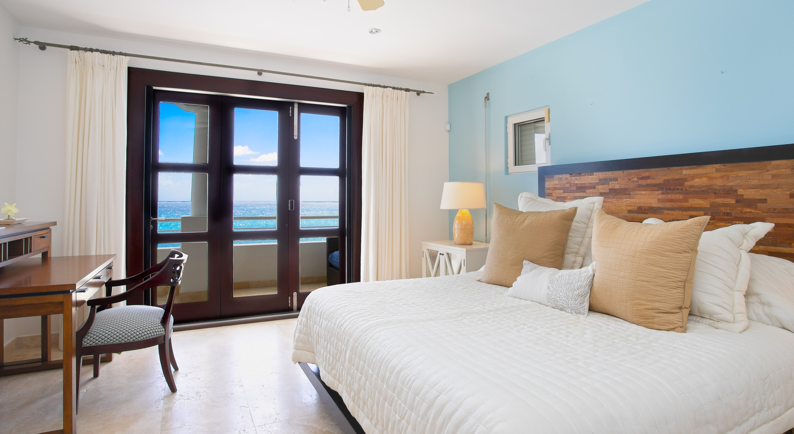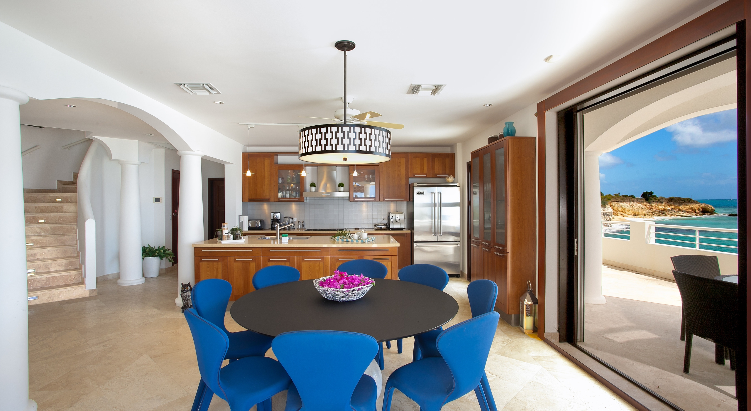 Descending to the lower level, you’ll step into the heart of the villa - a spacious indoor living area that flows effortlessly into the dining space and a sleek, fully equipped kitchen. The stunning ocean panorama immediately draws you outside, where a covered dining area, sun-drenched lounge space, and an infinity-edge pool await. Take a refreshing dip or unwind at the unique in-pool round seating area, all while basking in the endless views of the Caribbean Sea. To stay cool, outdoor fans provide a gentle breeze, though the natural ocean winds keep the villa perfectly comfortable year-round. Also on this level is Bedroom 4, complete with a walk-in closet and ensuite bathroom.