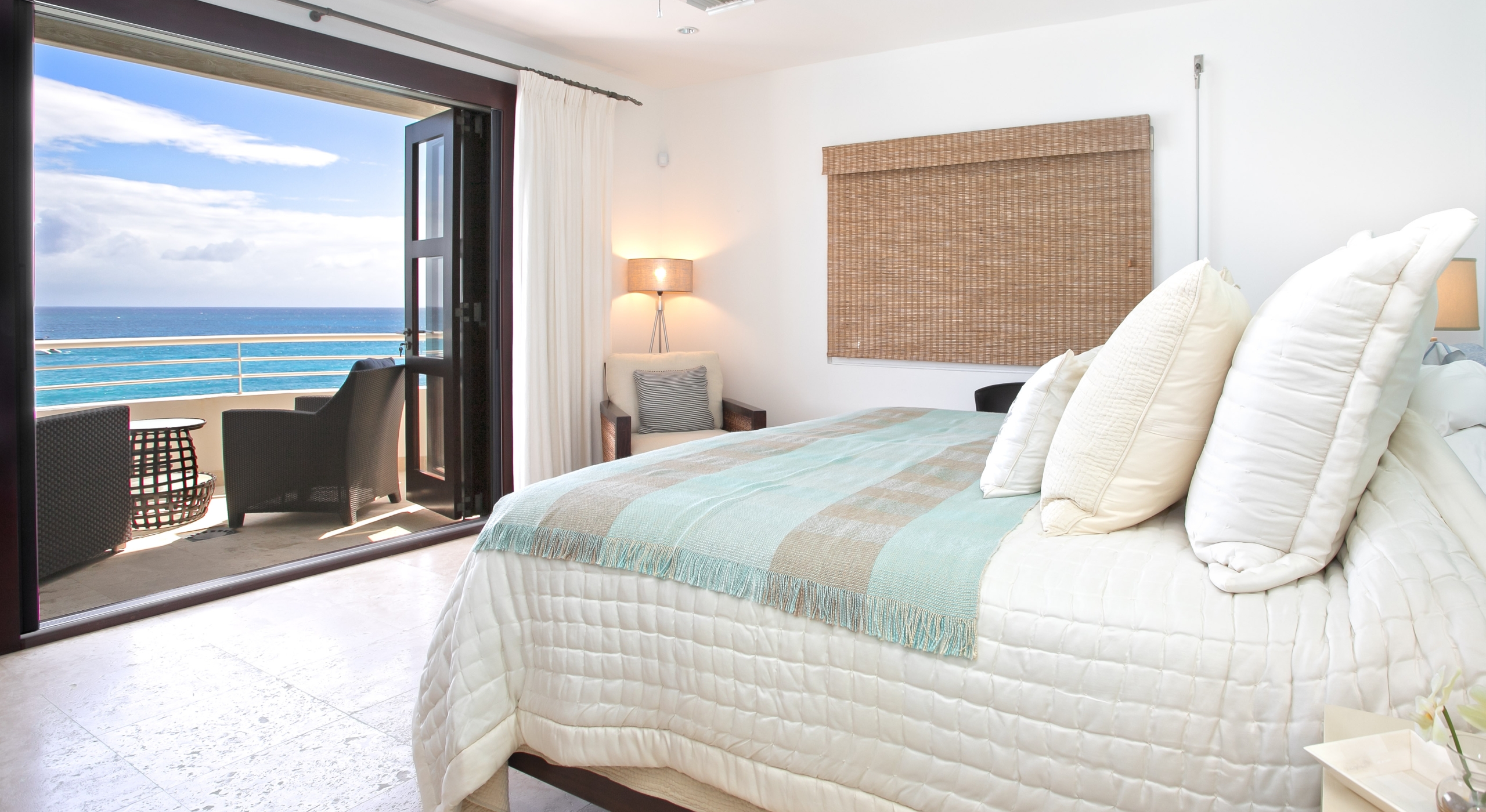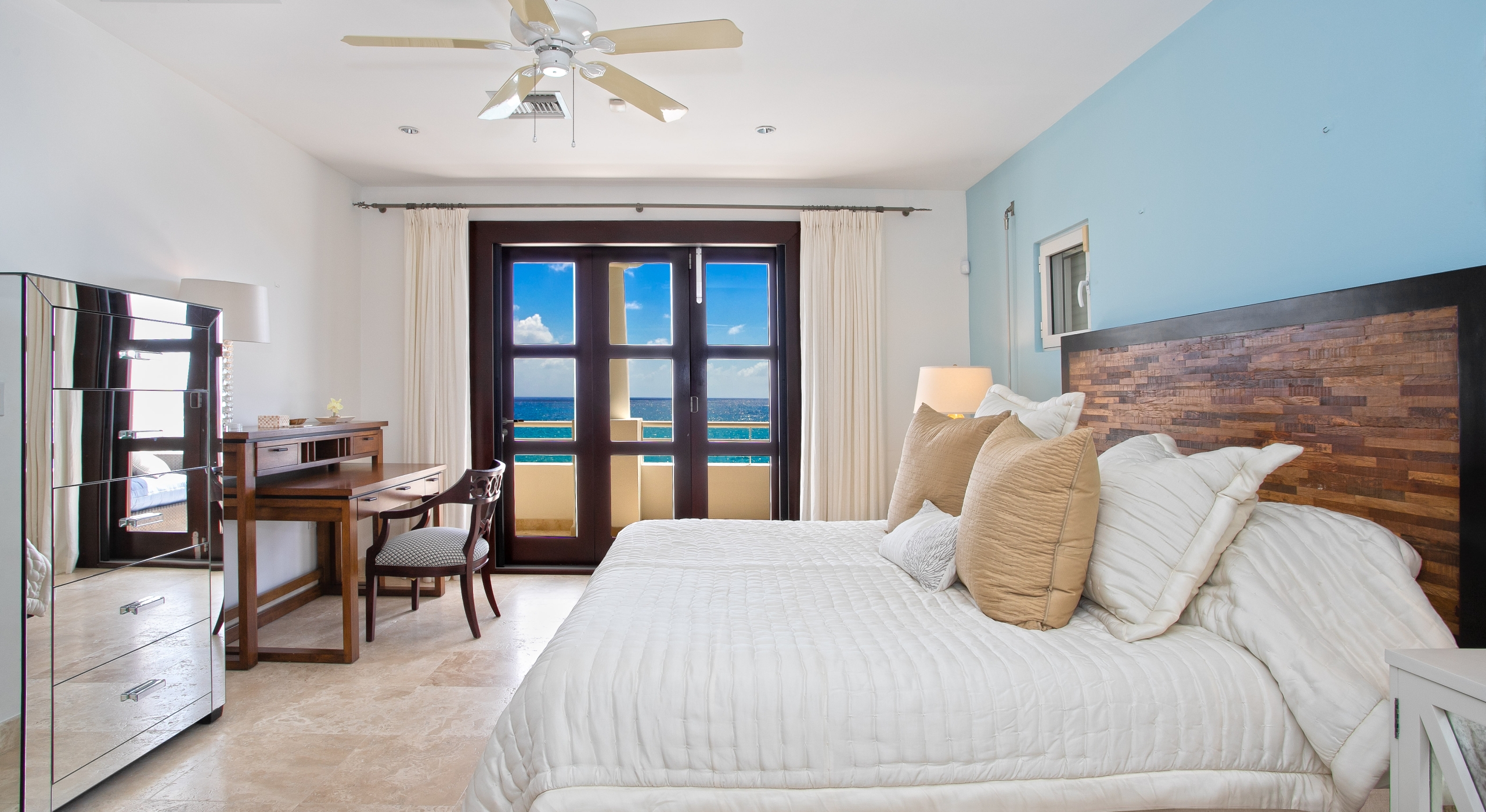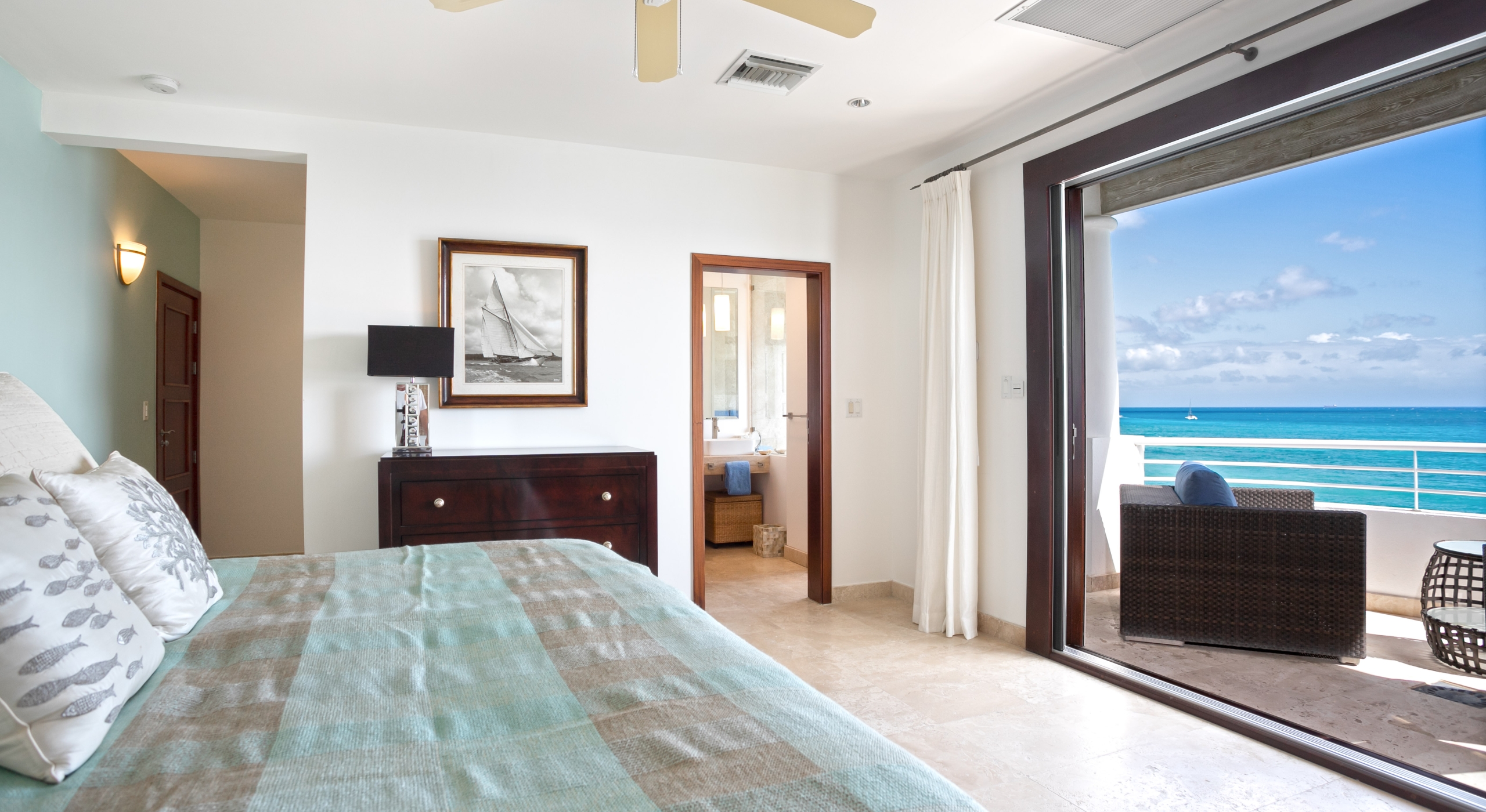 The uppermost level is home to Bedroom 5, a secluded sanctuary with a walk-in closet, ensuite bathroom, and an expansive private terrace. Furnished with four lounge chairs and seating, this private retreat offers an extraordinary vantage point for admiring the turquoise waters stretching to the horizon. On this level there is also an office space for those that need a peaceful thinking space.