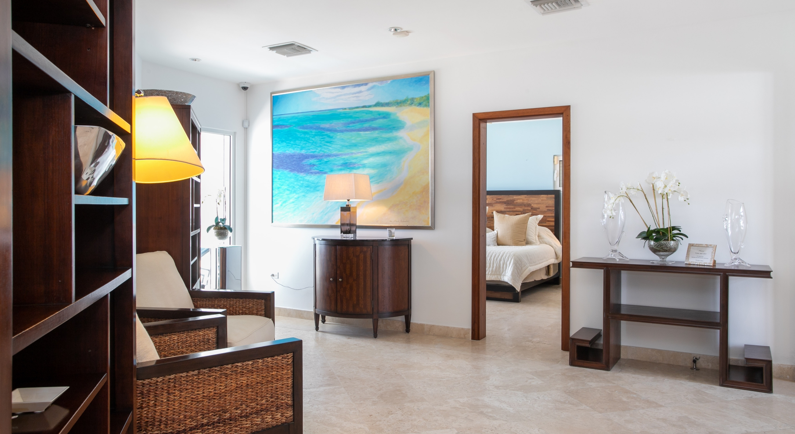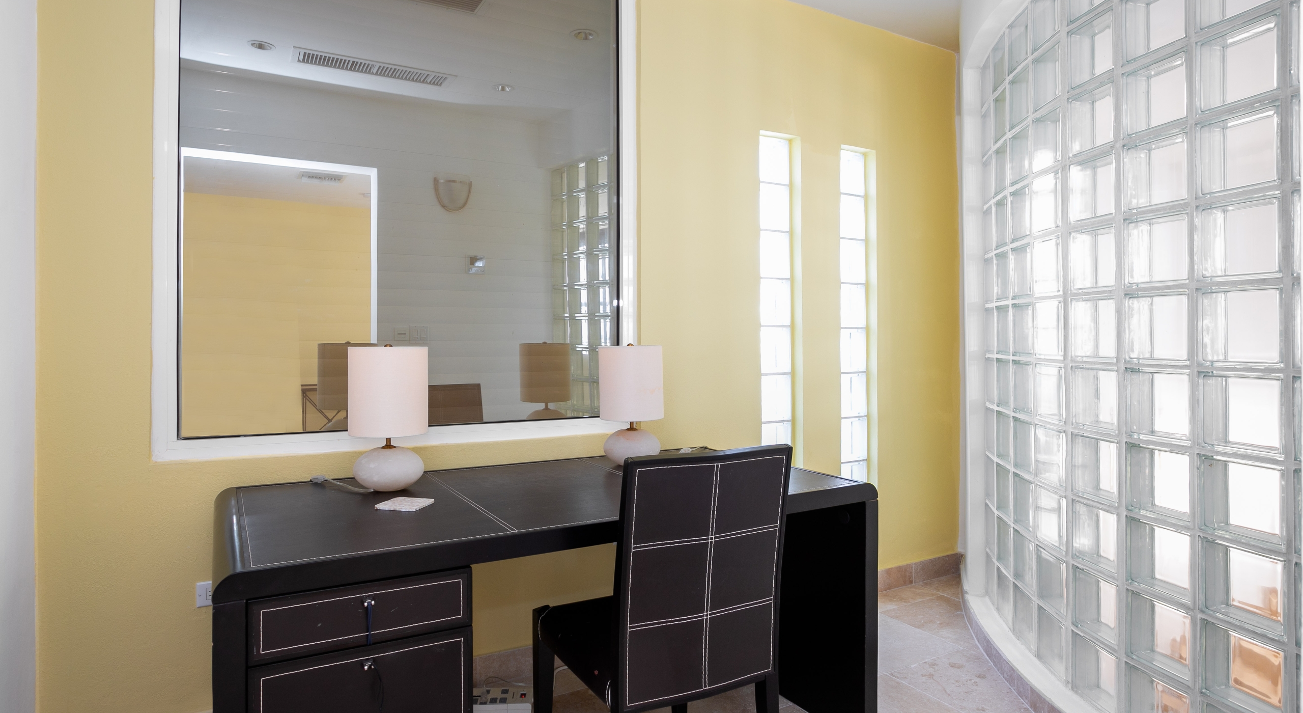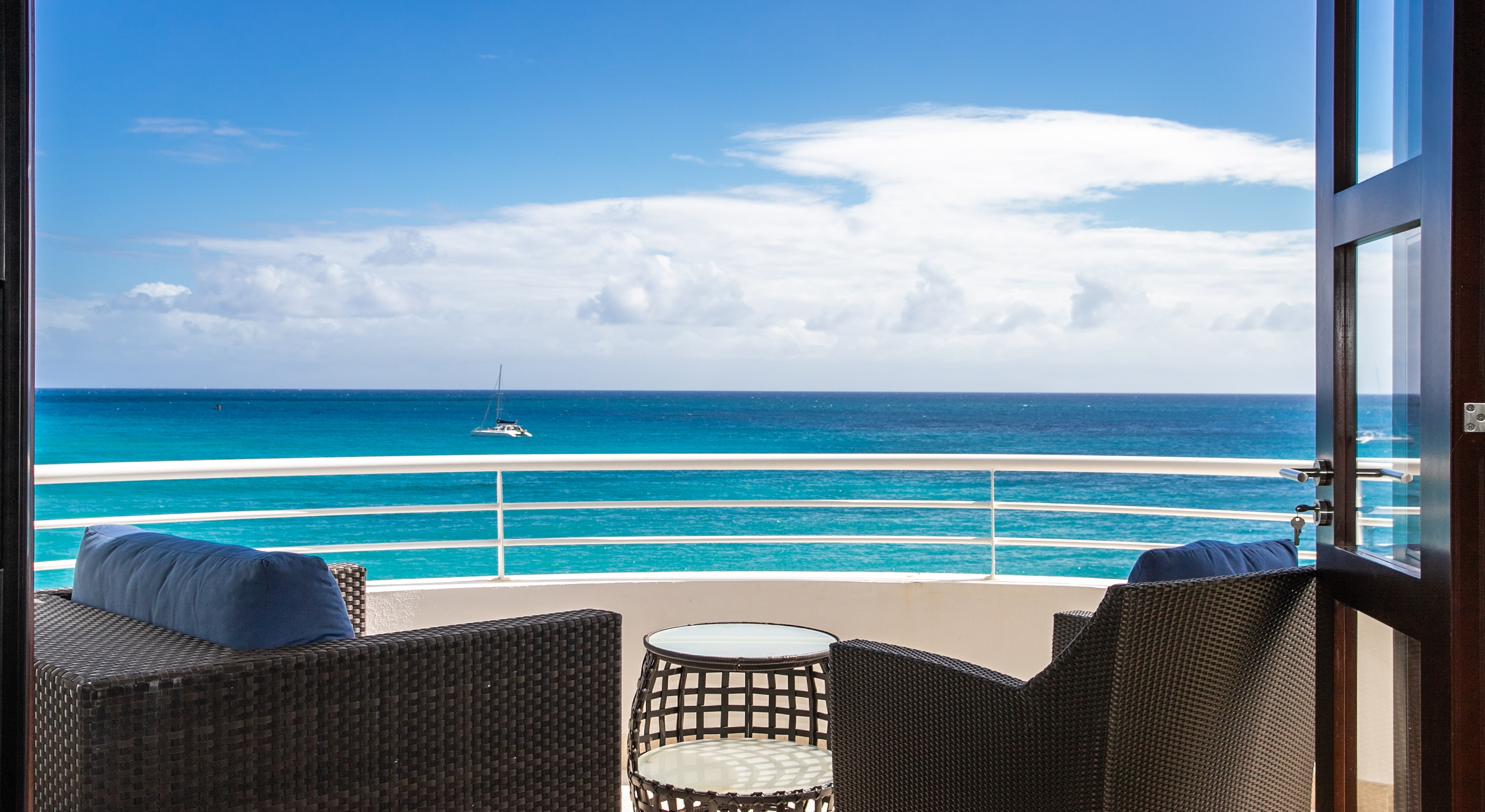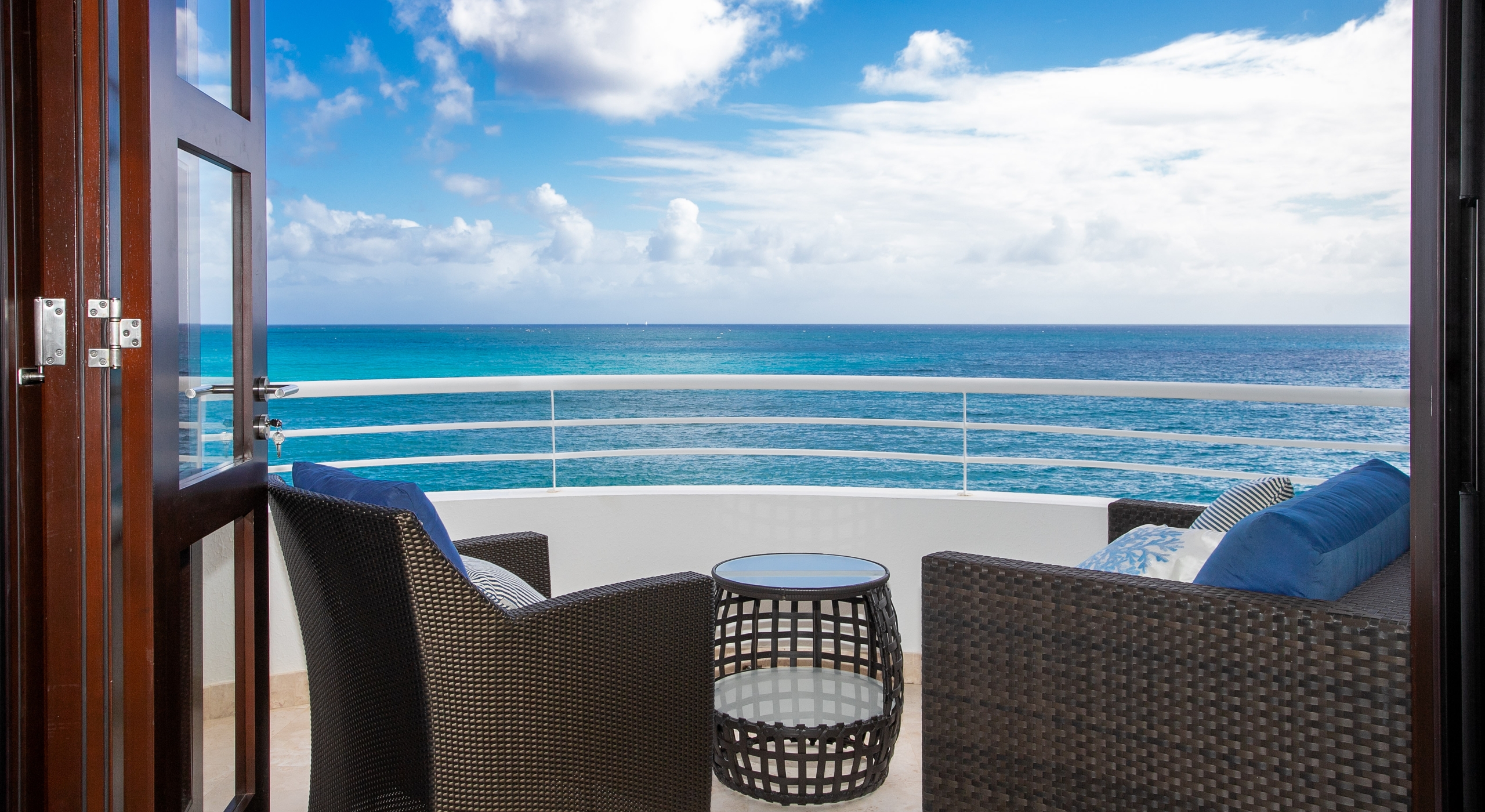 The uppermost level is home to Bedroom 5, a secluded sanctuary with a walk-in closet, ensuite bathroom, and an expansive private terrace. Furnished with four lounge chairs and seating, this private retreat offers an extraordinary vantage point for admiring the turquoise waters stretching to the horizon. On this level there is also an office space for those that need a peaceful thinking space.