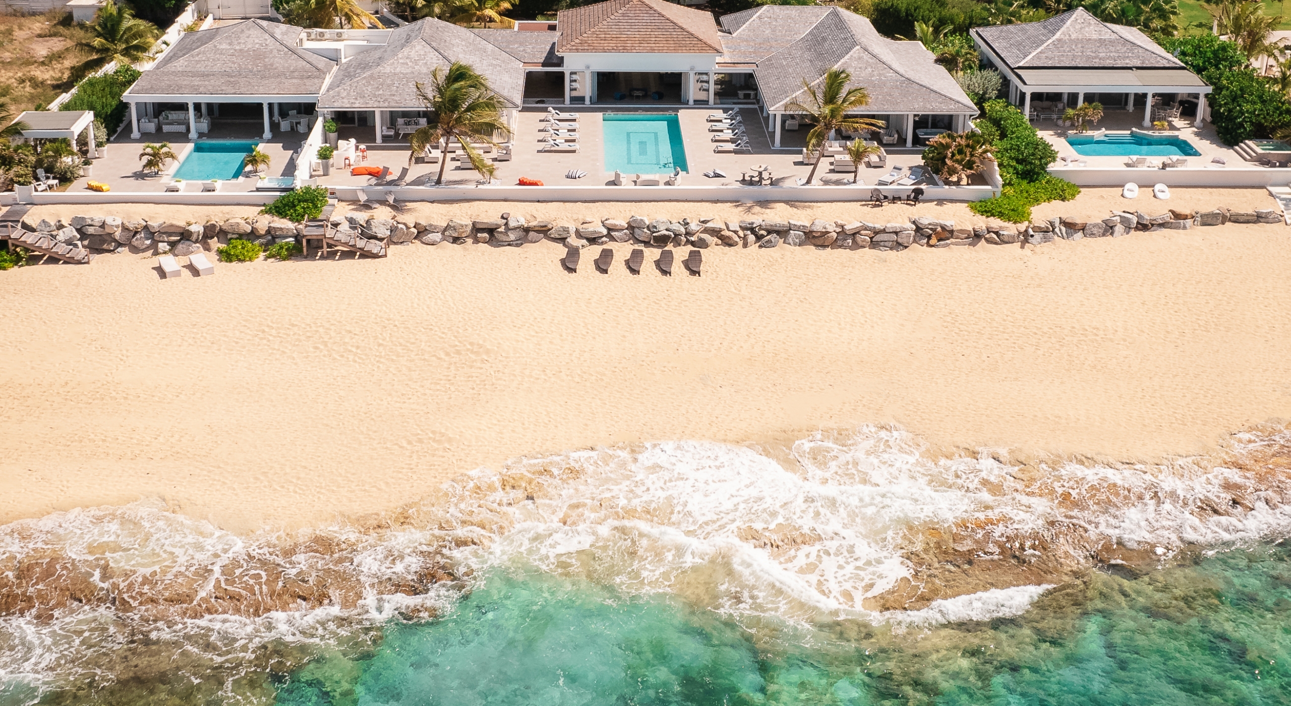 With the two neighboring sister villas, this newly reconstructed 5 BR beachfront property can