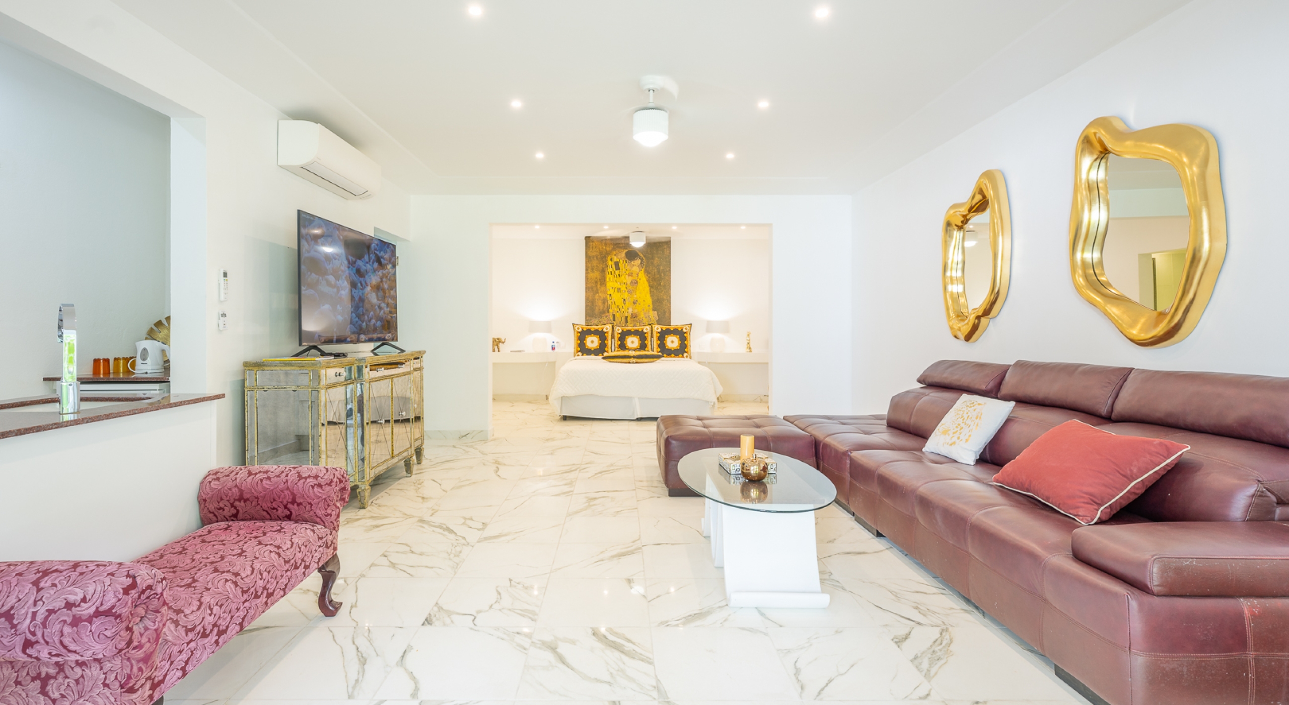 several plush seating areas and a full gourmet kitchen with a brand-new bar designed by an