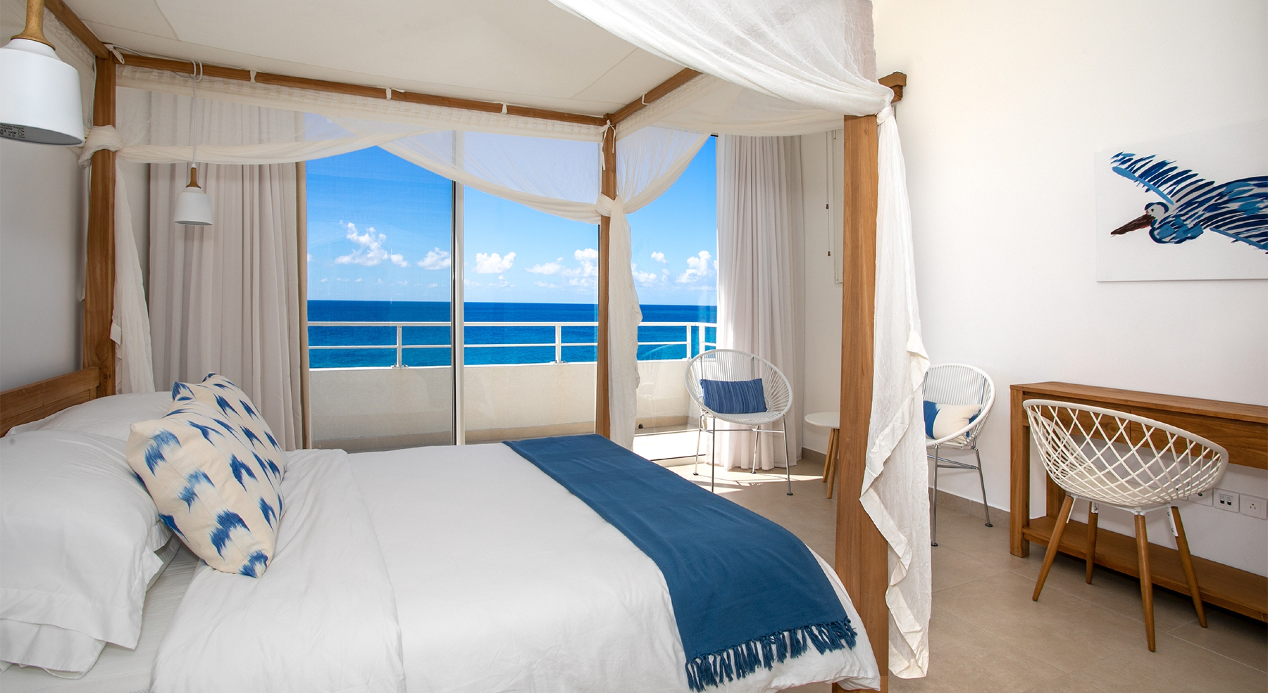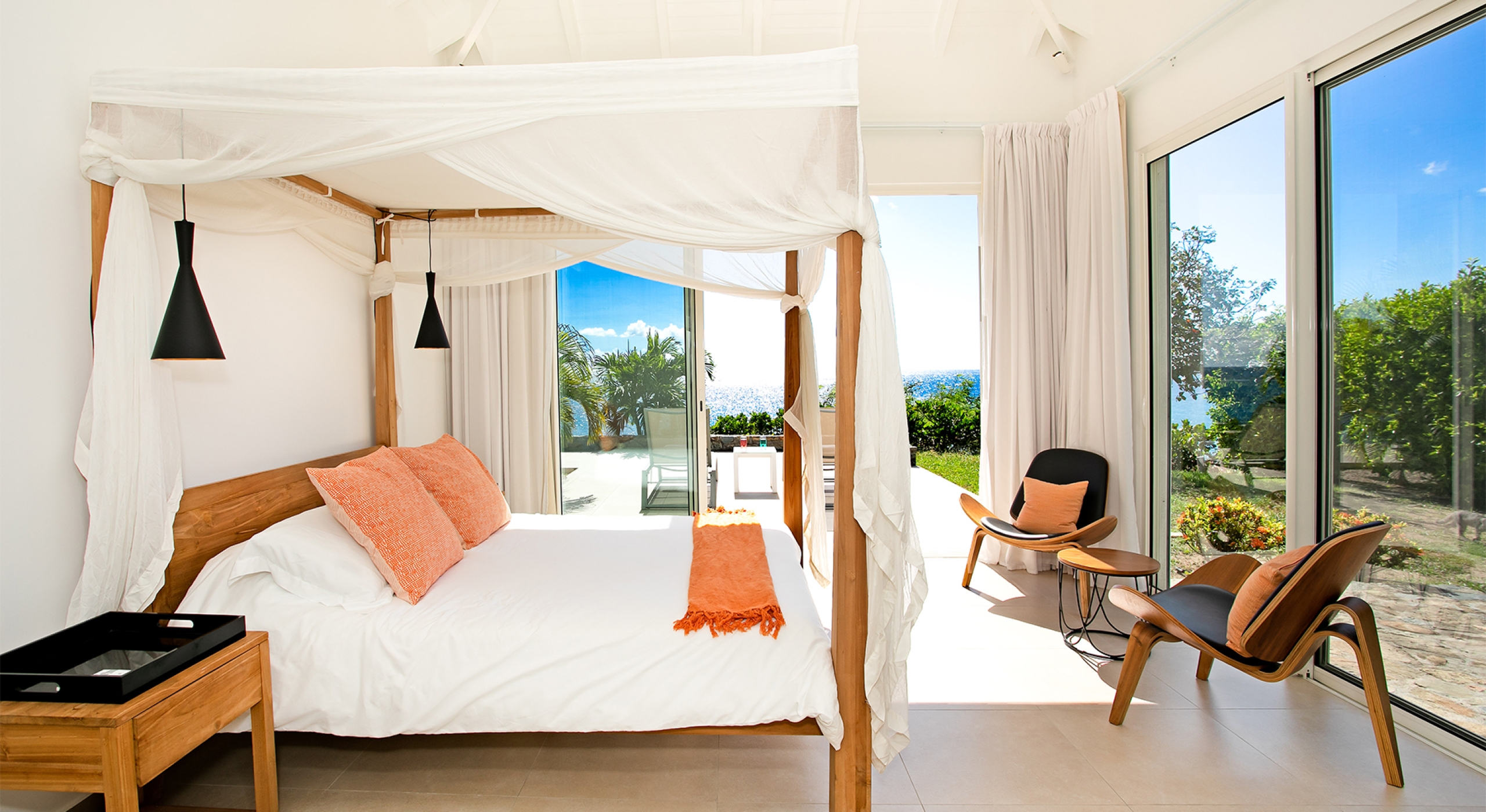 The sophisticated minimal decor of white walls and natural wood with hints of sea green, blue, and coral pink perfectly complement the endless topaz blue view from the infinity pool in the foreground to the Caribbean and sky beyond.