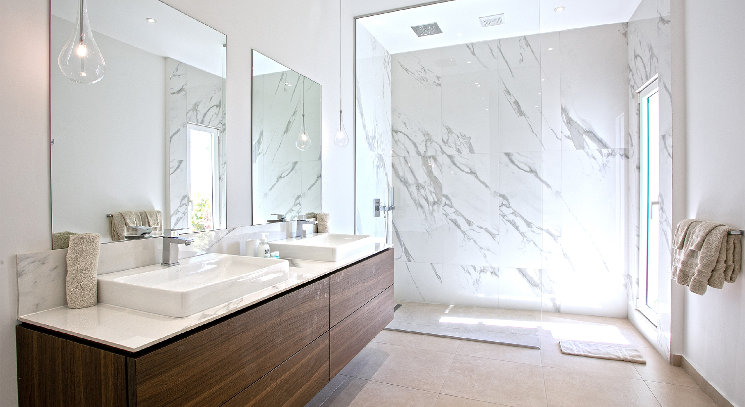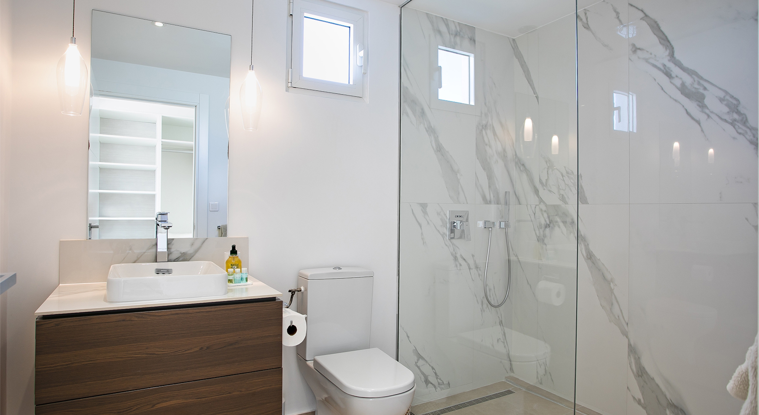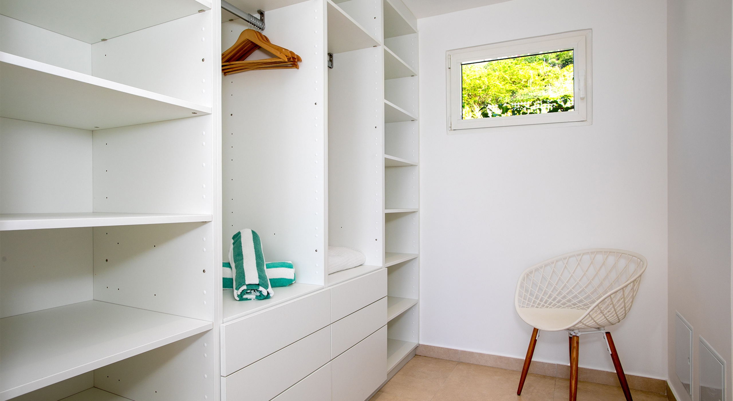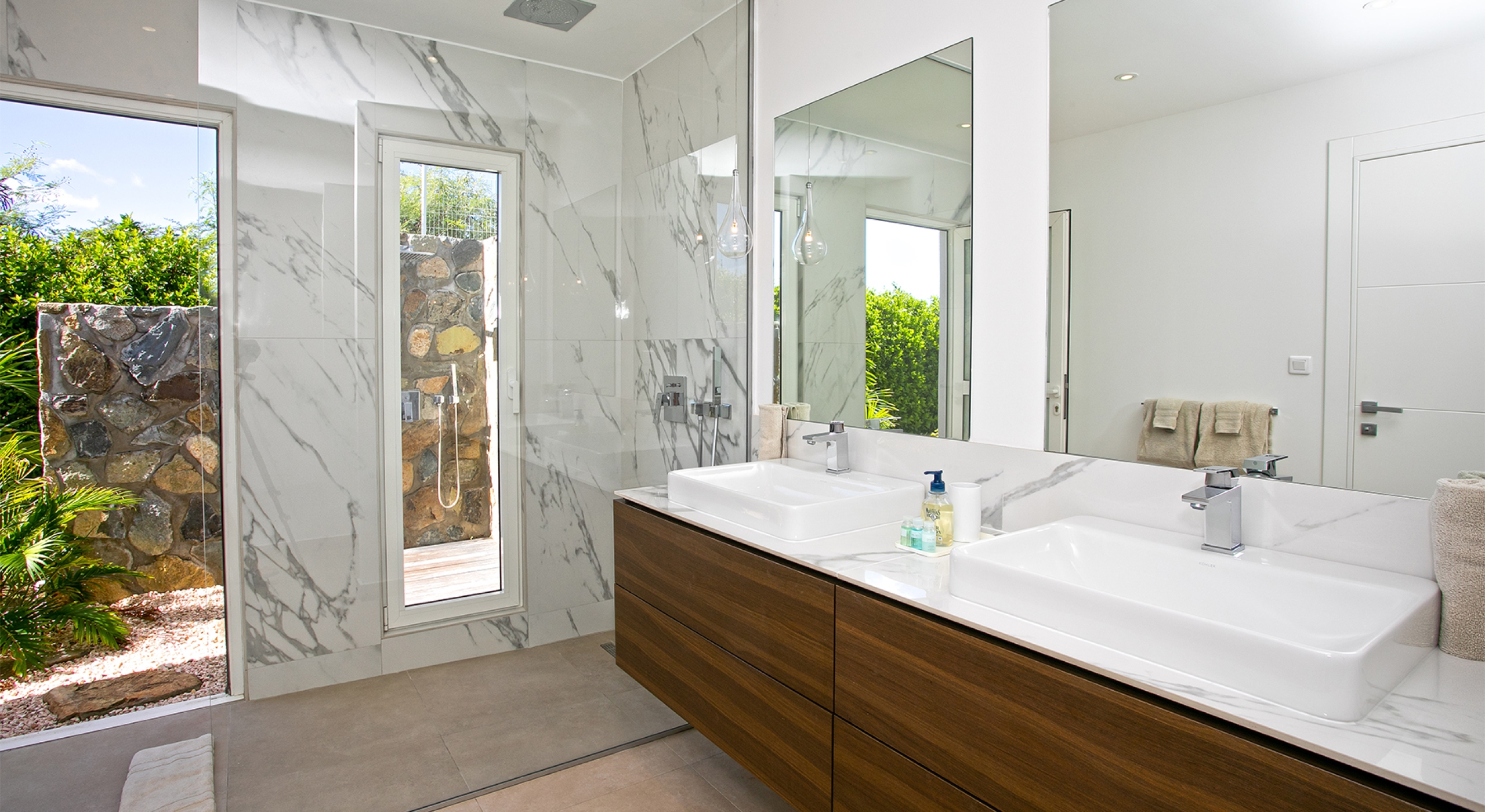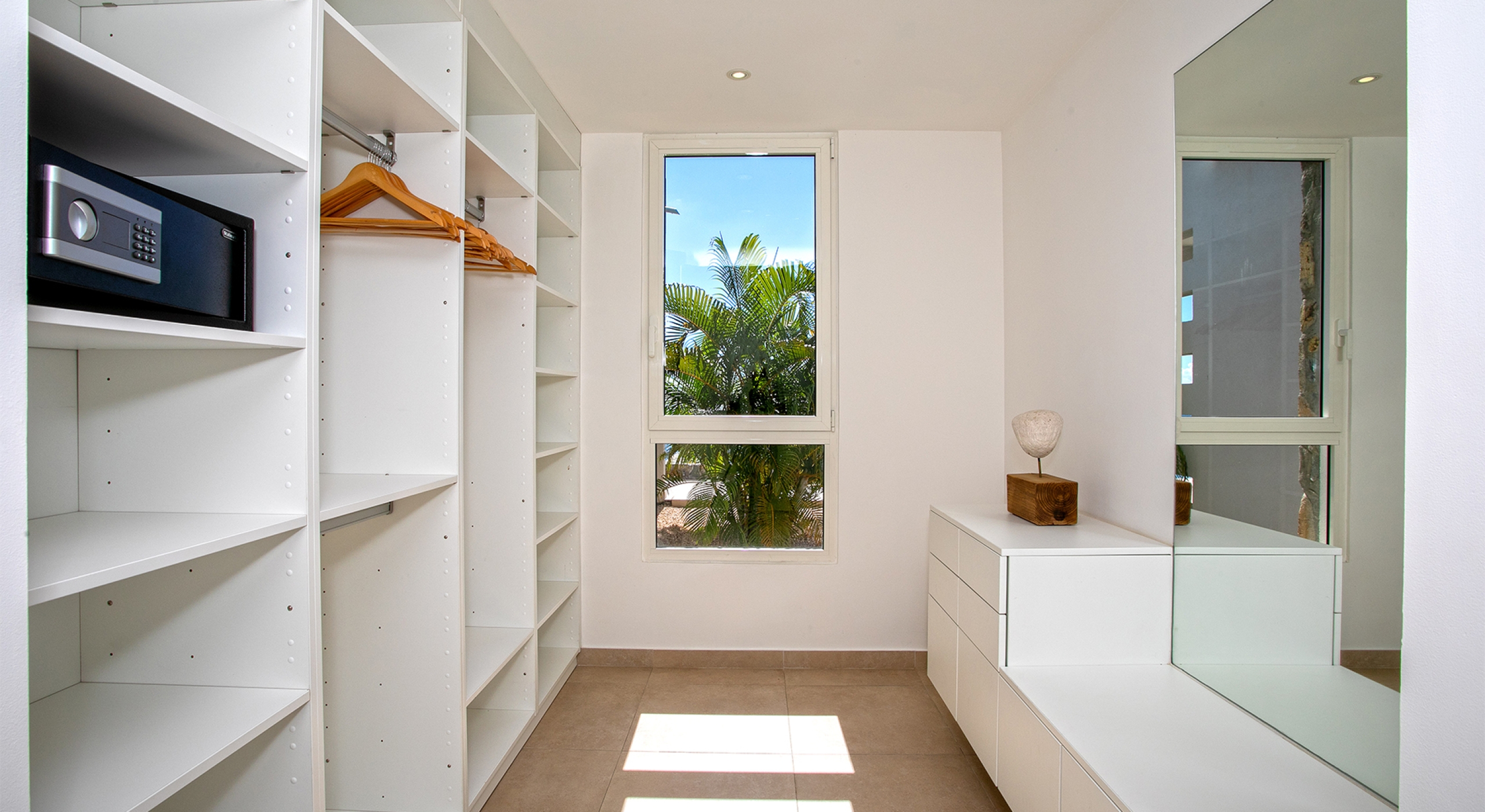 The master bedroom and 2nd bedroom are accessed from the main living room and each has a queen-size four-poster canopy bed and spacious walk-in closet and private sea view terrace area with sun loungers. Two further queen size bedrooms are to be found on the upper level each with a sea view balcony and walk-in closet. All four bedrooms have beautiful en-suite bathrooms with glass-walled rain and handheld showers and the master bathroom also opens to an outdoor spa shower.