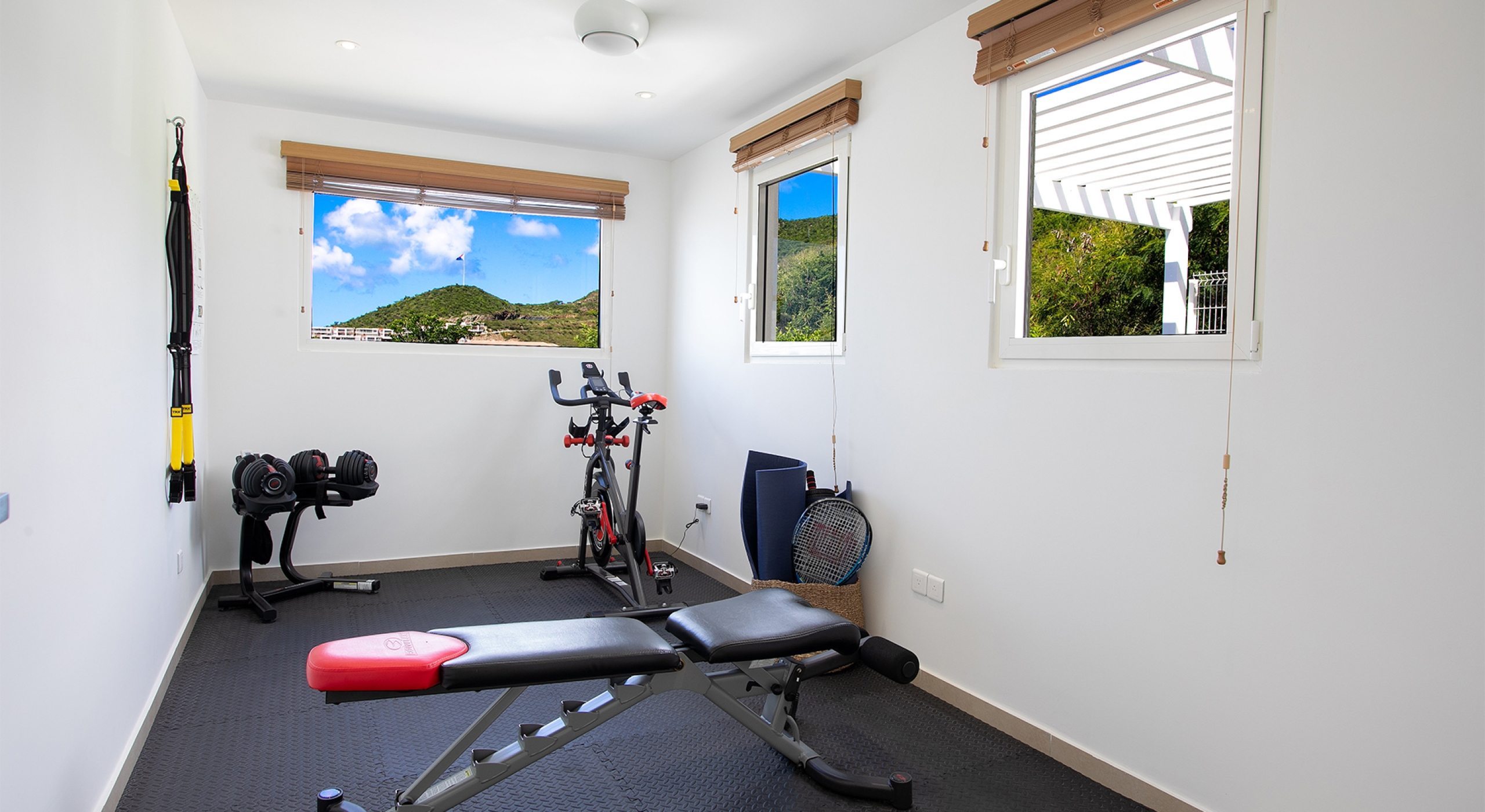 An exercise room equipped with a bike and a bench and free weights is located on the lower level to the rear of the main living area. The villa is gated and has parking for 3 cars.