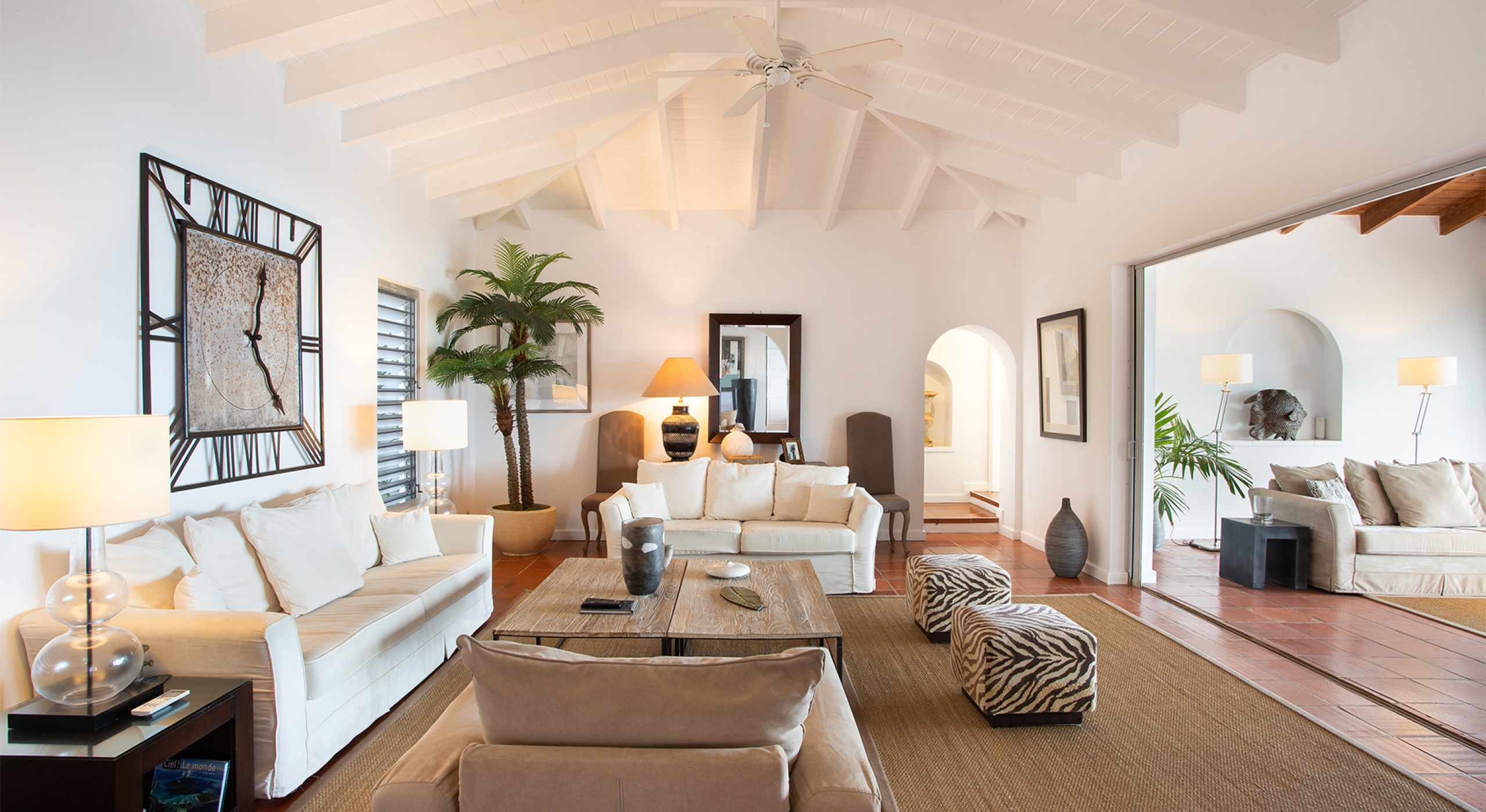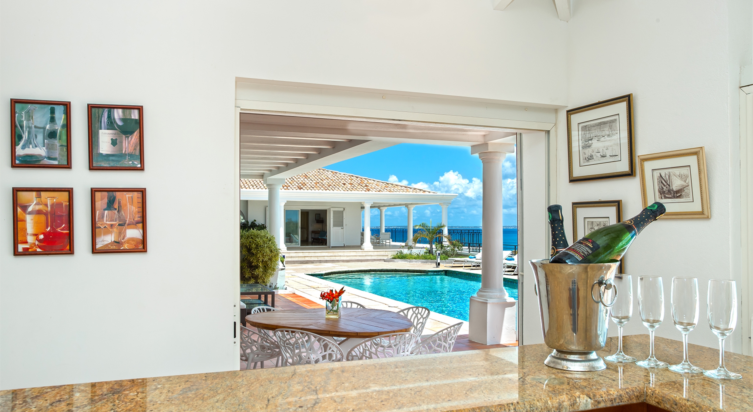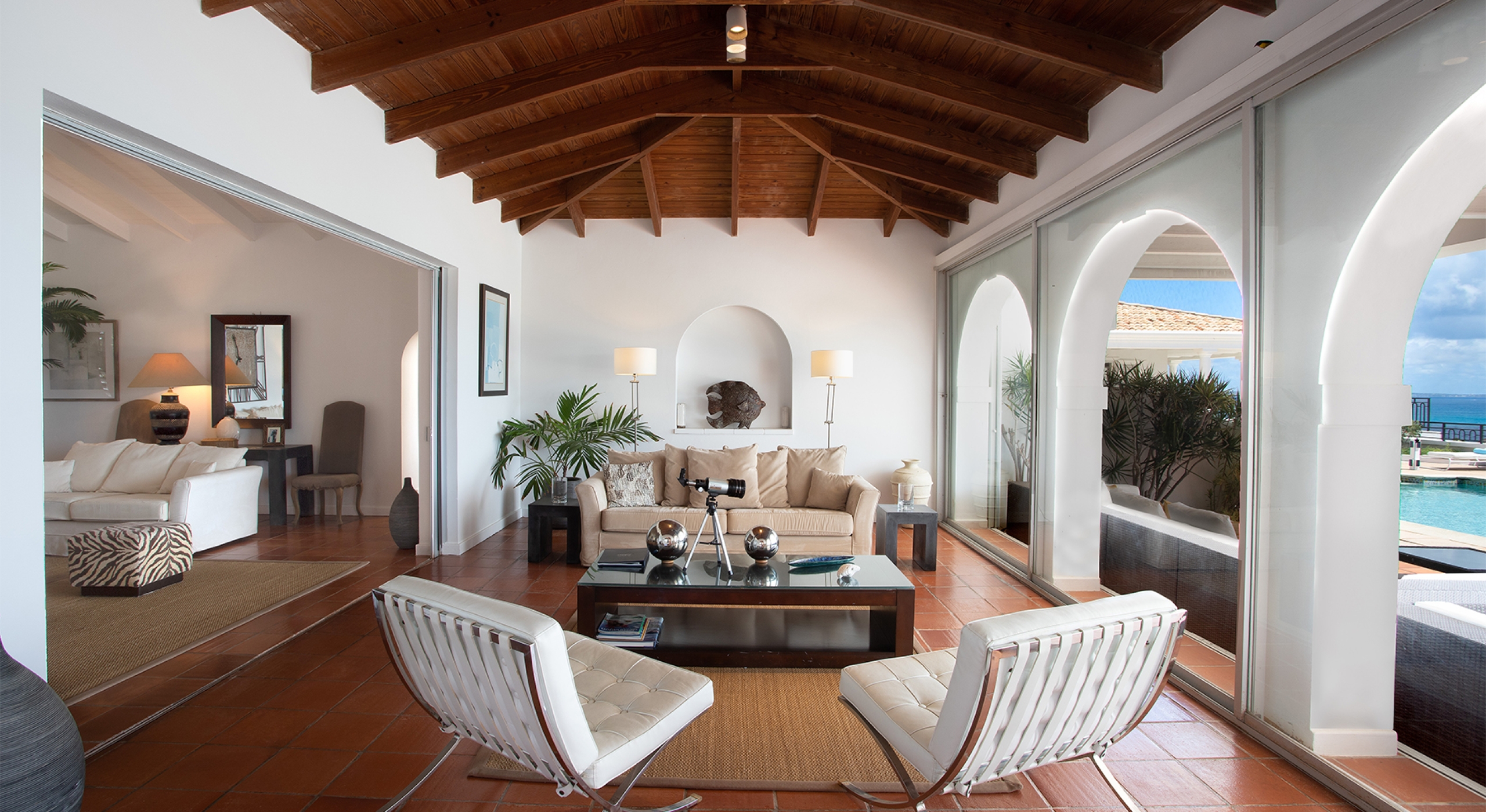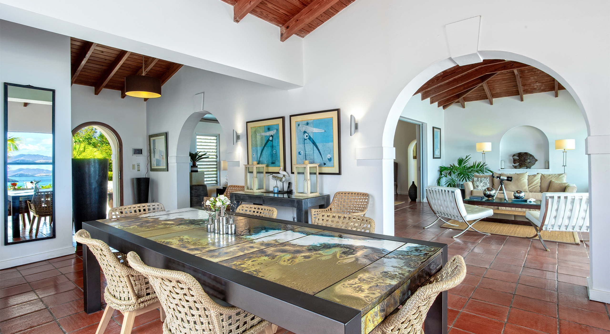 Inside, the villa flows seamlessly between indoor and outdoor living. A spacious double living room connects to a formal dining room framed by graceful arches, as well as outdoor dining and lounge areas. The fully equipped kitchen, outfitted with granite countertops and a wide pass-through window to the terrace, overlooks Baie Rouge and invites effortless entertaining.