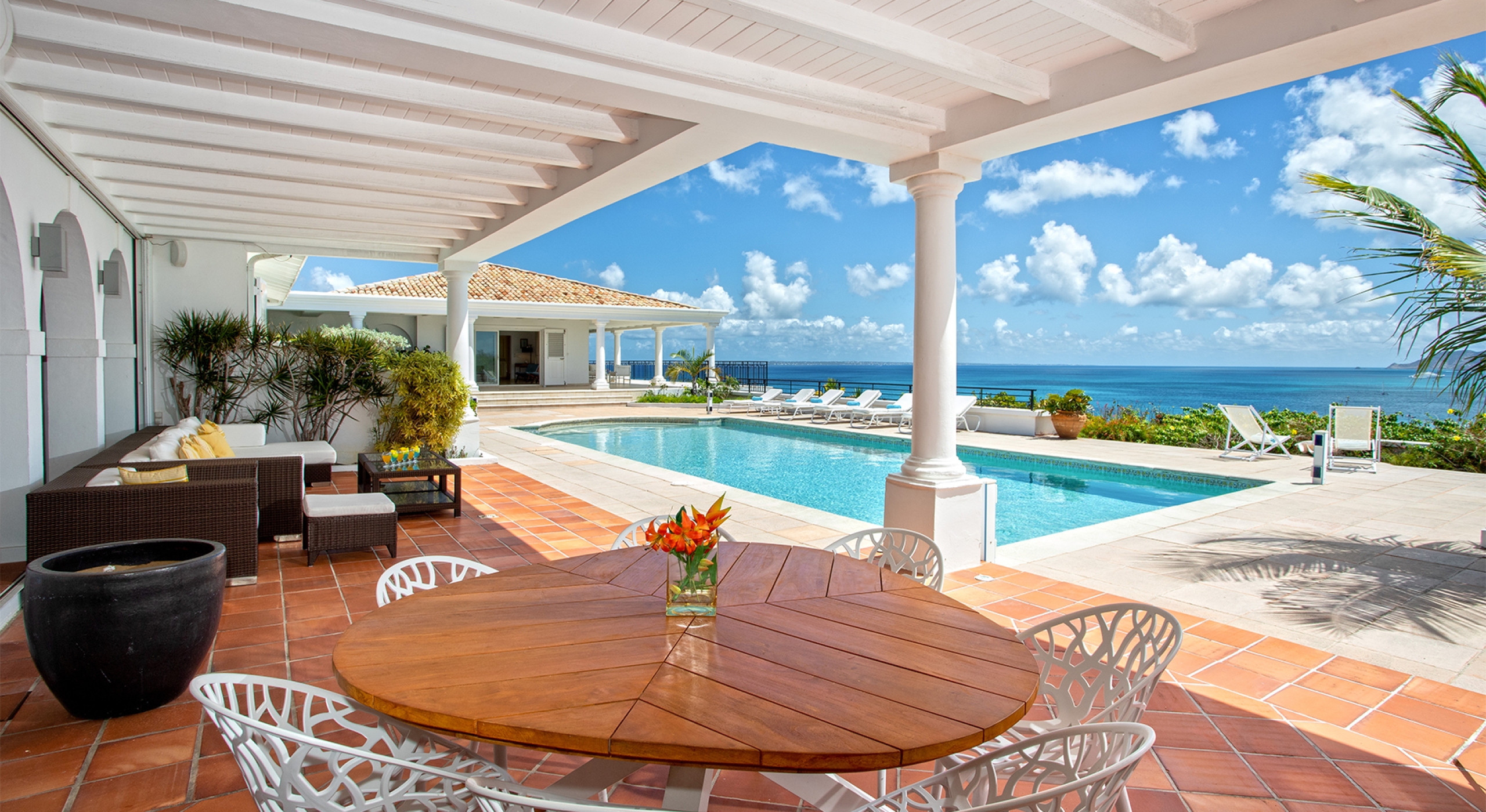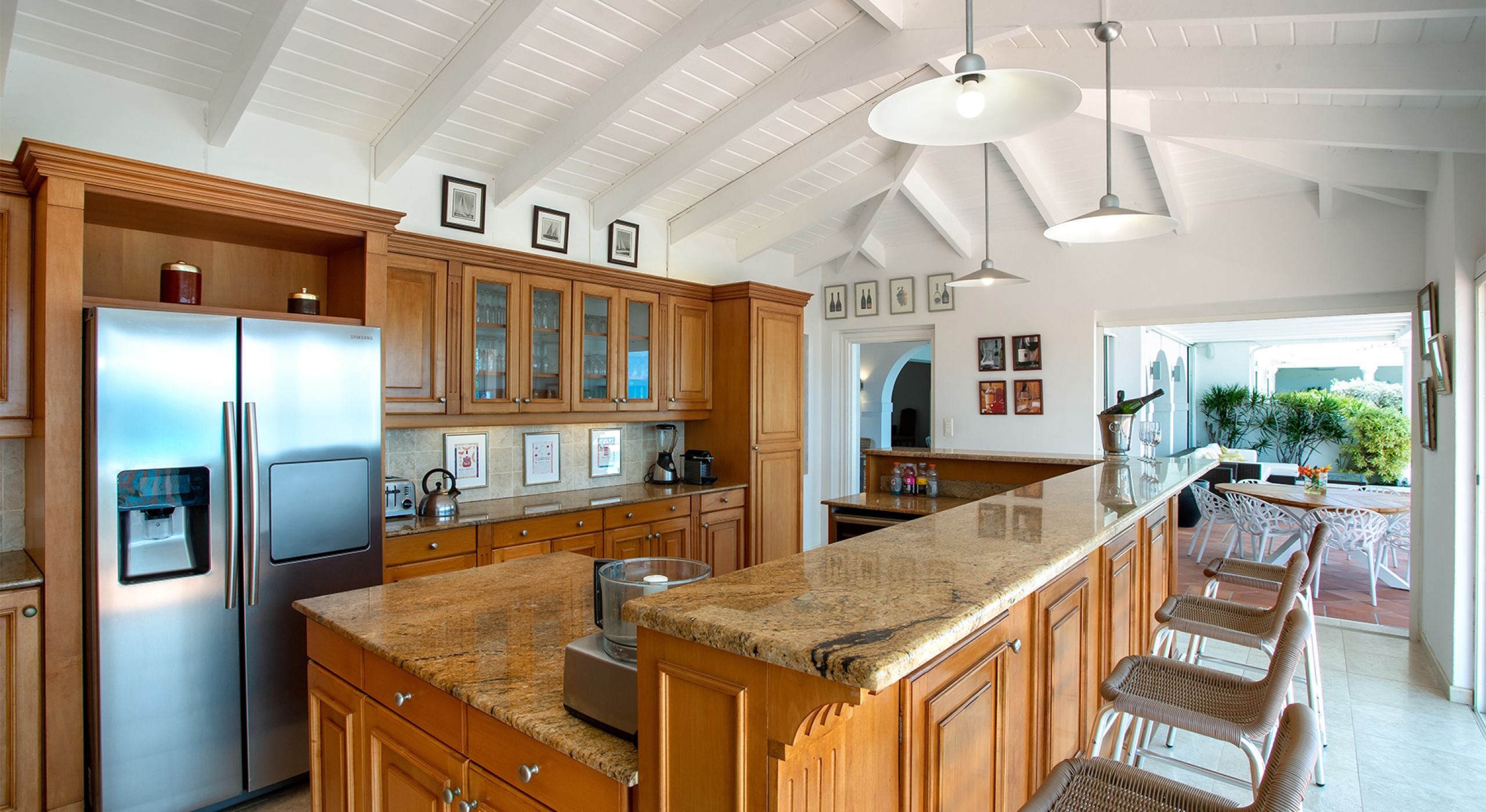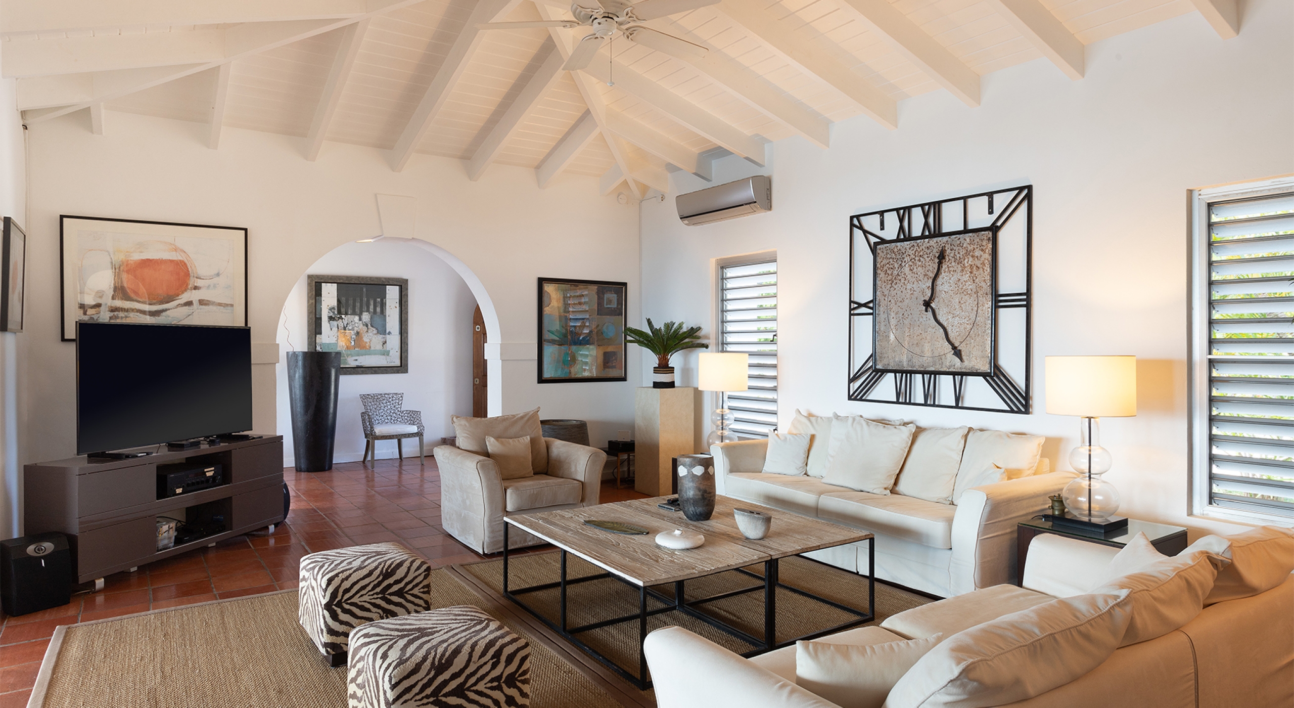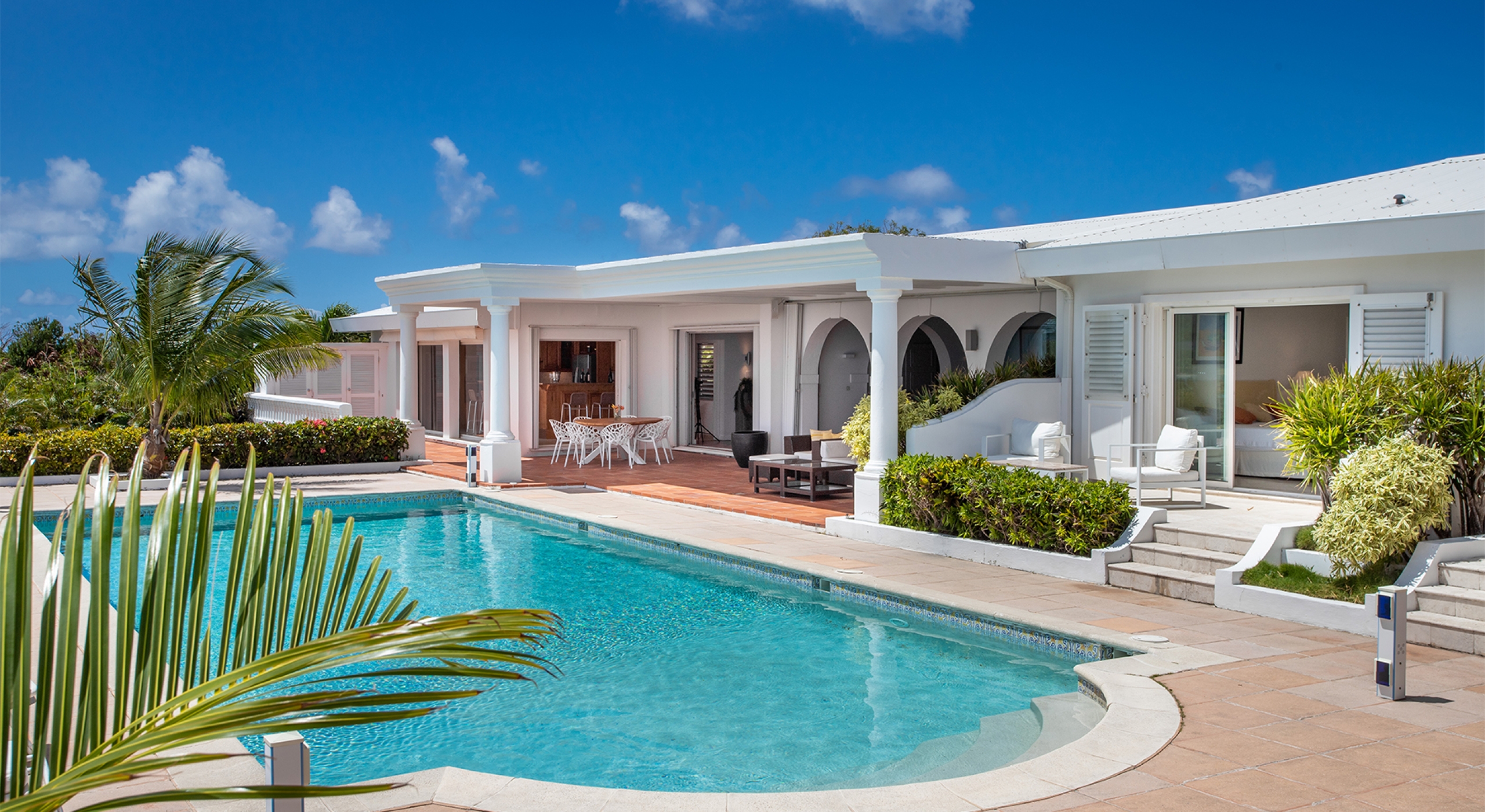 Inside, the villa flows seamlessly between indoor and outdoor living. A spacious double living room connects to a formal dining room framed by graceful arches, as well as outdoor dining and lounge areas. The fully equipped kitchen, outfitted with granite countertops and a wide pass-through window to the terrace, overlooks Baie Rouge and invites effortless entertaining.