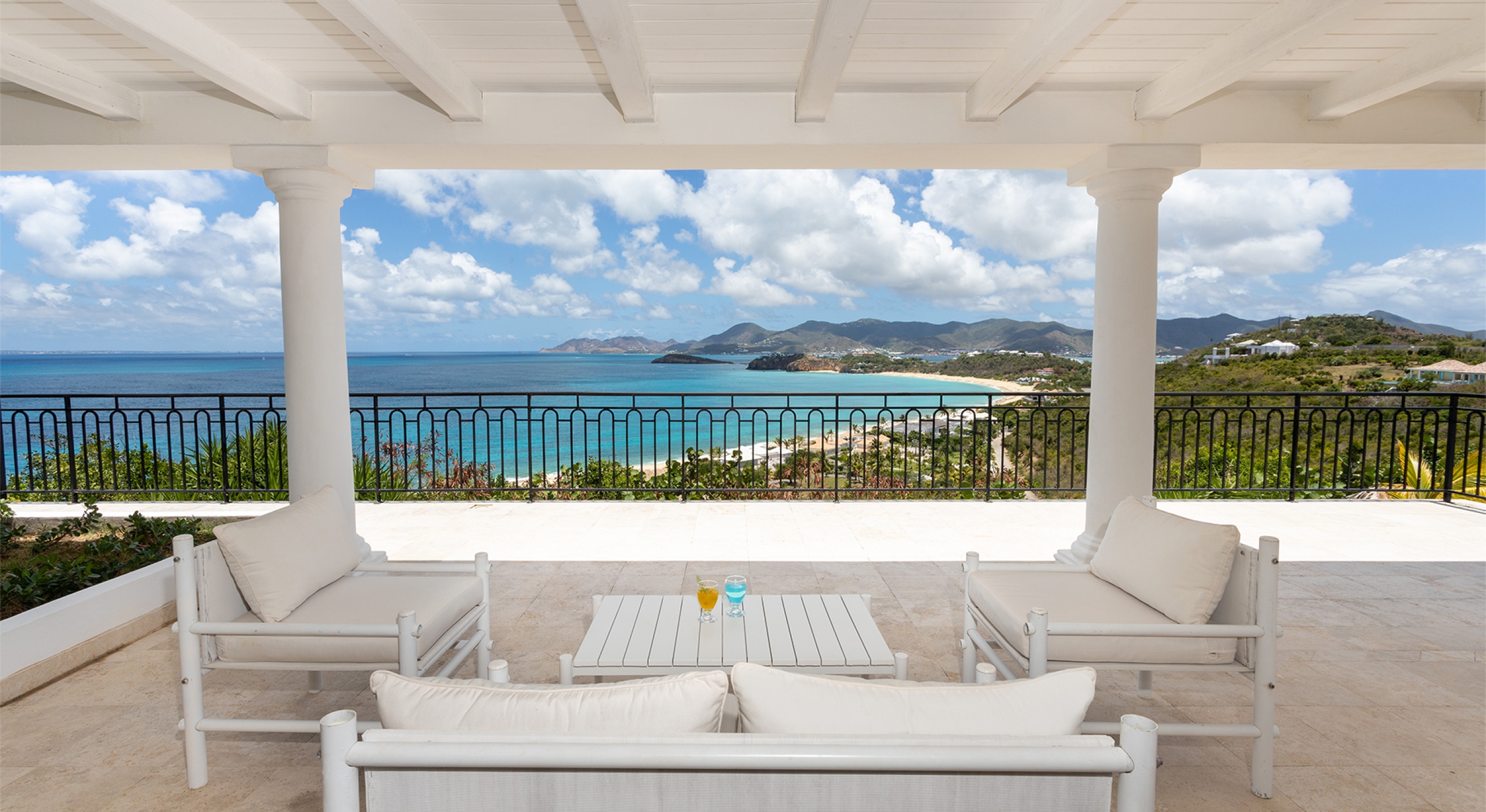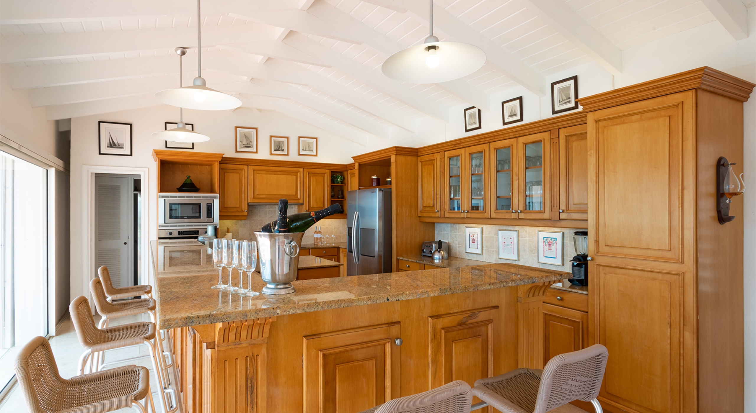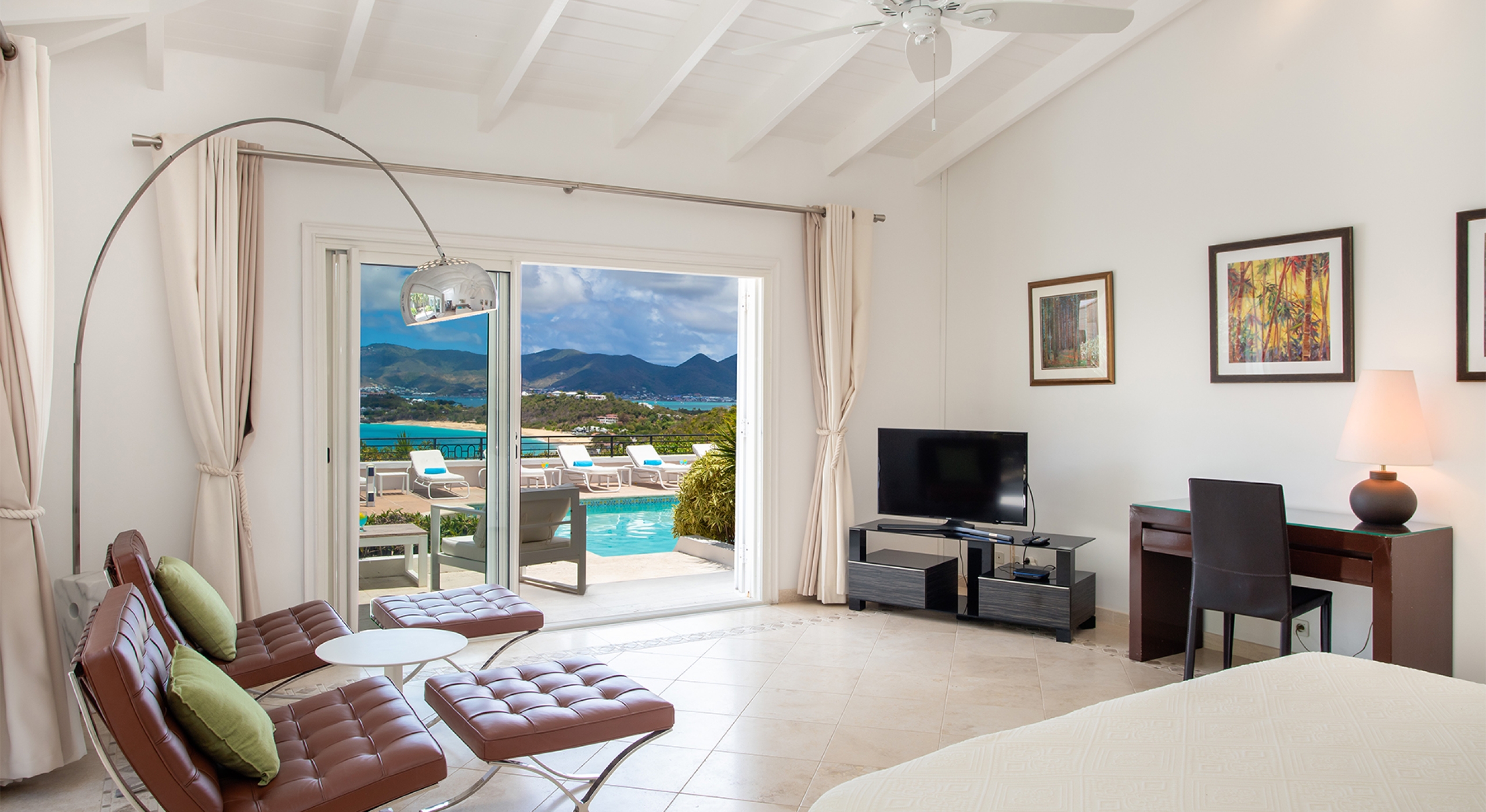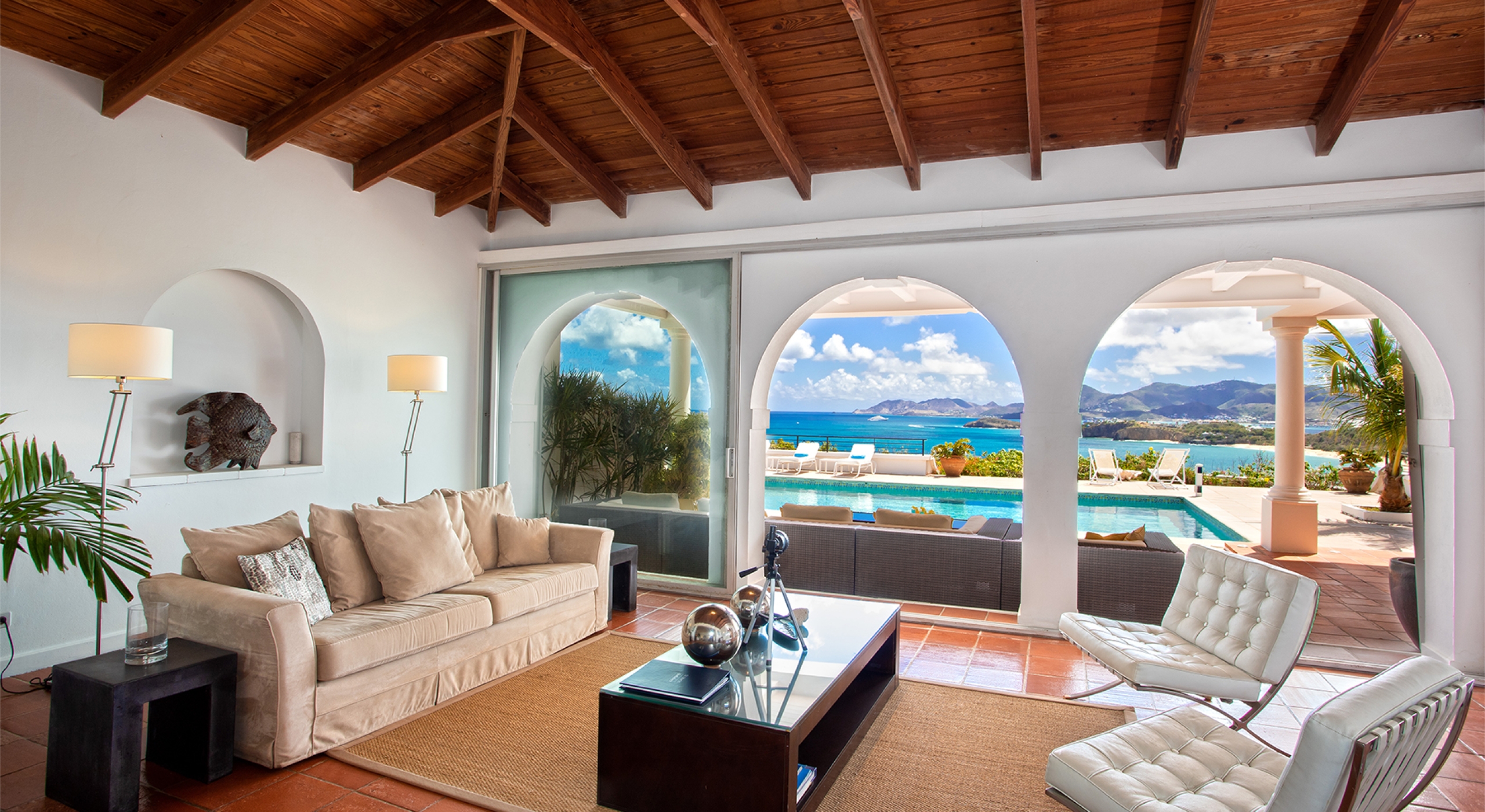 Inside, the villa flows seamlessly between indoor and outdoor living. A spacious double living room connects to a formal dining room framed by graceful arches, as well as outdoor dining and lounge areas. The fully equipped kitchen, outfitted with granite countertops and a wide pass-through window to the terrace, overlooks Baie Rouge and invites effortless entertaining.